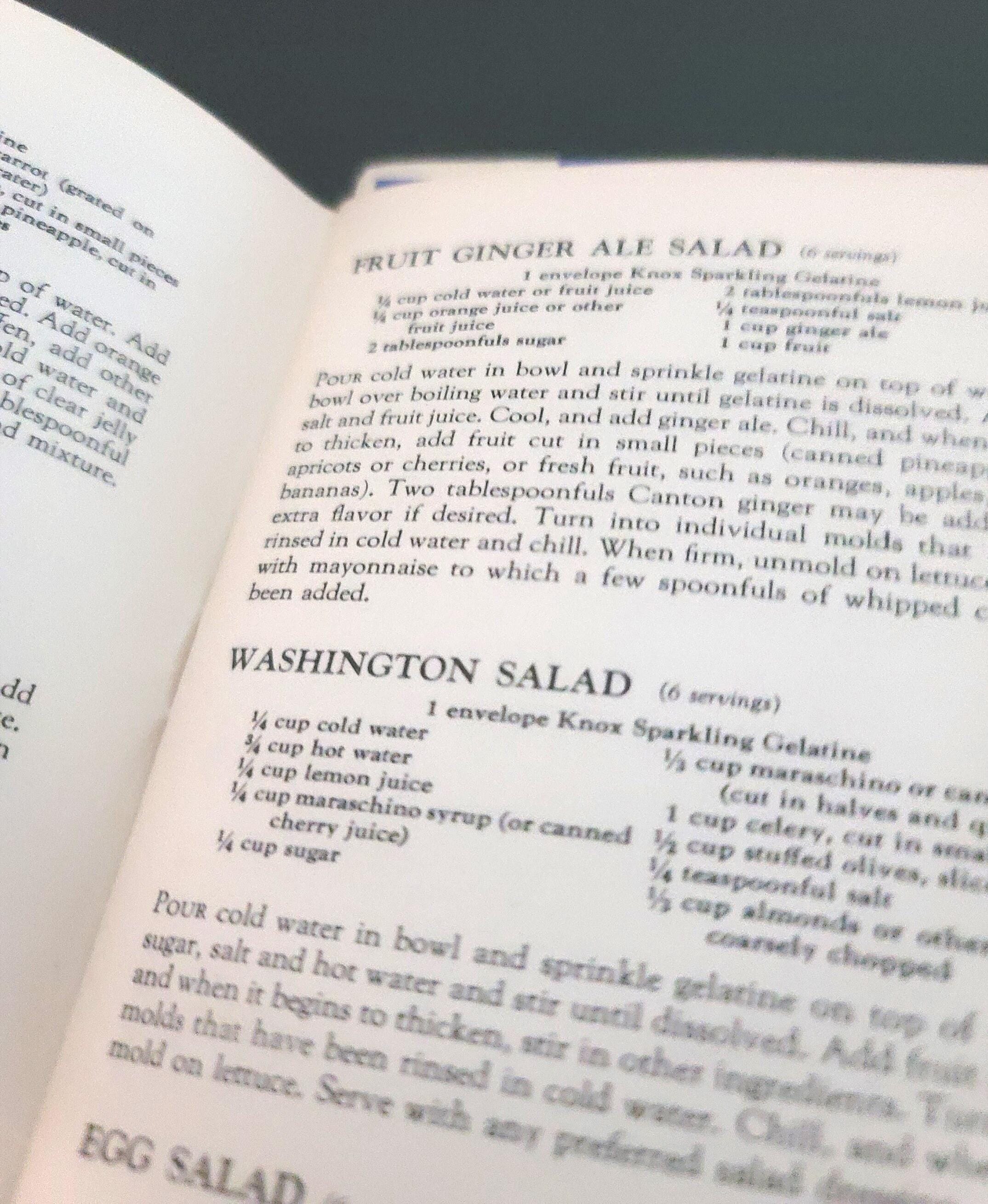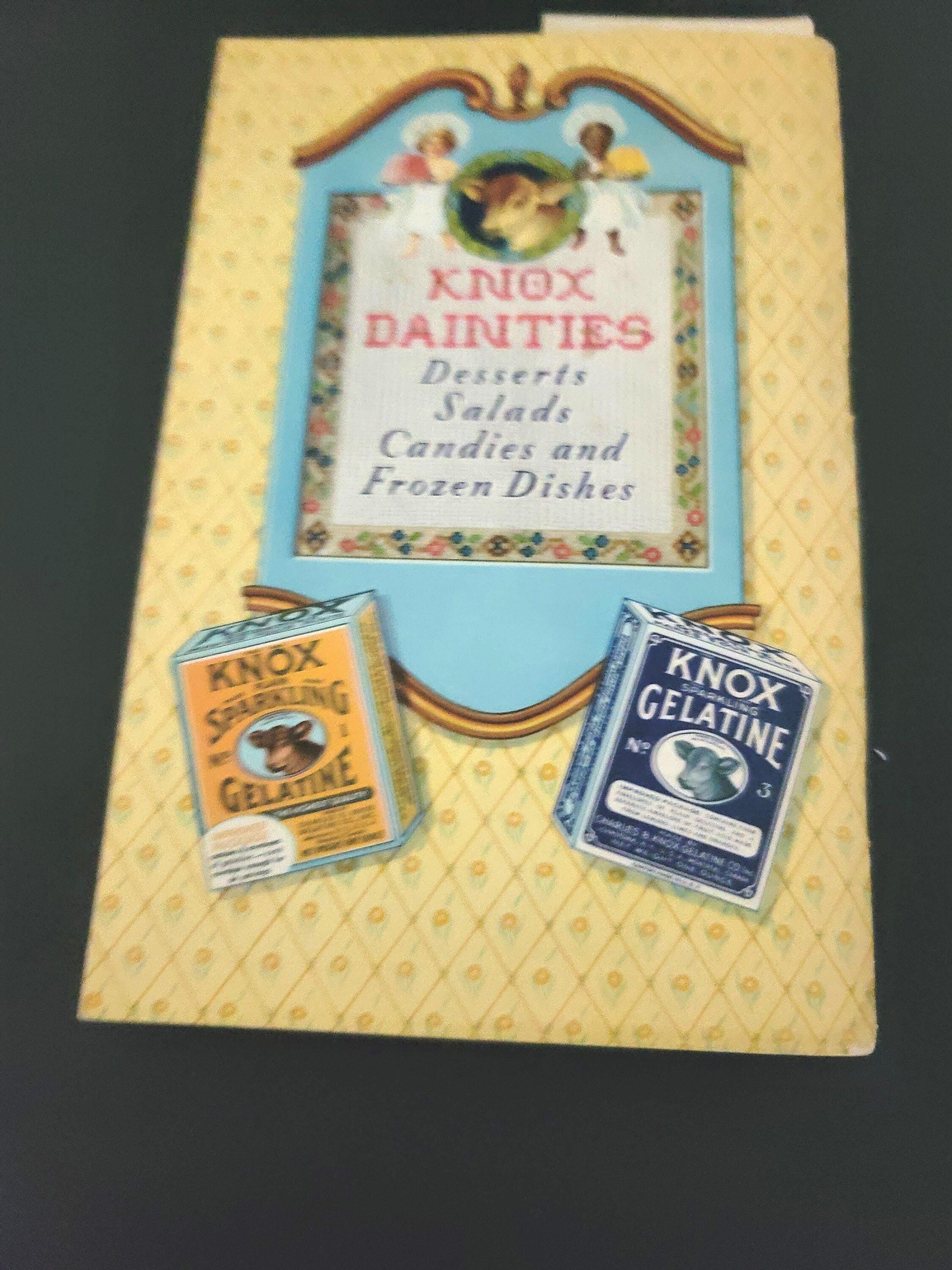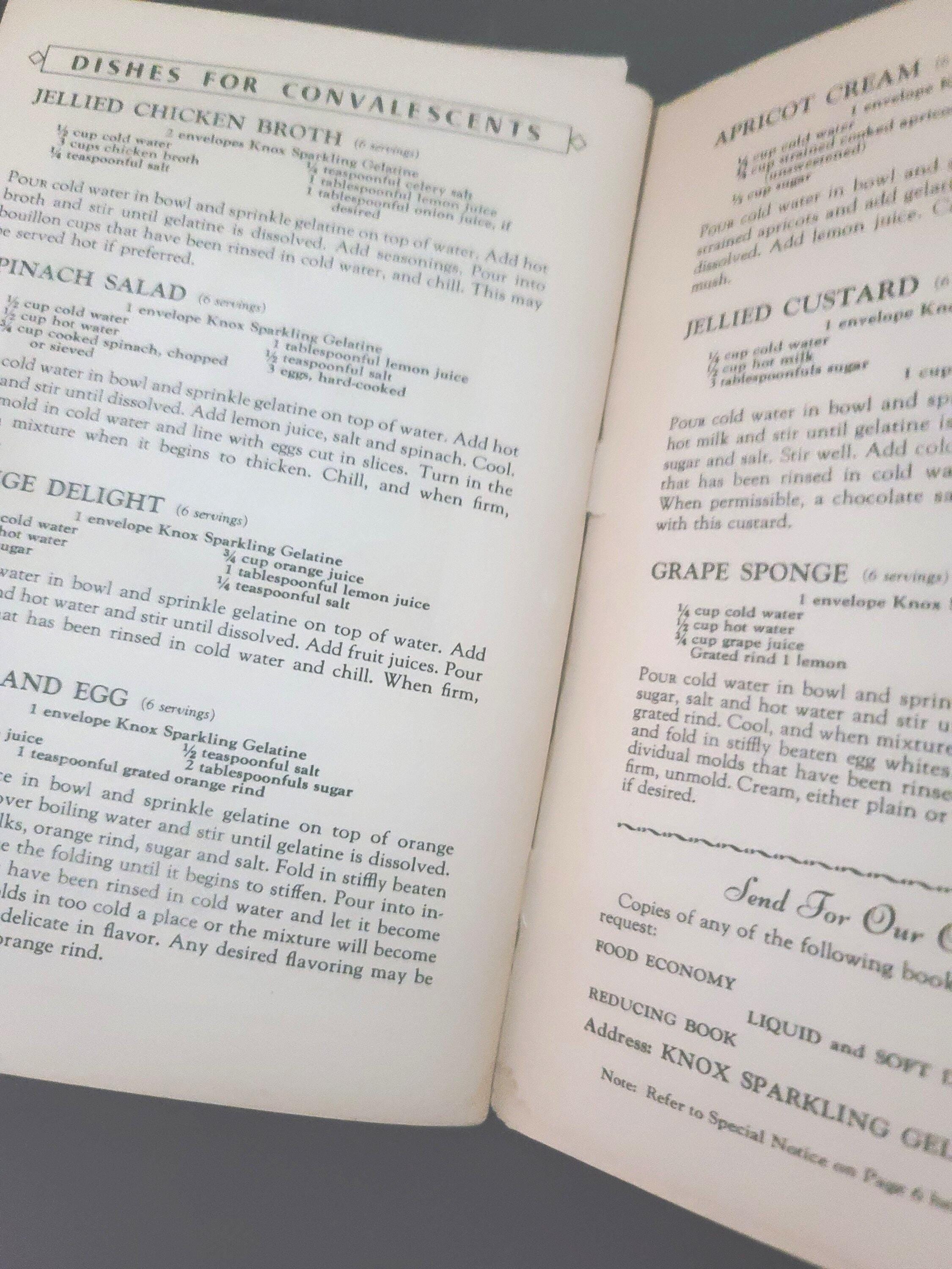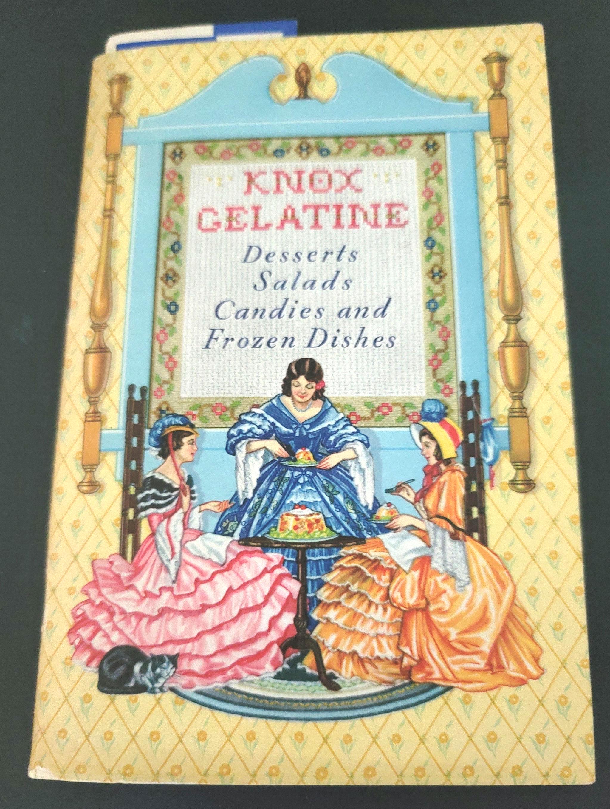 This cute little book is a cookbook for desserts, salads, candies and frozen dishes put out by Knox Gelatine in 1933. It has 71 pages and is 6.75 x 4.50". It has color illustrations in the center of the book. It also has information on setting the table, gelatine hints and even children's parties and dishes for convalescents! It is in great condition. The pages are very secure, flat and there is no writing in it. If you have always wanted to know how to make rose apples, divinity, coffee jelly or souffle's, this is the book for you.