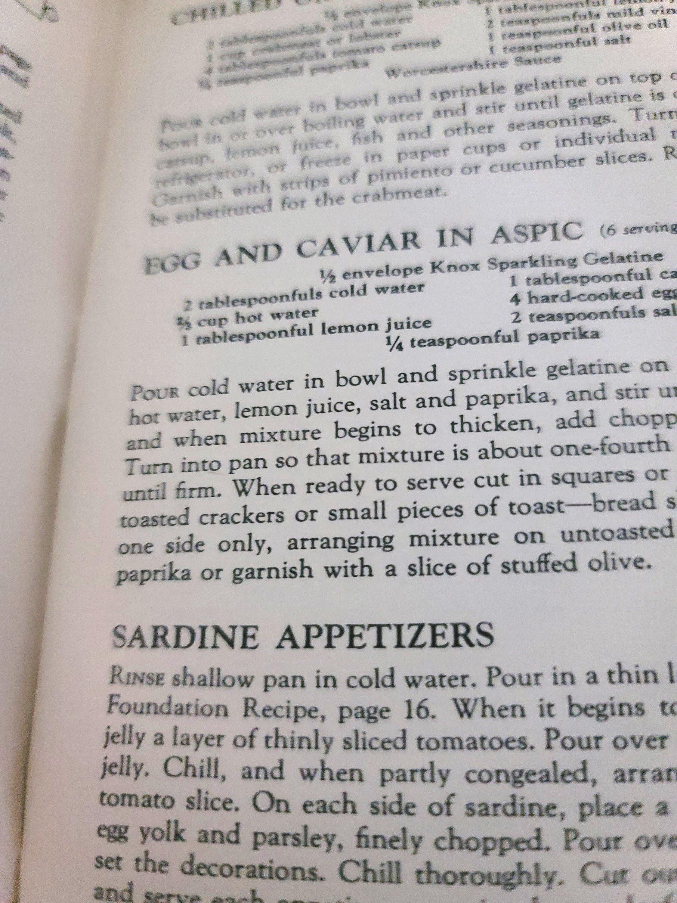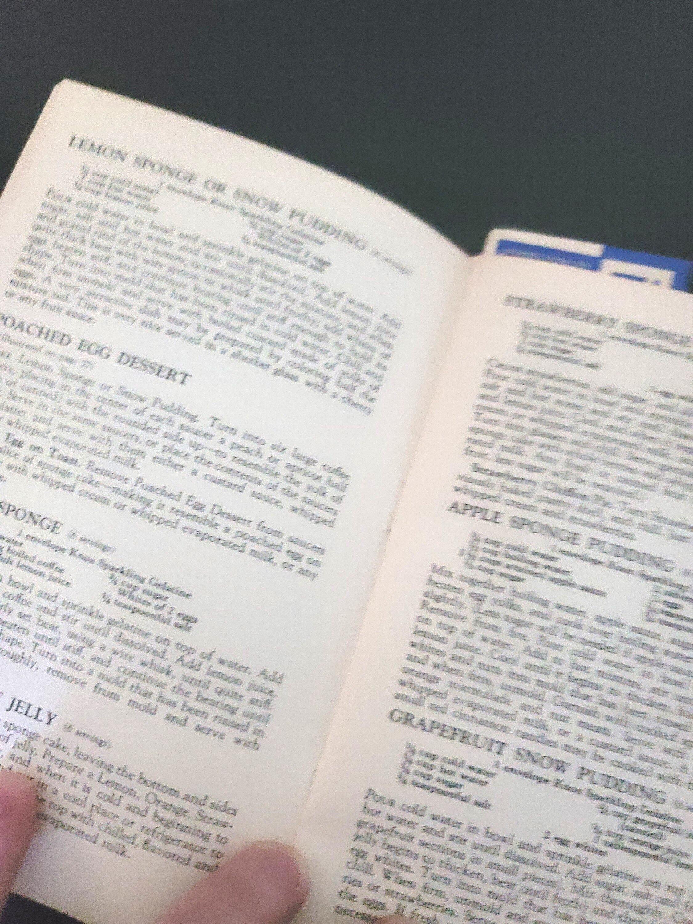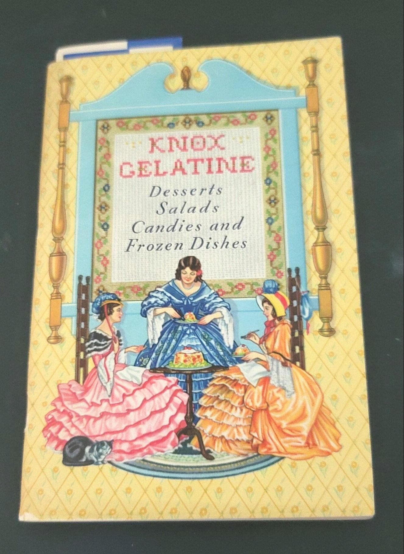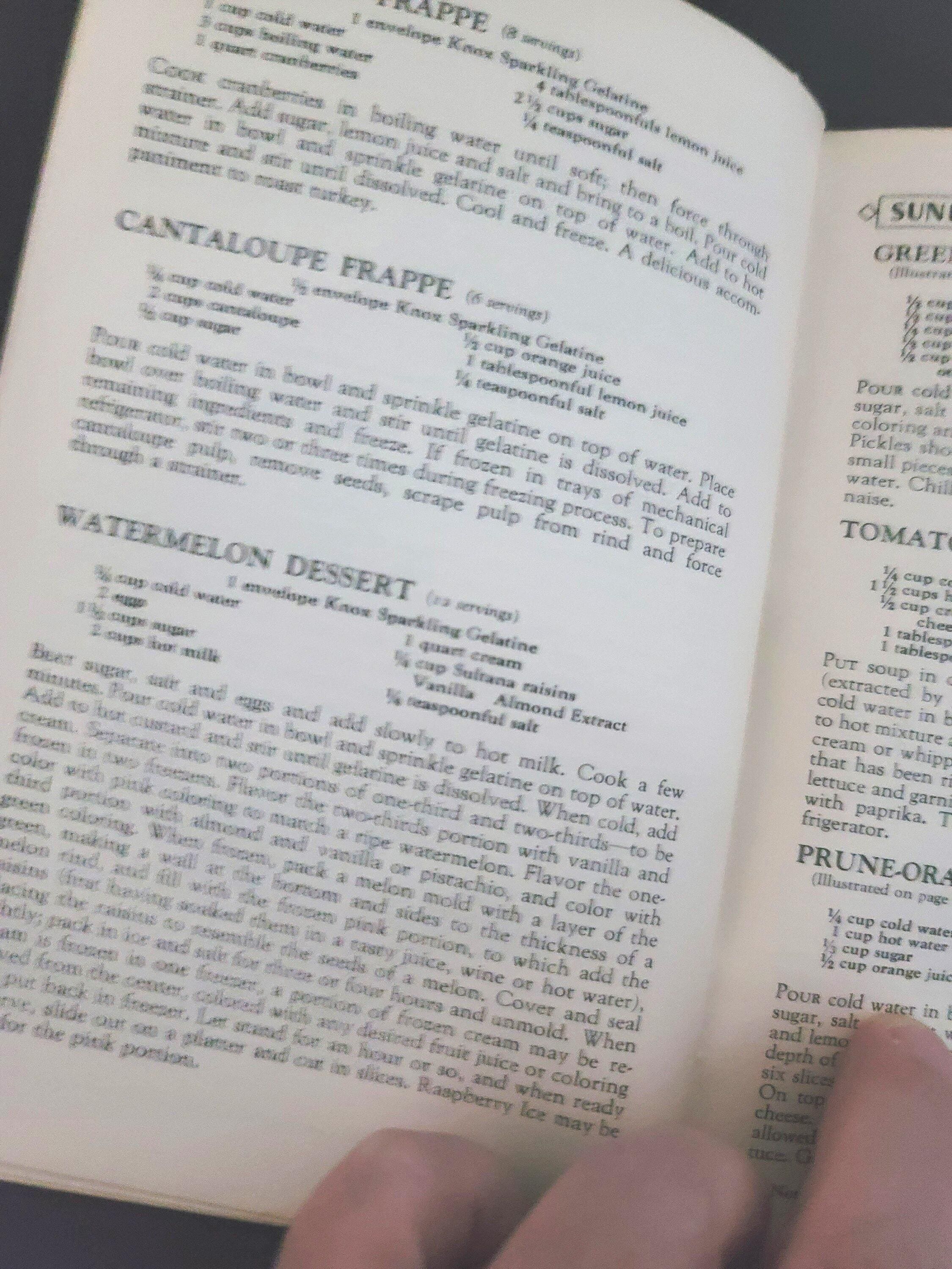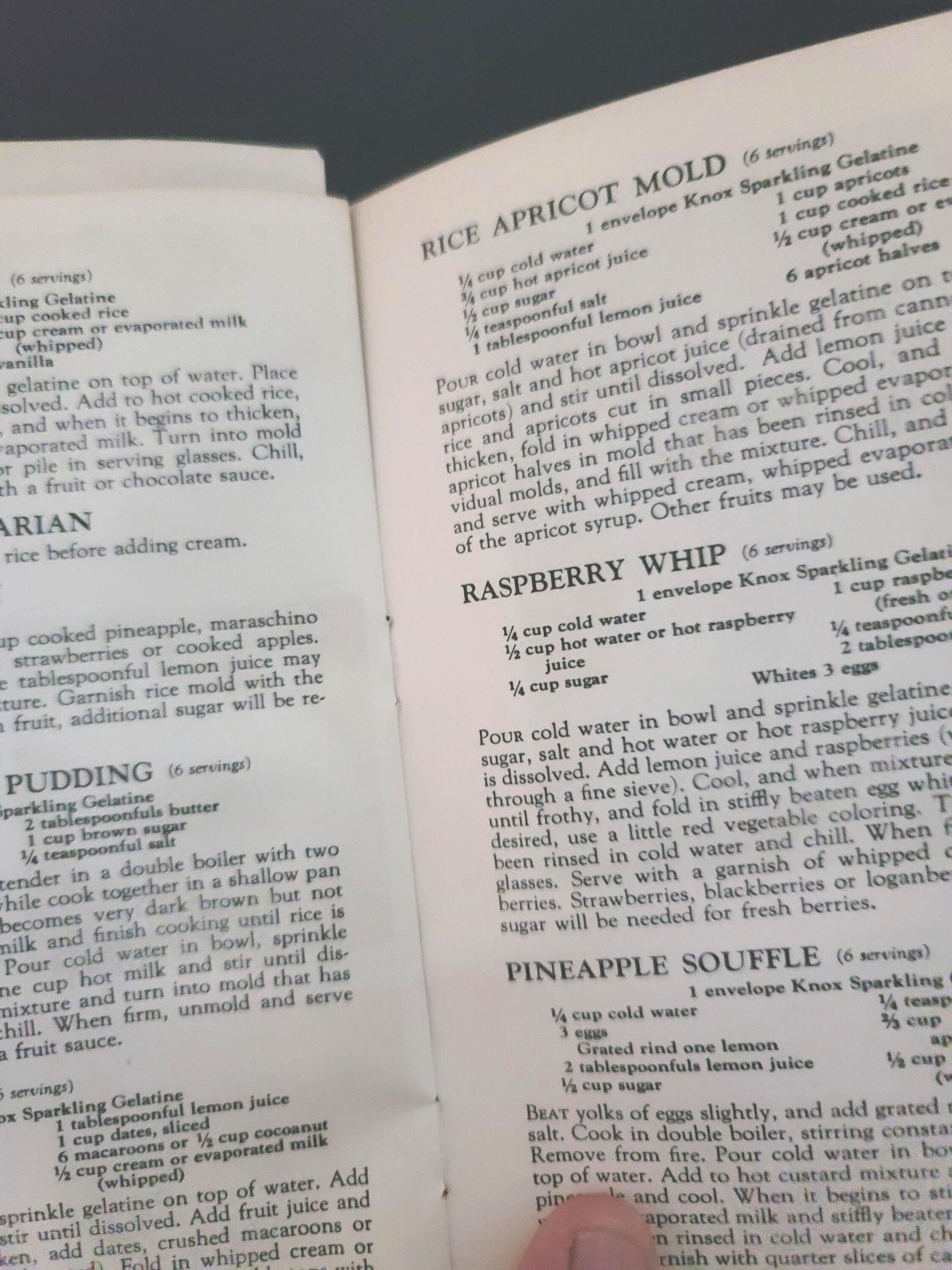 This cute little book is a cookbook for desserts, salads, candies and frozen dishes put out by Knox Gelatine in 1933. It has 71 pages and is 6.75 x 4.50". It has color illustrations in the center of the book. It also has information on setting the table, gelatine hints and even children's parties and dishes for convalescents! It is in great condition. The pages are very secure, flat and there is no writing in it. If you have always wanted to know how to make rose apples, divinity, coffee jelly or souffle's, this is the book for you.