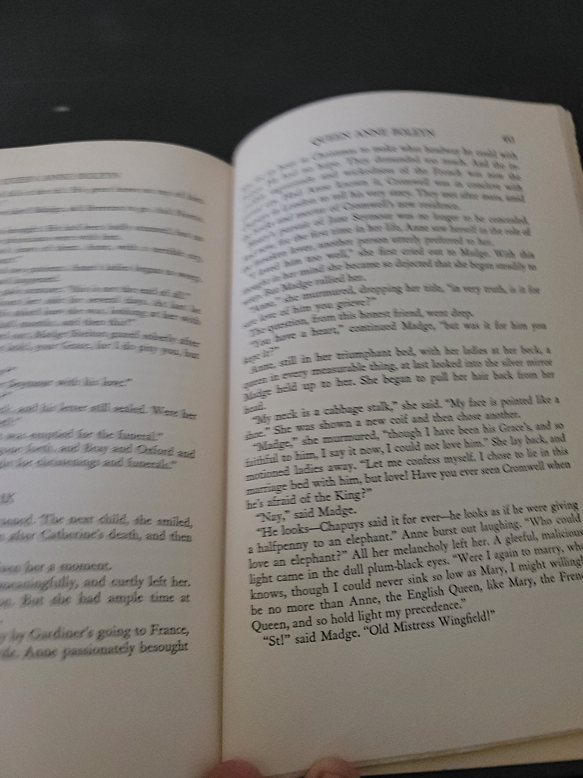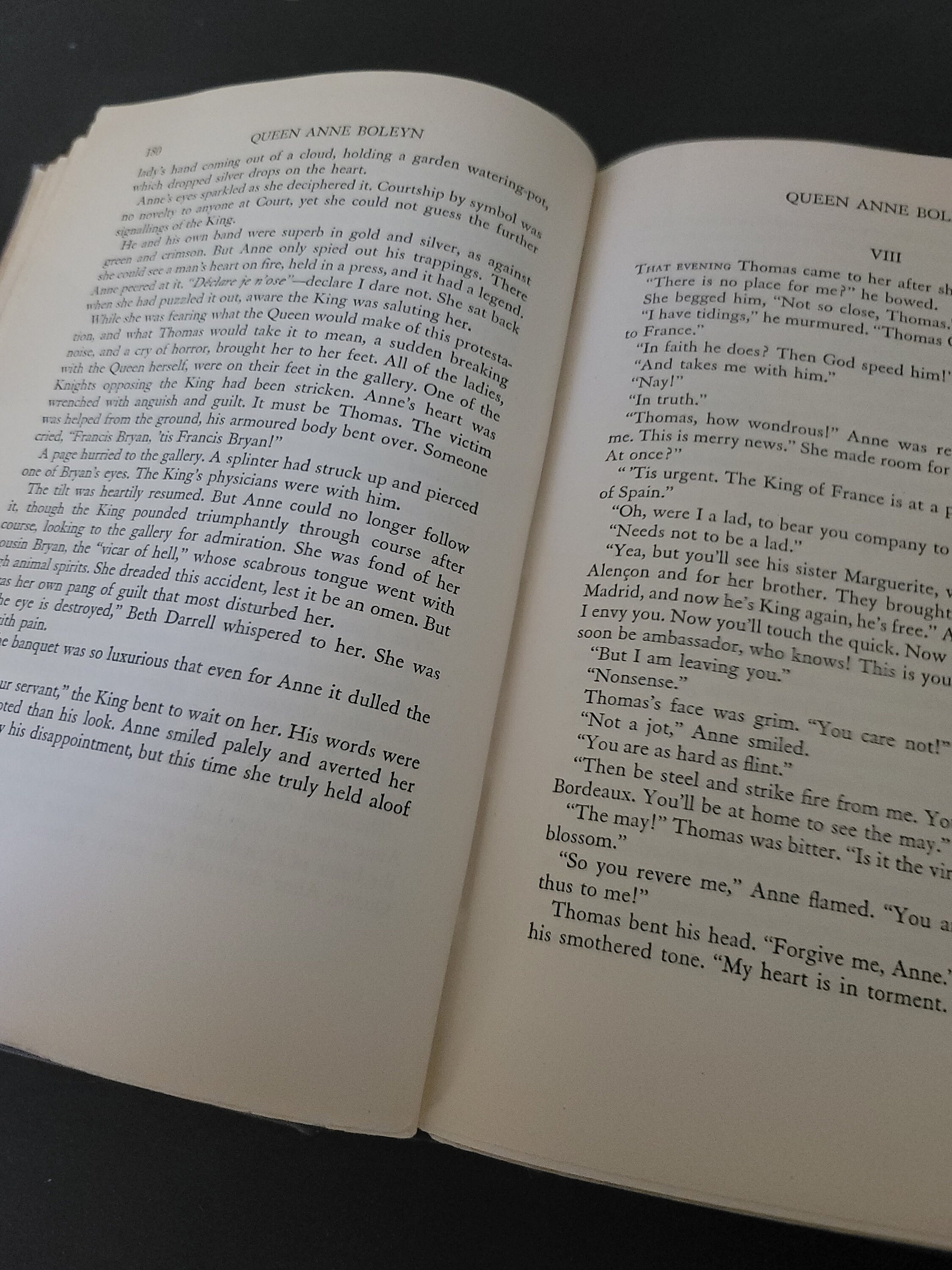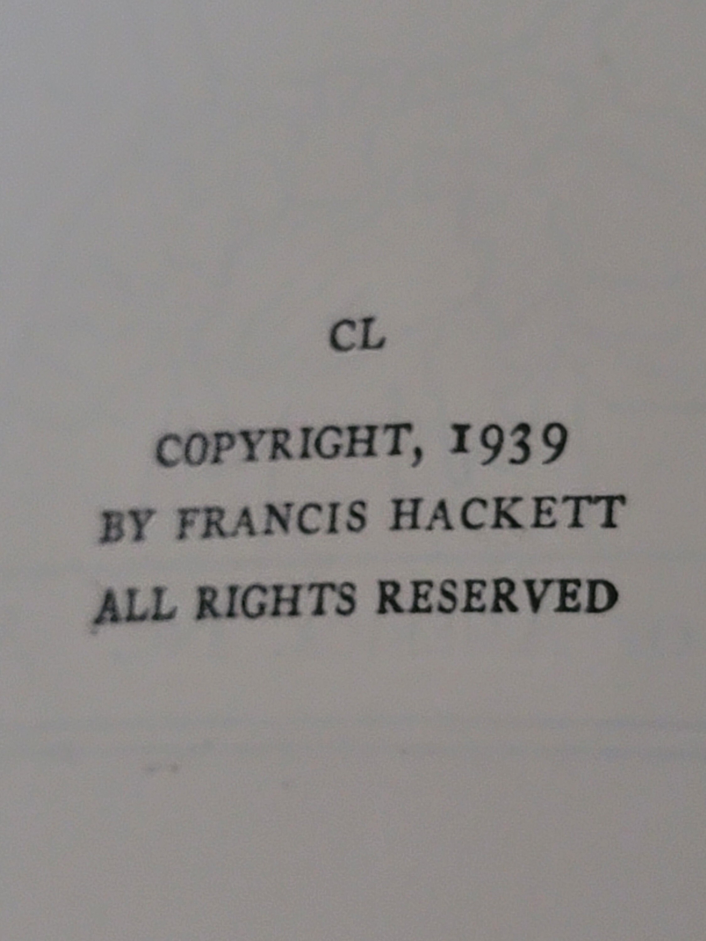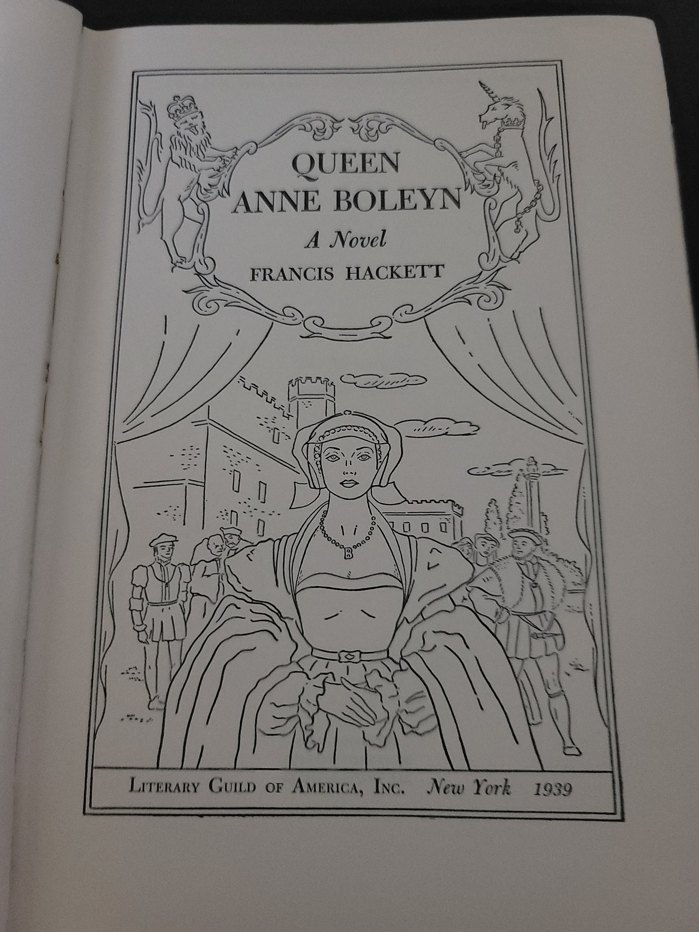 Published by the Literary Guild and printed by Country Life Press in 1939, this first edition book is a novel by Francis Hackett about Queen Anne Bolelyn, one of the wives of Henry VIII. It is a historical novel with embellishments such as Anne's mother who nothing is known about but the author made her a character. The epilogue explains this and was written in Denmark August 1939 by the author.