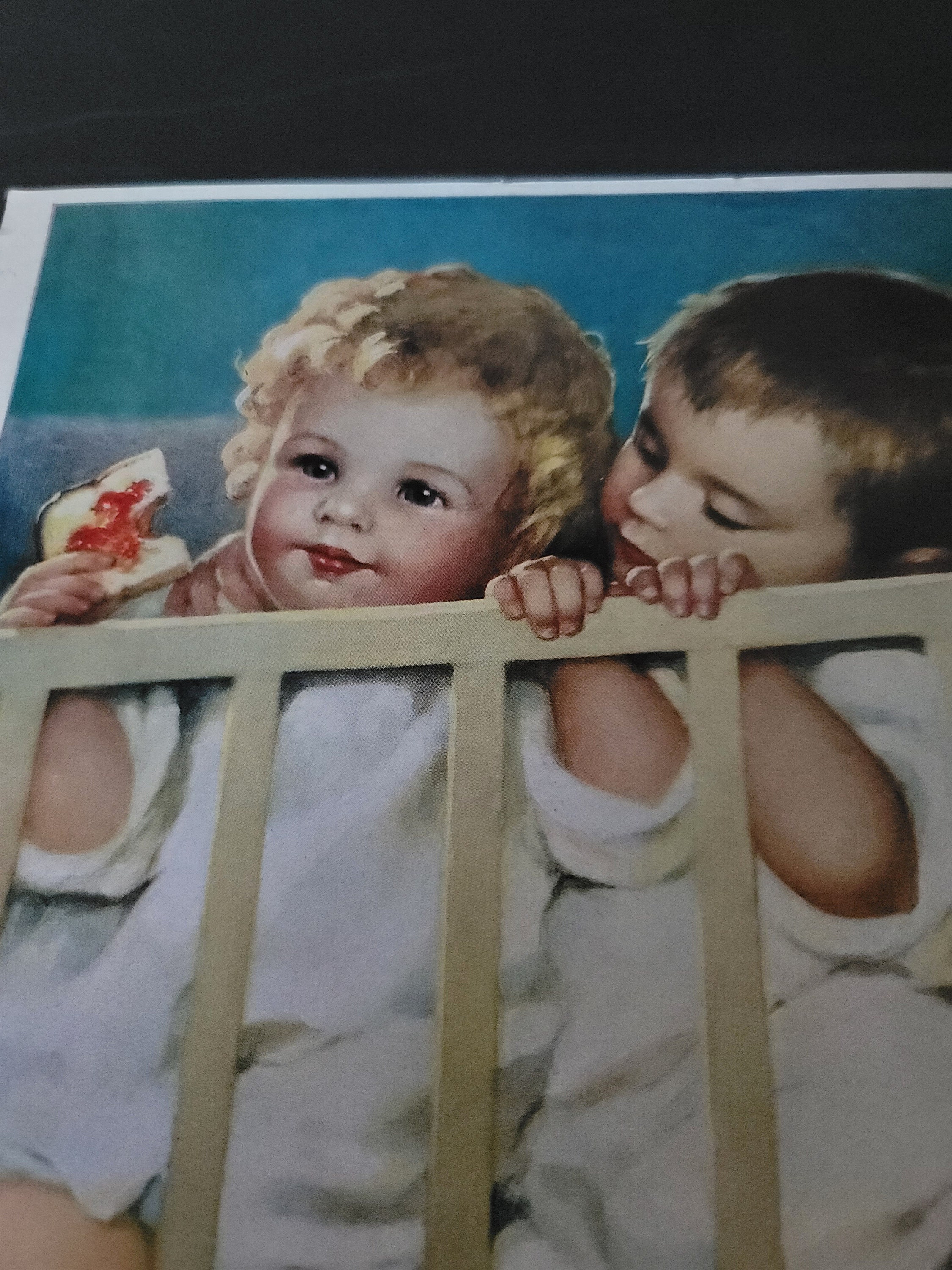 This is an 8 x 10" litho print of tow adorable babies in a crib, one eating toast with jelly and the other looking like he wants her to share. It is very cute and colorful. It has a white border around the edge. It is on shiny paper. It is by Annie Benson Muller who was an impressionist and painted mostly babies. She was born in 1879.Theree is There is a tear in the bottom of the picture. It also says "The diplomat" on the bottom which I believe is the title of this painting.