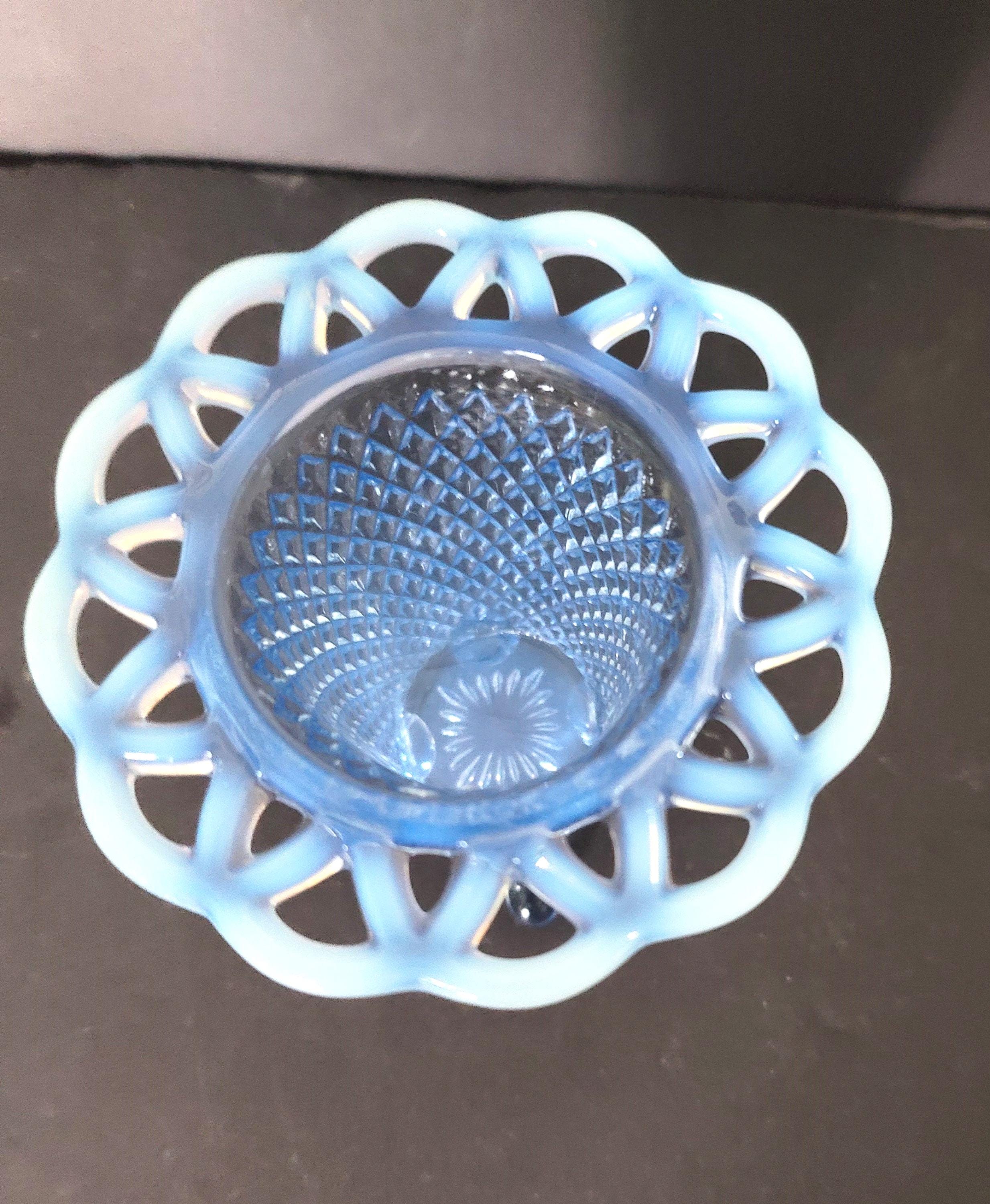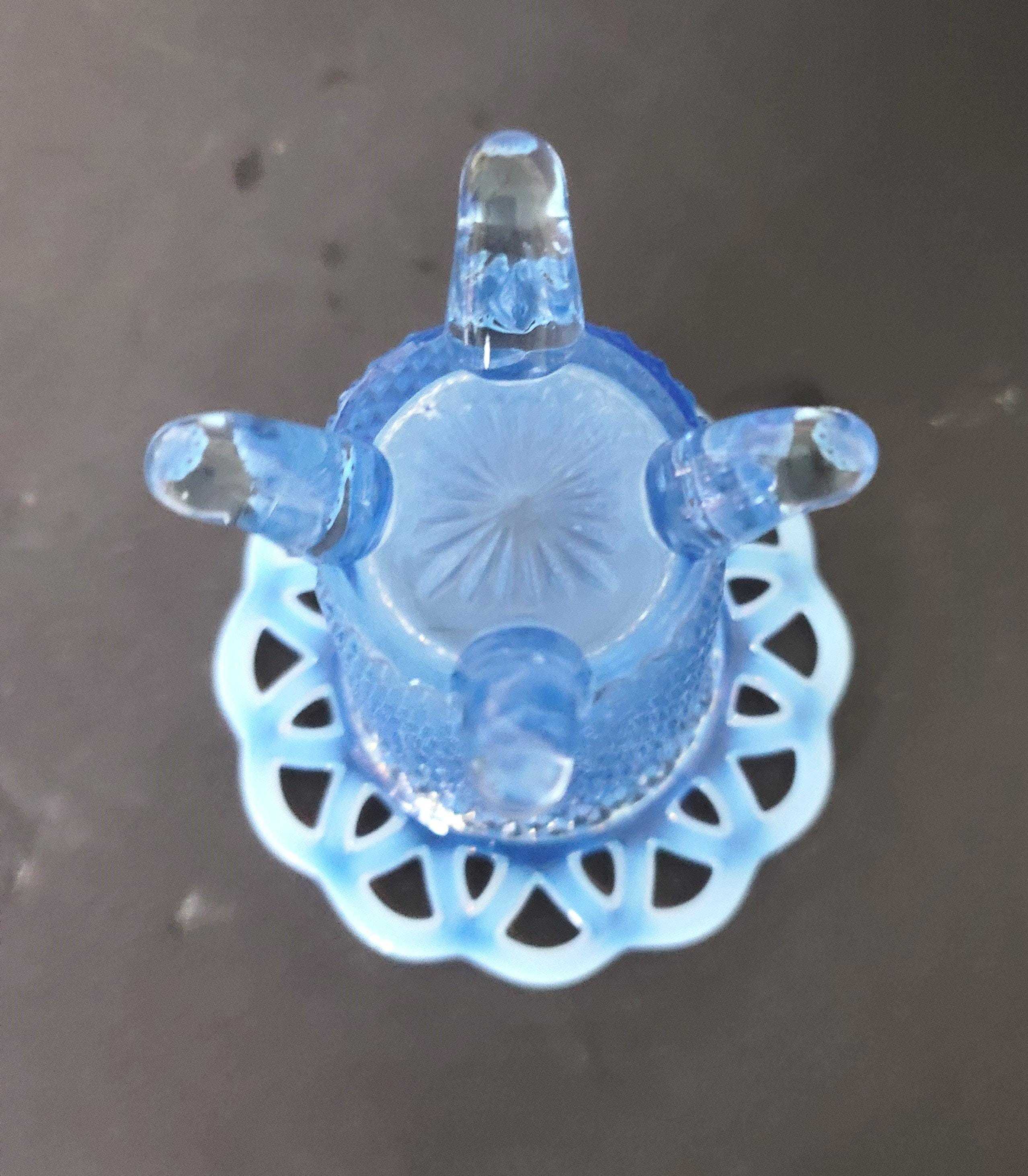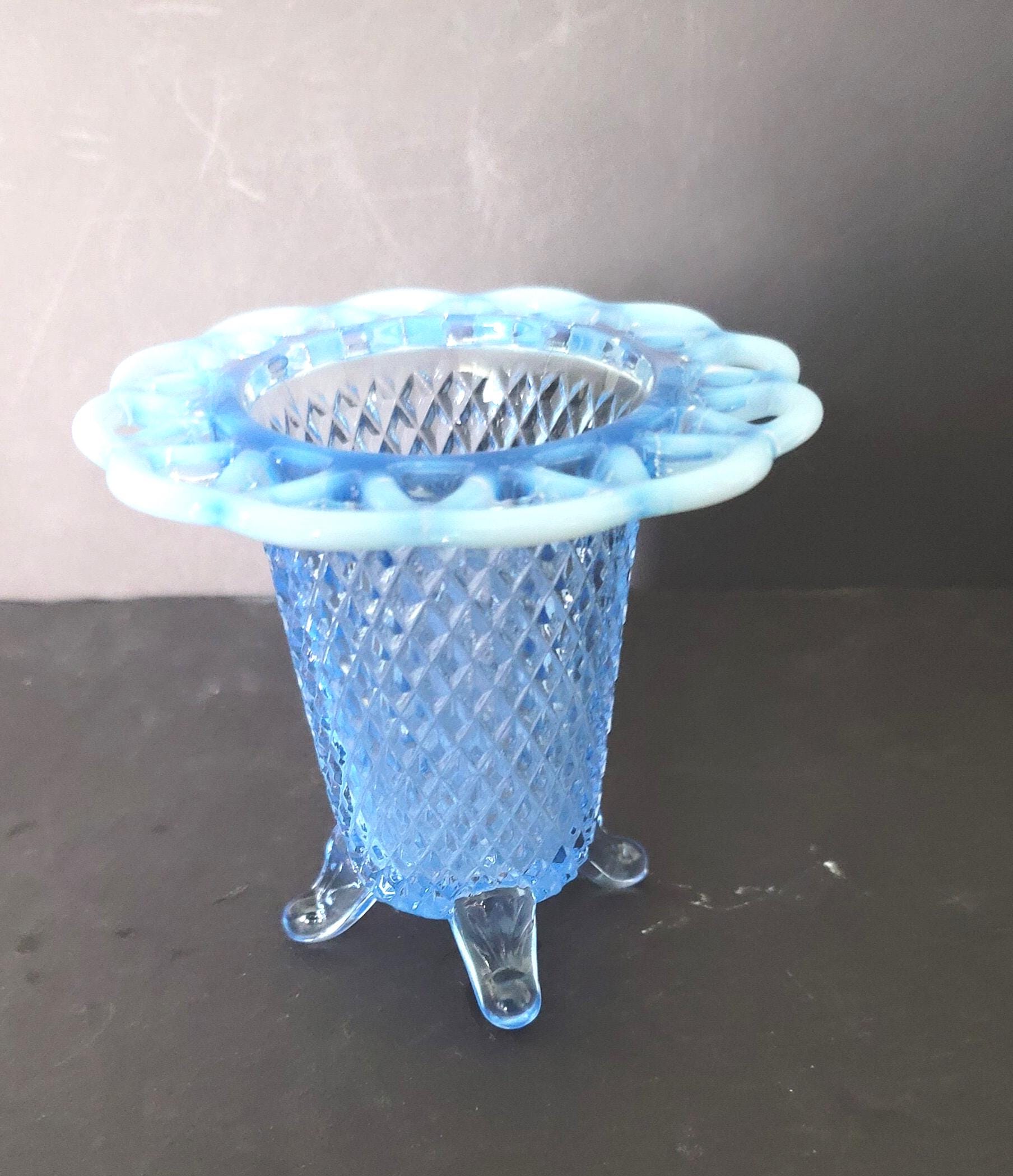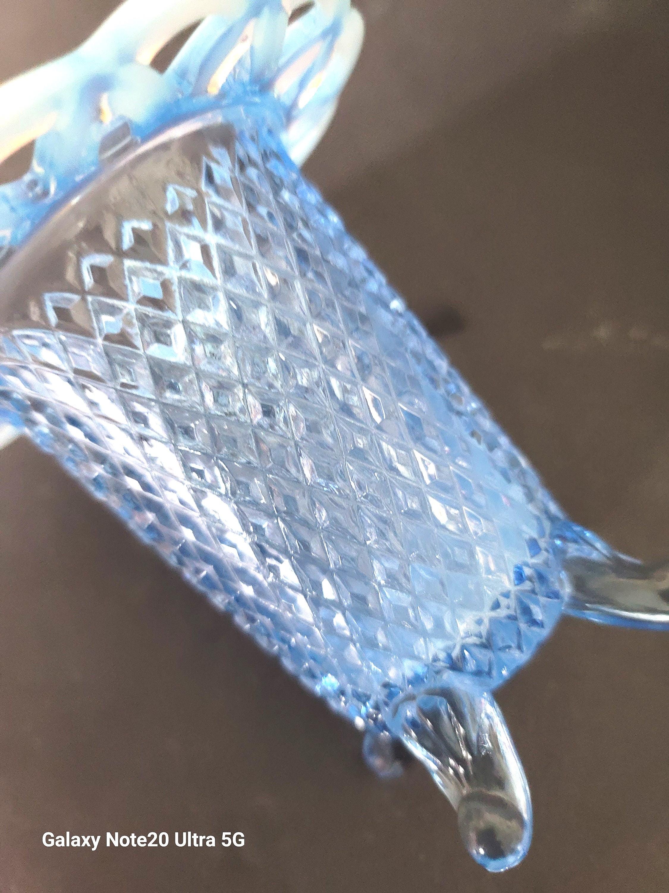 Here is a very lovely footed spooner (they used to put spoons in these for tea). It has a beautiful glass crochet edge that is opalescent blue and white. The body is diamond hatch or lattice design. It has four clear glass feet. It is 4.5" tall and the top is 4.5" with a 2.5" opening. The feet are 1". FREE US Shipping on this baby! In great condition. No flaws, chips, nicks or cracks.