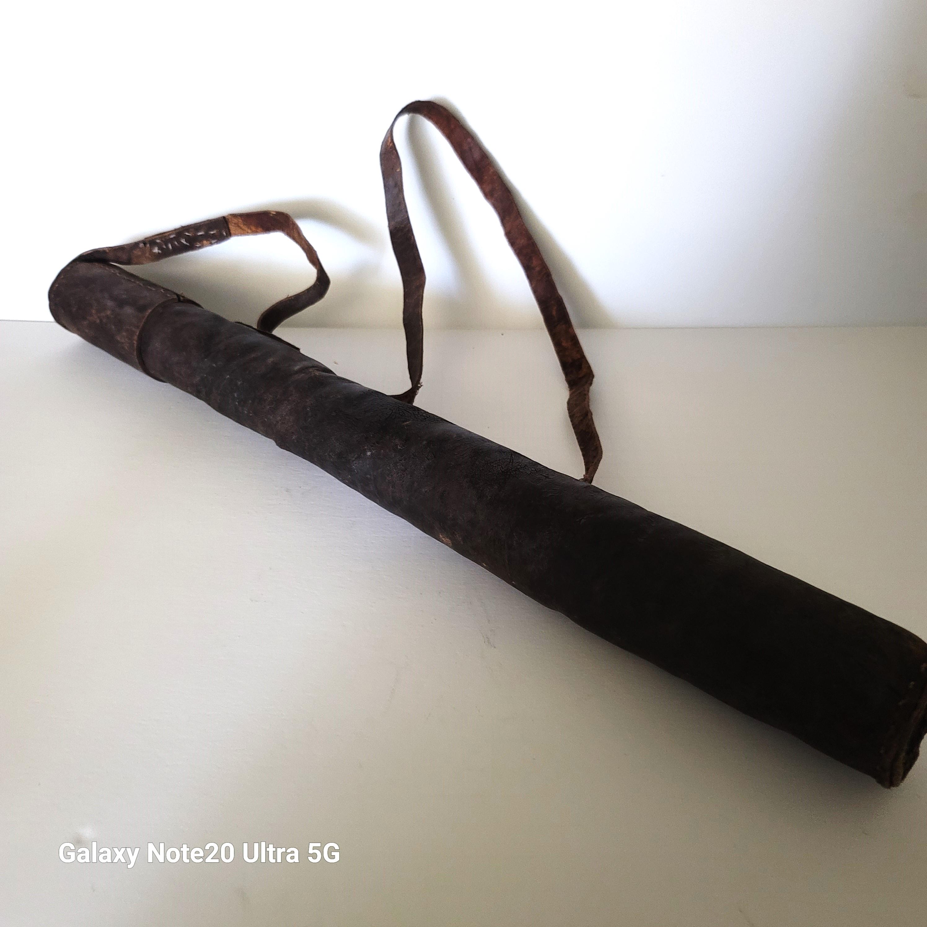 This is a Maori made African Quiver with arrows. The quiver is made from a thick hide, very stiff. It has a cap on one end which is attached to the arm holder so it won't be lost. The quiver is 21.5" in length with the cap on and is 2" in diameter. There are 3 arrows made of wood, steel and feathers. The feathers on 2 are well worn, one is missing the feathers. The arrow tips are very sharp and on the of arrows is missing a small piece. The strap is sewn onto the cylinder and is about 40". FREE Shipping in US