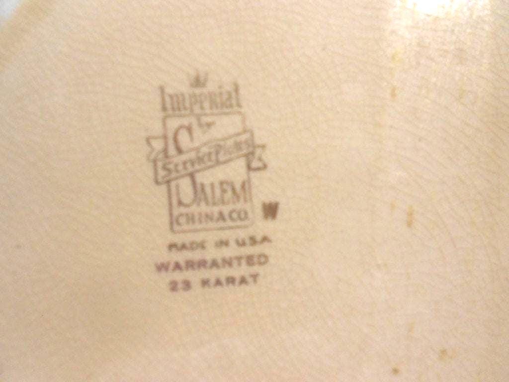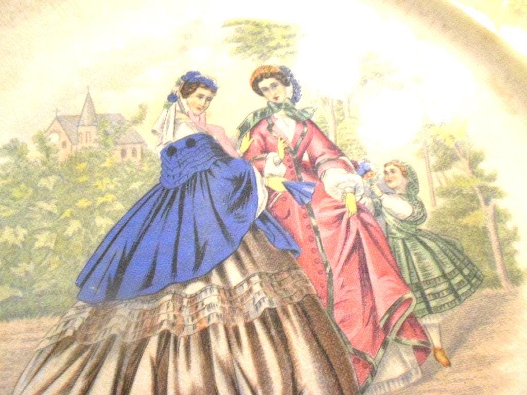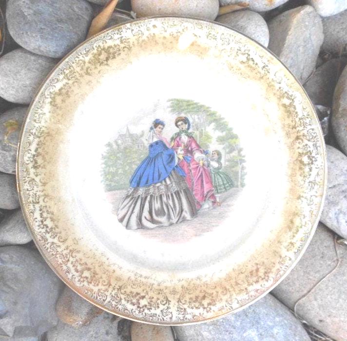 Rare find- Salem China of Salem OH Service Plate made in the 1940's. The pattern is "Godey Prints" with Victorian Women in the park. This one is a rare find due to the fact it is ivory. This pattern came in blue, maroon and green of which there seem to be plenty but the 23 Karat gold on ivory I have been unable to find for sale. It has been well used, half of the gold pattern has been worn off. On the back it has crazing and a stain. It is 11" in diameter.