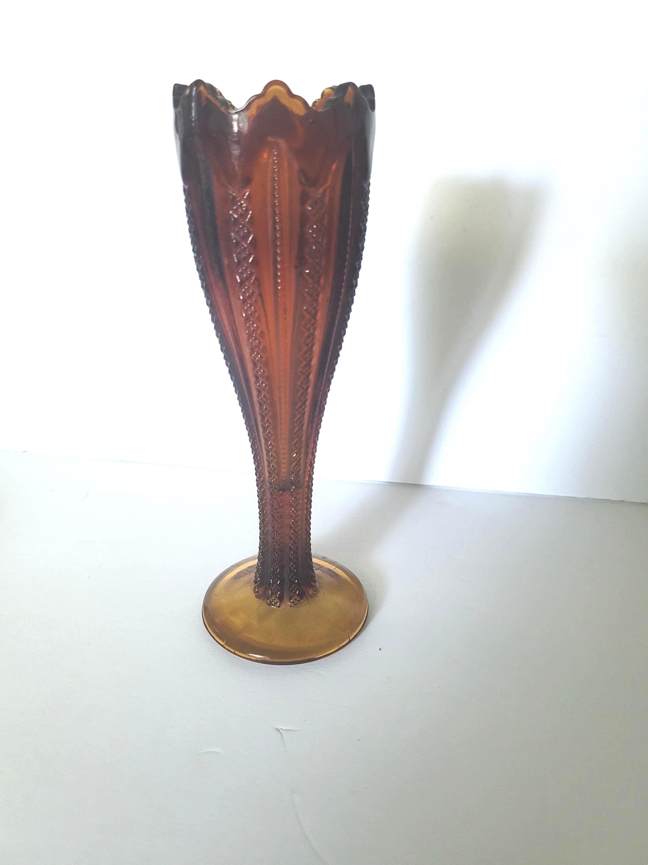 Well, I have to admit- I got took on this one at auction. I thought it was antique. It's not. It was made by Indiana Glass for Tiara which was a company that did home decor parties in the 70s. But, it is still vintage, still pretty, still will look great in your home. It is tall- 10.25" and the base is 3.5". It's very heavy, at 1 1/2 lbs. It has a pretty triangle scalloped edge and raised diamond ribbon patterns down the sides. It is a brown amber but almost looks purple in certain light. It is collectible. Free shipping in the US.