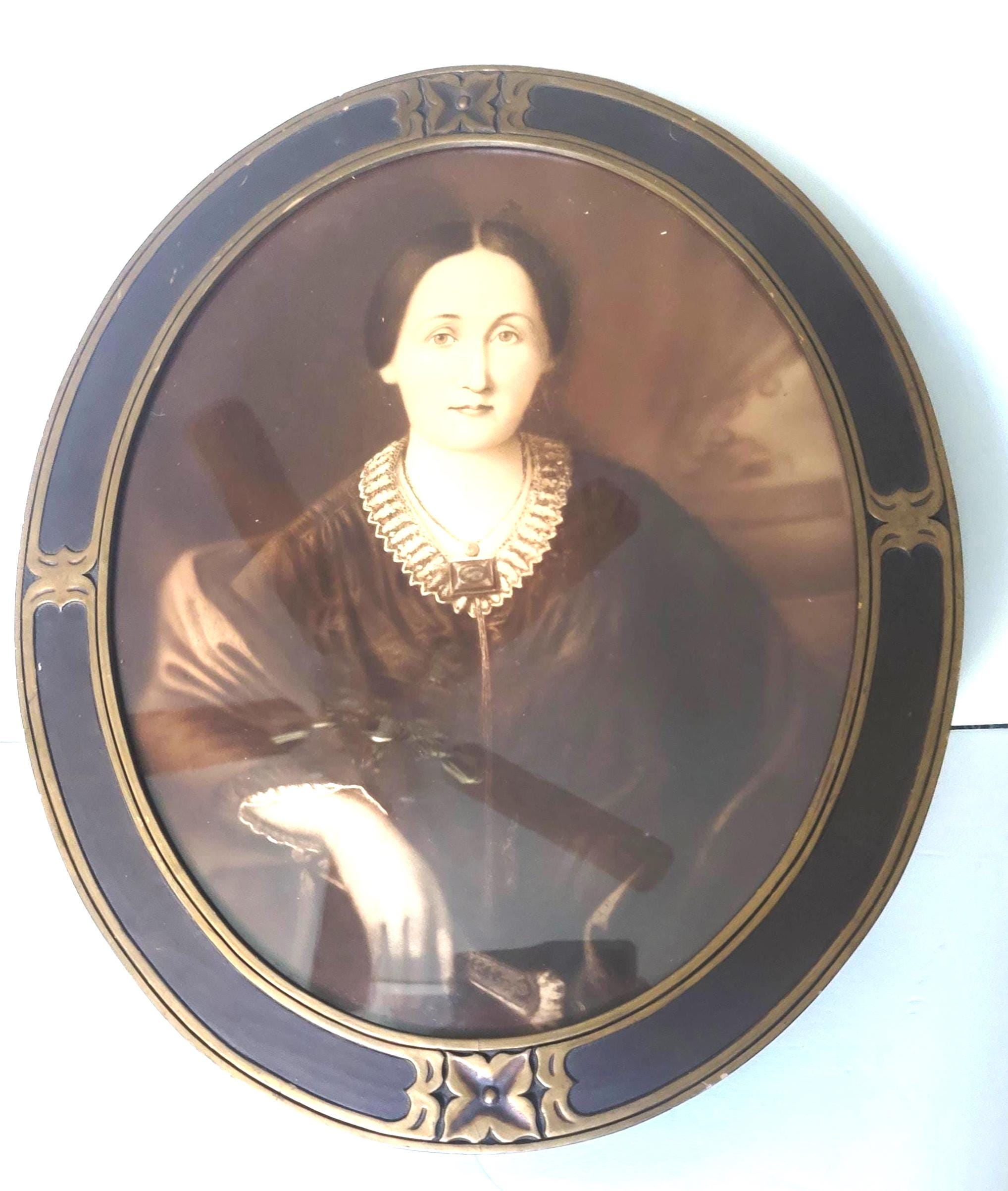 This piece is of course a mystery of who the young woman is. It is a beautiful portrait in a beautiful frame. I do know that on the back it has AE Schneider 509 Union St Seattle. Alfred E Schneider had an art gallery there. The frame is solid wood, 2" wide with a flower motif and gilding. It is 23.5 x 19.5". It is .75" thick. The glass is flat. The back has cardboard on the back of the artwork, set in place by 12 finishing nails. It had paper over that at one time as there is some glue and paper left on the edges of the frame. Has screw eyes and wire to hang.
