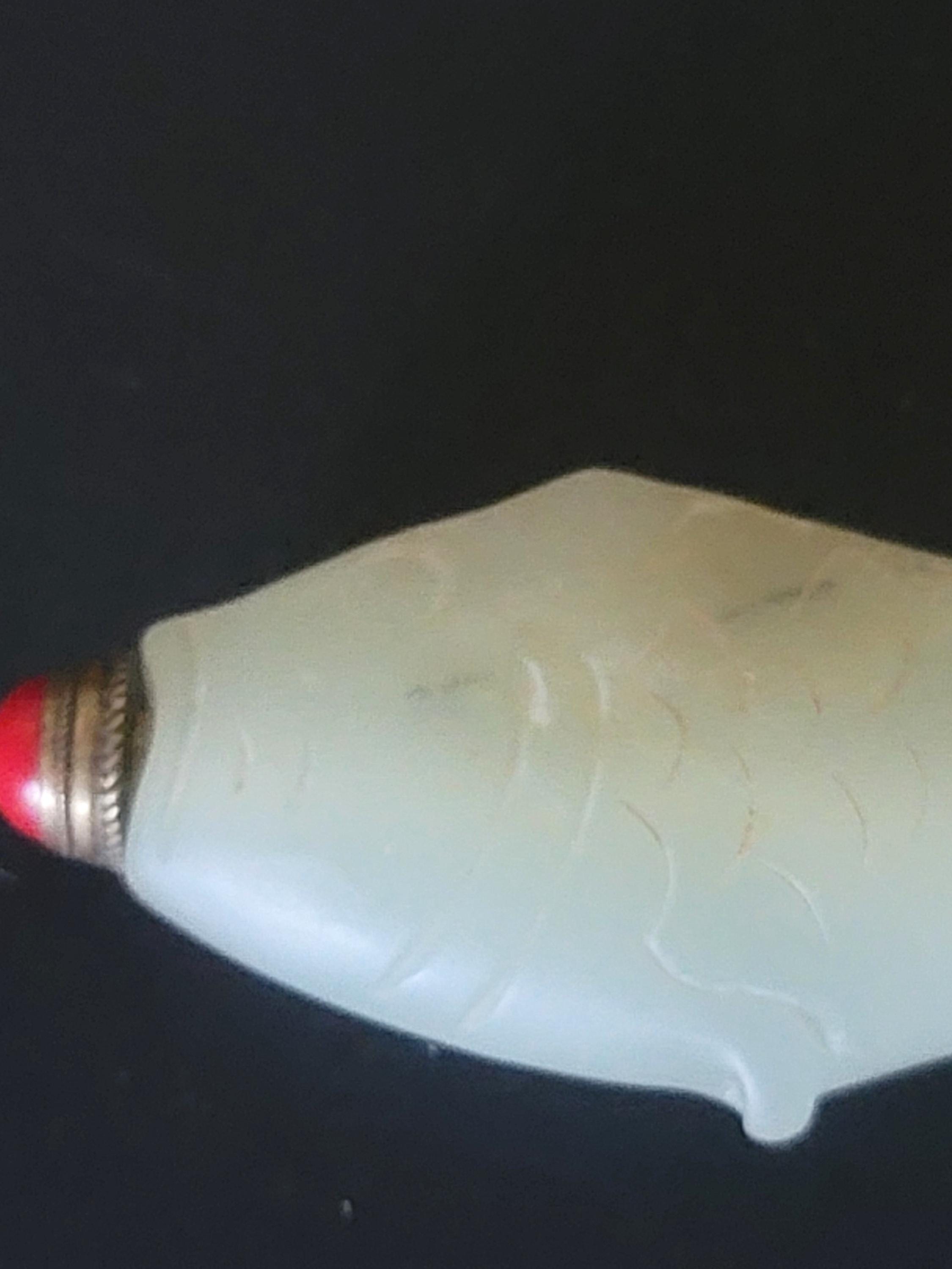This piece is amazing if I do say so myself. It was really dirty when I got it but it cleaned up really nice and turned out to be a great item. It is early 1900s, made in China out of white or mutton jade. It is a leaping carp and had fins, eyes and scales etched into it. The top is brass and red coral and you pull it out to reveal a tiny shovel. It is 3" tall, 1.5" wide and .5" deep. It weighs 1.9 oz. it has some thin black lines in the jade. FREE shipping in the US.