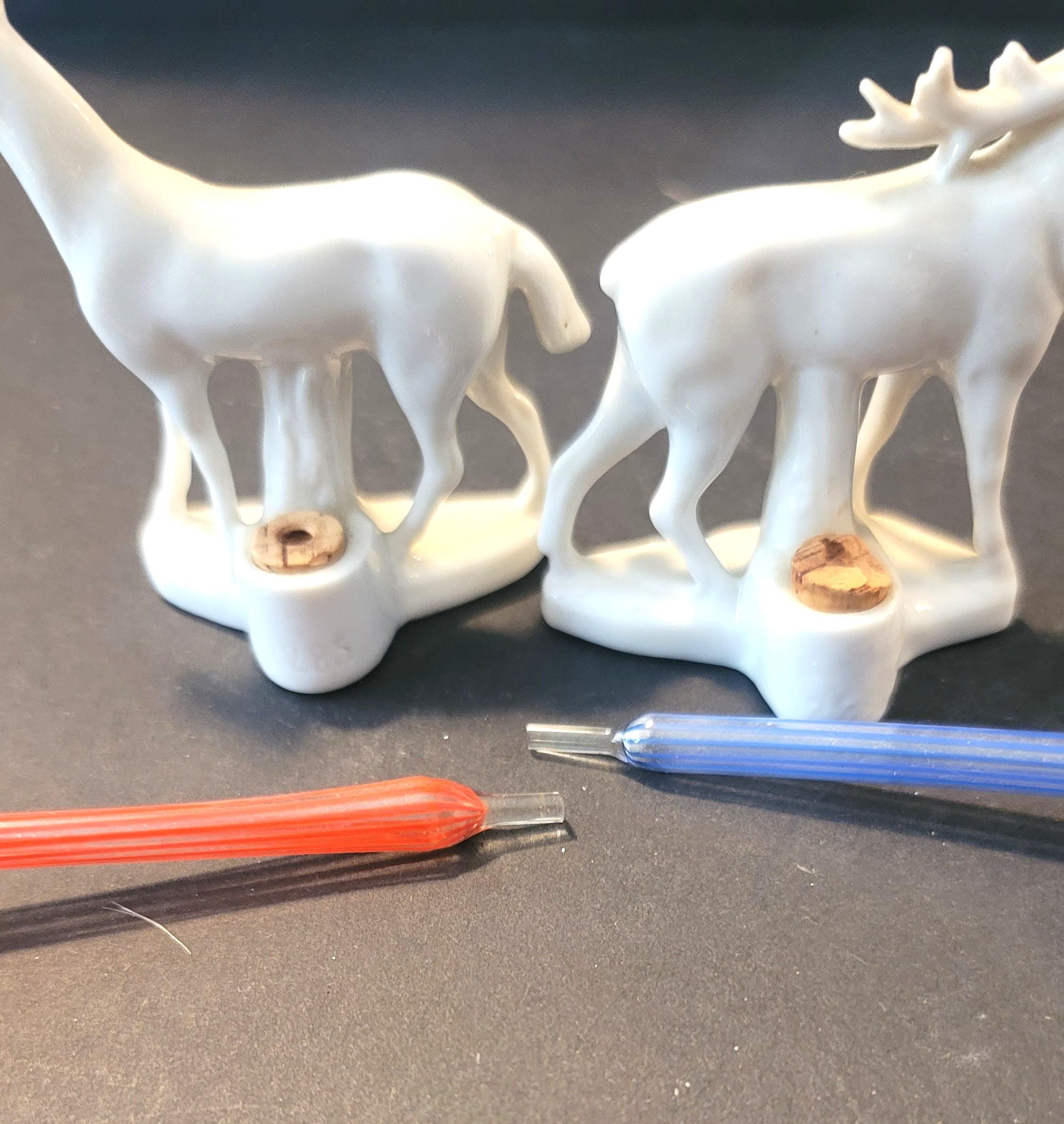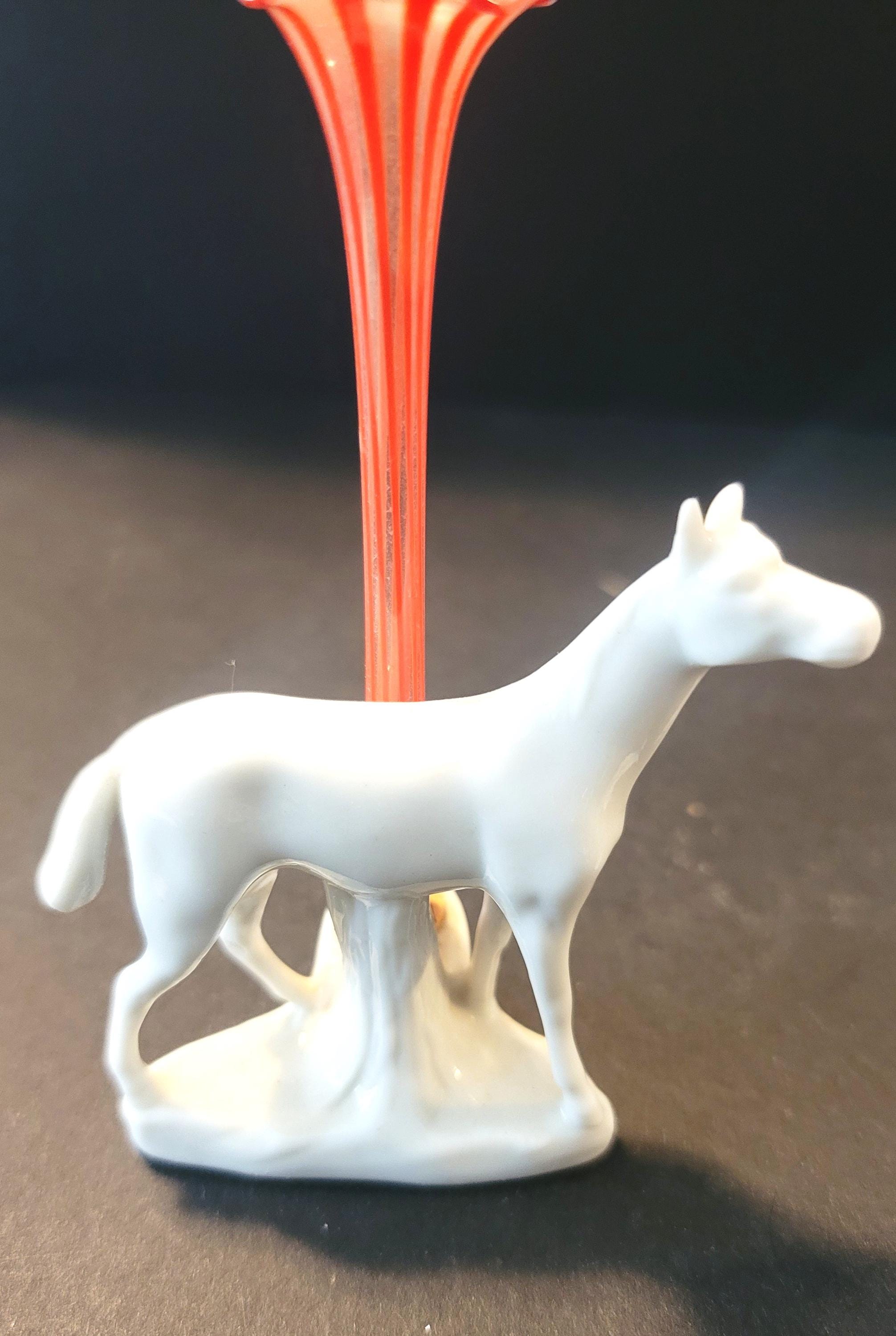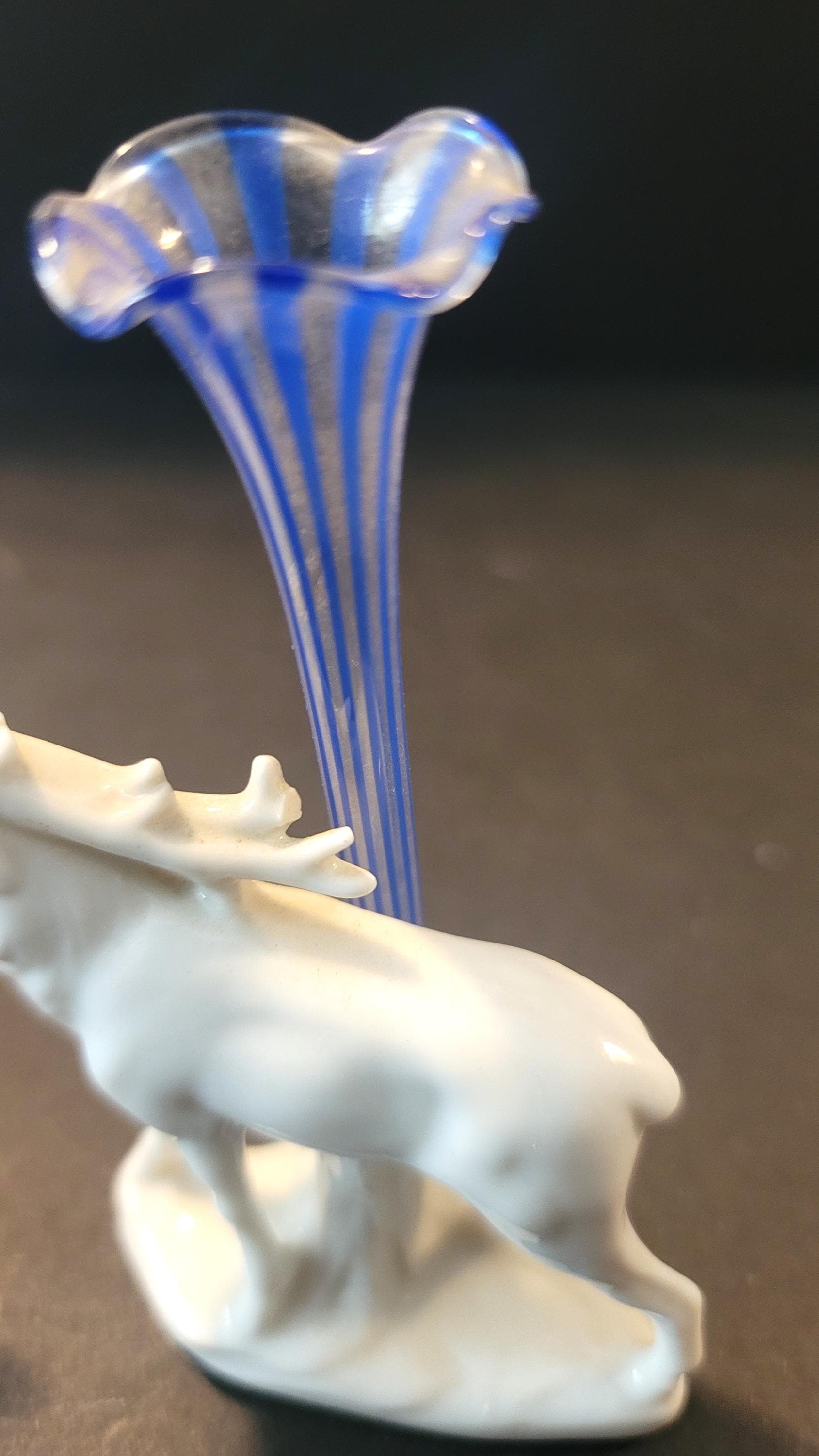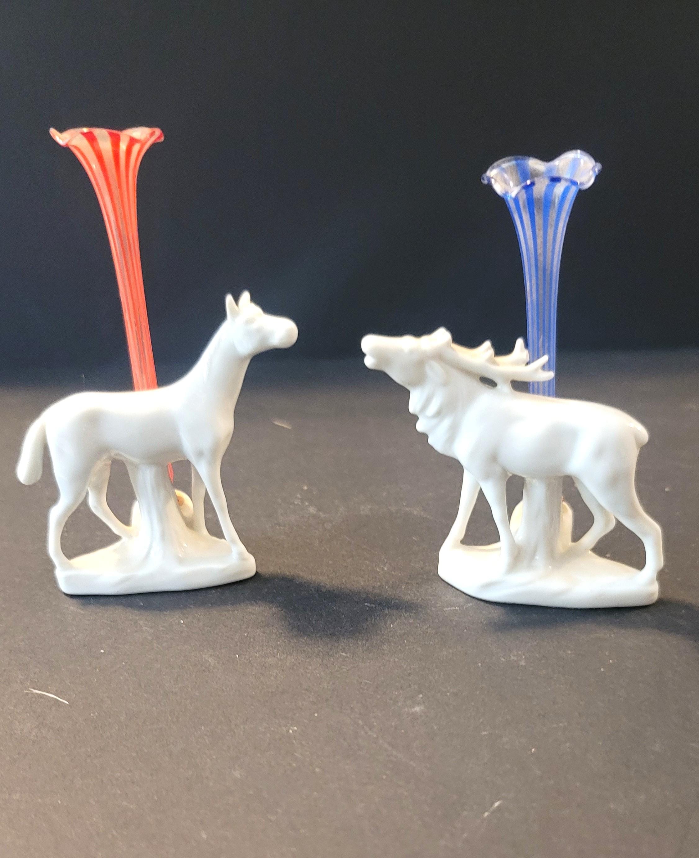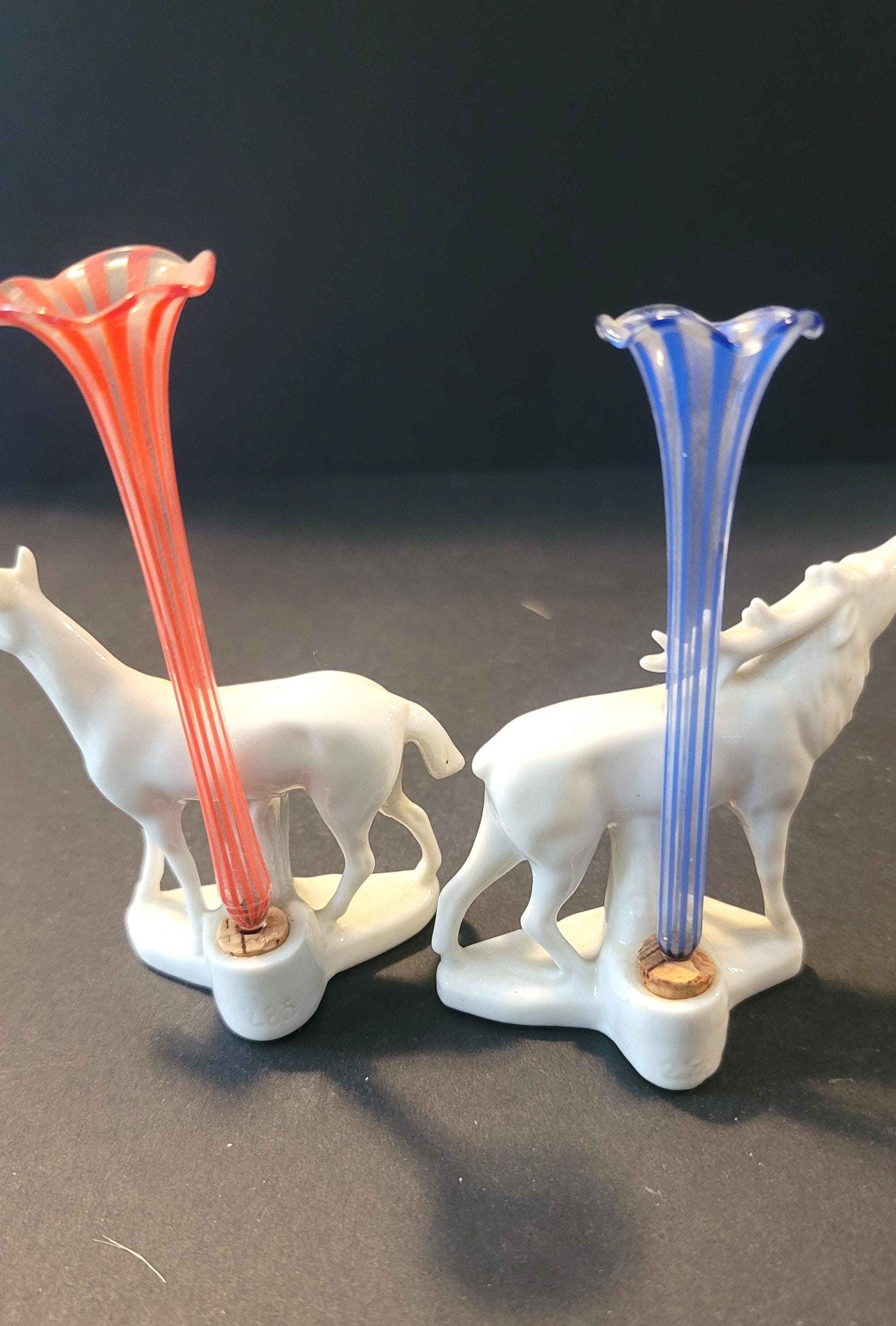 These are a pair of ceramic white animals, a horse and an elk that have a place behind them that fits a cork. The vase end fits in the cork and is used to vase one or 2 stems. The elk is 2.75 x 1.75 x 3" tall. The horse is 2.25 x 1.5 x 3.25 and each vase is 3.5" tall. These are from the 1930s. There is no maker mark on them. Free shipping in the USA.