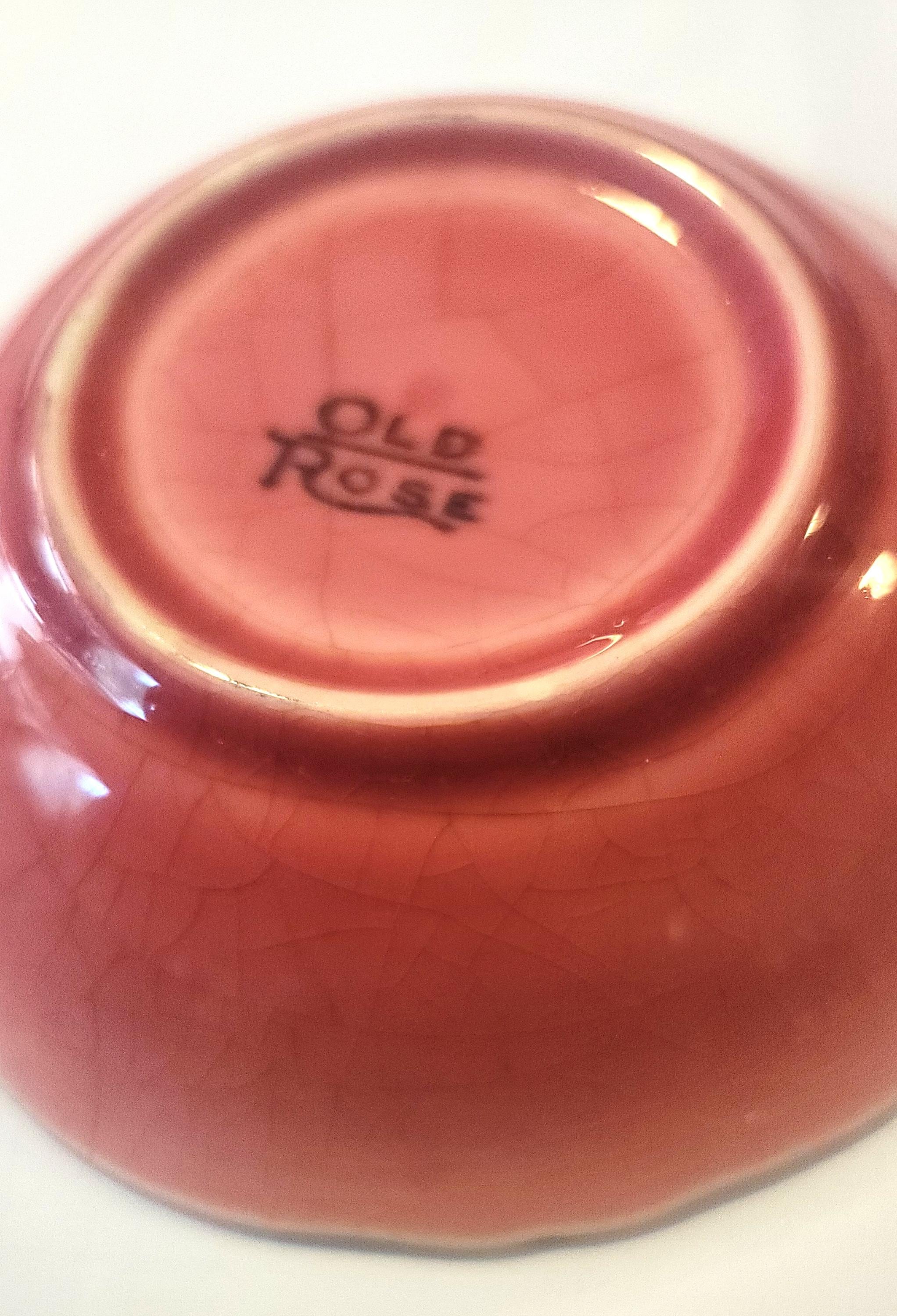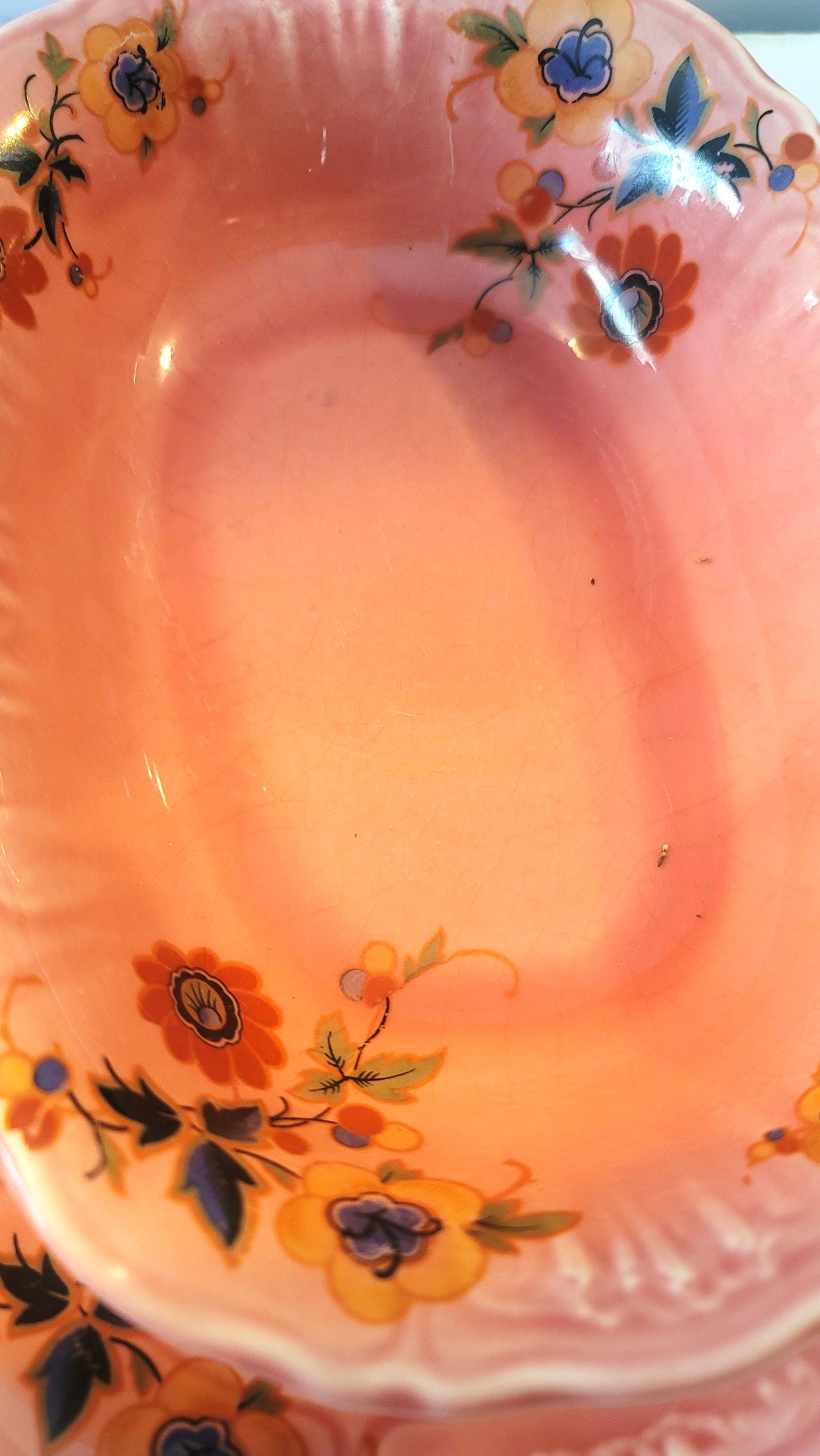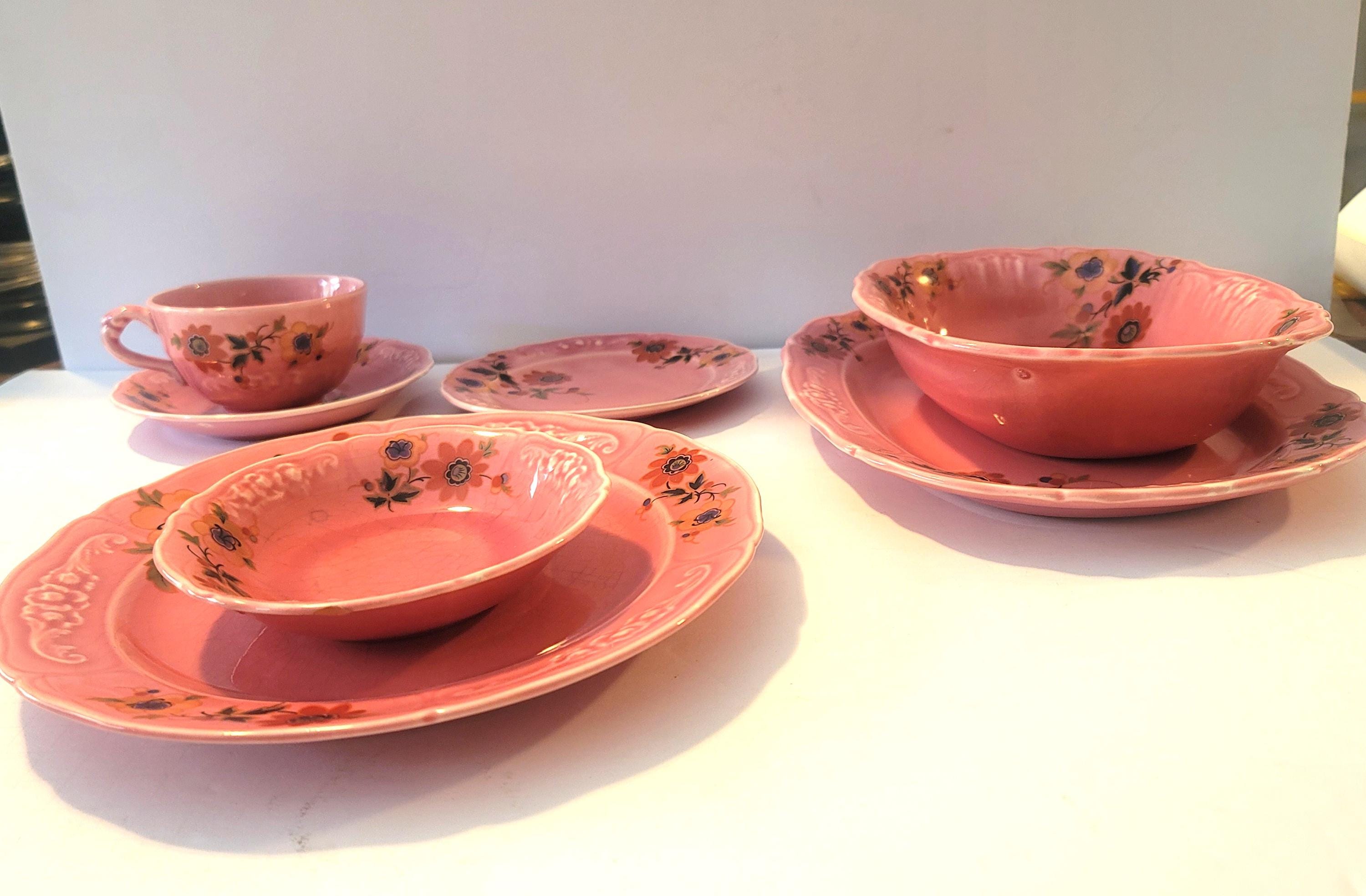 I have had this set for a long time! I kept hoping I would find out who made it but have not. The bottoms are marked "Old Rose". They are bright pink with orange, blue and yellow flowers with embossed scrollwork. It is a full set of 6. Plate, salad bowl, bread plate and cup and saucer with a platter and a serving dish. However, there are only 5 cup and saucers. The dinner plates are 9" which are small compared to today which leaves me to believe these were made in the 30s or 40s. The person who I got them from has had them about 50 years and they were her late grandmothers. The platter is 11 3/8 x 8 1/2". The serving bowl is 9 x 6.75". There are no nicks, flea bites, chips or cracks but they are crazed some. Free shipping which is great as this is a pretty big, heavy set.