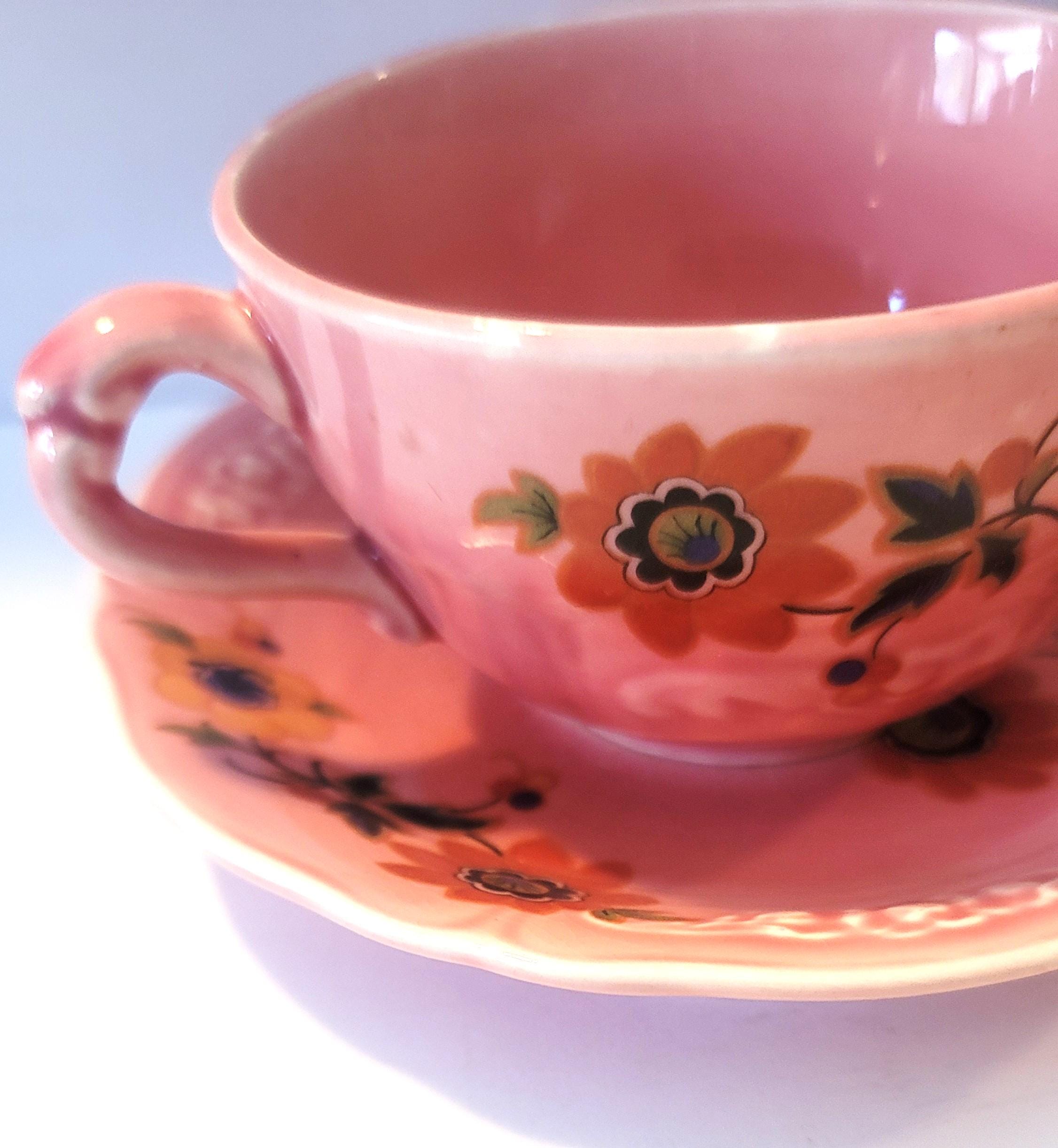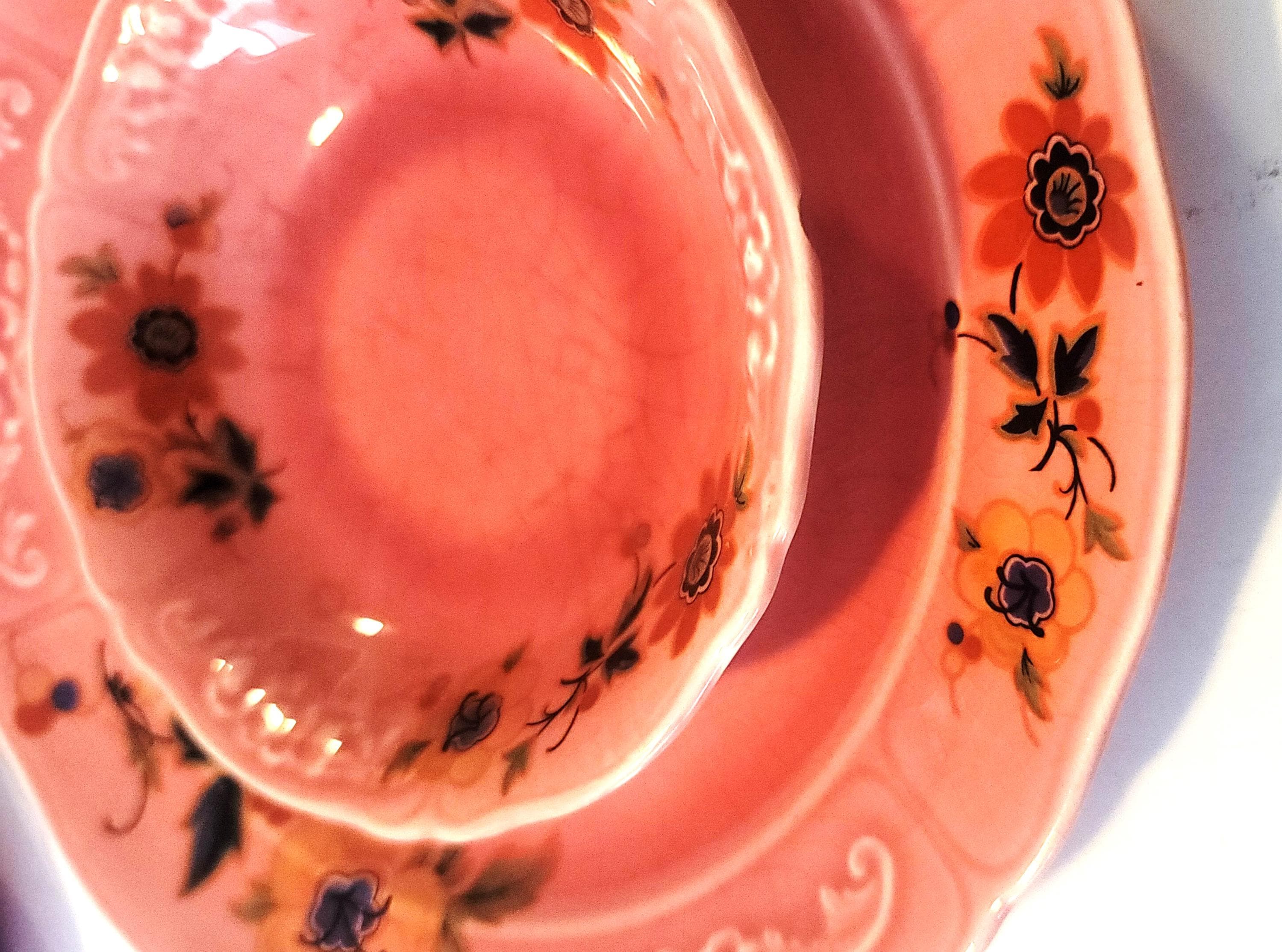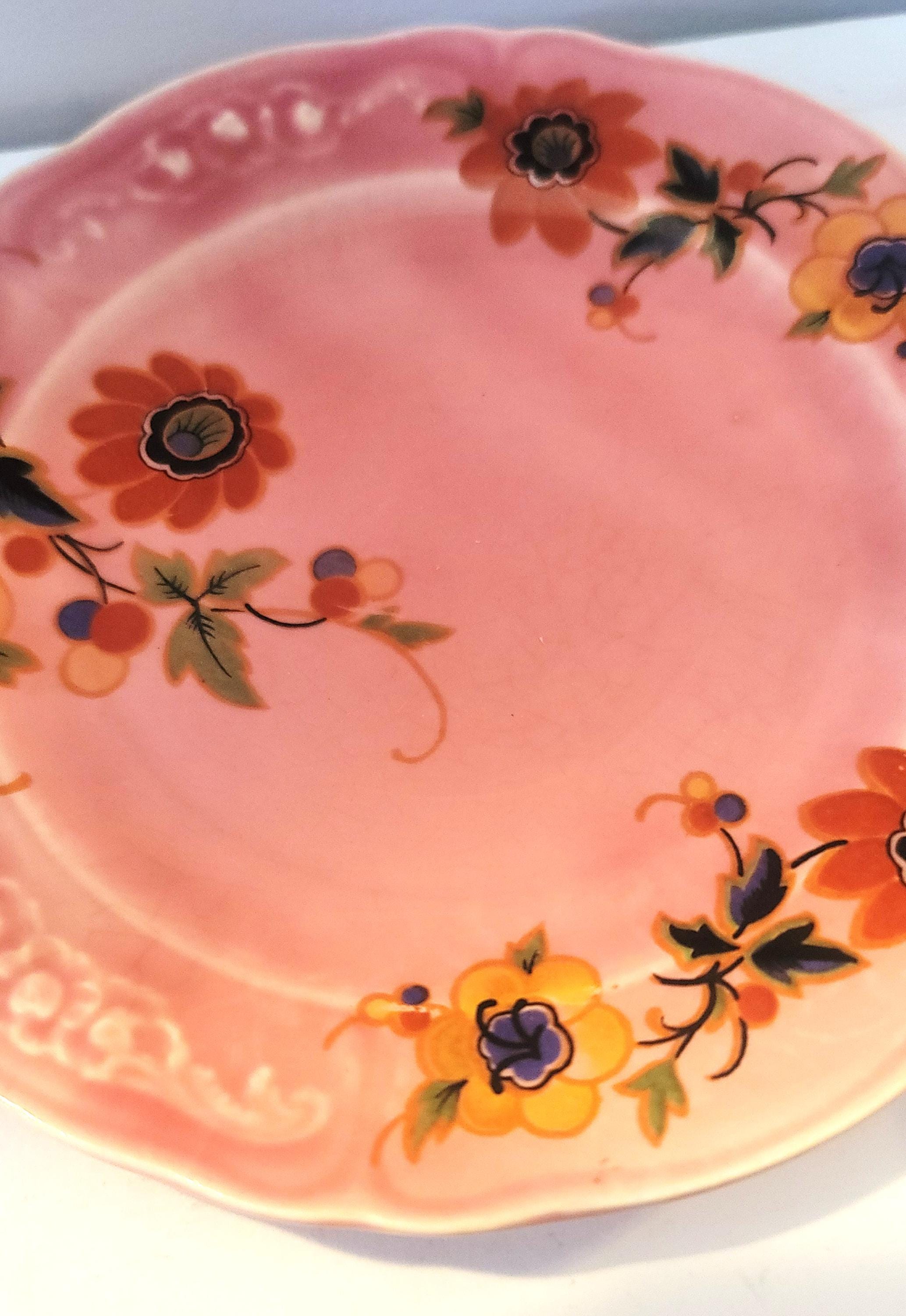 I have had this set for a long time! I kept hoping I would find out who made it but have not. The bottoms are marked "Old Rose". They are bright pink with orange, blue and yellow flowers with embossed scrollwork. It is a full set of 6. Plate, salad bowl, bread plate and cup and saucer with a platter and a serving dish. However, there are only 5 cup and saucers. The dinner plates are 9" which are small compared to today which leaves me to believe these were made in the 30s or 40s. The person who I got them from has had them about 50 years and they were her late grandmothers. The platter is 11 3/8 x 8 1/2". The serving bowl is 9 x 6.75". There are no nicks, flea bites, chips or cracks but they are crazed some. Free shipping which is great as this is a pretty big, heavy set.