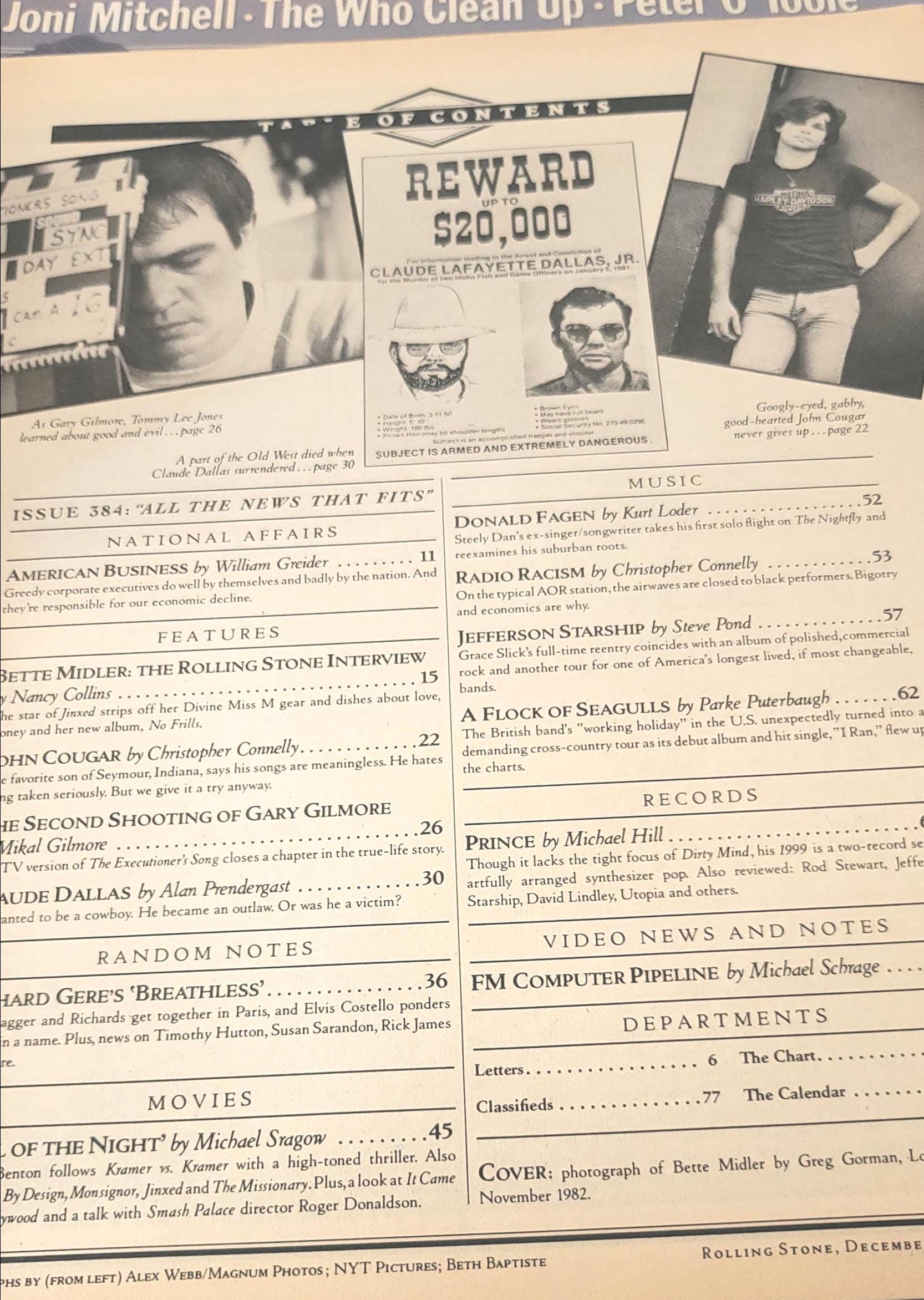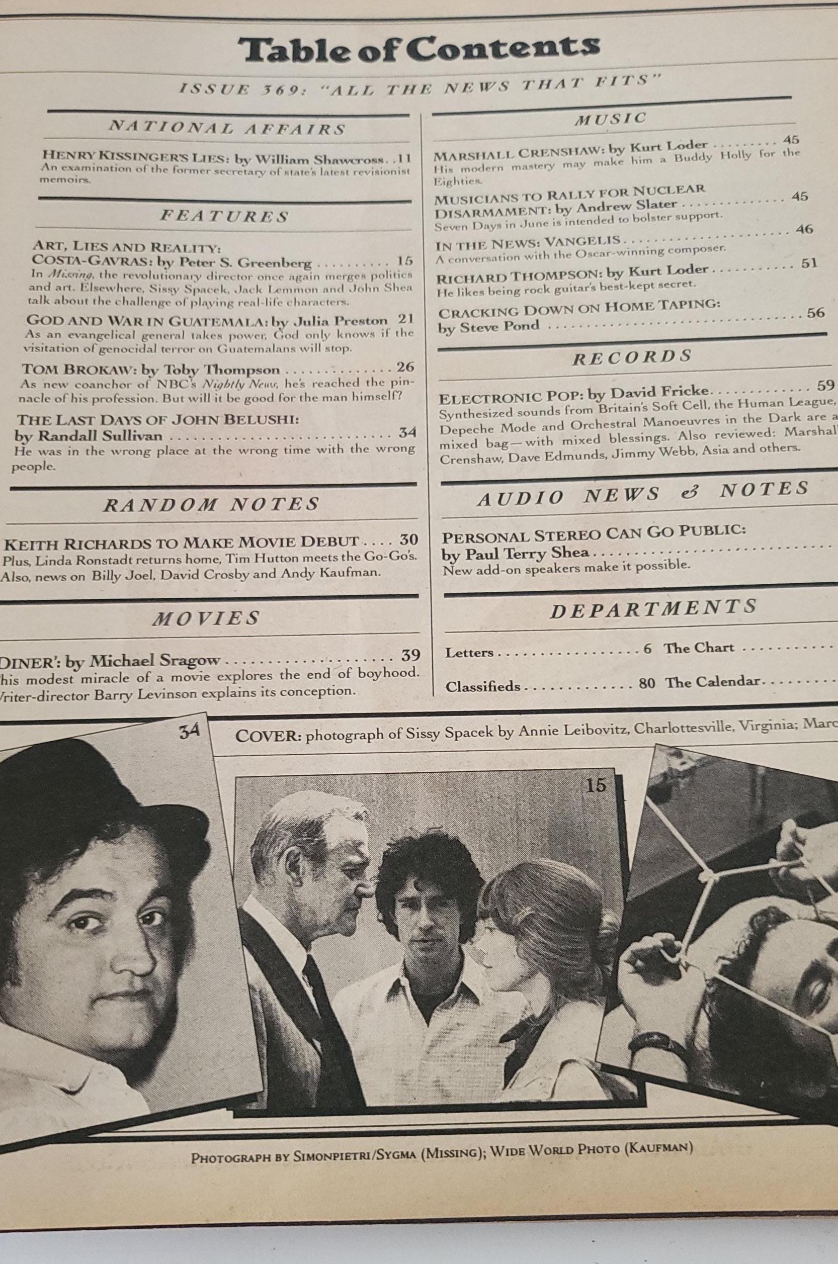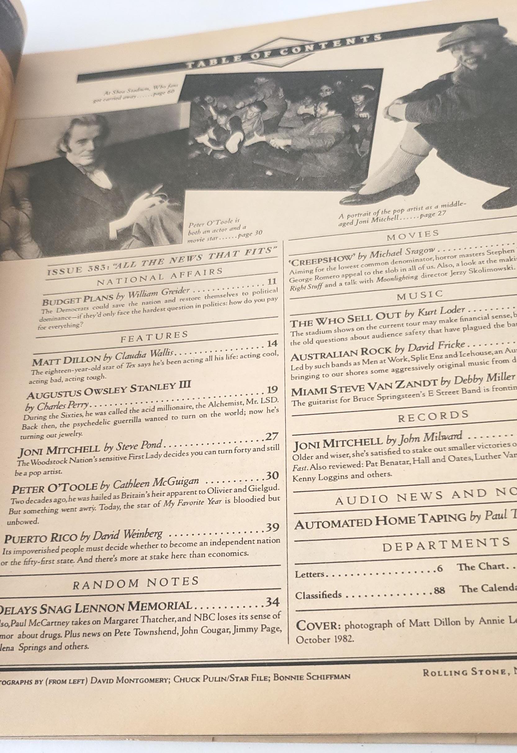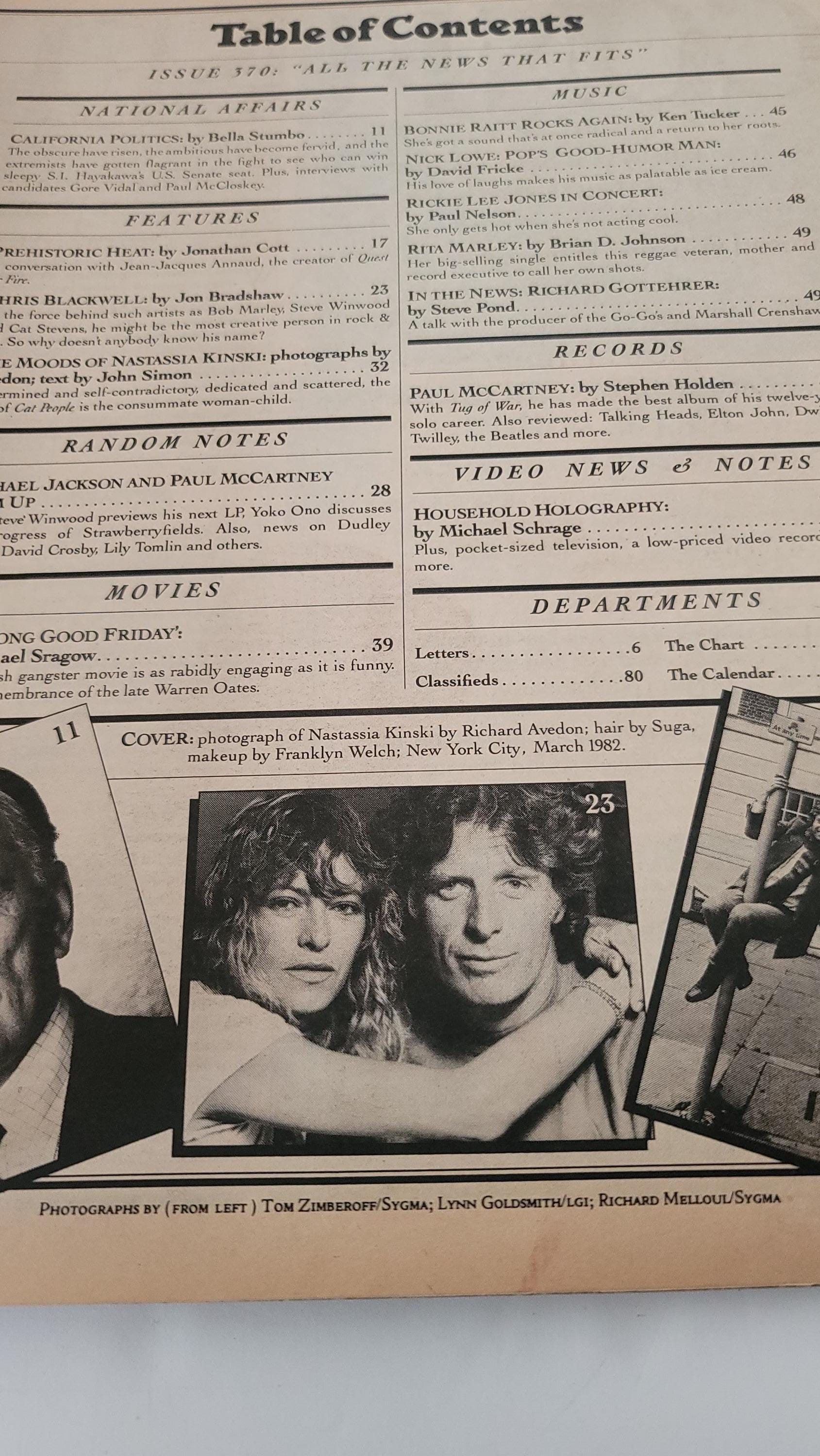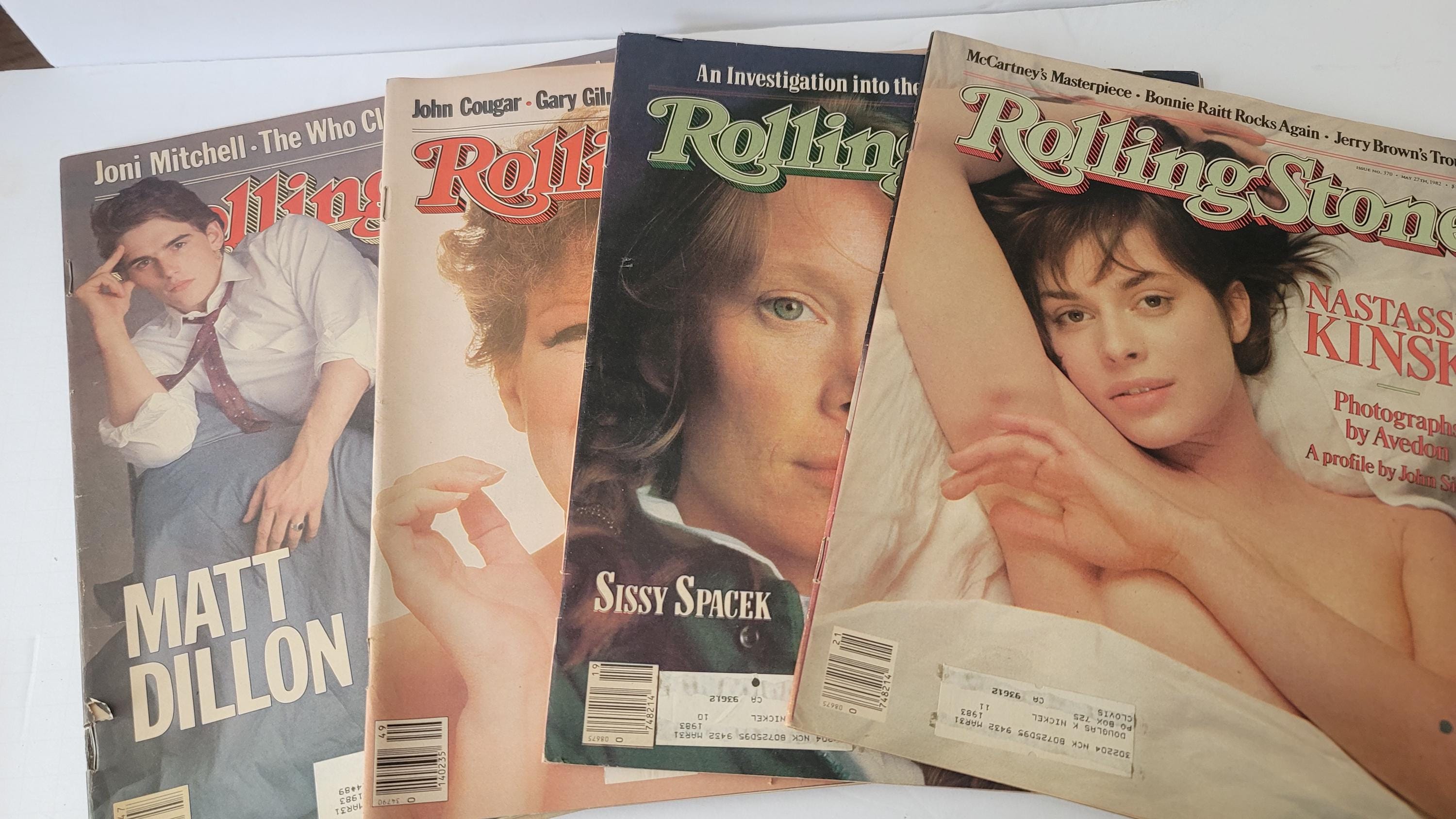 Nice set of 4 Rolling Stone Magazines from 1982 with covers of Bette Midler, Sissy Spacek, Matt Dillon and Nastassja Kinkski. All are in very good vintage condition, a little yellowing as to be expected, no musty smell. Great reads and photographs of vintage pop culture. If you buy, you are lucky, I am selling these really cheap since I have so many. I've sold about 60 over the last year so get them while you can find them.