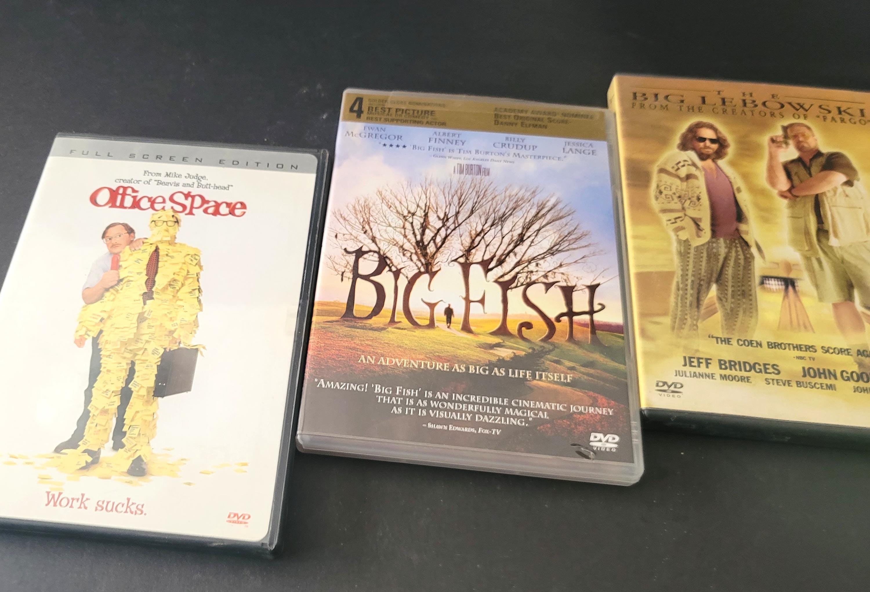 Here are 3 used DVD's from the early 2000s. The Big Lebowski with Jeff Bridges and John Goodman, Big Fish by Tim Burton starring Ewan McGregor & Jessica Lange and Office Space by Mike Judge with Jennifer Anniston and Livingston.