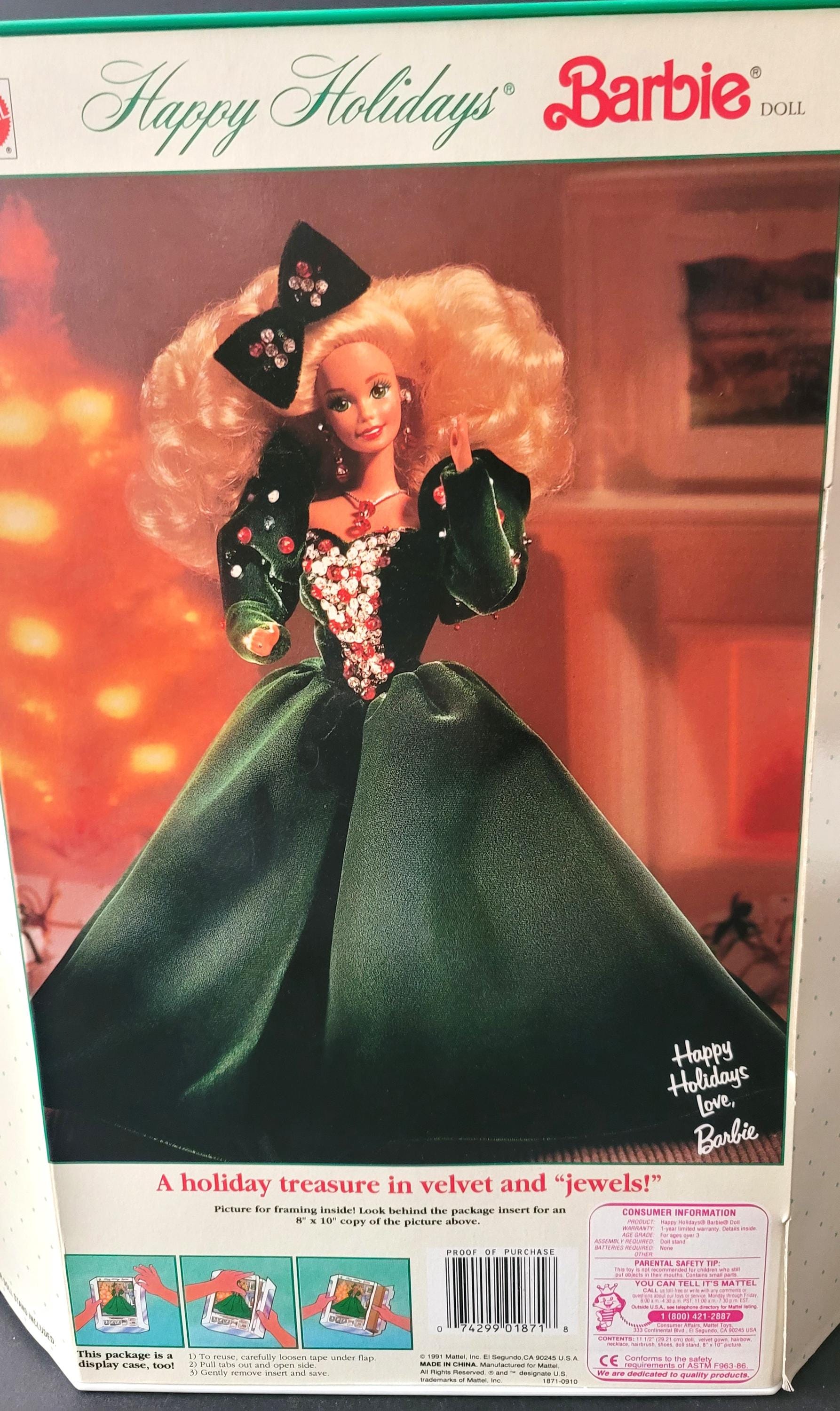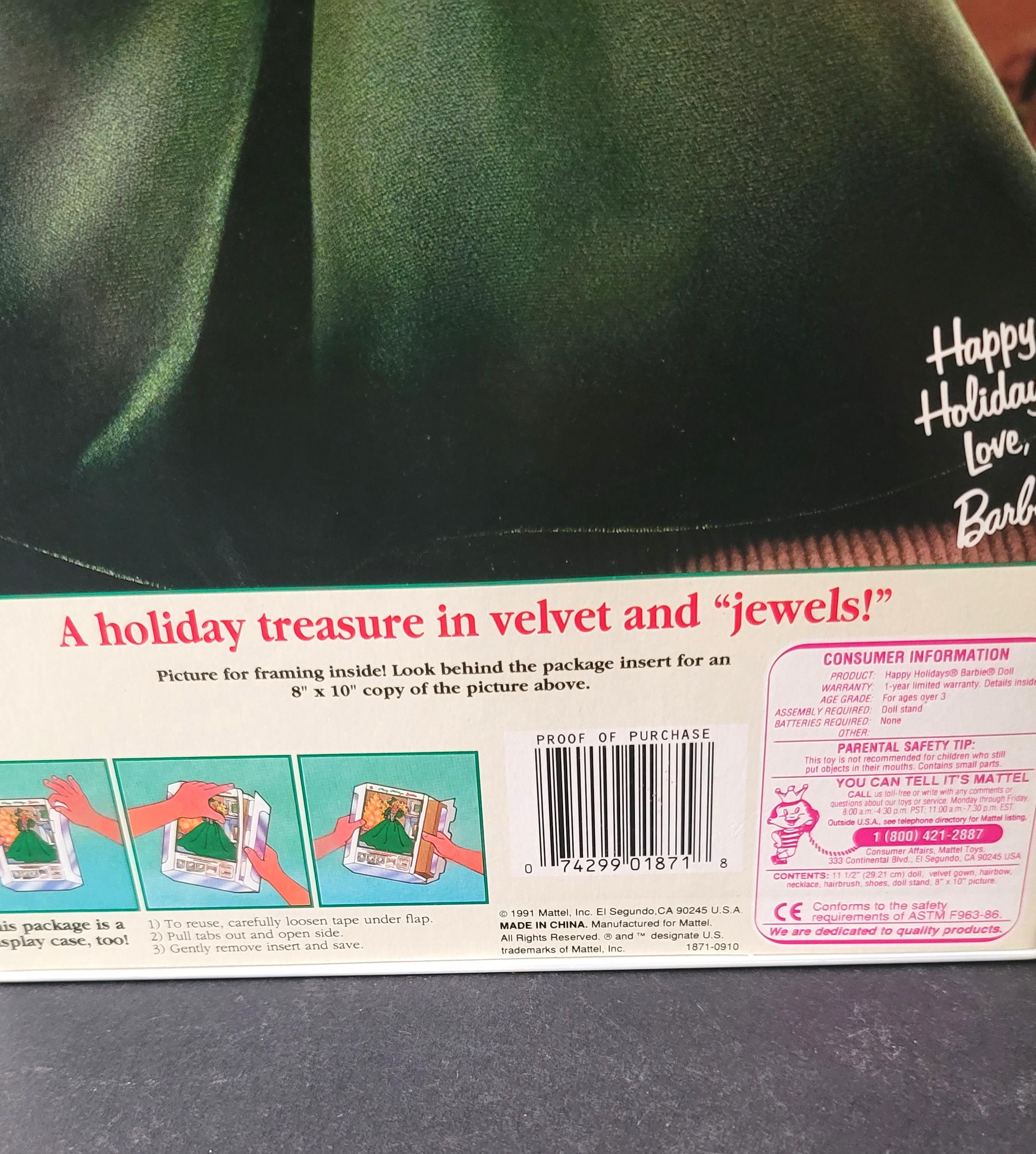 Here is a vintage Special Edition Christmas Barbie from 1991 in a green velvet gown. Never been taken out of the package. Comes with stand. She has lots of big Texas style hair and rhinestones. Regular size Barbie. Accessories include a neckllace, earrings and purse. Makes a nice gift for those collectors. Free Shipping too!