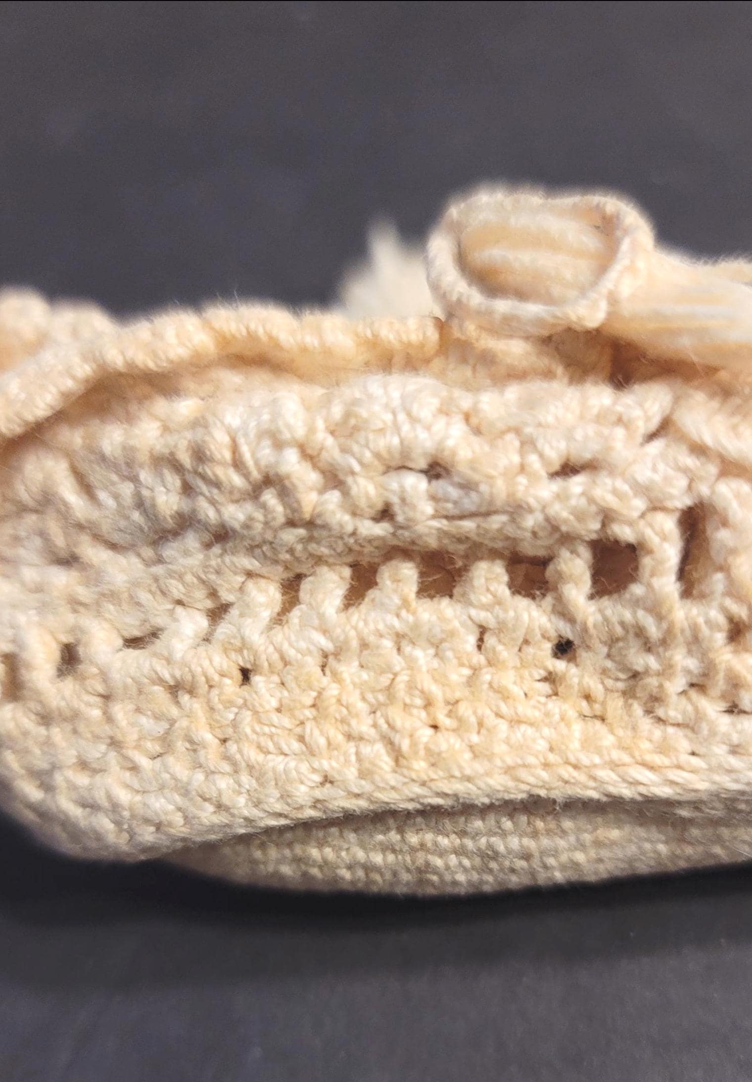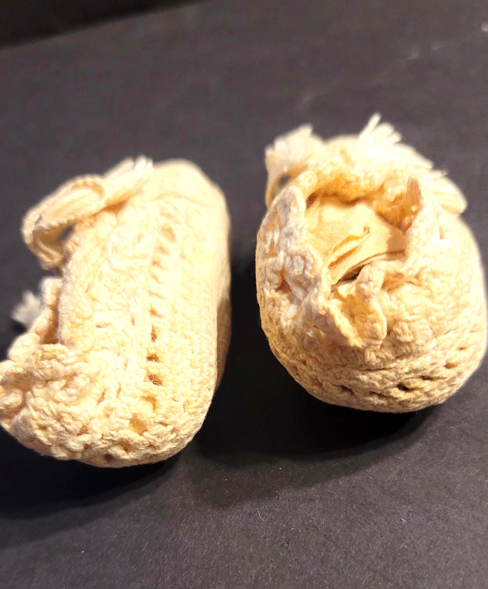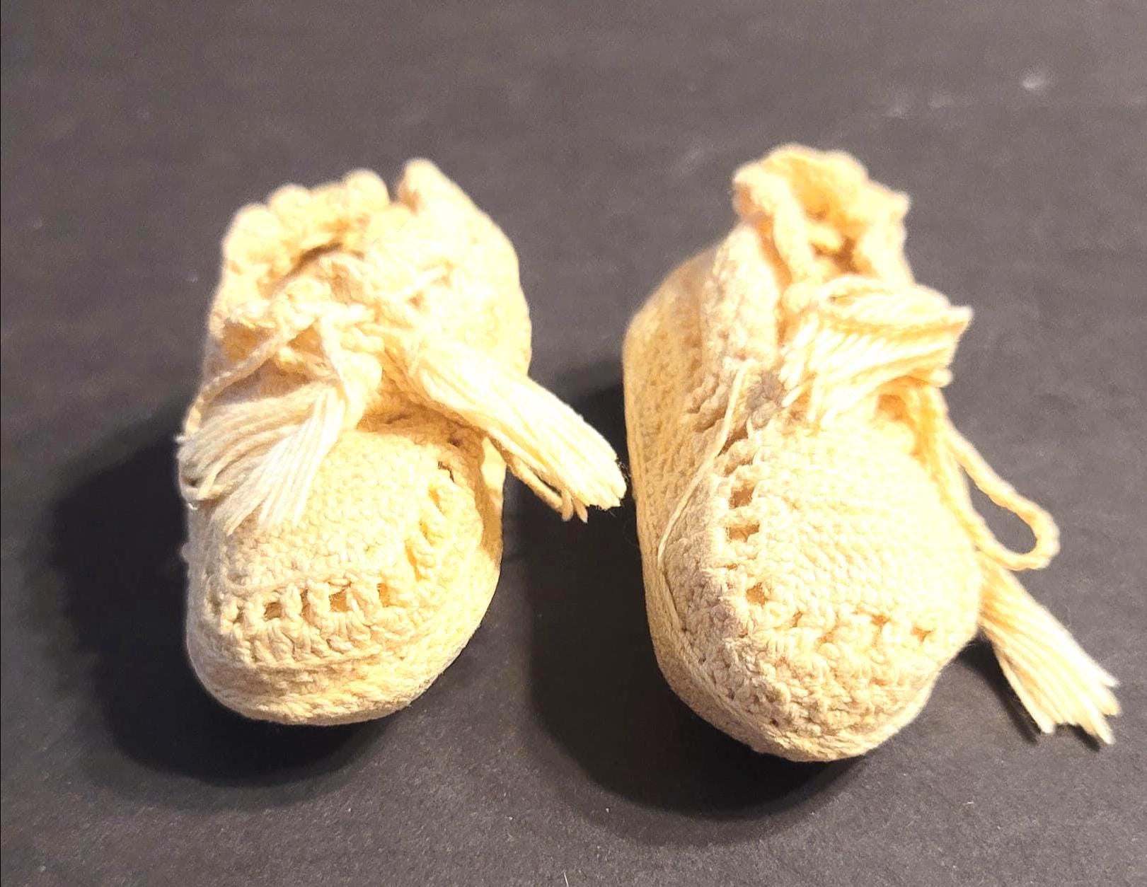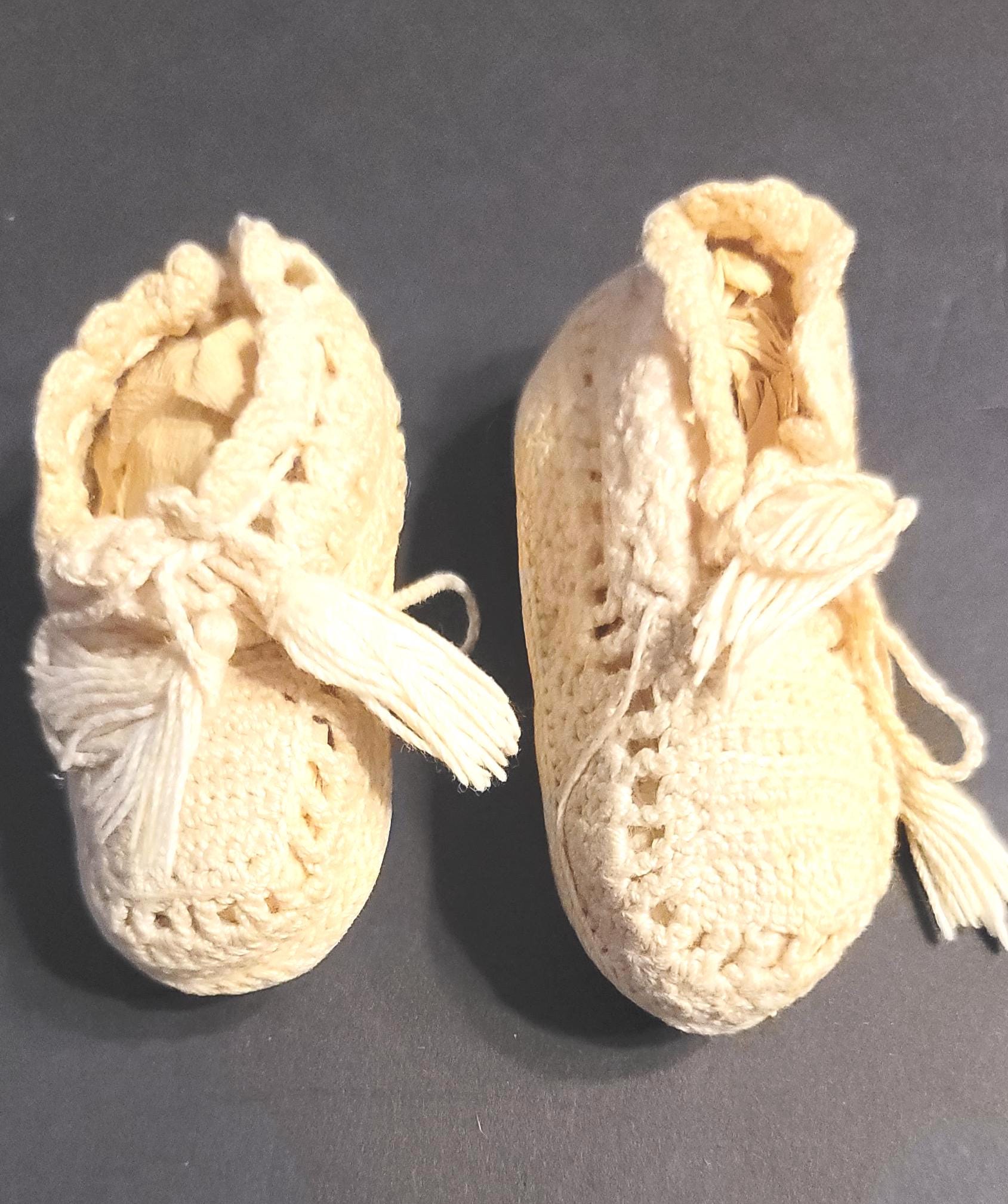 Here are a cute little pair of baby booties, hard to tell the age but I believe they are pretty old, definitely pre-1950. They are crochet with an off-white thread with tassles on the ties. They have some yellowing, a good soak in some oxy detergent should fix that. They are 3 3/4" long and 2" wide.