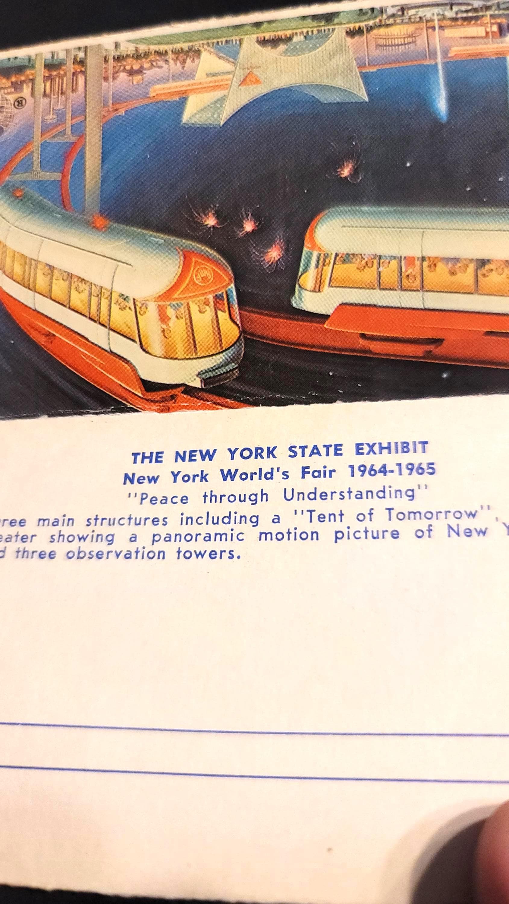 This is a little 1964 photo book souvenir from the Worlds Fair in New York. It is 3.5 x 2.75" and says there are 20 natural color reproductions- 10 postcards. They can be torn out. There is the "Tent of Tomorrow", The AMF Monorail, Shea Stadium, General Motors Futurama Bldg, The Hall of Education and more. It is in very good condition.
