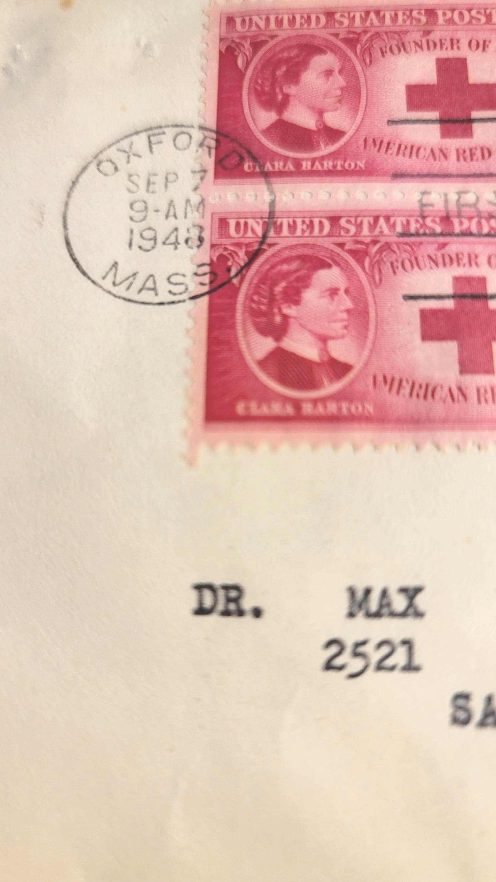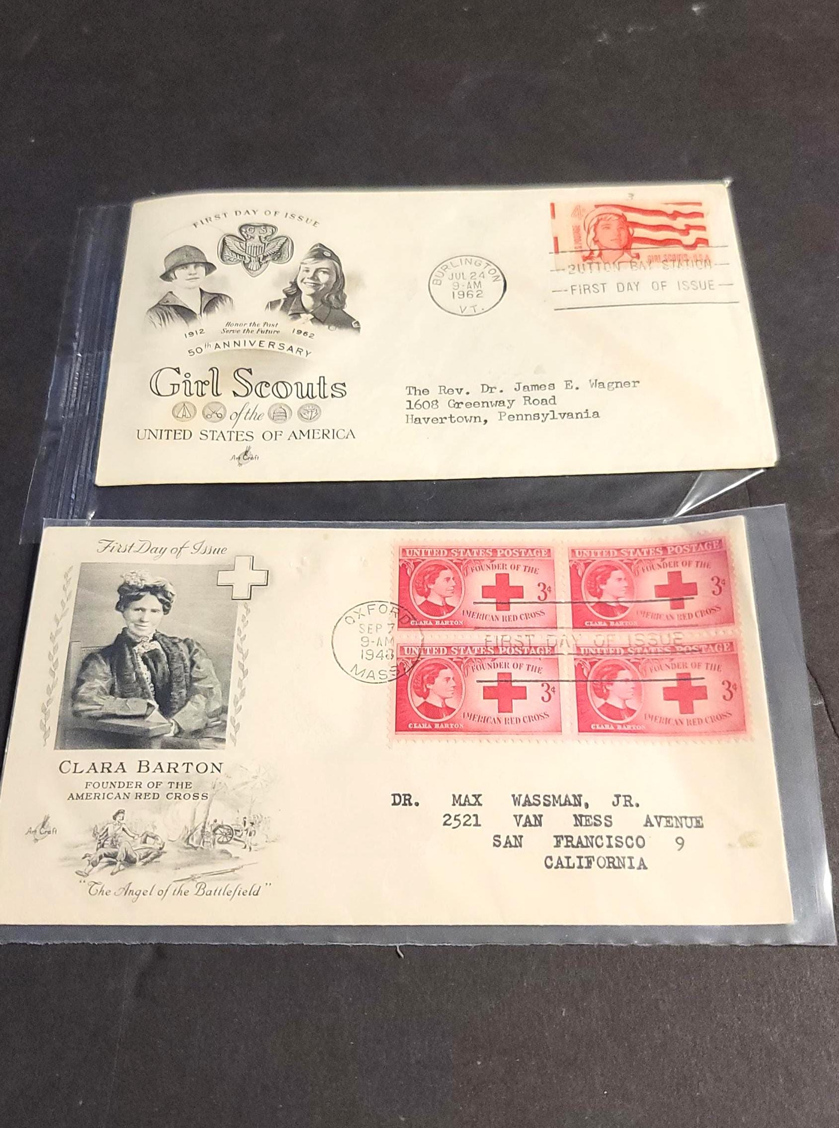 Here are 2 FDI's, (First Day of Issue) envelopes put out by the post office. The first one commemorates the Girl Scout's 50th Anniversary and is postmarked July 24, 1962 in Burlington Vermont. Although I believe the actual anniversary date is March 12. It was not issued though untel 7/24/62. It is in very good condition, slightly yellowed, kept in a plastic sleeve. The second is slightly more yellowed, also in a plastic sleeve and is commemorating Clara Barton the "Angel of the Battlefield" and founder of the Red Cross. It is post marked Sept. 2, 1940 from Oxford Mass. These are collected for their historical significance and the uniqueness.