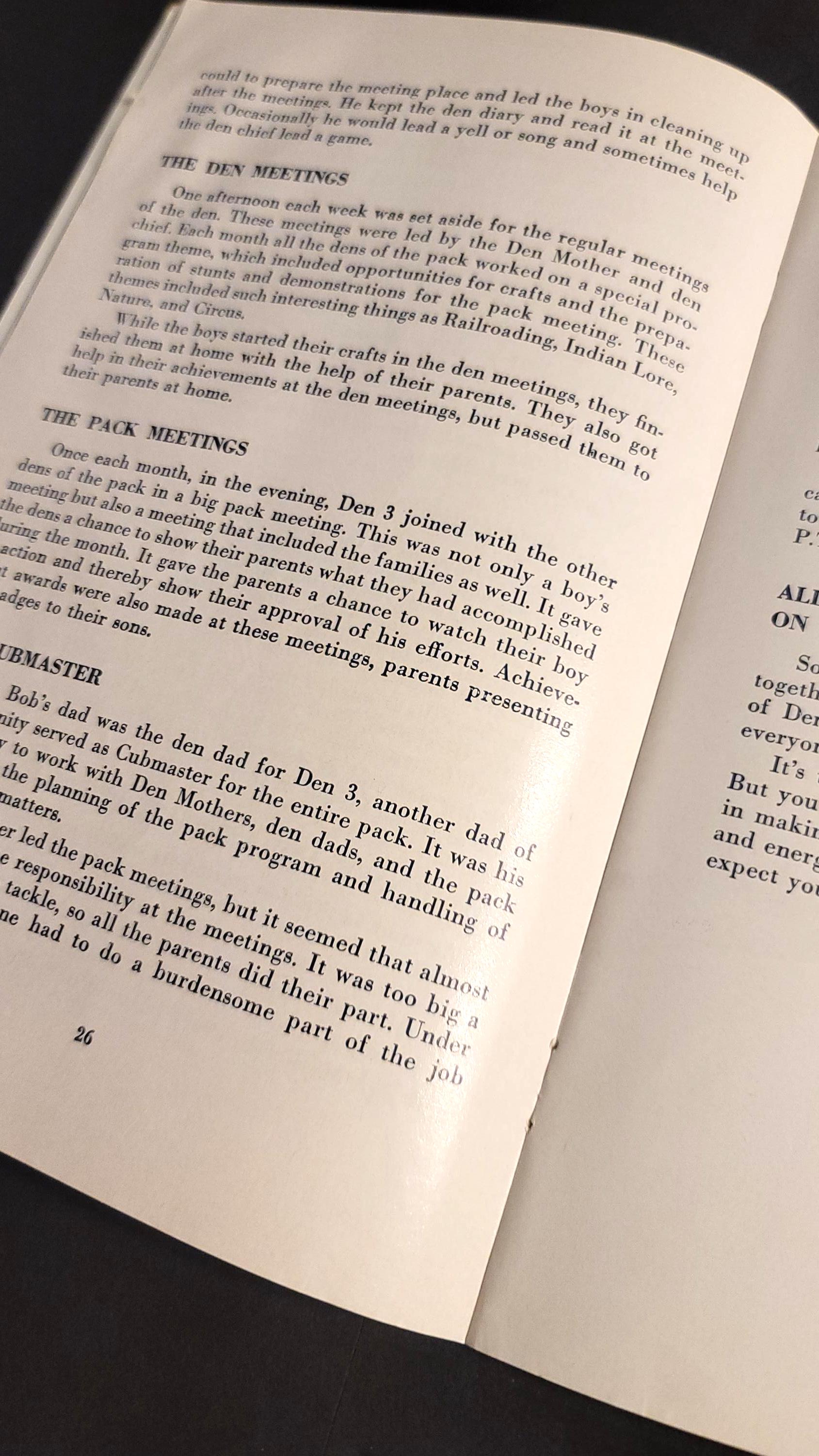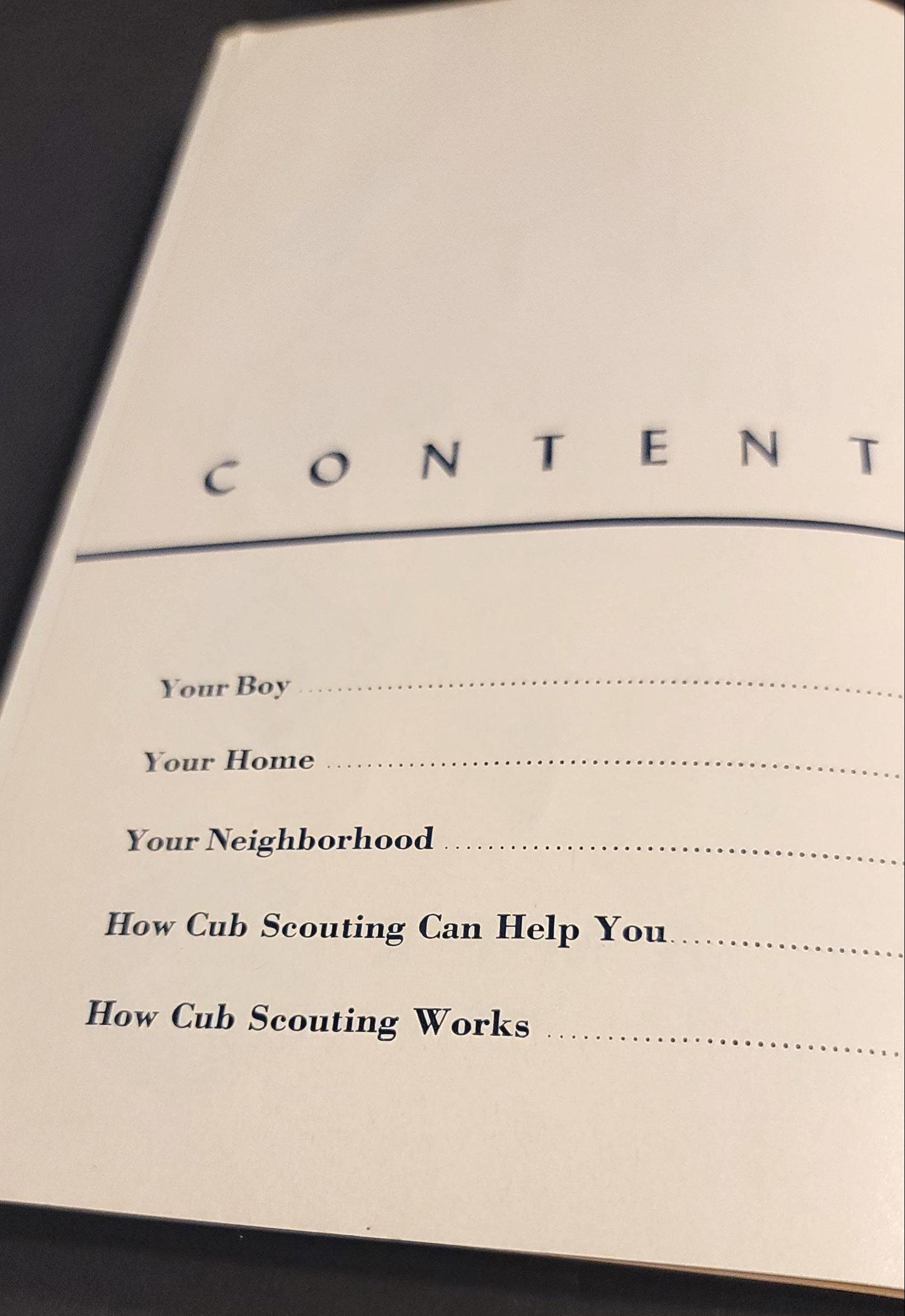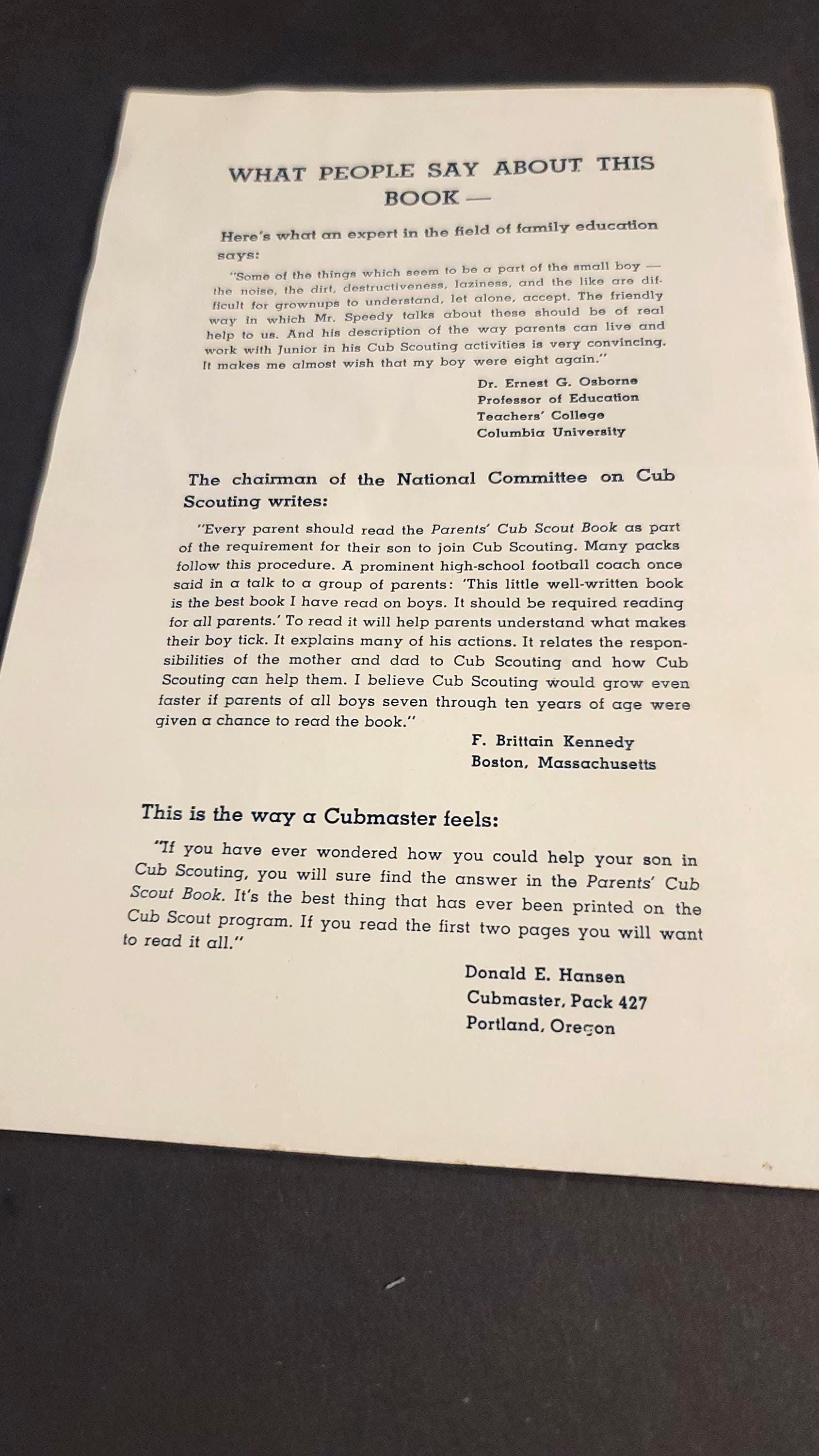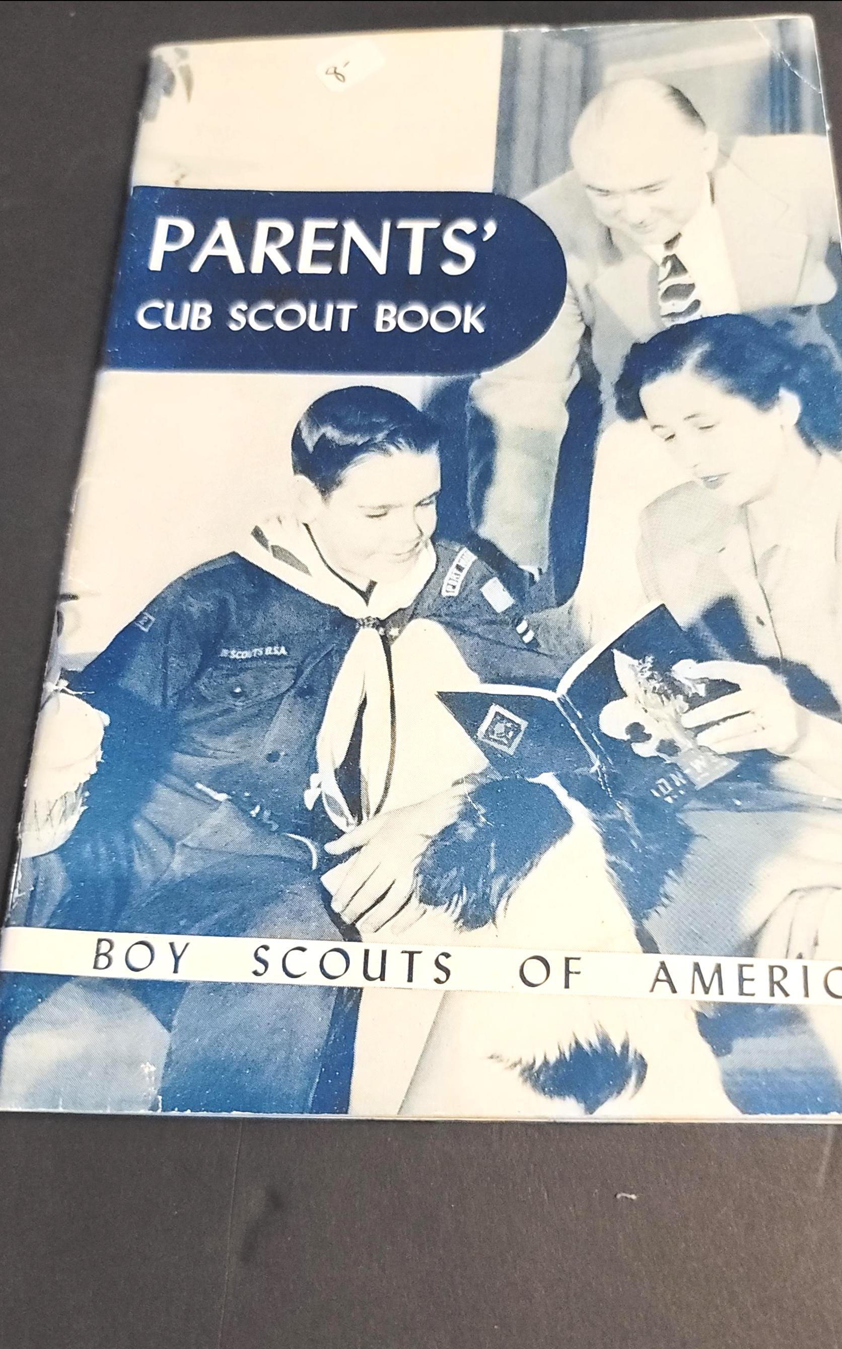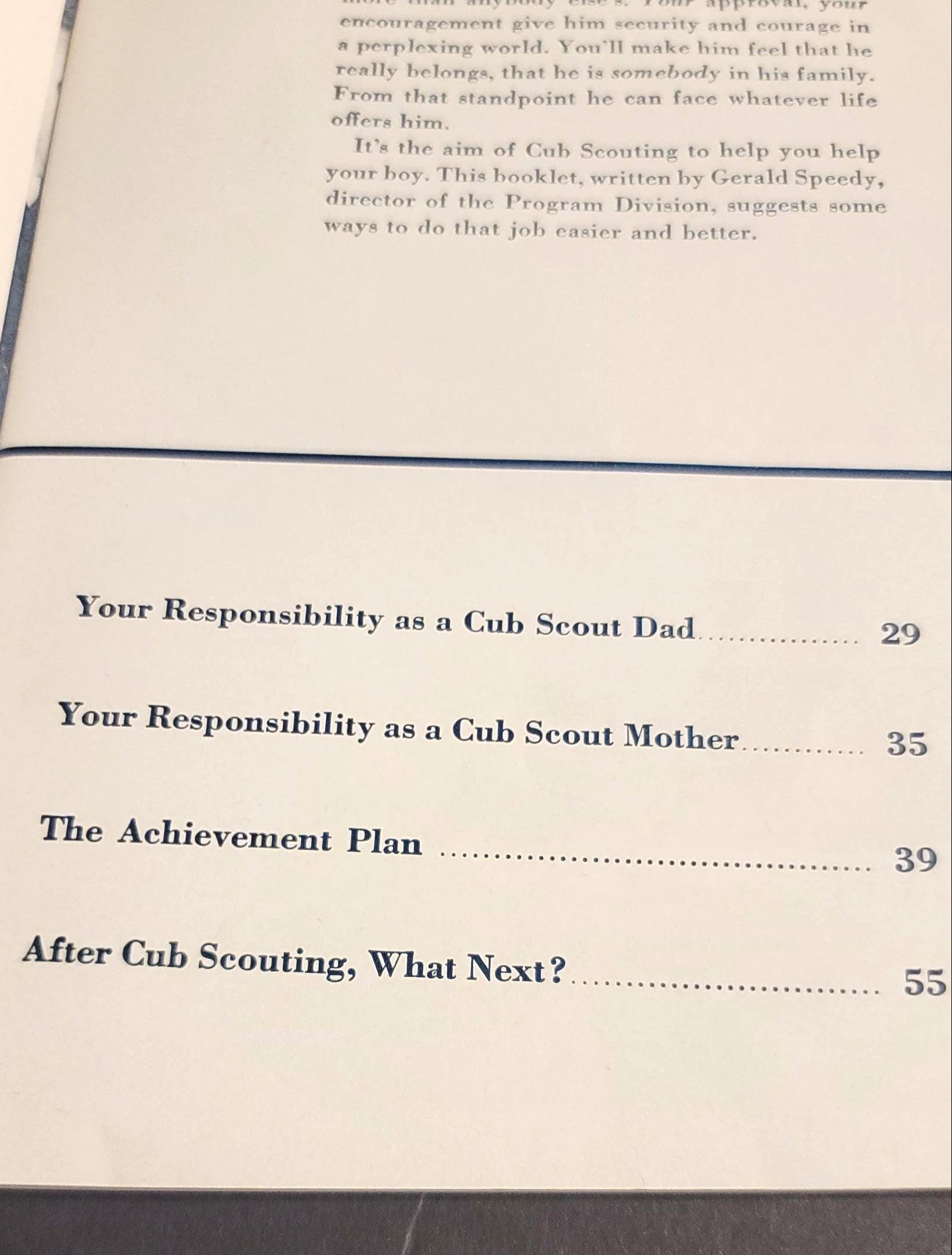 Here's a cool little 60 page booklet for parents in the 60s to help them with their Cub Scout kids. It is a 1964 printing of a 1951 copyright. It has info about young boys and what to expect of them, including thier noise, destructiveness, manners and laziness. It talks about the home atmosphere, needs of children and how BSA can help. It also goes into to the mothers role, the acheivment plan, safety and much, much more.It is 8 x 5.5".
