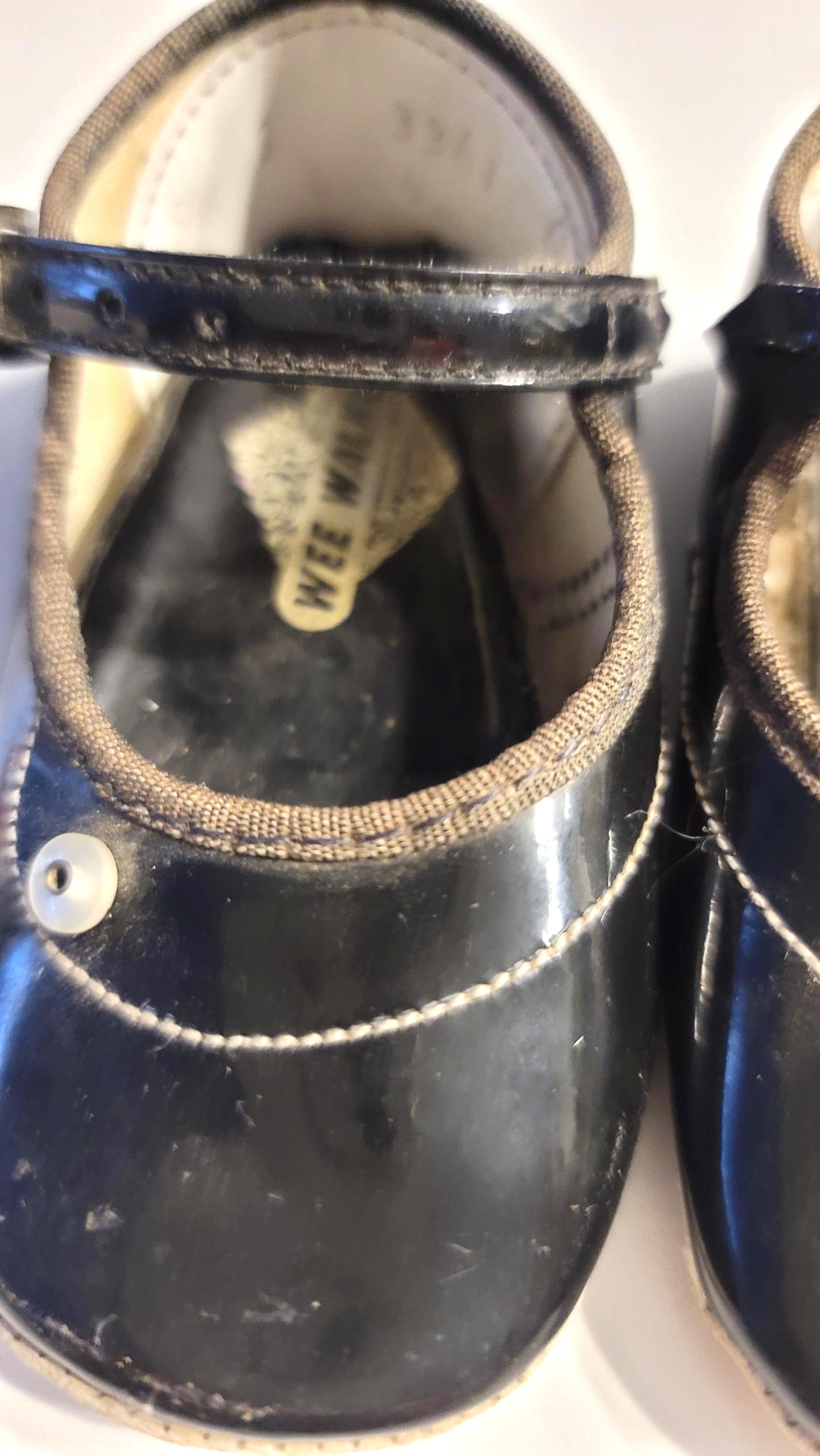 I believe these are from the 60s or 70s and are black patent leather with a little button as decor. They are a size 2. They are used with some wear on the sole and the inside of the sole has curled a little bit on the inside. They have a metal buckle. they are 4.5" long and 2" wide at the widest part, the toe box. Very cute!!