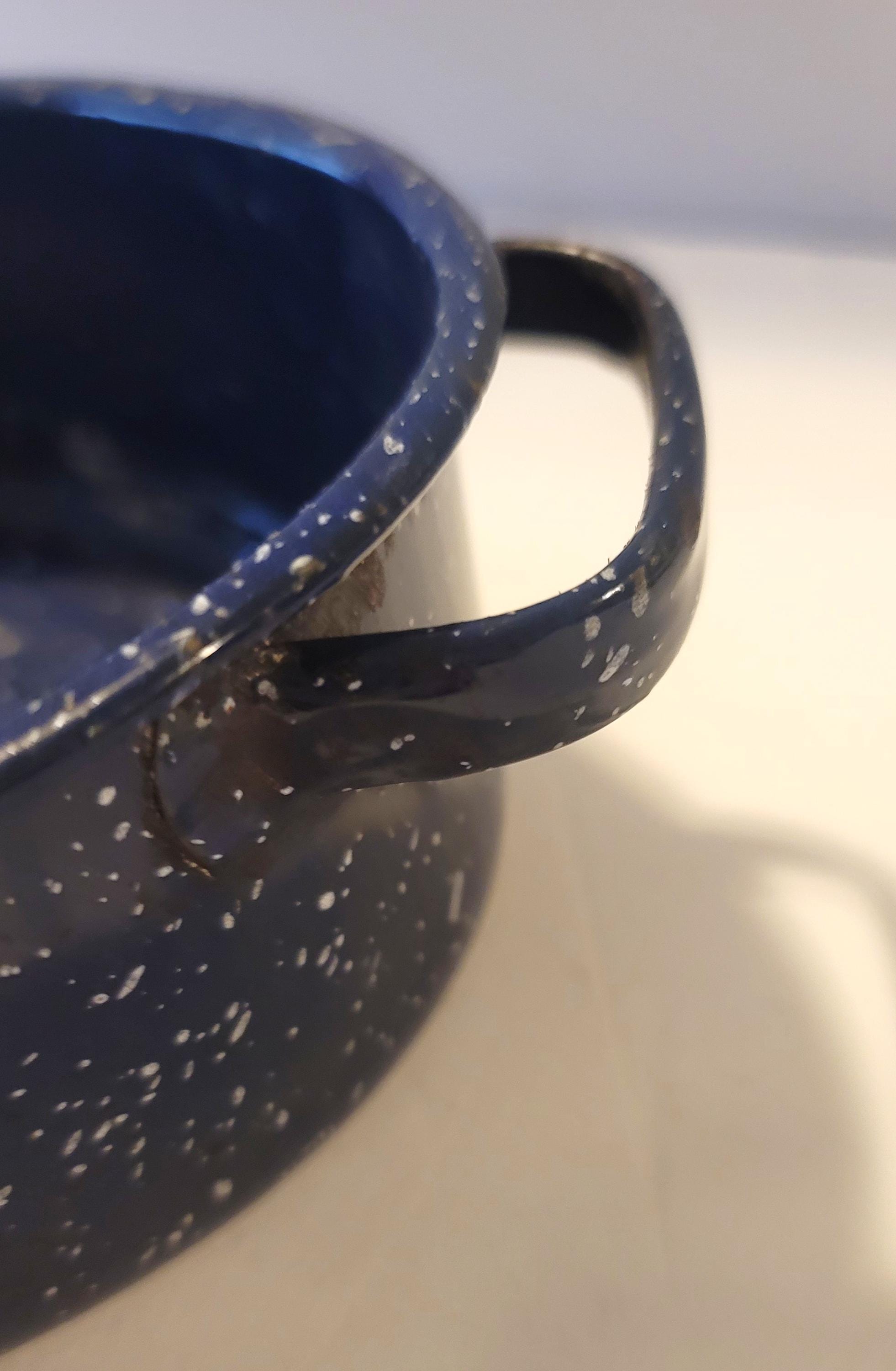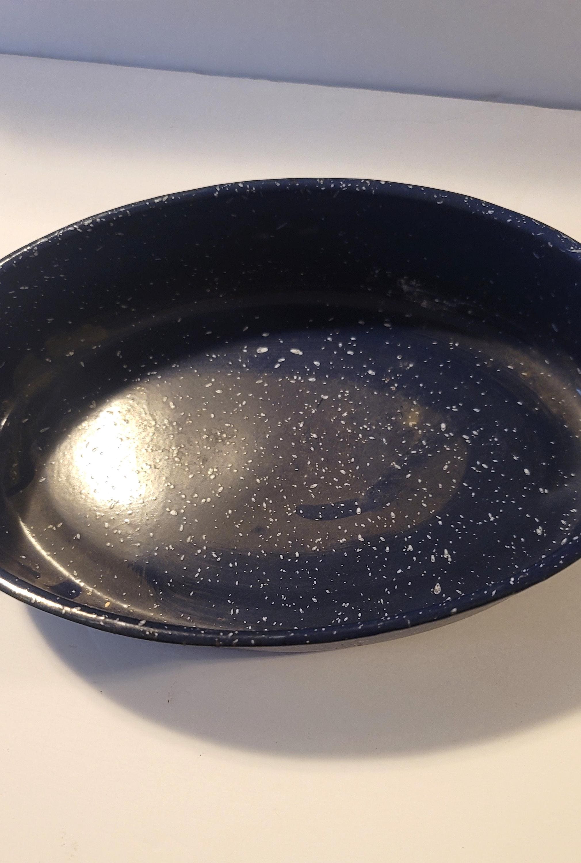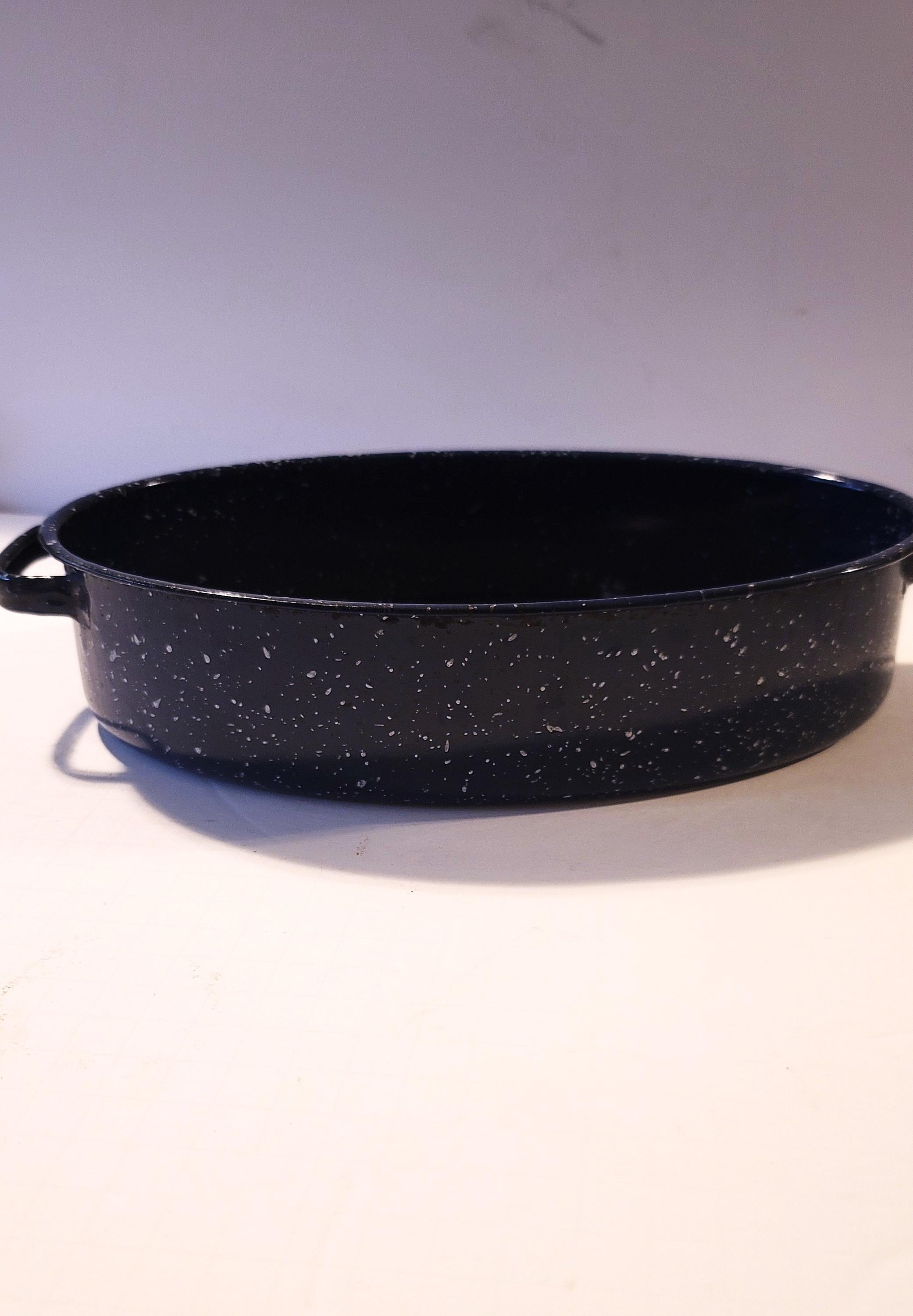 This is a blue graniteware, enamelware roaster, no lid that is 11" x 7.5". It is in excellent condition, no rust. Looks hardly used. These are very durable and are great for cooking meat- the graniteware is non-stick. Can be used in the oven or even grill.