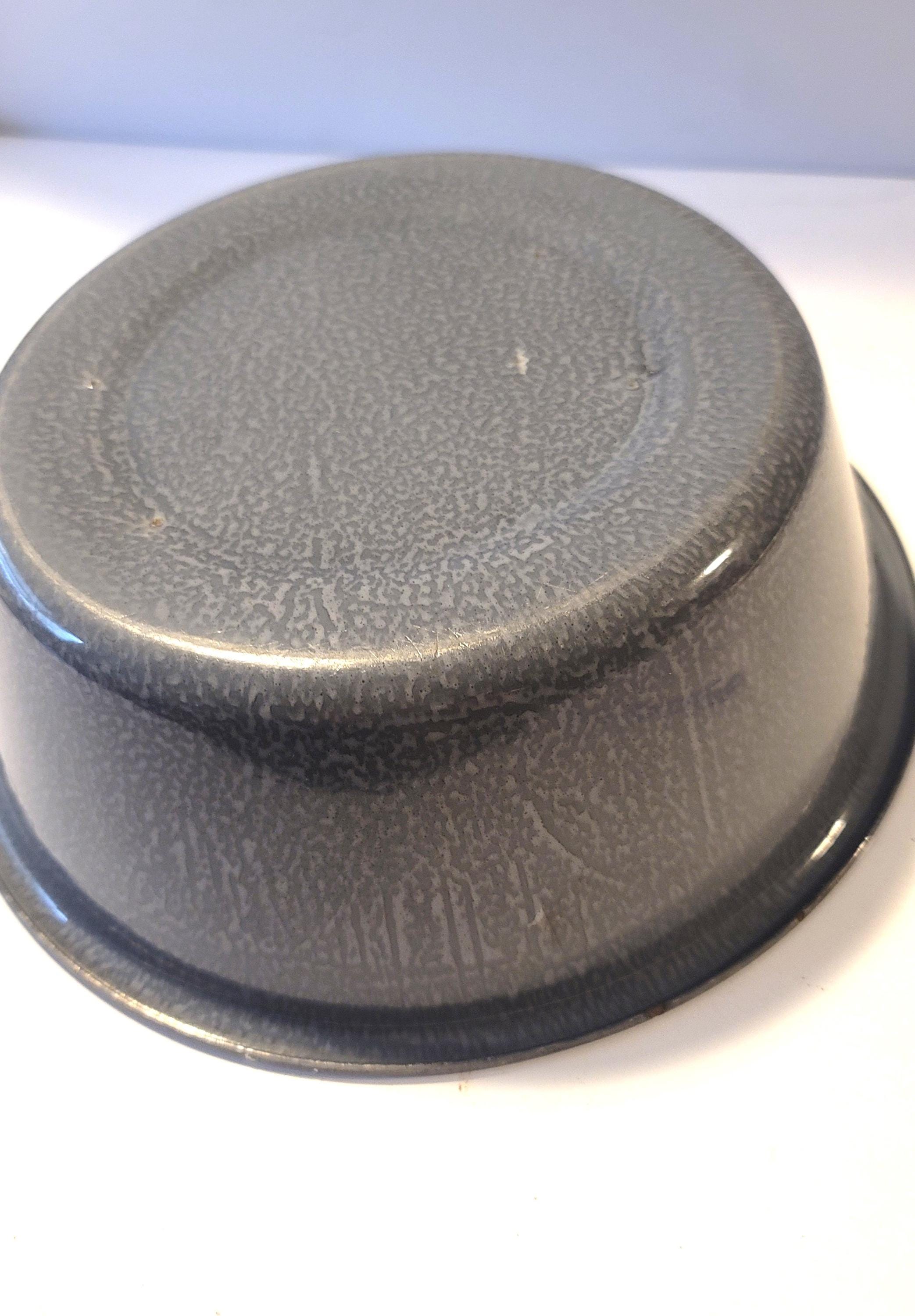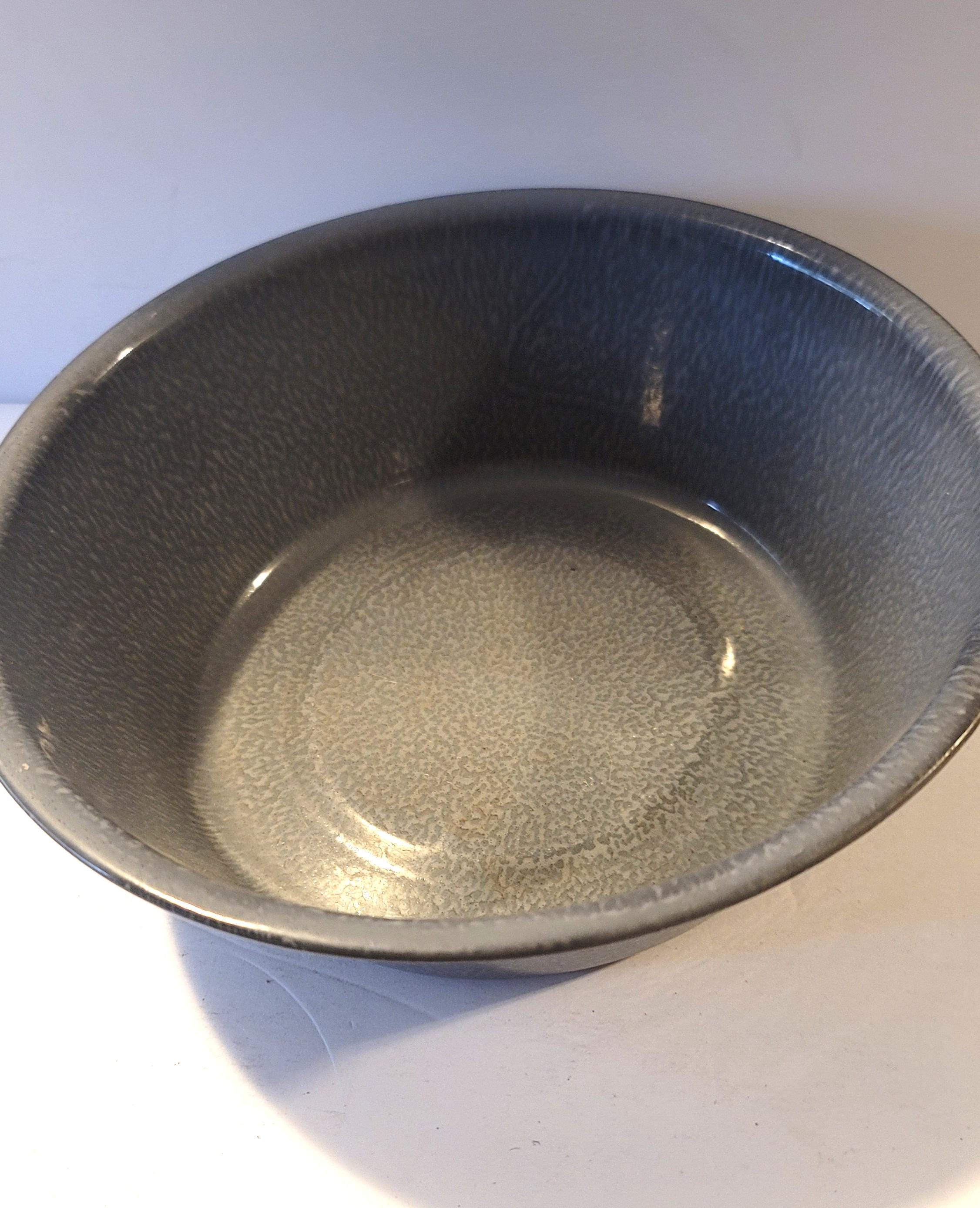 This is a looks like new 1930s basin in gray drippy enamelware/graniteware. It is cast iron under enamel and has no rust or wear. It is 9" in diameter and 3.25" tall. Nice to use as a mixing bowl, a planter, a catch all, a camping bowl or whatever you desire!