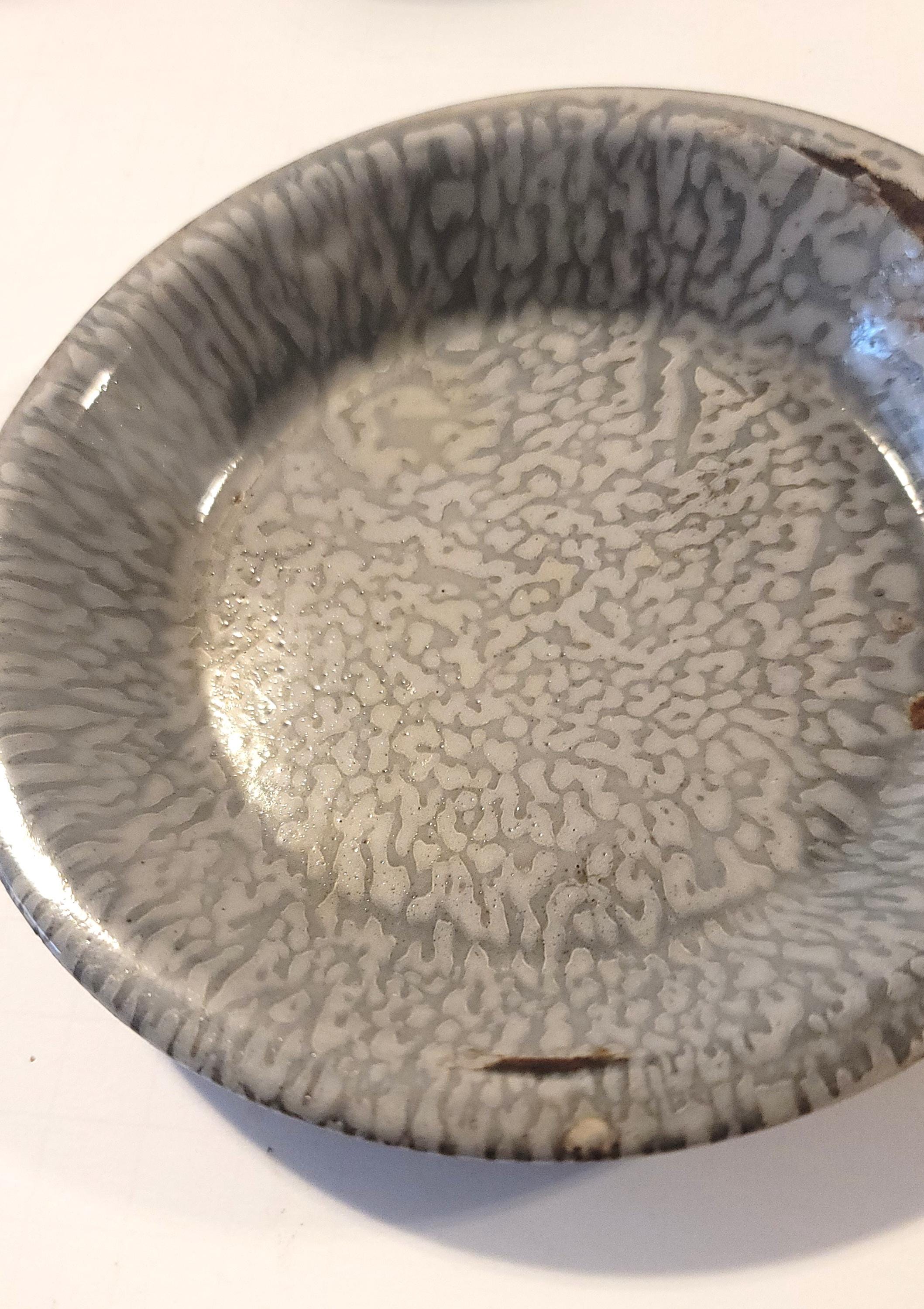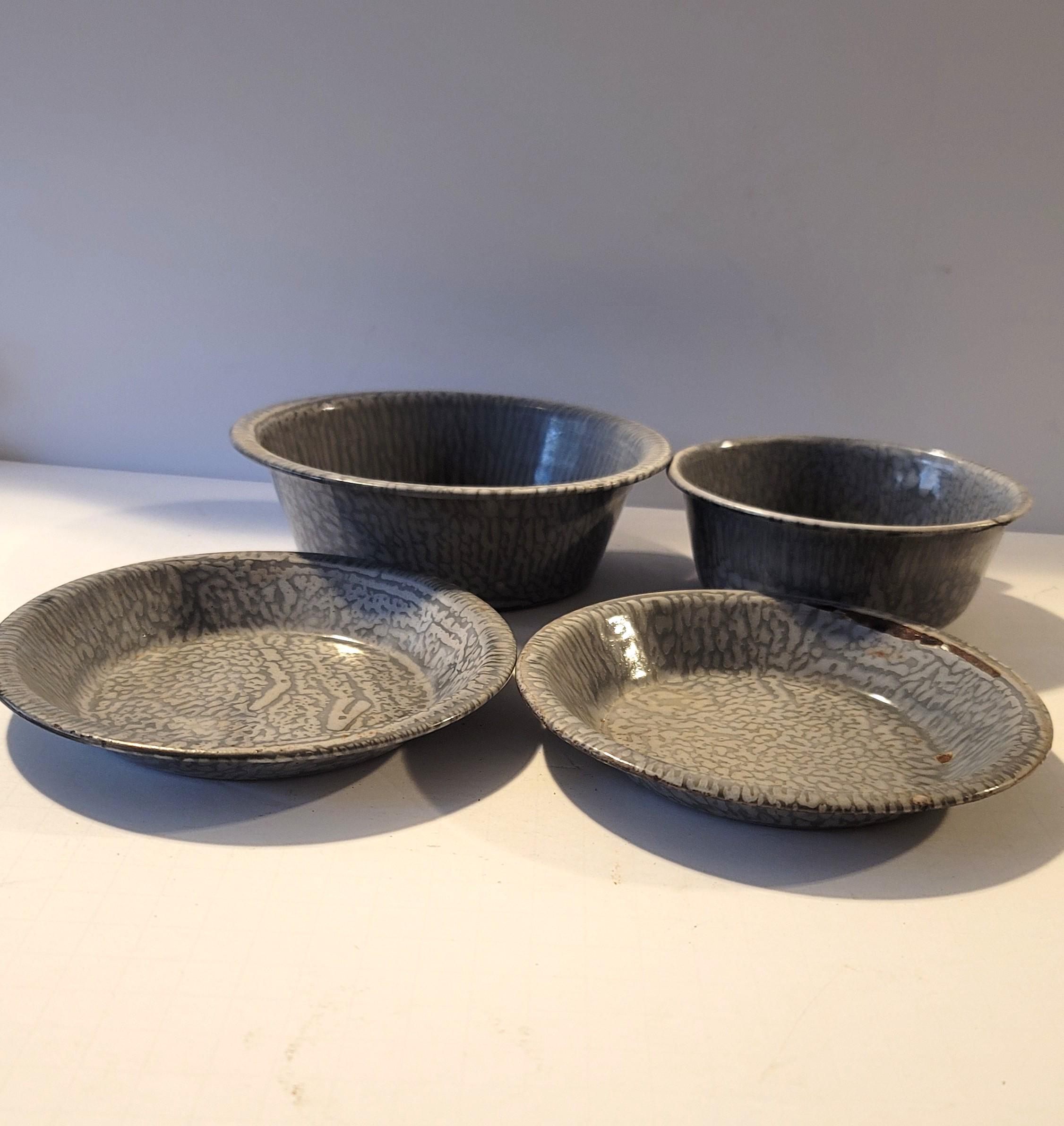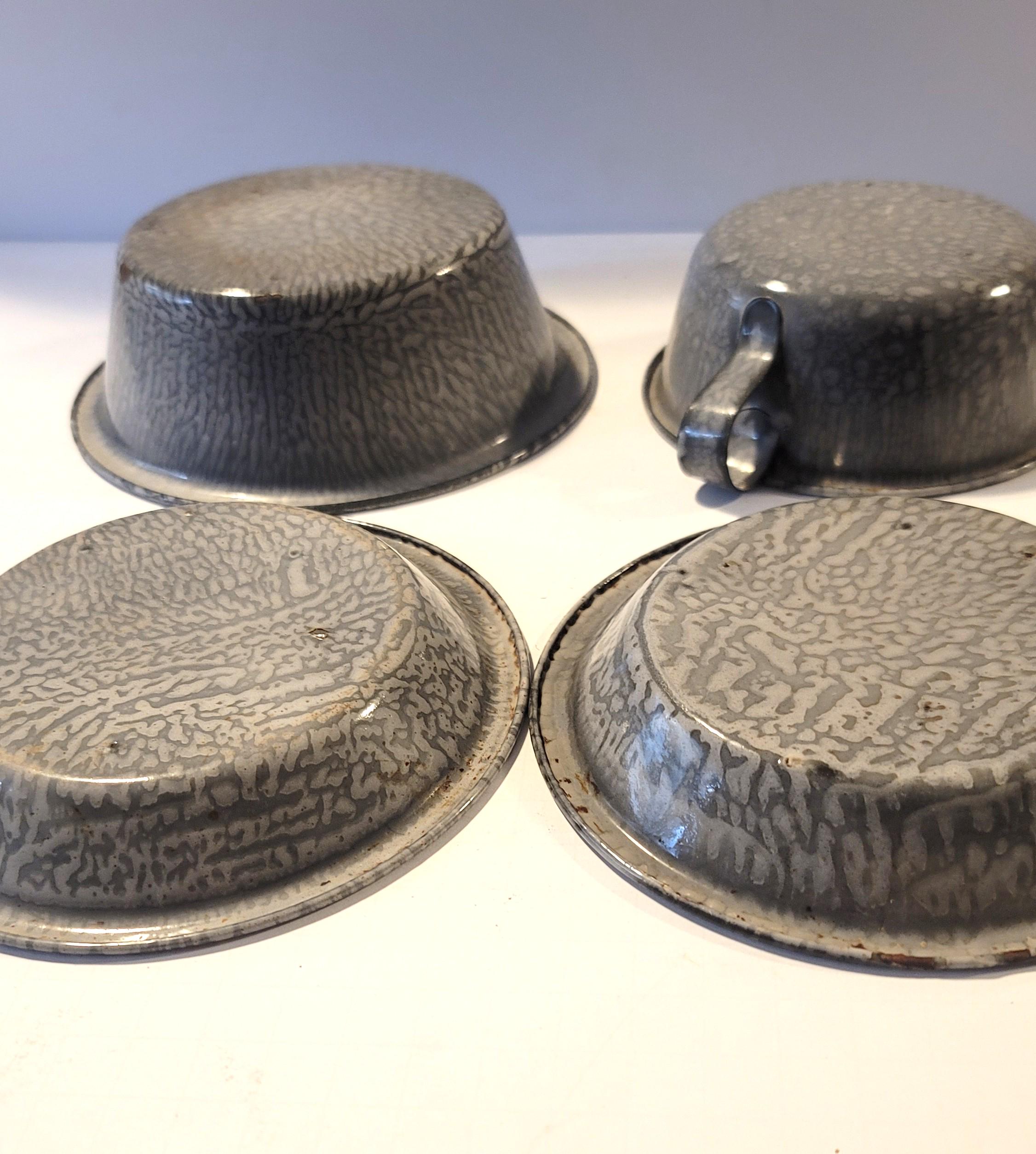 Here is a set of graniteware from around the 20s or so with 2 plates, a bowl and a cup. There is some rusting on the cup, look at picture closely. I wouldn't eat or drink out of them with rust. I cannot verify who made them and they may or may not have lead under the enamel. The plates are 6" in diameter and the bowl is 6.5" in diameter and 2.25" tall. The cup has a handle and is 5" in diameter and 2" tall.