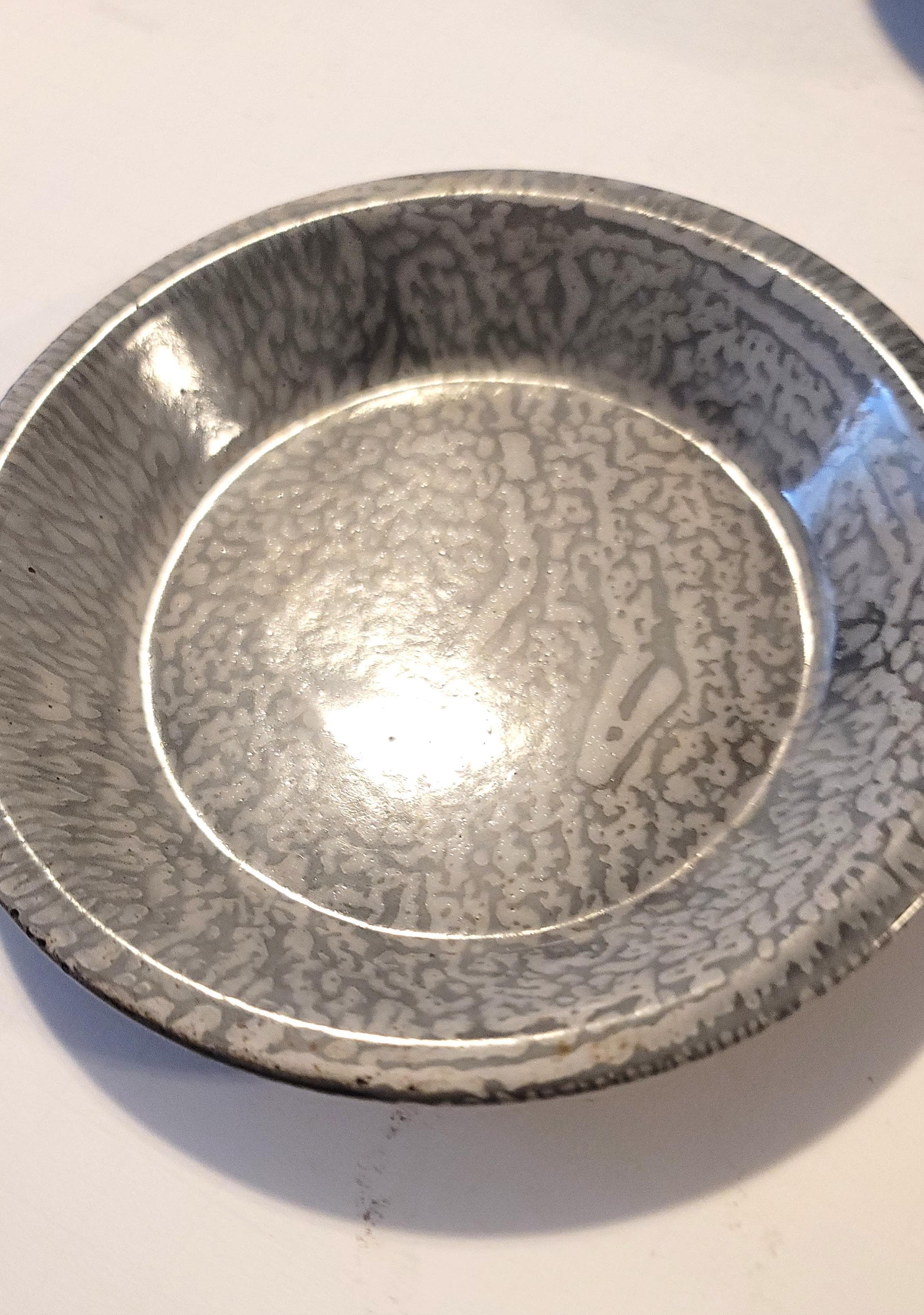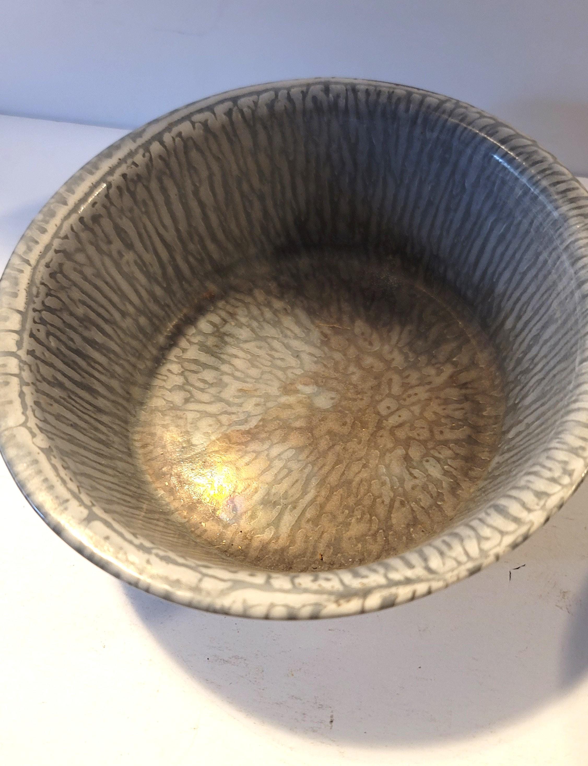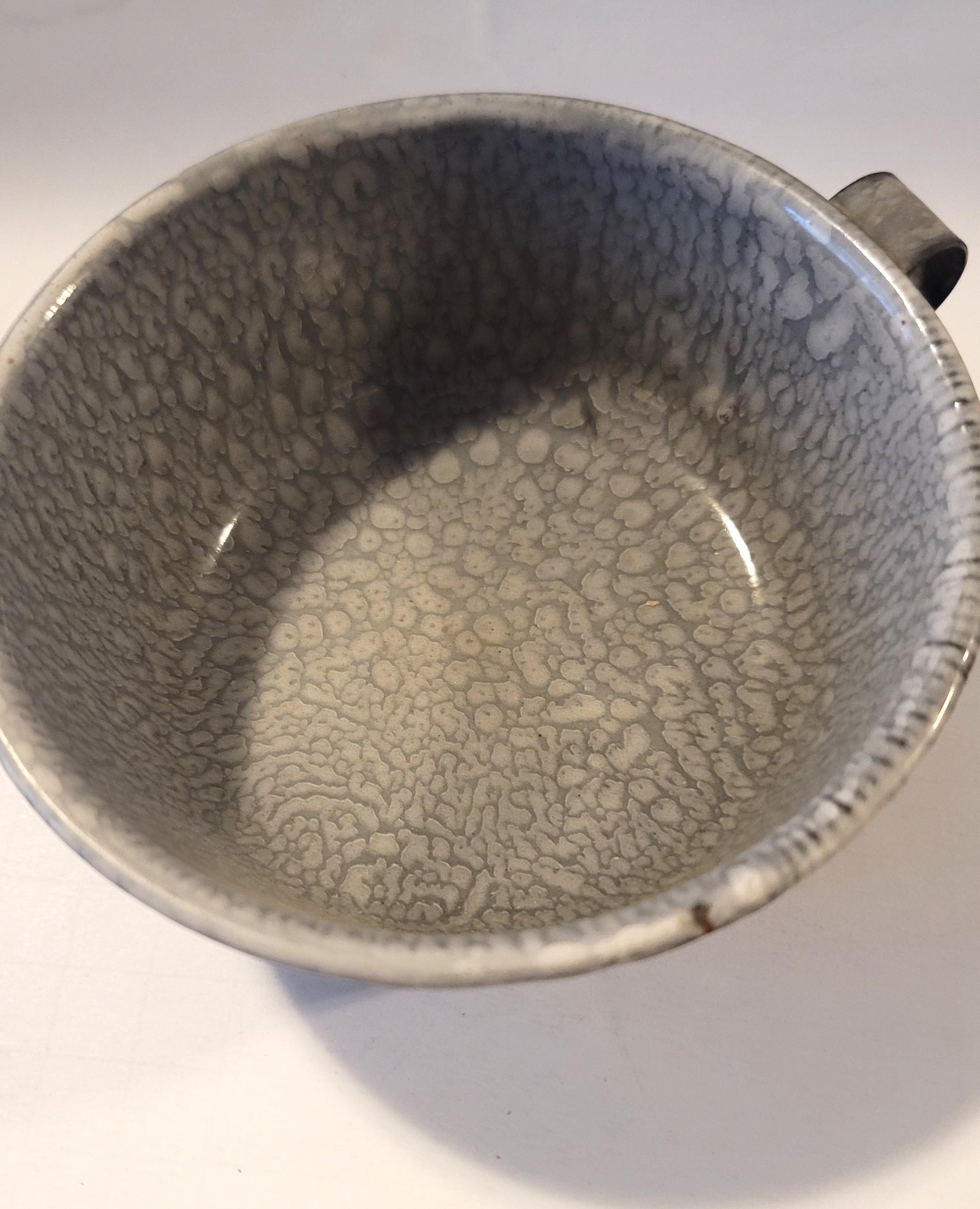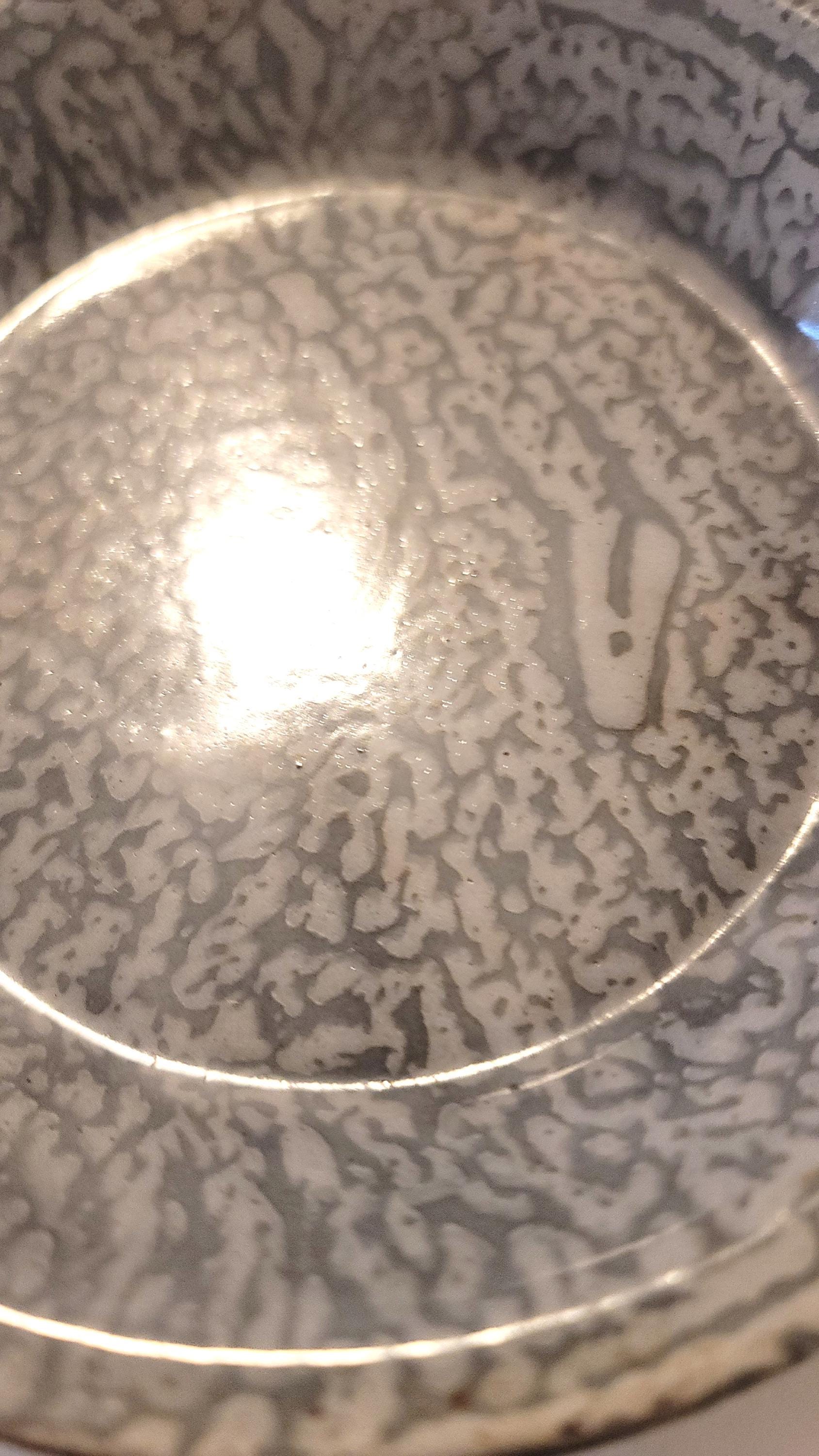 Here is a set of graniteware from around the 20s or so with 2 plates, a bowl and a cup. There is some rusting on the cup, look at picture closely. I wouldn't eat or drink out of them with rust. I cannot verify who made them and they may or may not have lead under the enamel. The plates are 6" in diameter and the bowl is 6.5" in diameter and 2.25" tall. The cup has a handle and is 5" in diameter and 2" tall.