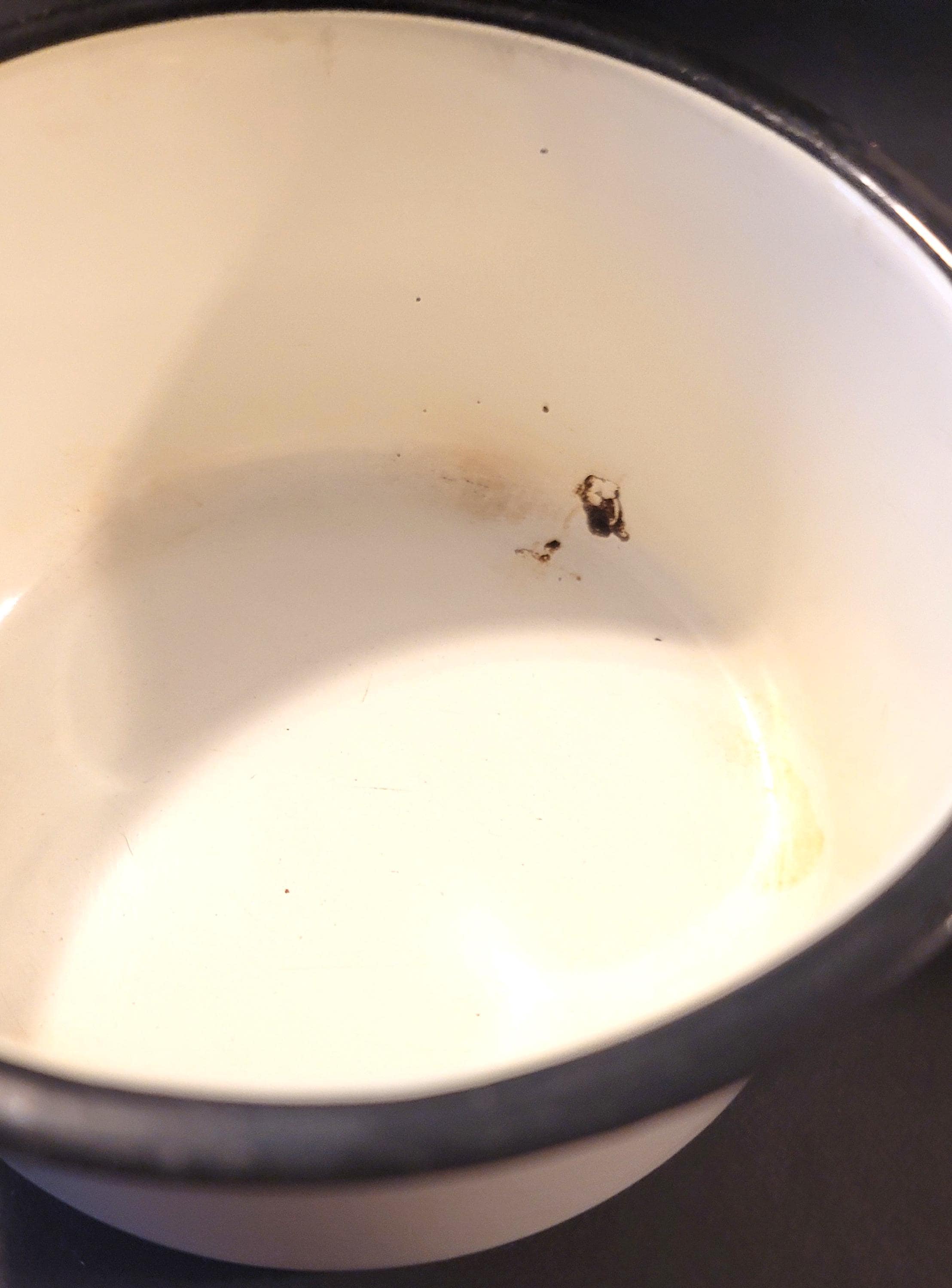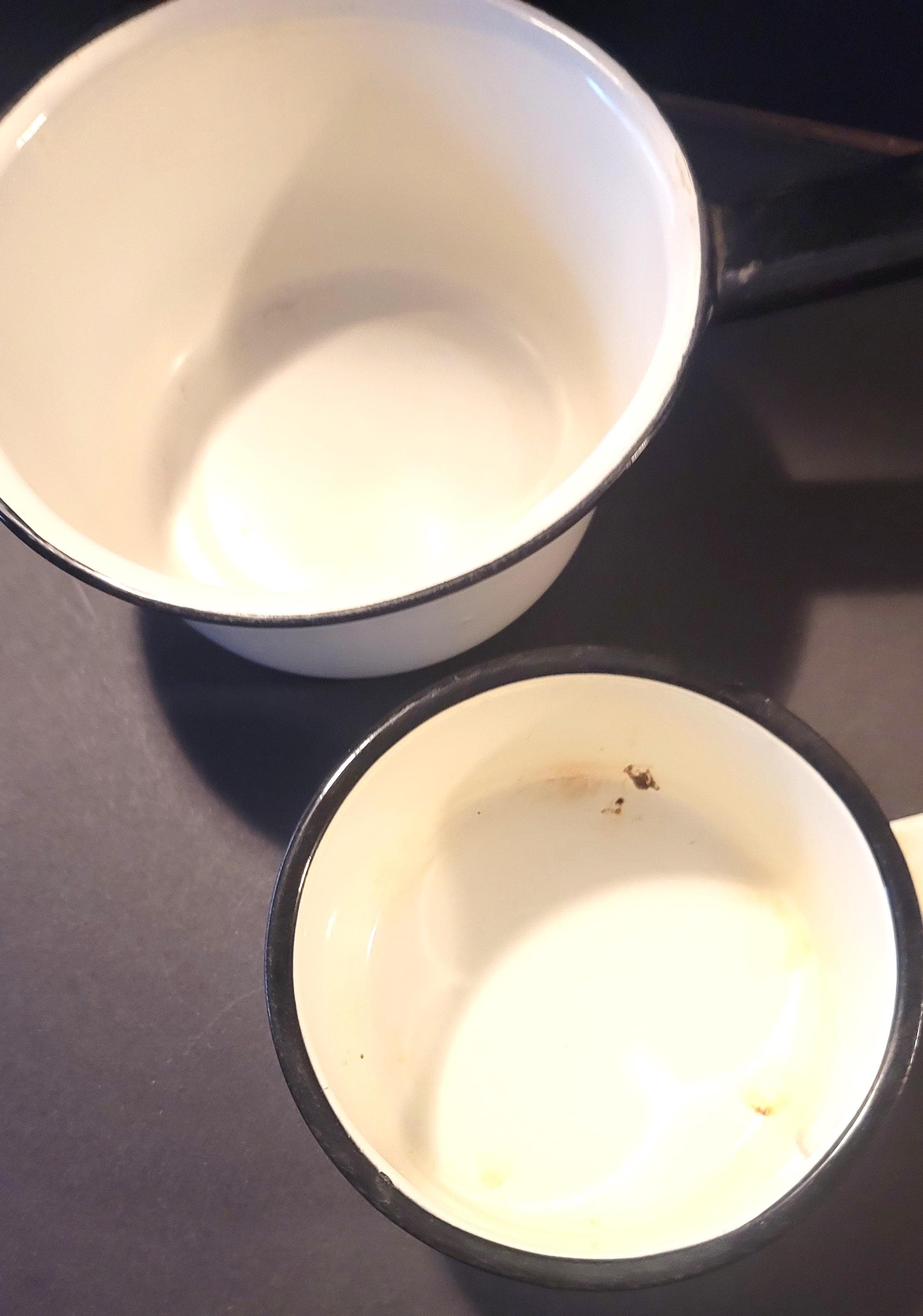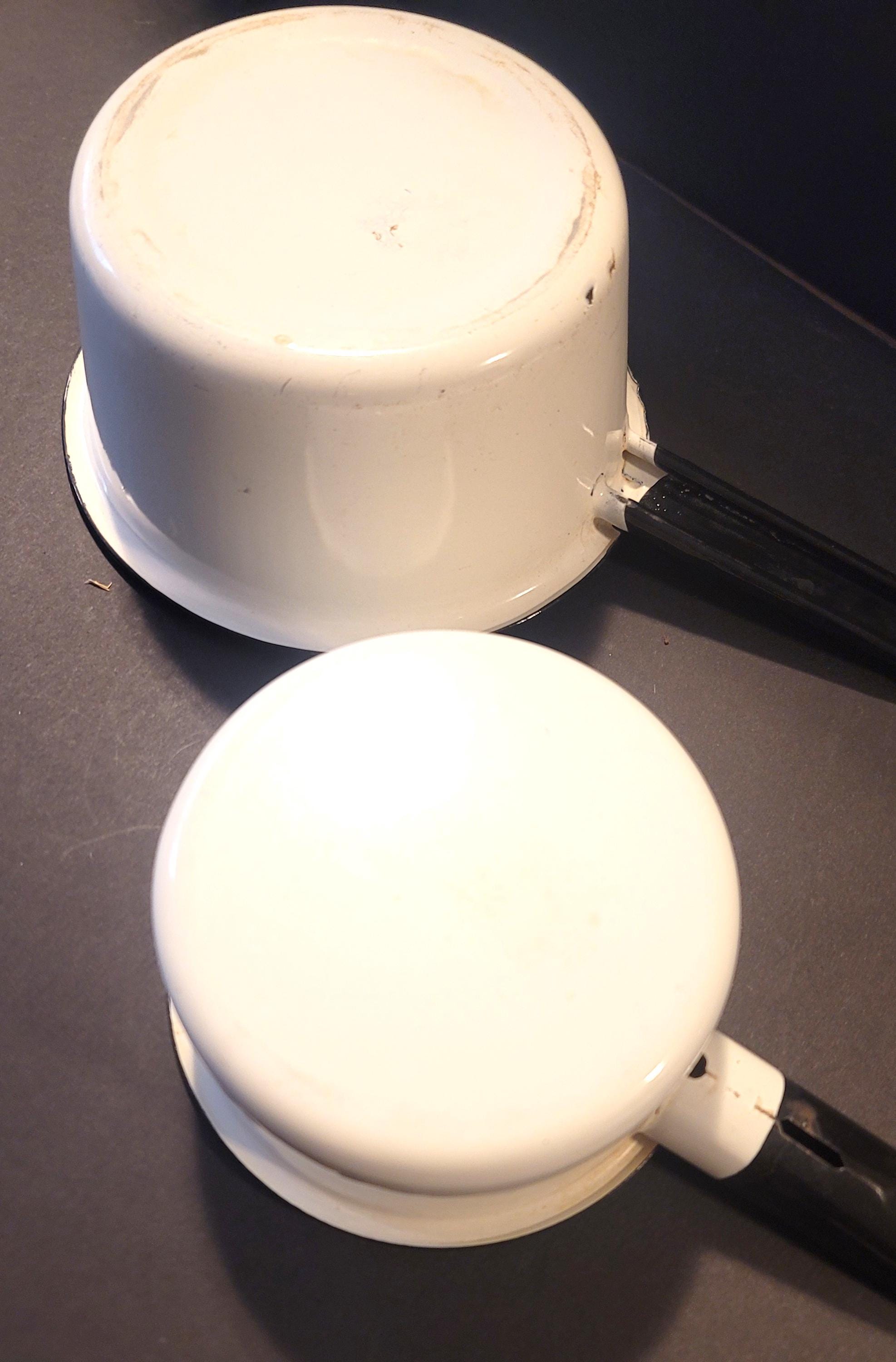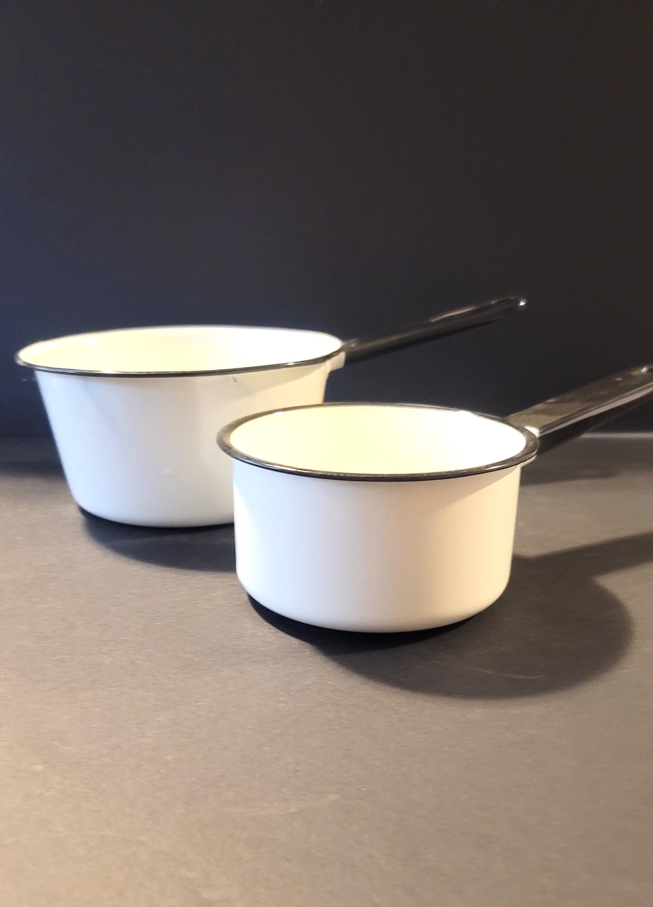Here are 2 enamelware pans from the 30s in white with black trim and handles. I believe they are about a 2 cup and 4 cup. One is 7" in diameter and 3.5" tall and the other is 5" in diameter and 2.25" tall. The small one has a little bit of rust inside so I would not cook with it. I cannot verify who made these and sometimes they had lead under the enamel. Or you can buy a tester kit and check. They are in very good condition besides that.