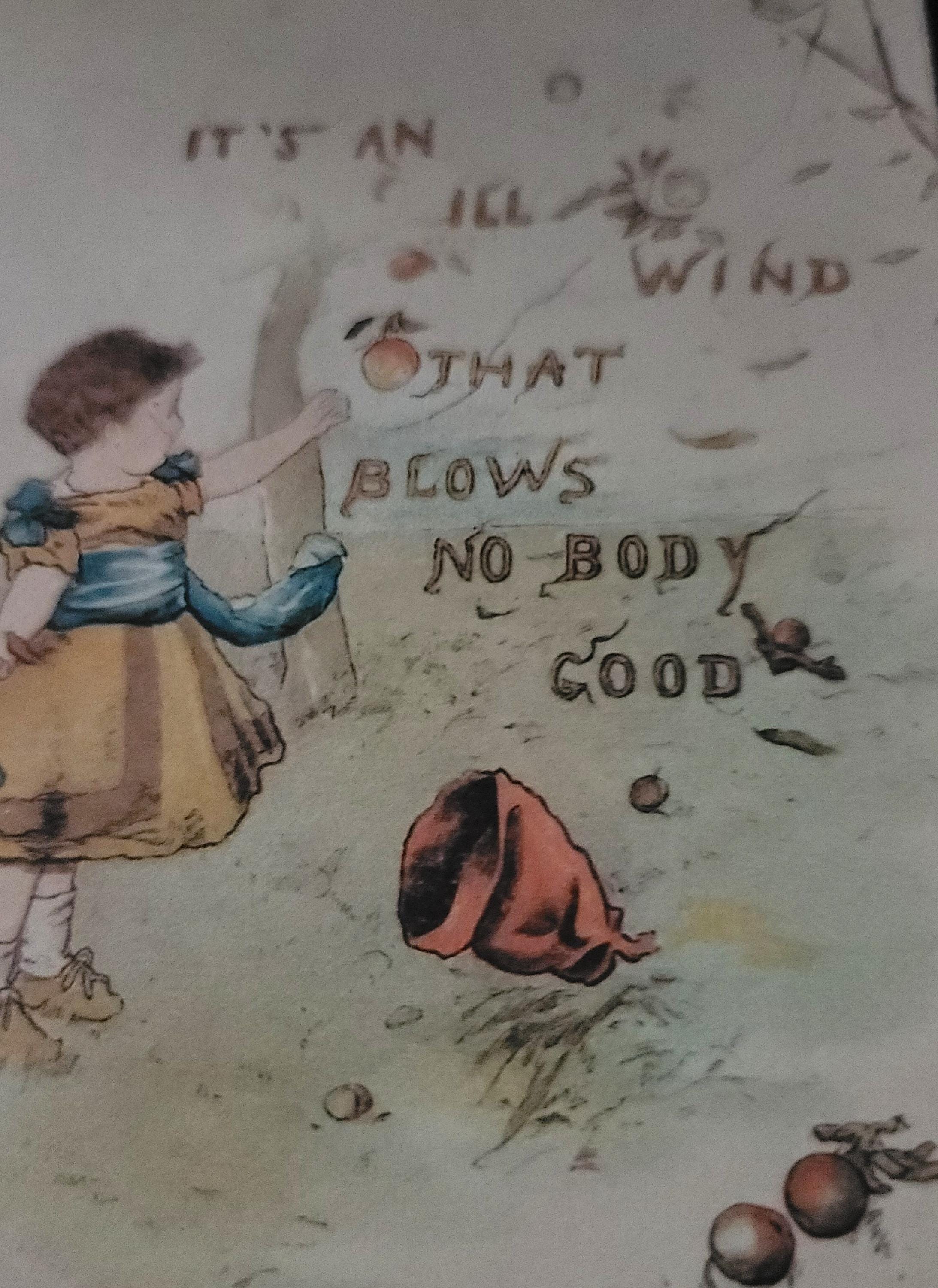 Here are 2 pictures made of pressed wood and prints. One says "You may lead a horse to water, but you can't make him drink" and the other, "Its an ill wind that blows no body good". They have children in the pictures, a background of dark ivory with muted colors. They are 7 x 5 1/2 x 1/8".