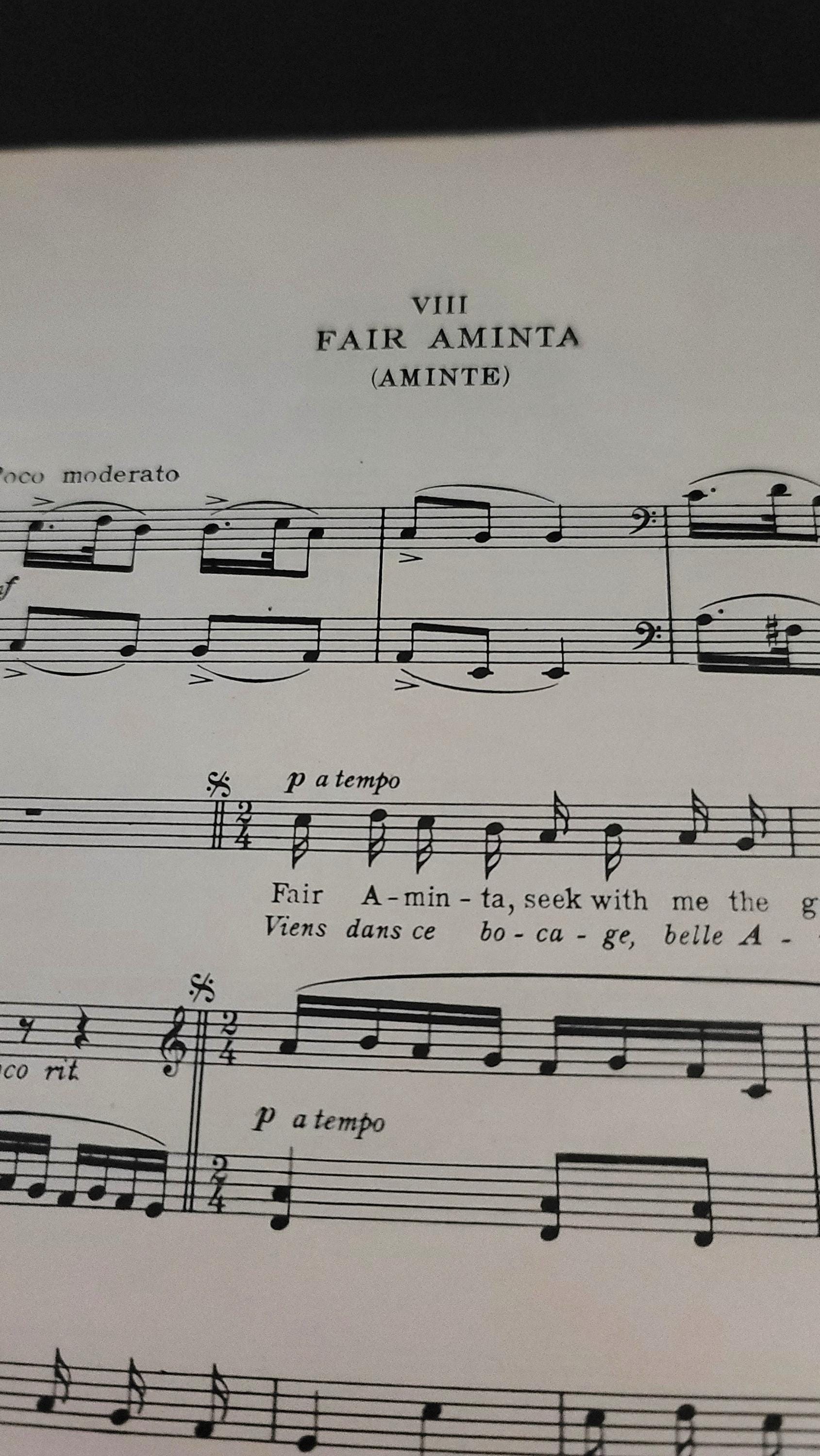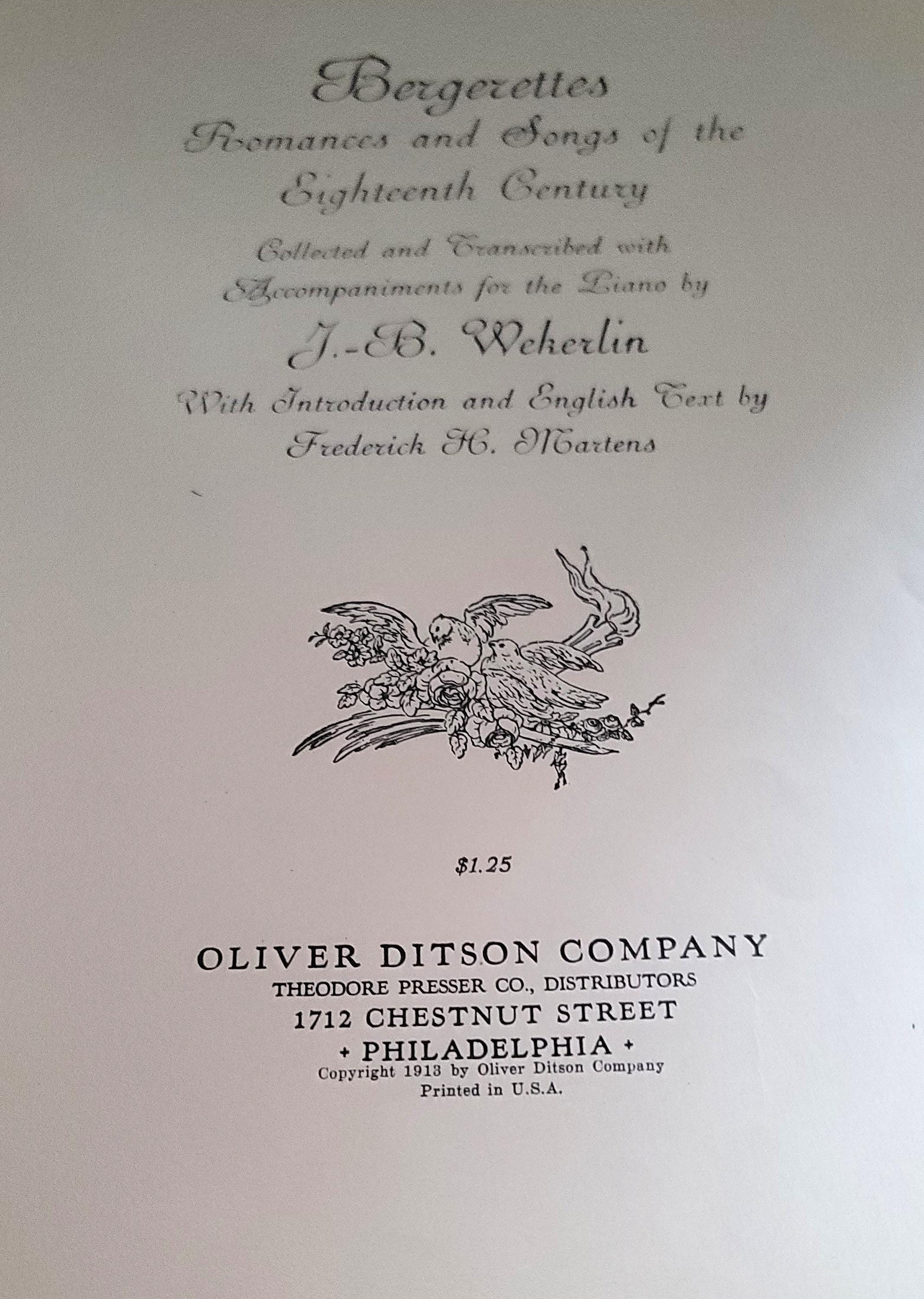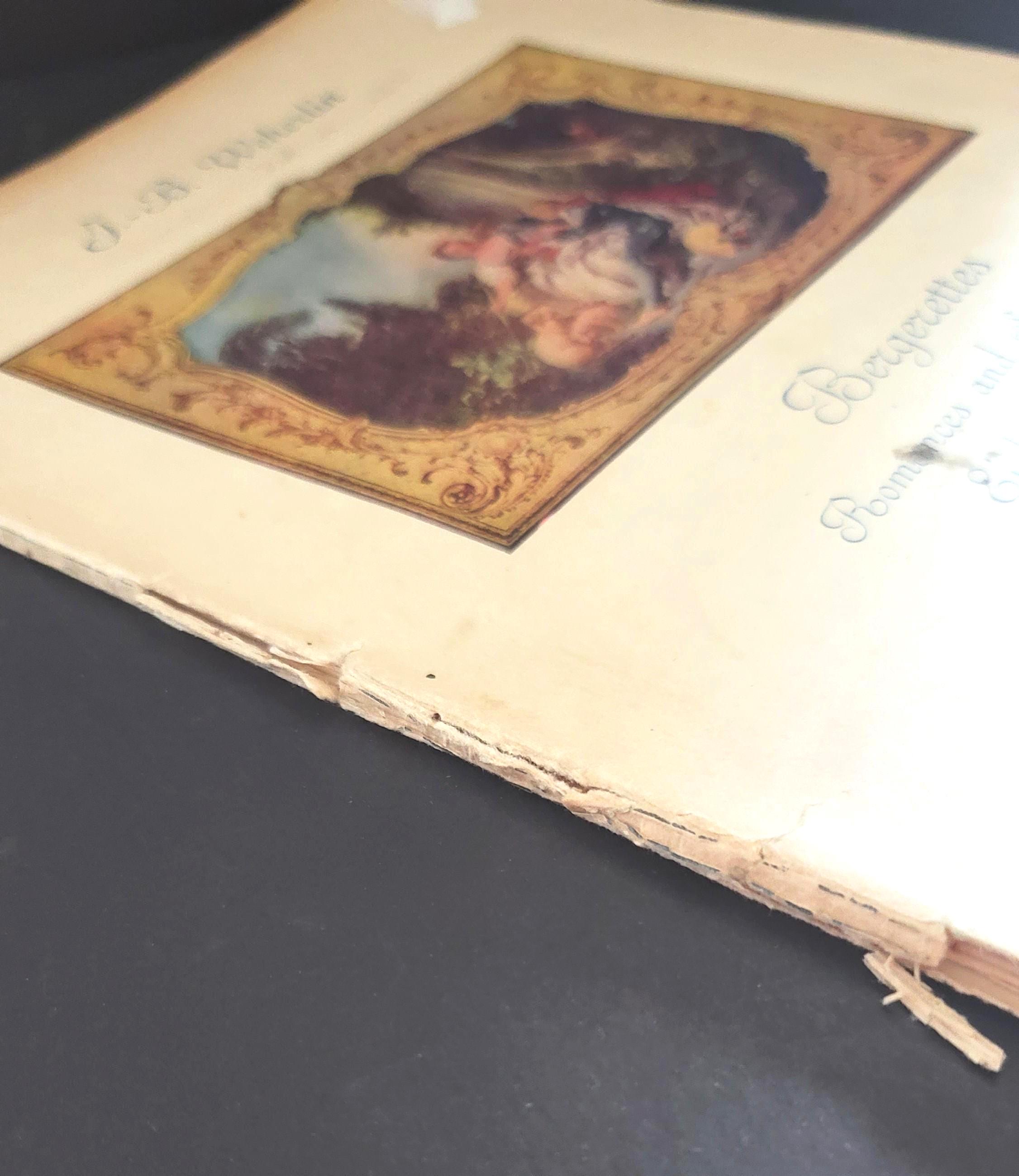 This book, published in 1913 is in both English and French in the rococo style with composers such as Monsigny, Exaudet and more.It is 12.25 x 9.25" and has 52 pages. The cover is fragile and coming off the rest of the book but the rest of the pages are together and not as fragile. There is some writing in pencil in it. A very beautiful book.