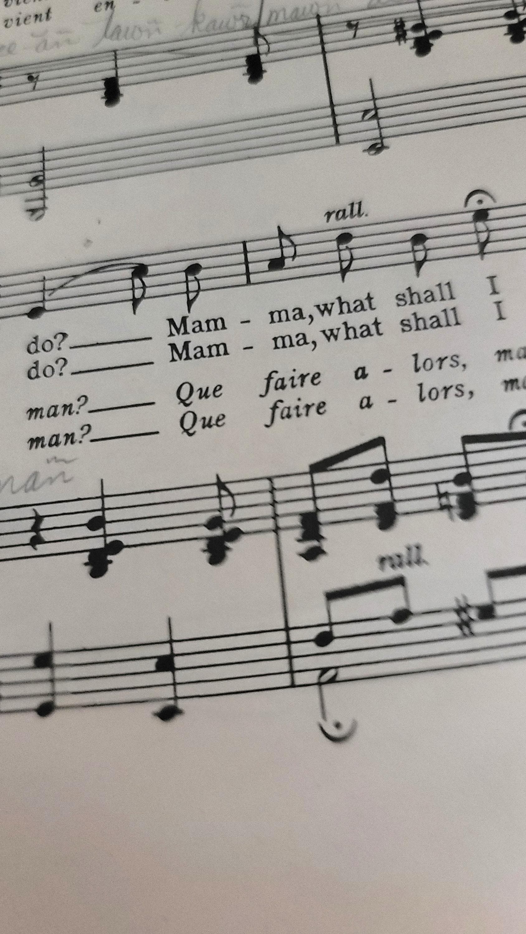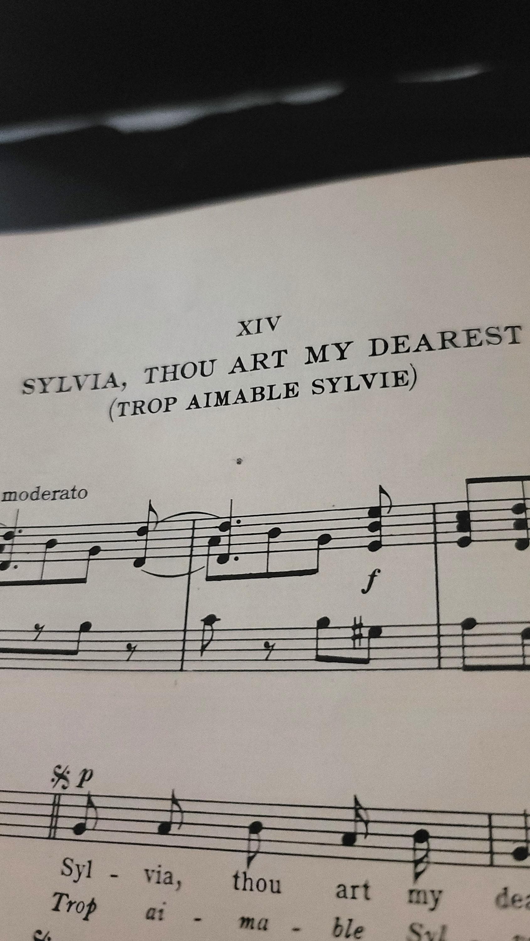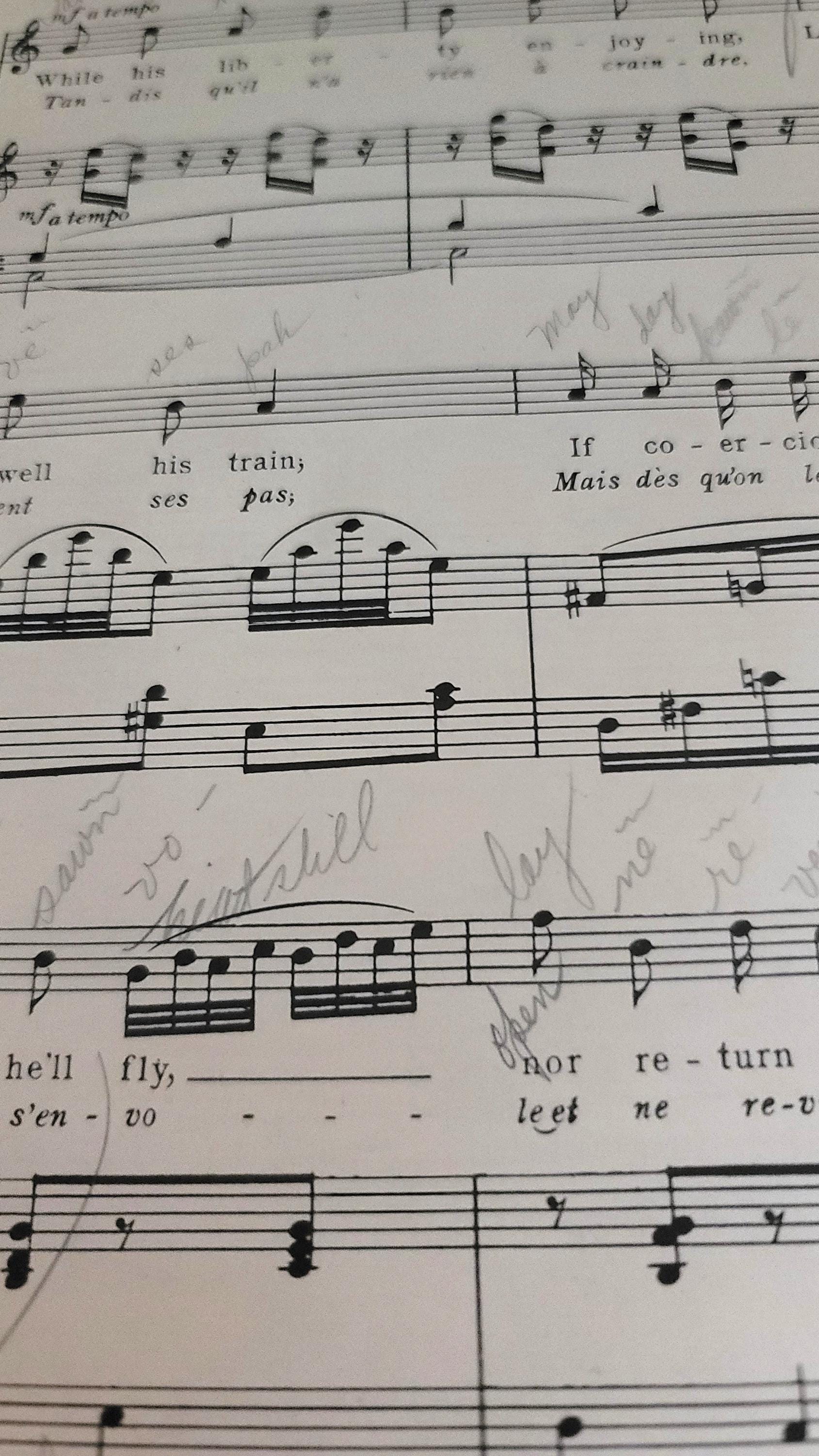 This book, published in 1913 is in both English and French in the rococo style with composers such as Monsigny, Exaudet and more.It is 12.25 x 9.25" and has 52 pages. The cover is fragile and coming off the rest of the book but the rest of the pages are together and not as fragile. There is some writing in pencil in it. A very beautiful book.