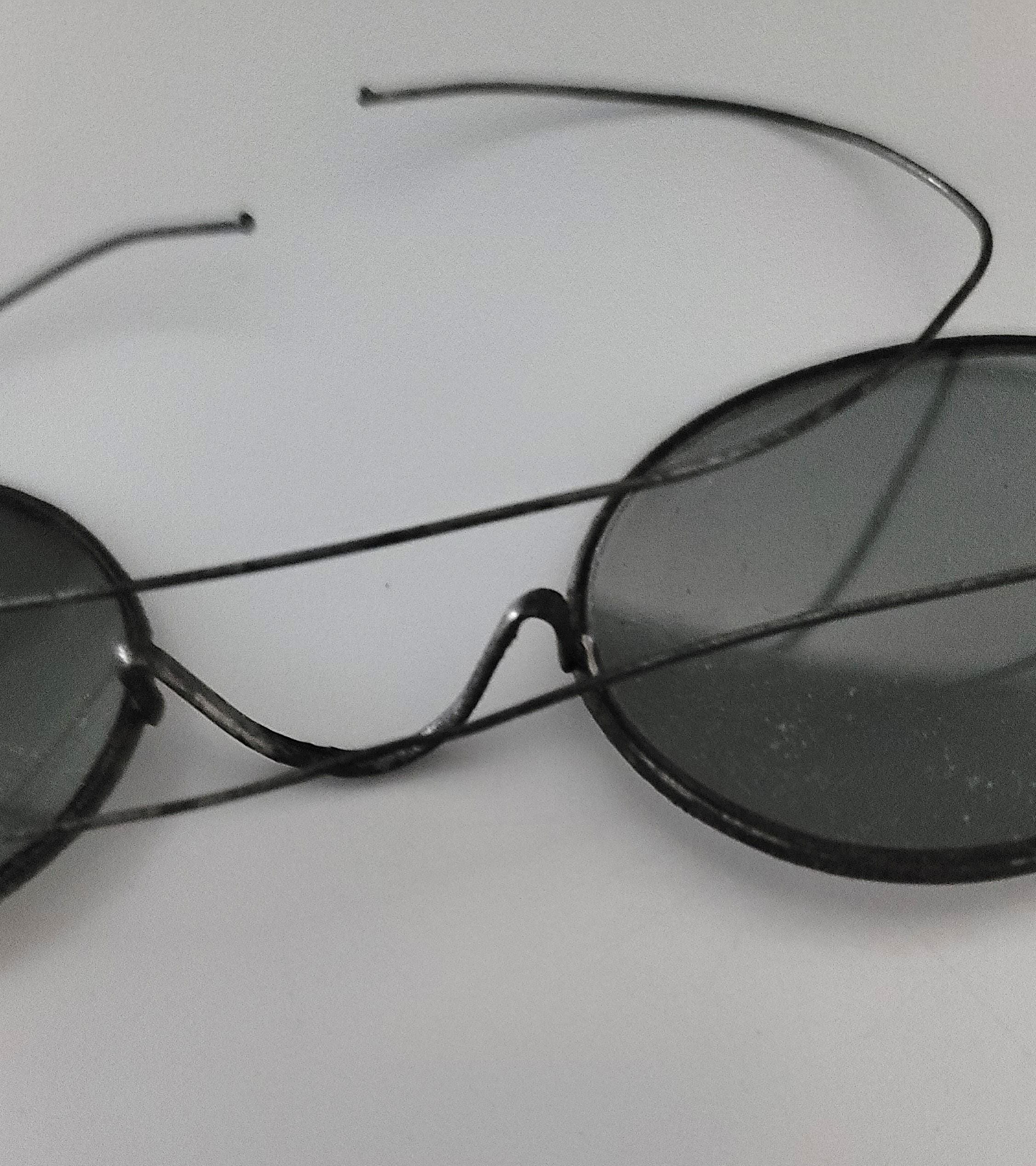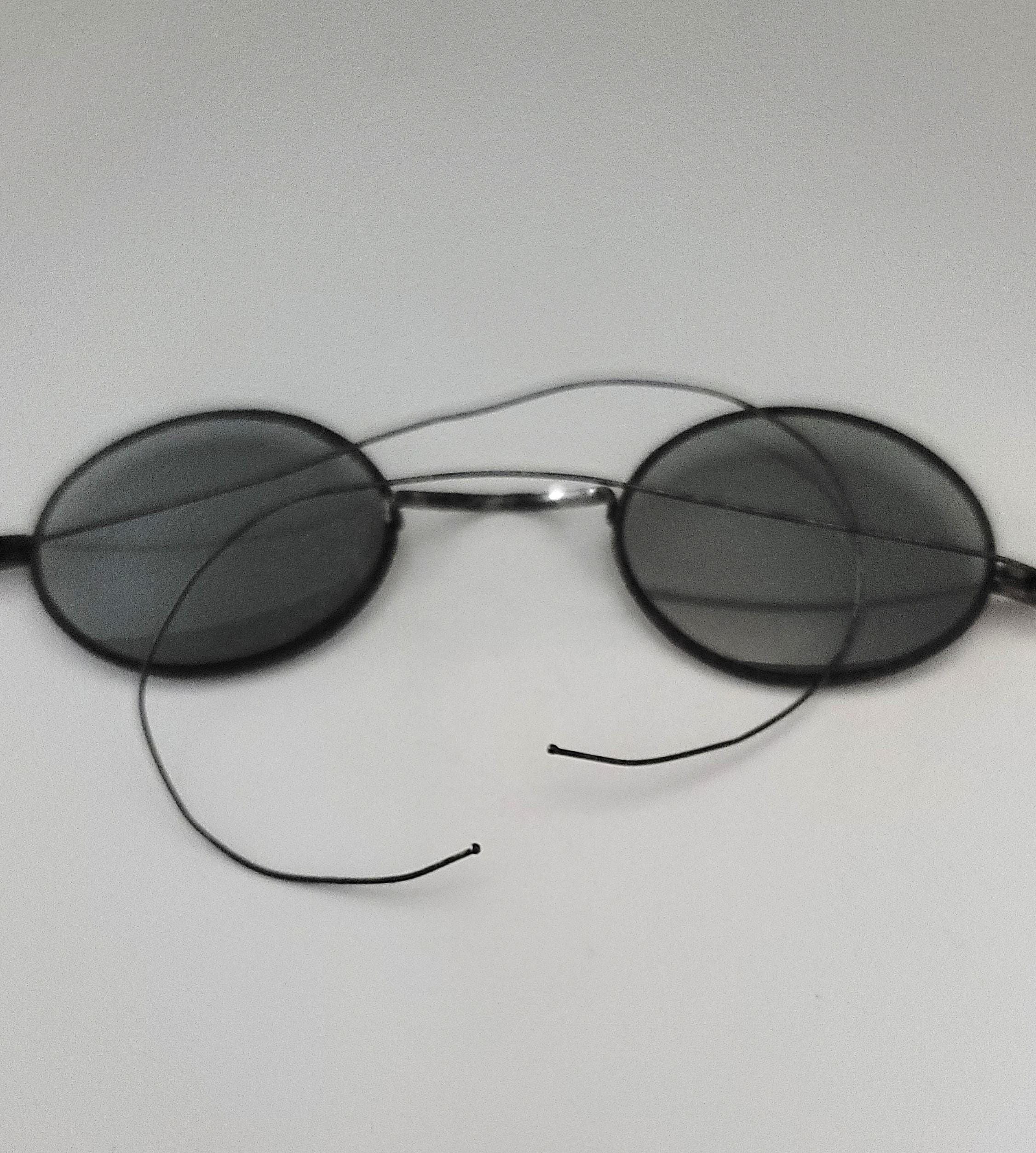 These antique glasses are not prescription, just gray colored glass and a wire frame. The frames are very thin wire, highly adjustable, lol. I would guess about 18-20 guage. The lenses are 1 5/8 x 1 1/4" and measure 4.5" across the frame. The case is 5 1/4 x 2 1/4". Very collectible.