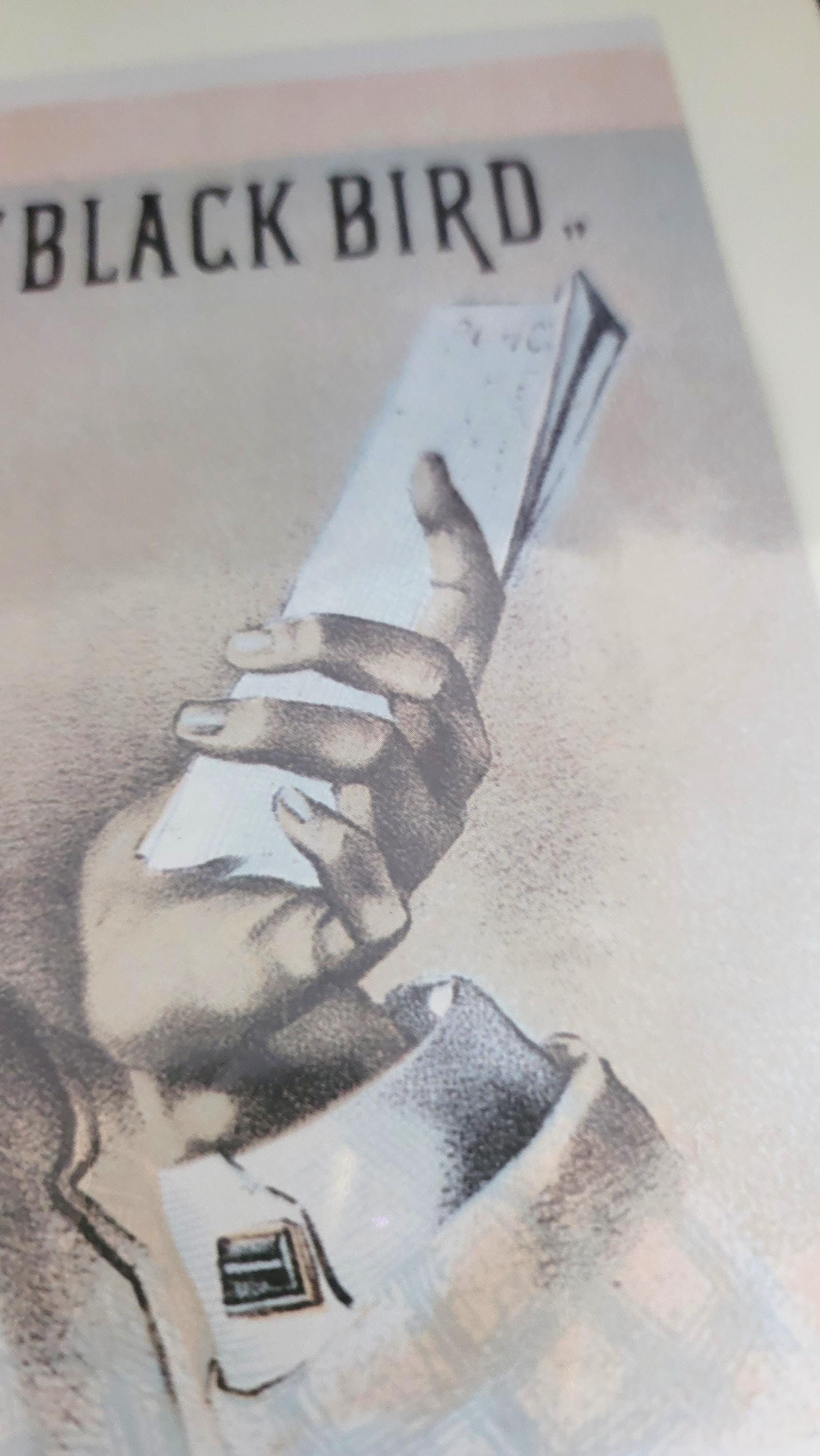 This is an old reproduction (1970s?) of an 1800s ad for Blackbird Tobacco, not to be confused with the Blackbird Cigars started in the 2000's. It features a dapper man in a hat and would look great framed. It is 8 x 10". In great condition.