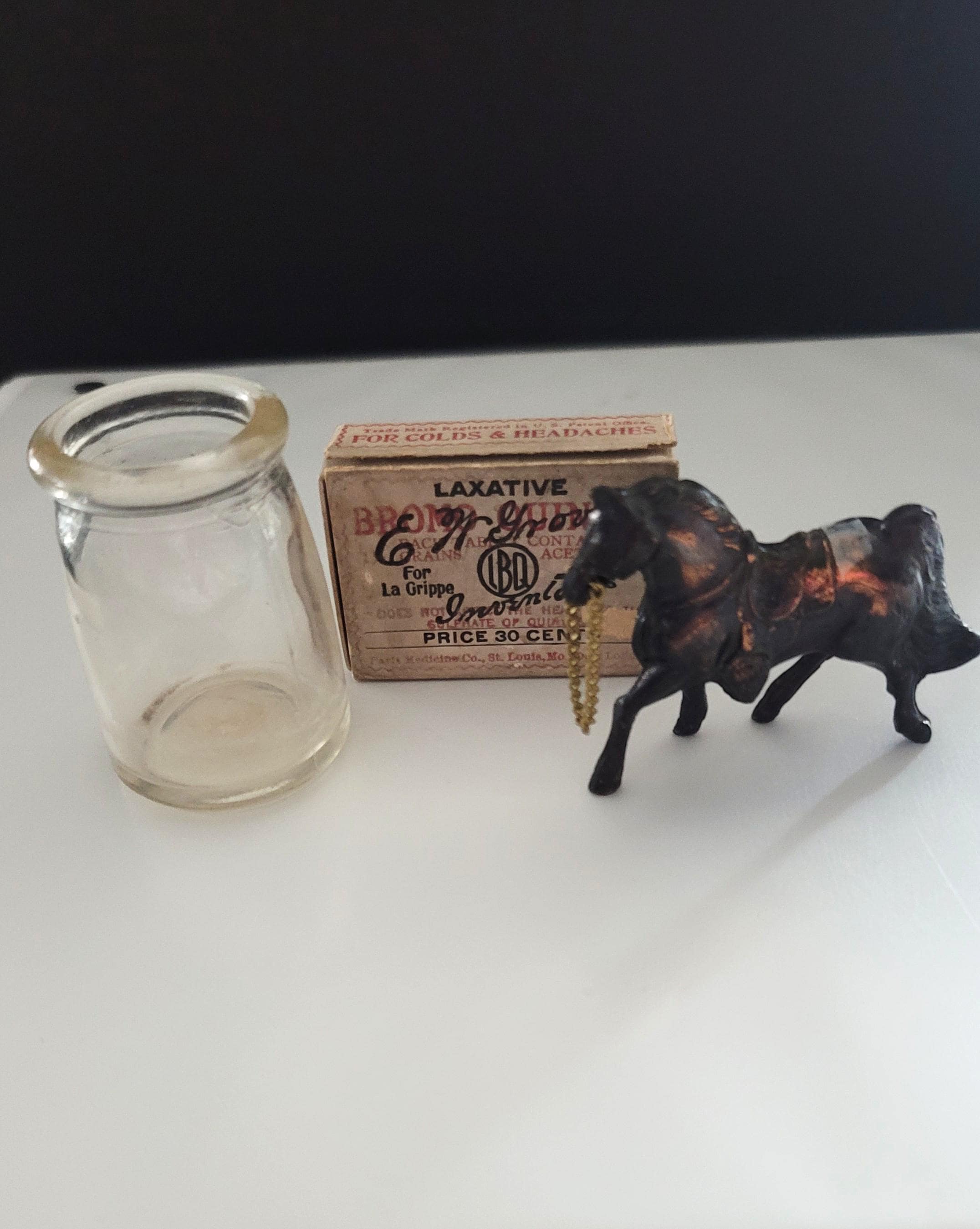Another weird little lot for your entertainment! This one has a vintage miniature milk jug that is 2" tall and glass, a miniature metal carnival horse that is 2" tall and 2.75" long and a cardboard box with Laxative Tablets on it. The little horse is one they used to give at carnivals for a prize. These metal ones are hard to find.