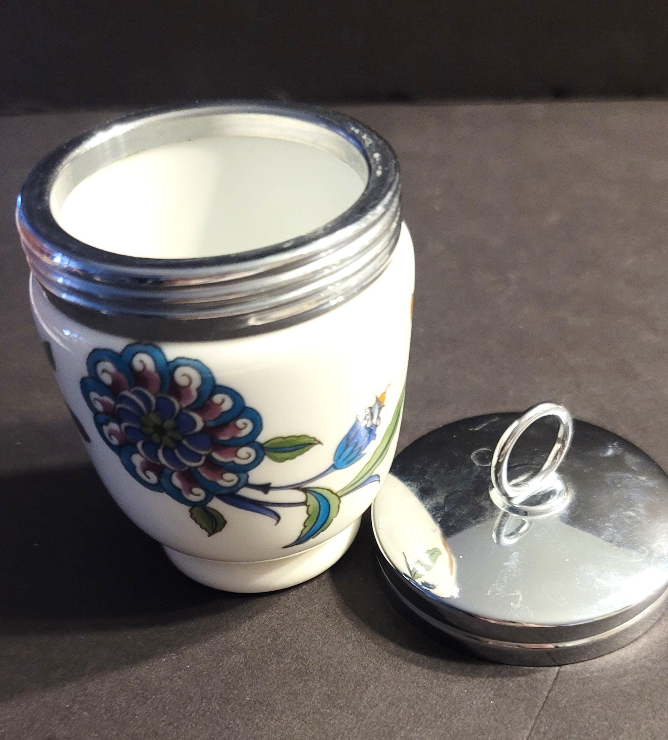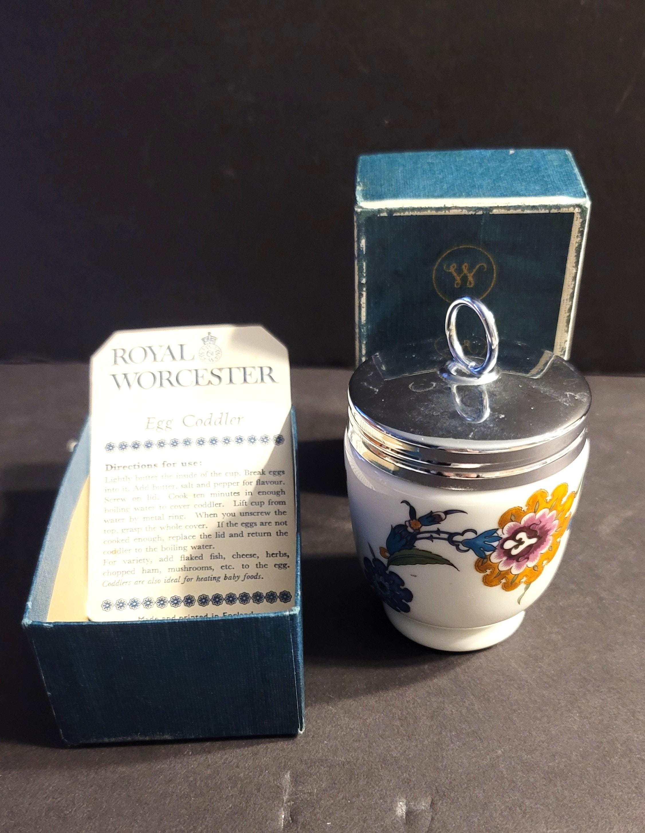 This is a vintage english egg coddler, flame proof and made of porcelain. You butter the inside, break eggs in it, add salt and pepper and screw the lid on. You put it in boiling water and use the metal ring to lift it out after 10 minutes. The box insert says that it is great for heating baby food too! It is 3.5" tall and 2.5" in diameter. Has a Palmyra pattern.