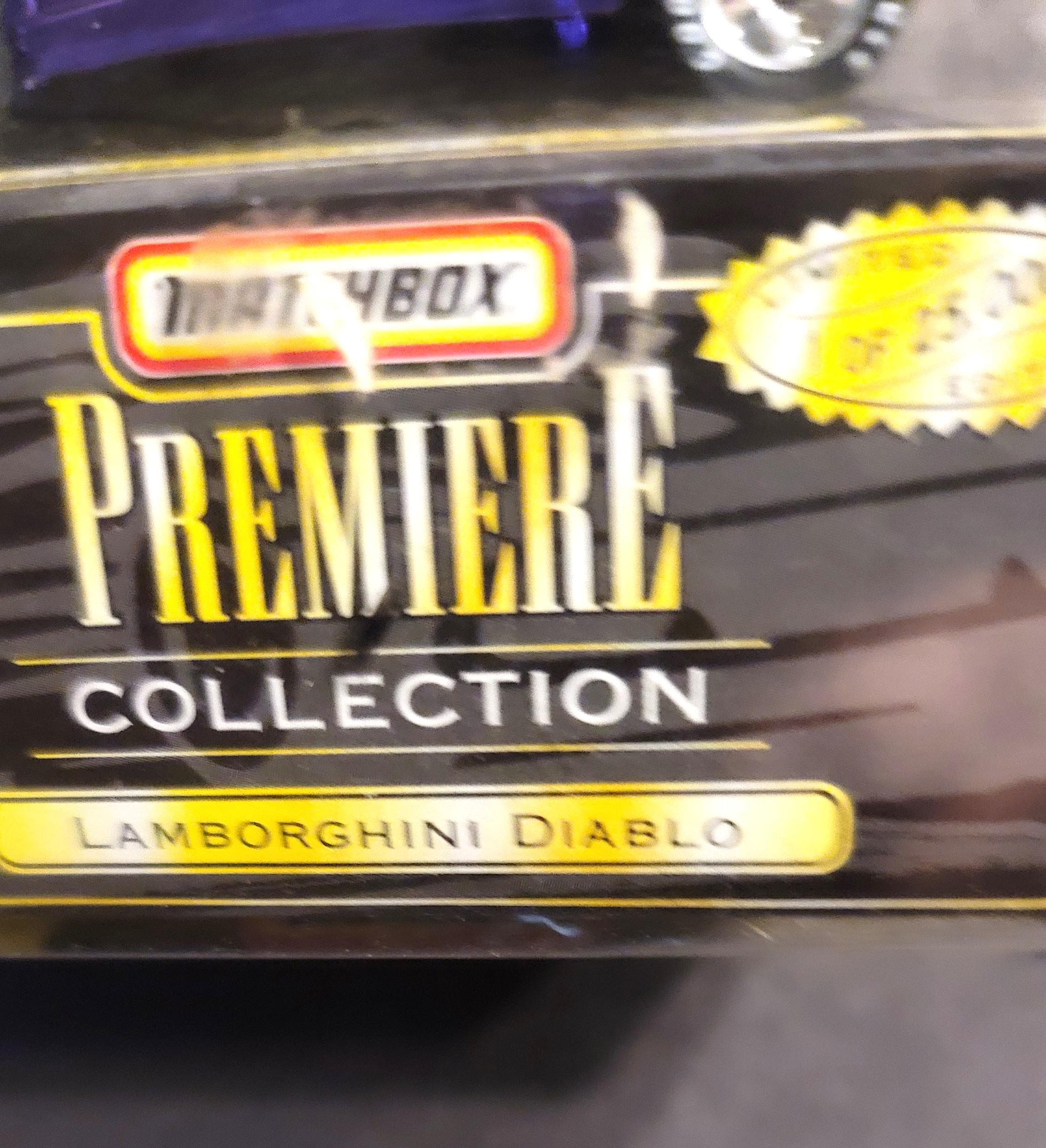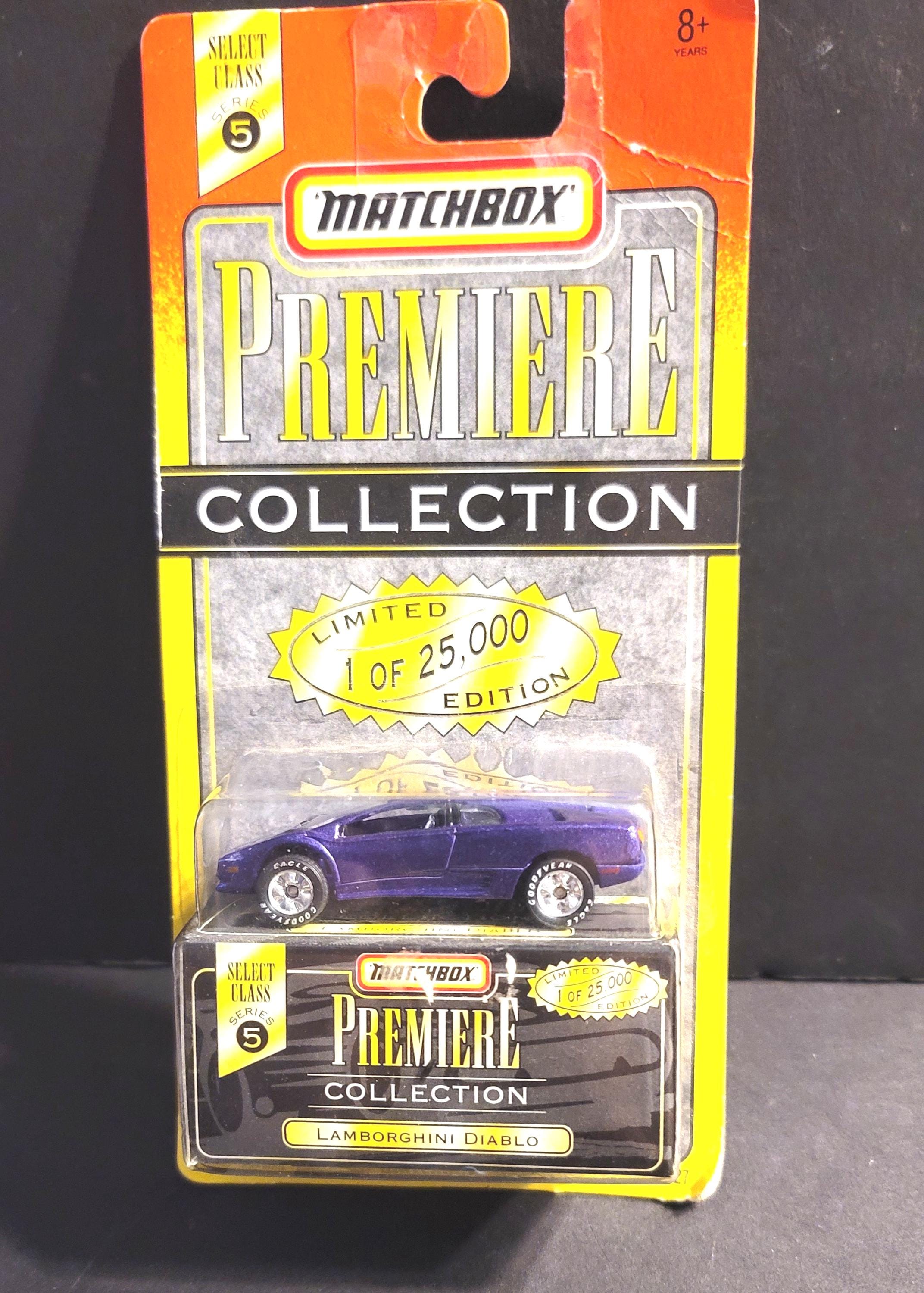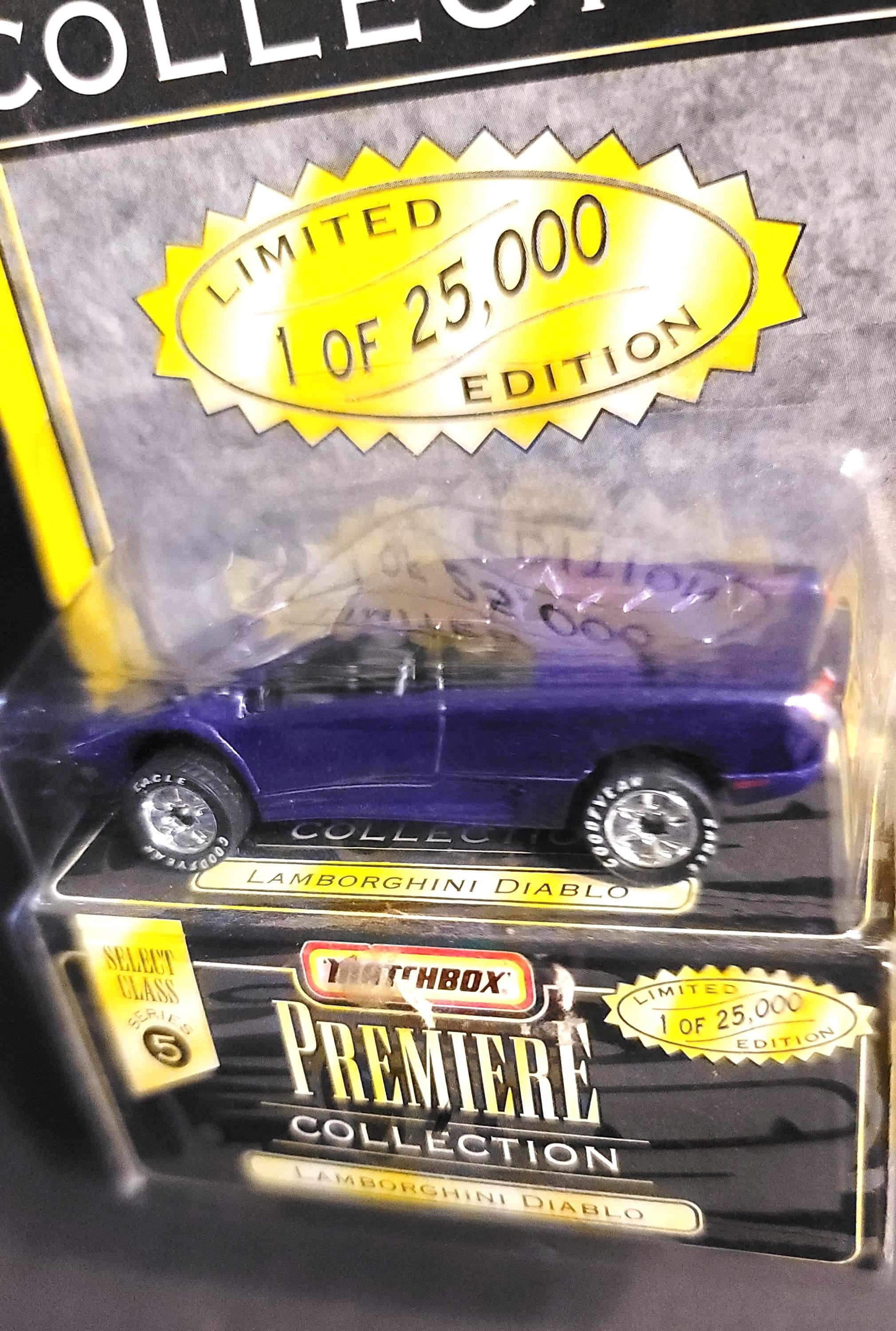 Here's a little Matchbox Lambo in purple. It is part of the Premier Collection, 1 of only 25,000 made. Made in 1998. Standard Matchbox size. Never been opened.