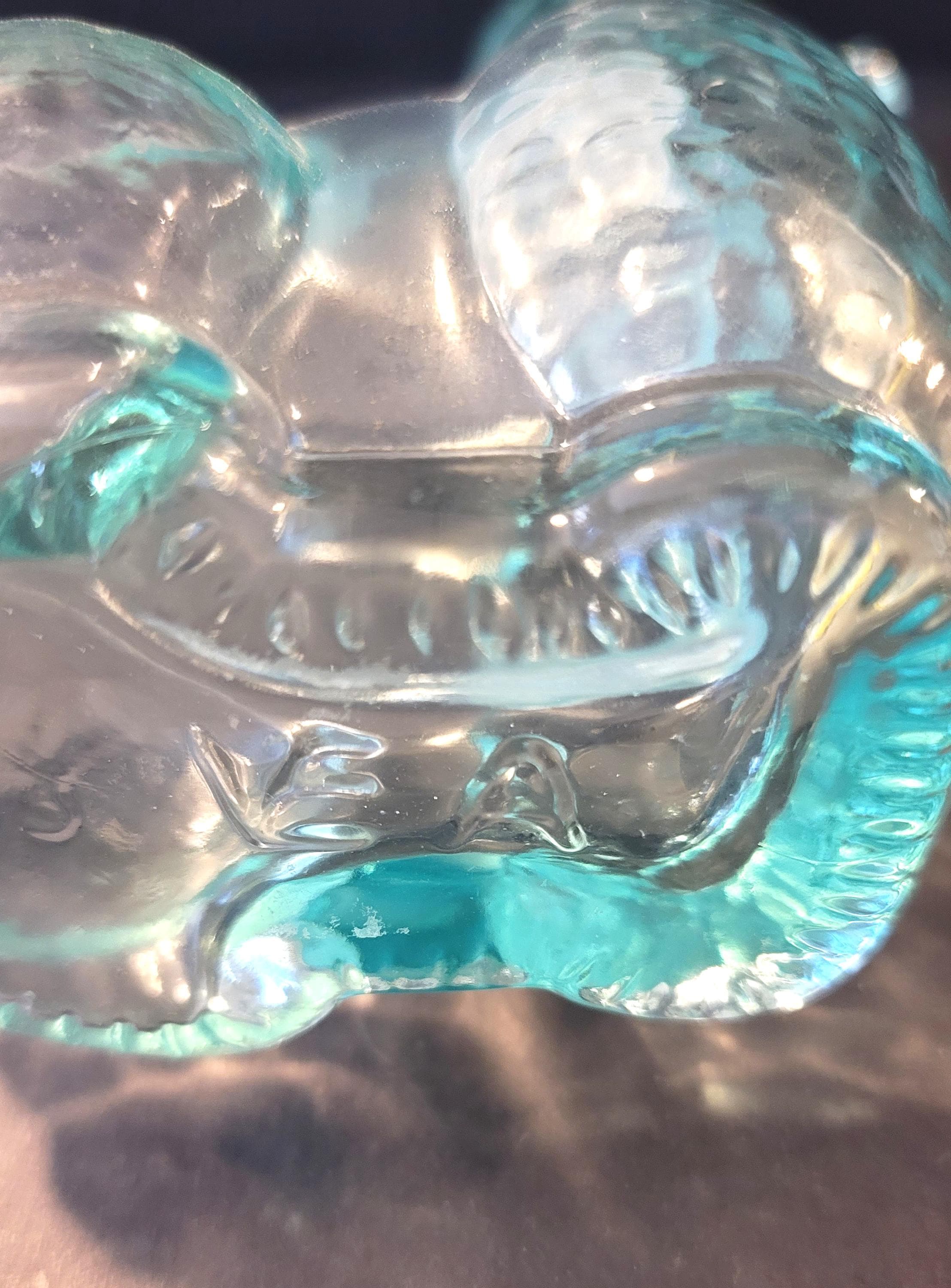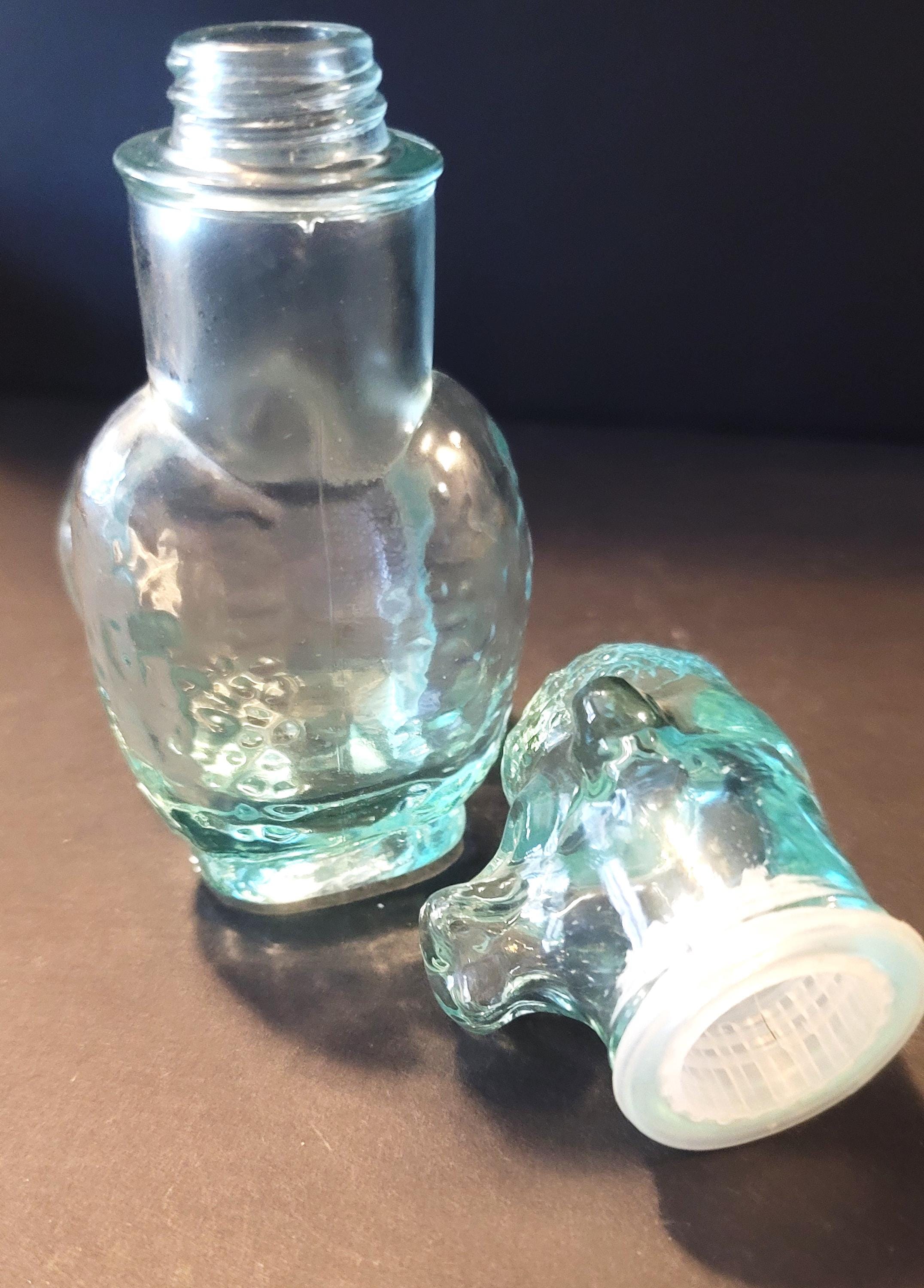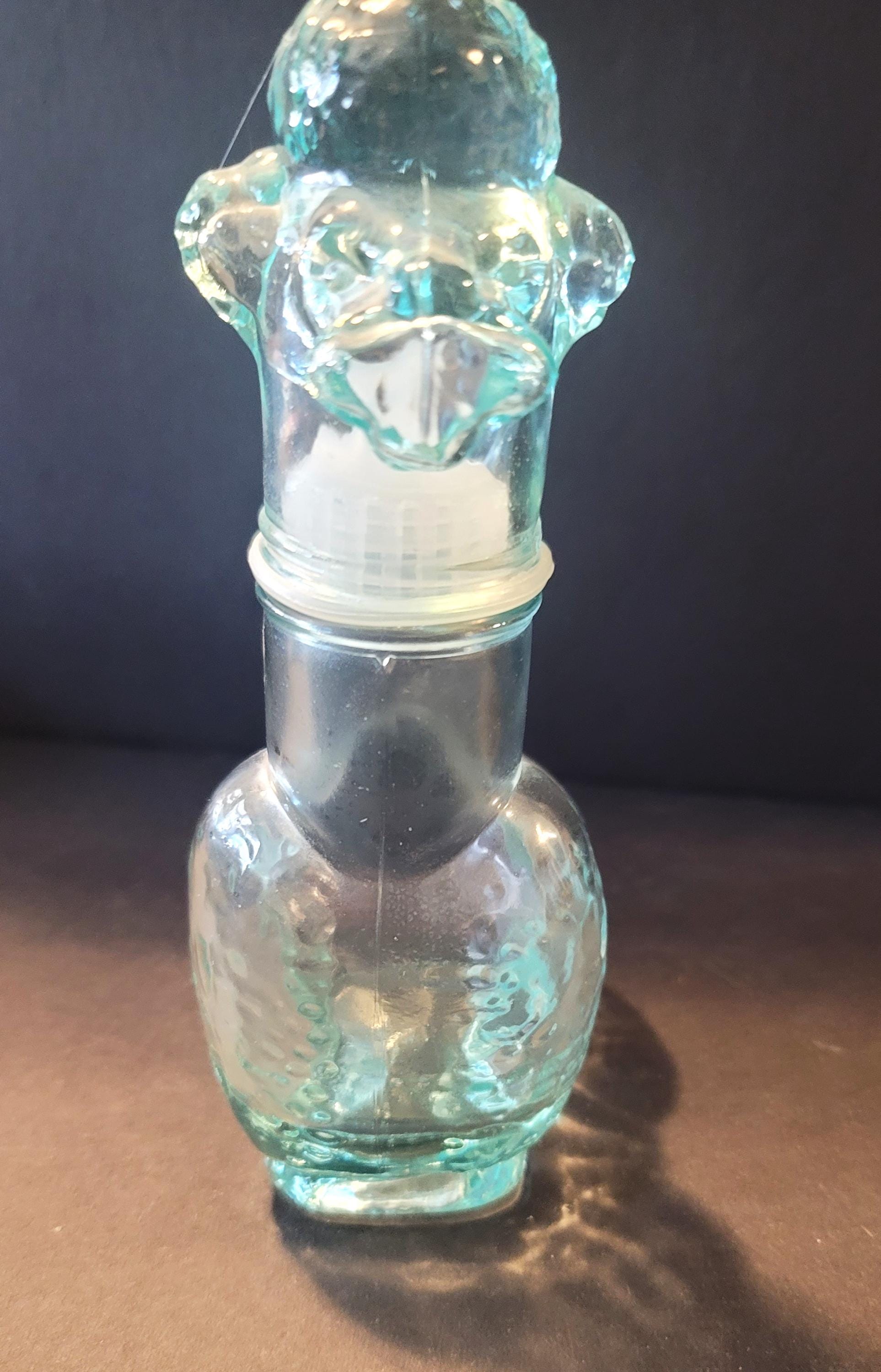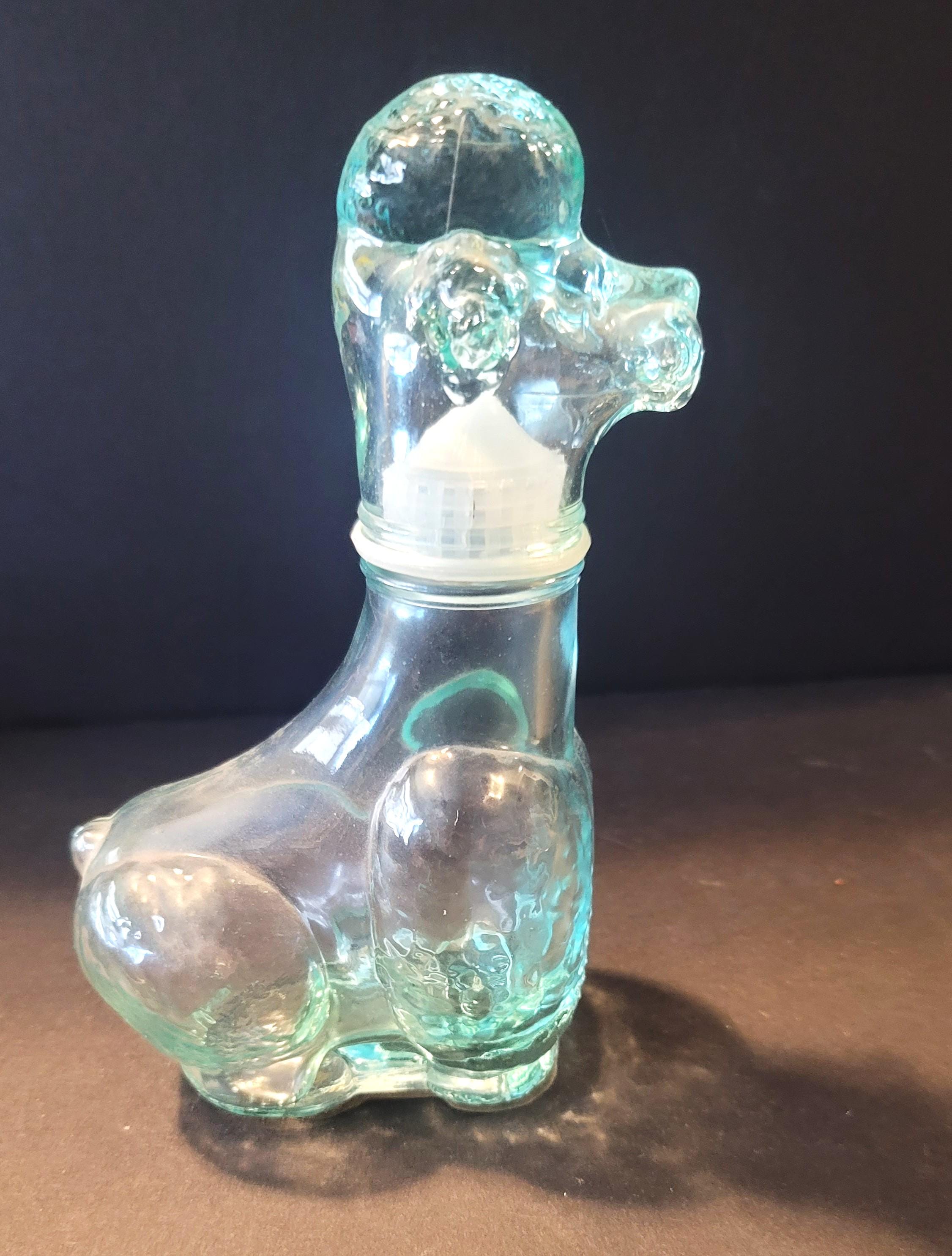 This cute aquamarine glass poodle is Italian and from the 60's. It is 7.25" tall and the base is 3 x 2 1/8. It has plastic liner around the bottle so it fits like a cork. It is in very good condition, no flea bites or anything. Inside like new. The bottom is embossed with the maker VEA for Vetreria Etrusca.