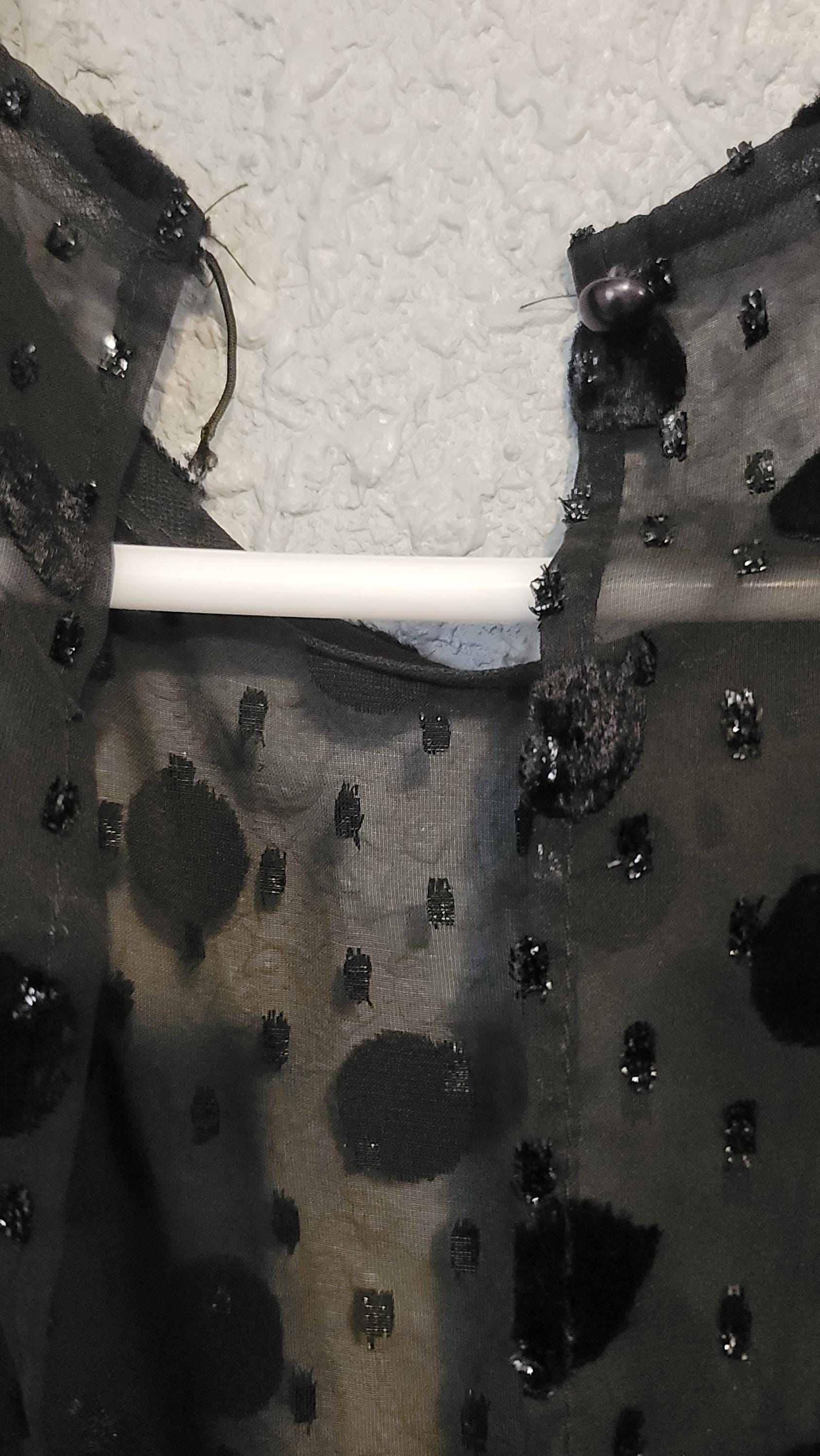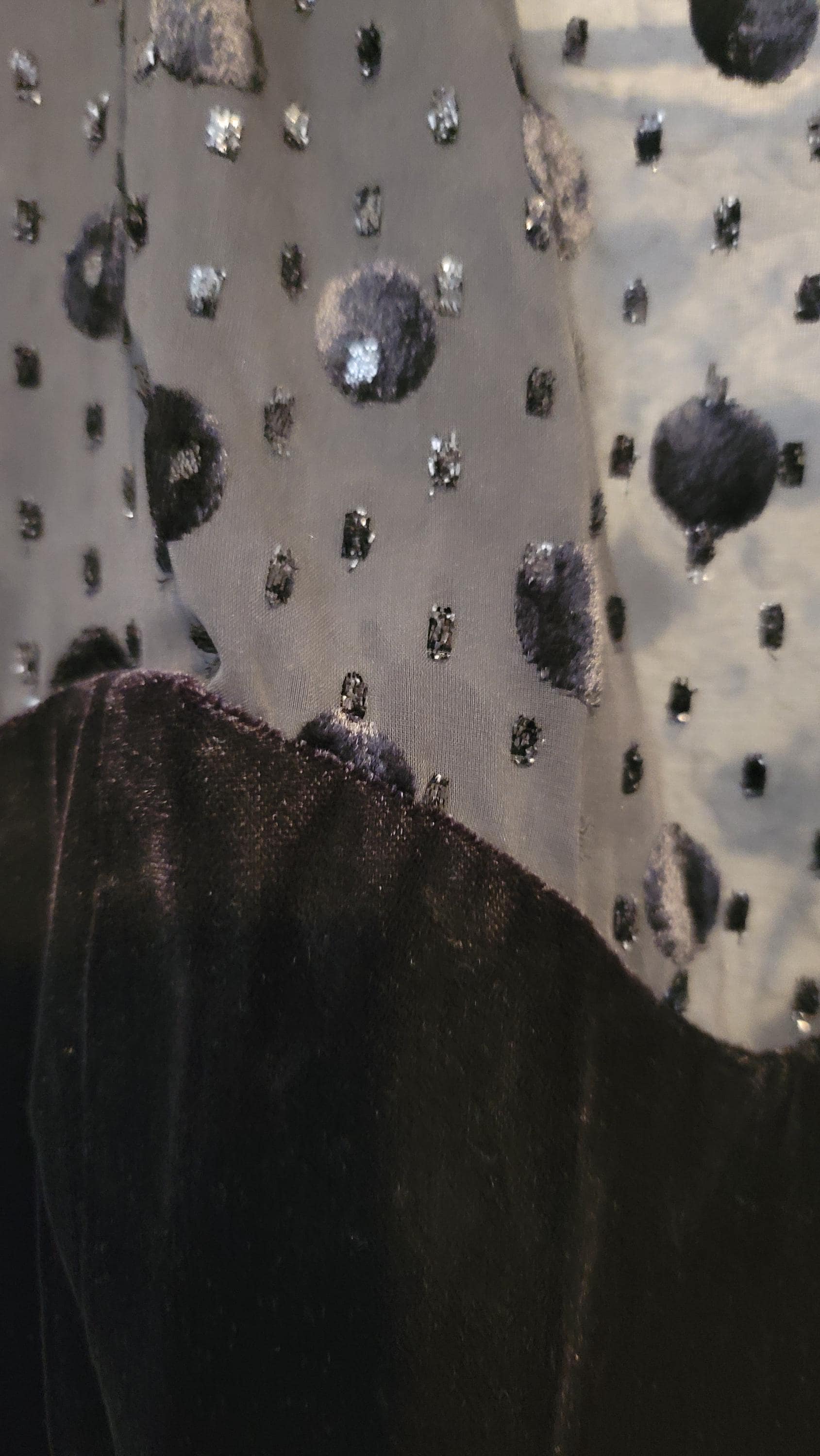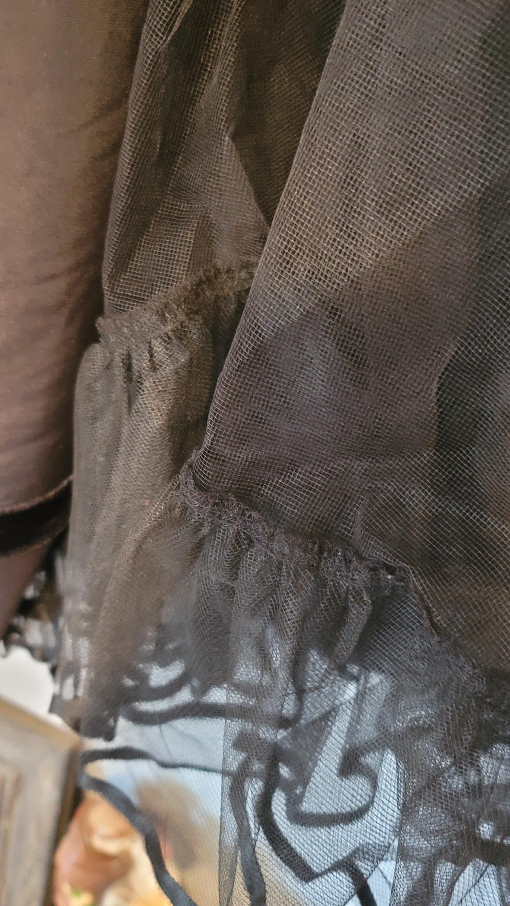 This dress is super cute. It doesn't have any tags inside so I am not sure of the maker or the size. I guestimate that it is a size 10. It has a crinoline underneath but it's one that isn't super large, it's like, perfect. The top of the dress and the long sleeves are lace with velvet polka dots. The rest of the dress is black velvet. The only thing wrong with it is that the button holder which is elastic has come undone. I am going to try to fix it, I just haven't done it yet. The measurements: shoulder seam to shoulder seam (the top) is 14.75". Top of center of neck to bottom of dress is 45". Shoulder seam to wrist seam of sleeve is 24". It has a back zipper of 9.75". Front center of top of dress to where the velvet starts is 6.75". Side seam to side seam on the bottom him is 59". Free US shipping.