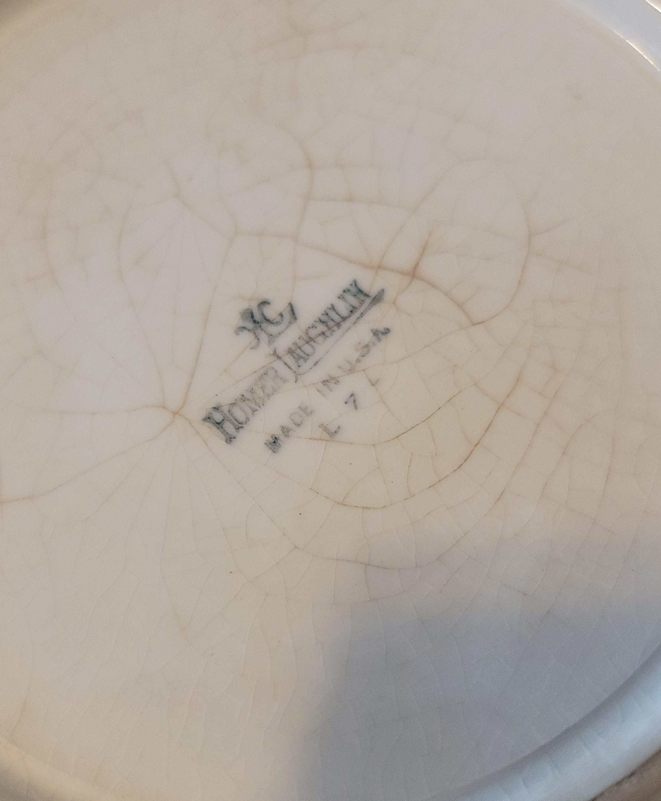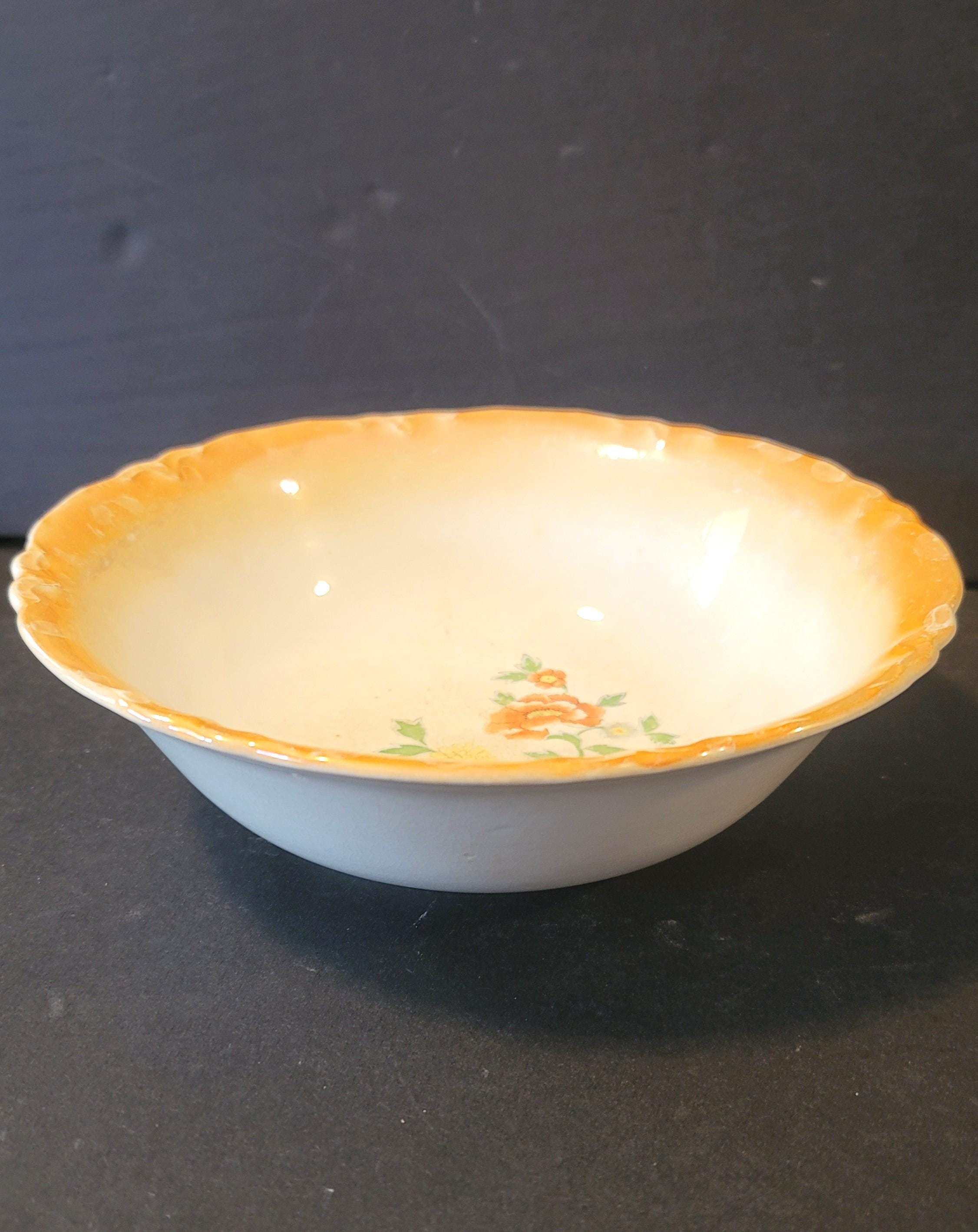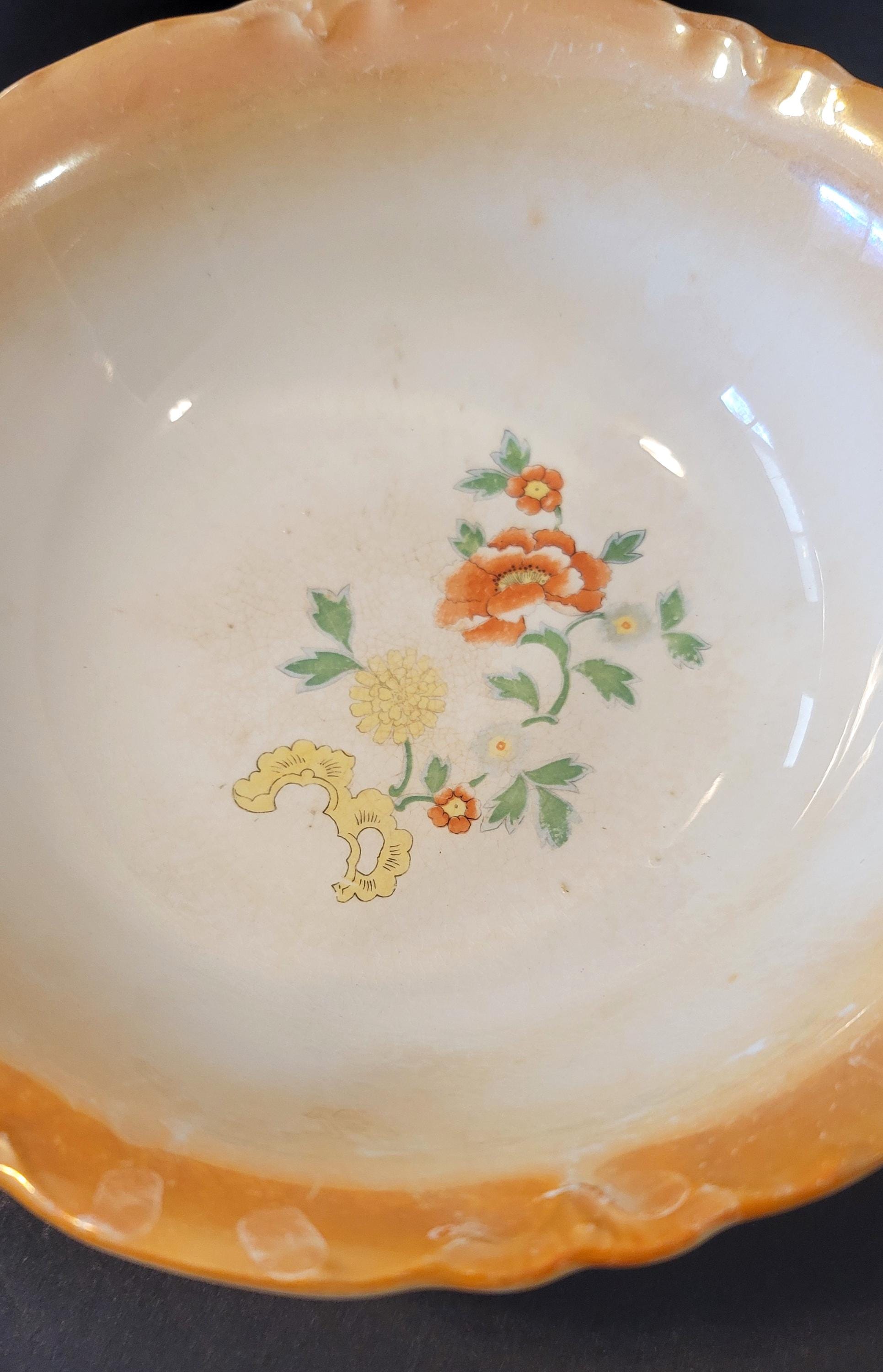 Very pretty, old Homer Laughlin, signed with a peach lusterware glass. There are florals in the center and the edge is scalloped and embossed. There is some crazing around the floral design on the inside and crazing inside the rim on the bottom. It is 7 x 2.25". It is from the 1930s.