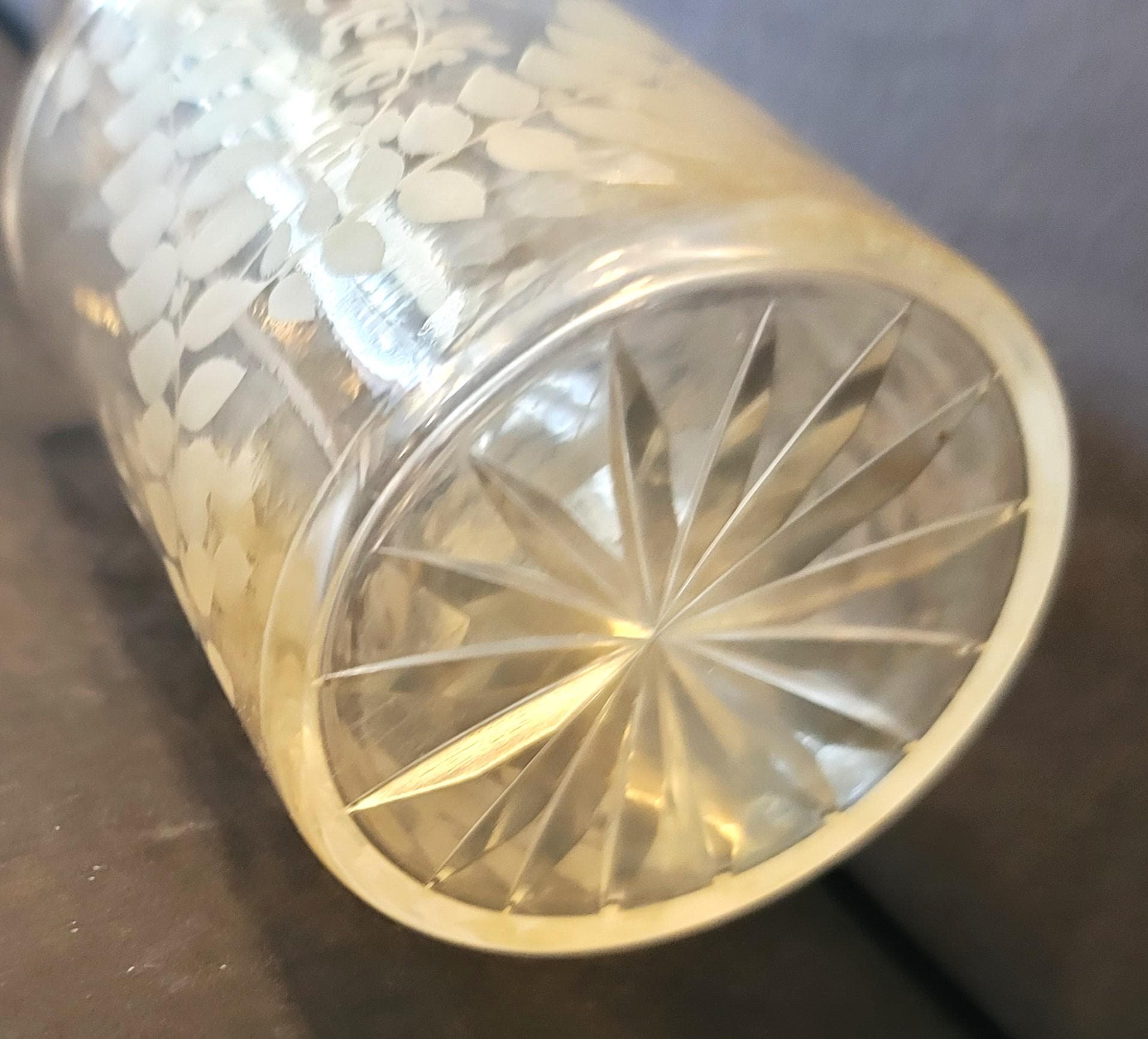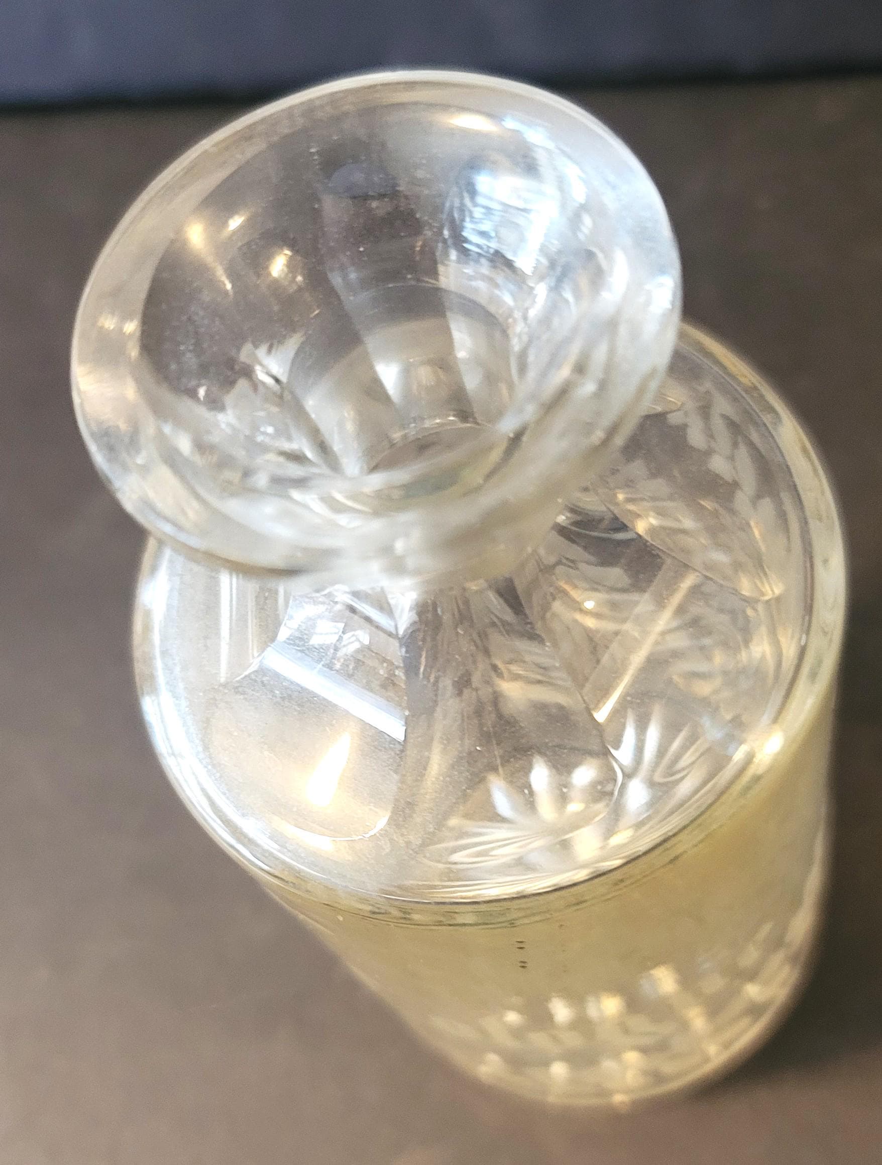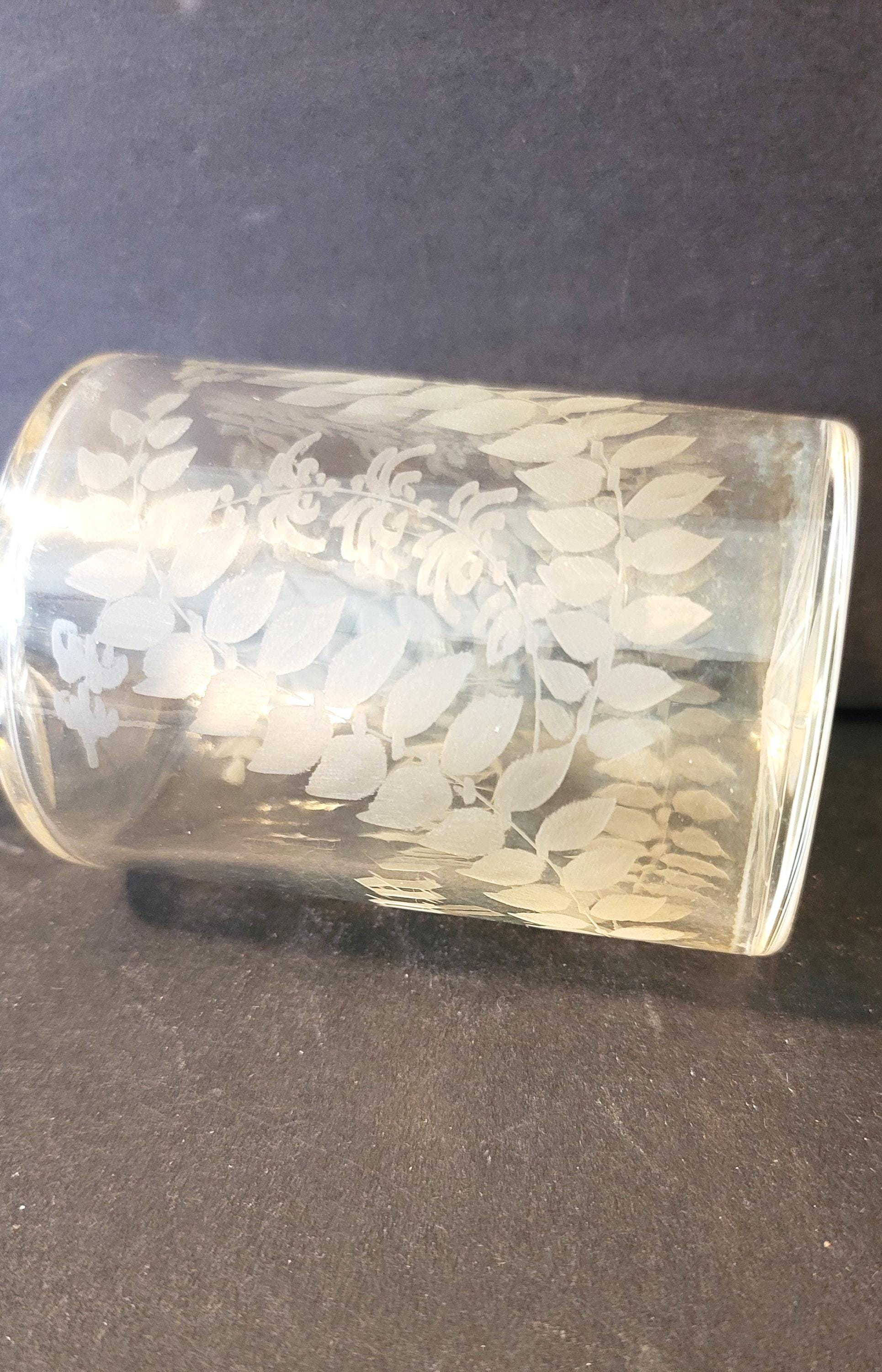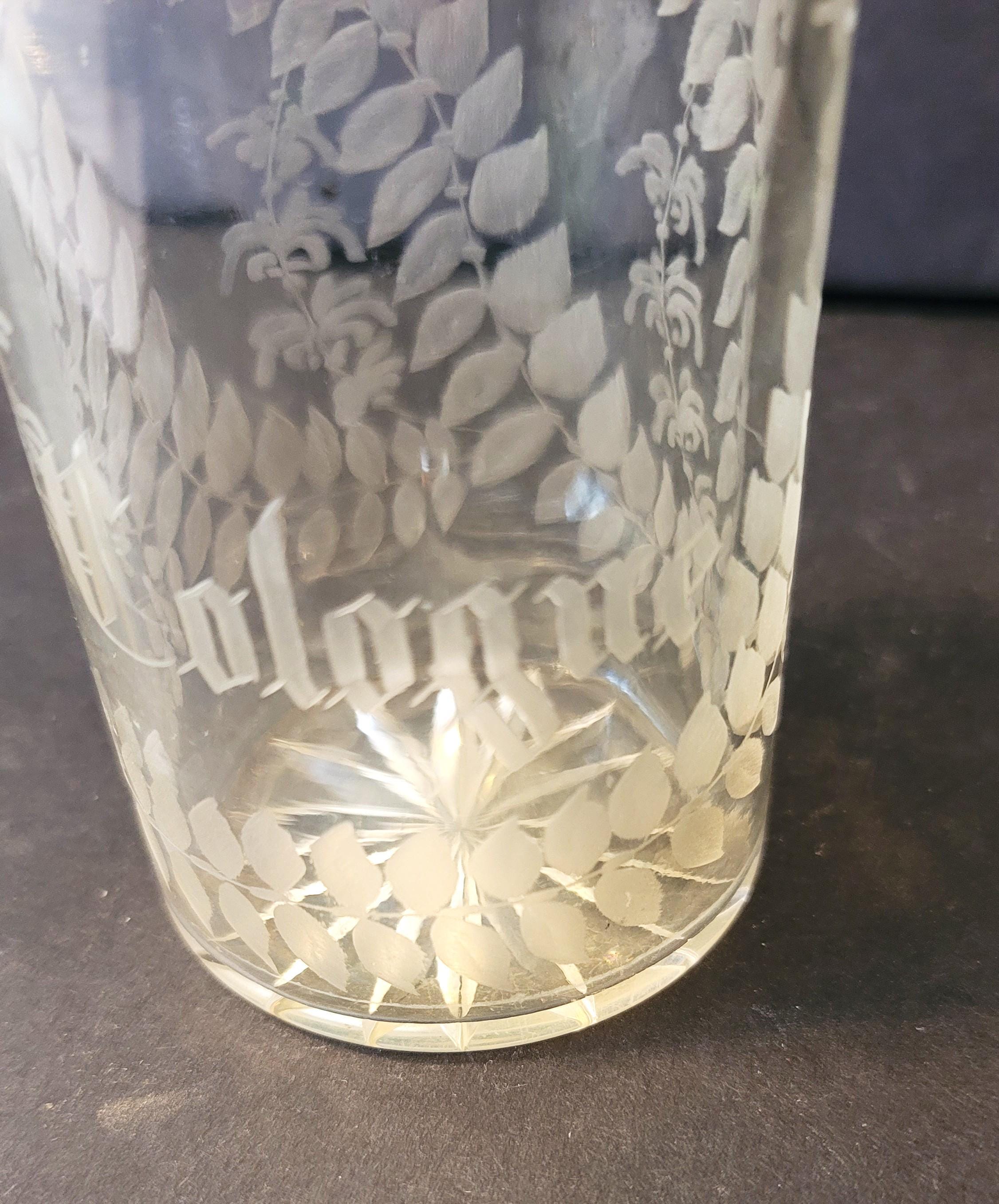 This is a beautiful antique barber bottle for men's cologne, "Cologne" being etched on the clear glass with fern leaves which of course are more manly! It has no stopper, probably had a matching glass stopper at one time. It is most likely early 1900s. It is 5.75" tall, the bottom which has a star patter is 2 5/8" diameter. The top is 1.75" in diameter and the hole is .5".