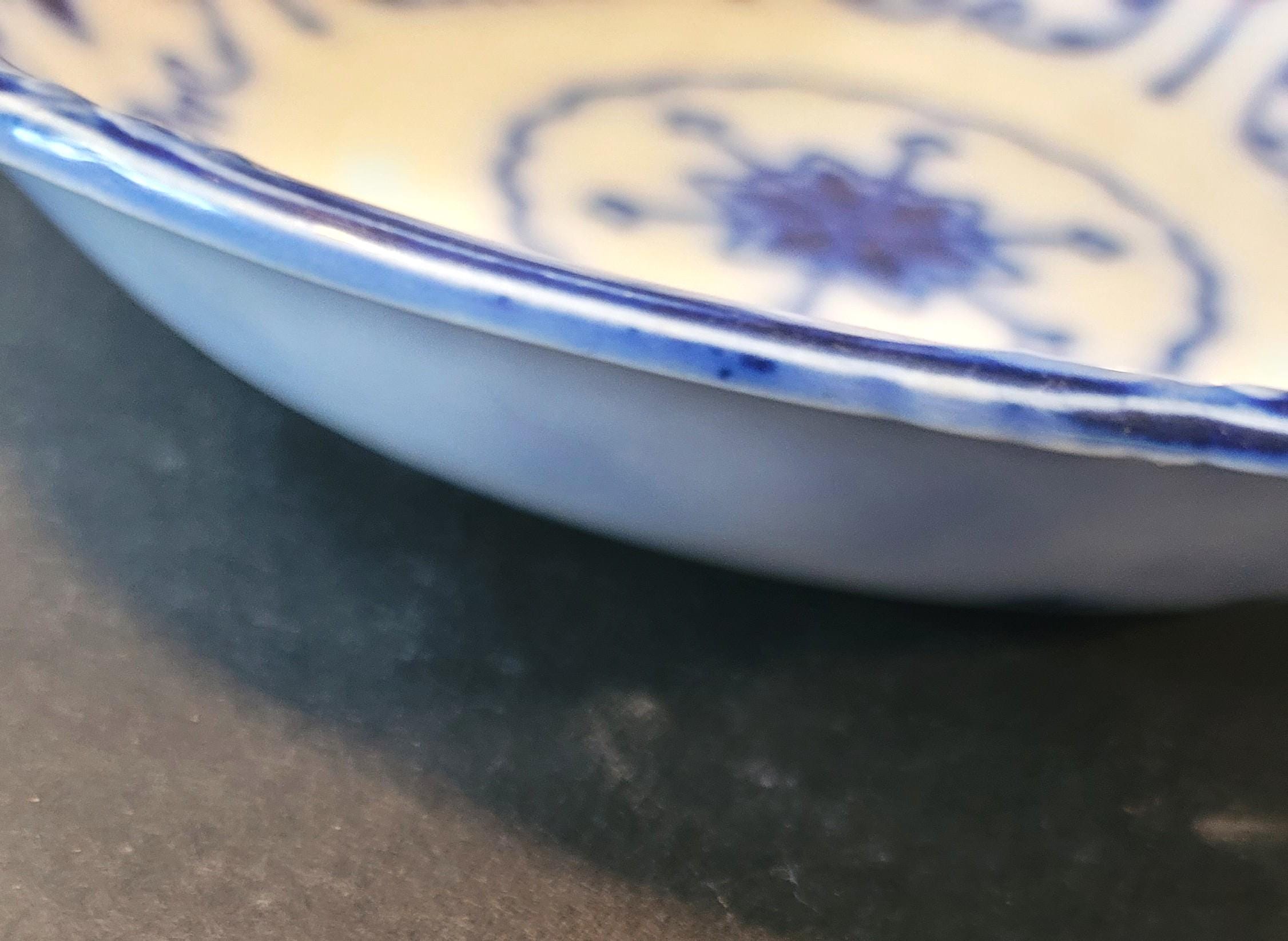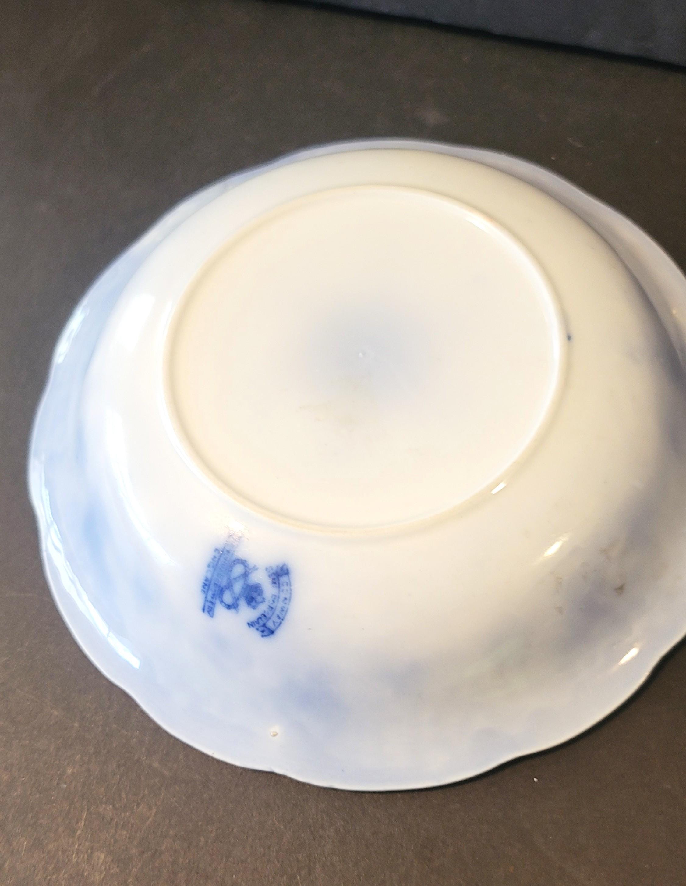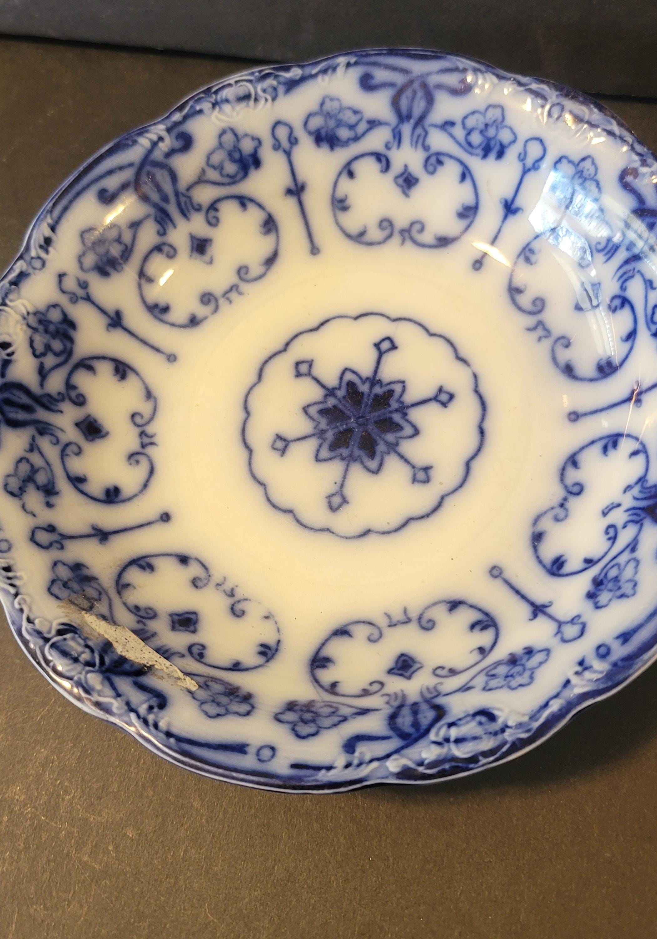 This beauty was made around 1890 with the flow blue transferware in England by New Wharf Pottery. it is semi-porcelain and a soup bowl. I have another just like it but I am listing them separately because this one has more flow in the blue than the other. They have scalloped edges. It is 9" in diameter and 1.75" tall. The bottom rim is 4 3/8" in diameter. These look fantastic in a hutch. No chips, crazing or anything. In fantastic condition. Pricing is difficult on these- they sell anywhere from $40 to $545. If you think my price is too high, feel free to check elsewhere. These are getting harder to find as they break over the years.