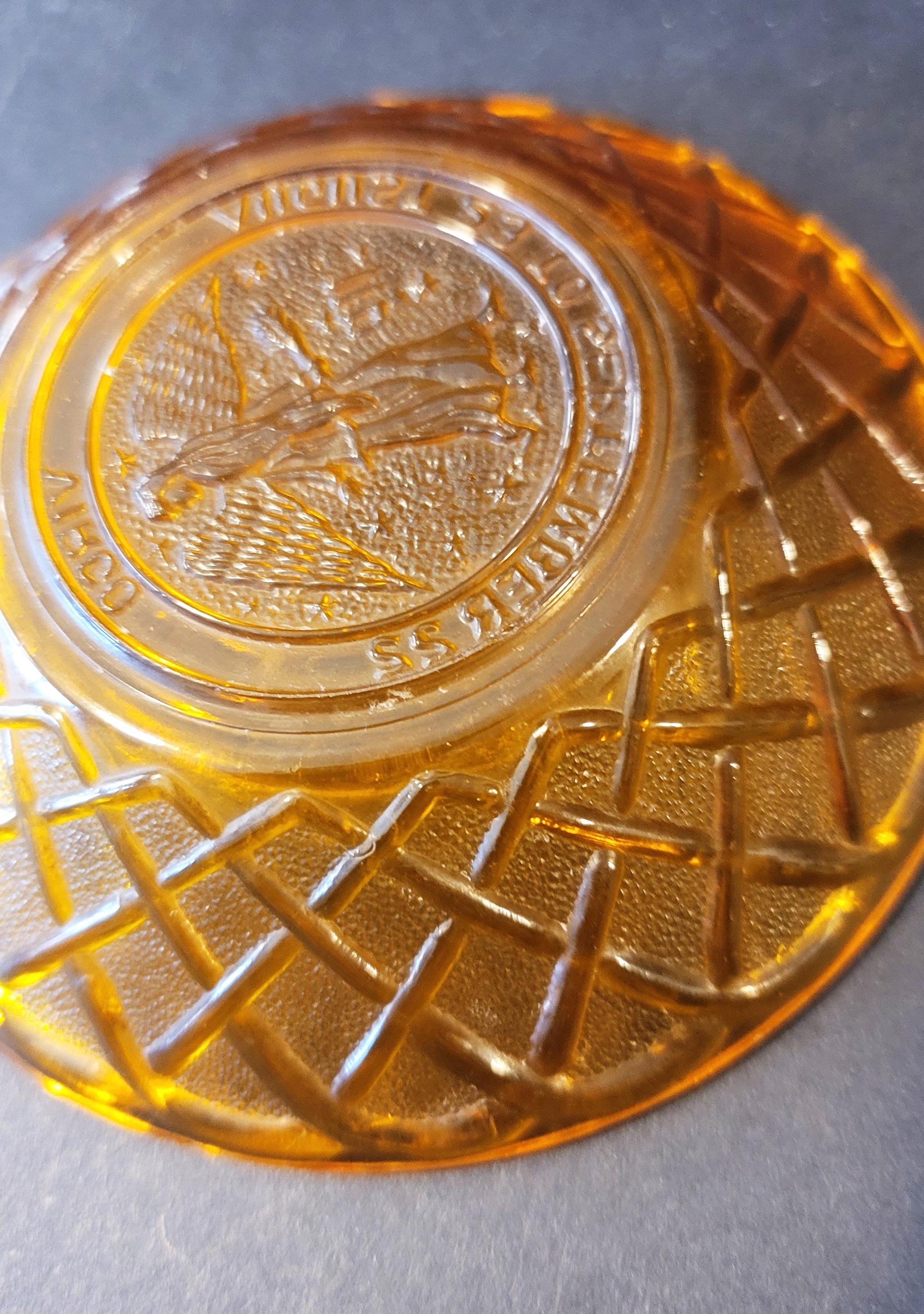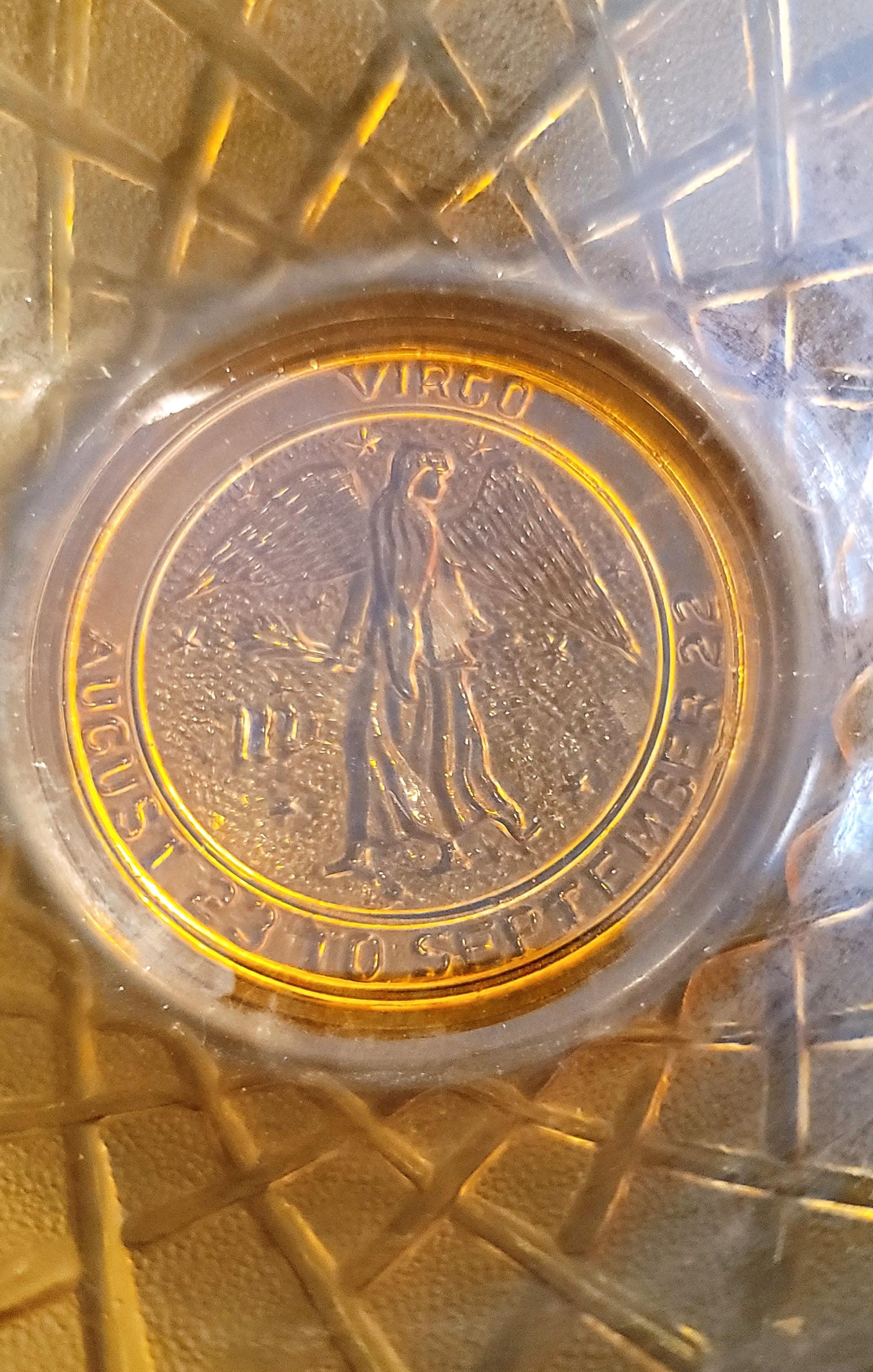Just a little glass amber bowl in a diamond design with the virgo sign in the senter who is represented as a Maiden and this one has wings. From the 60s when amber glass was really popular along with that avocado green! Virgo's are Aug 23 to Sept 22 and is an earth sign. the bowl is 5.5" in diameter and the bottom rim is 3" in diameter. Can be used as a favorite bowl in the kitchen for dining or as a trinket dish, ashtray or whatever! Makes a great Virgo birthday gift!
