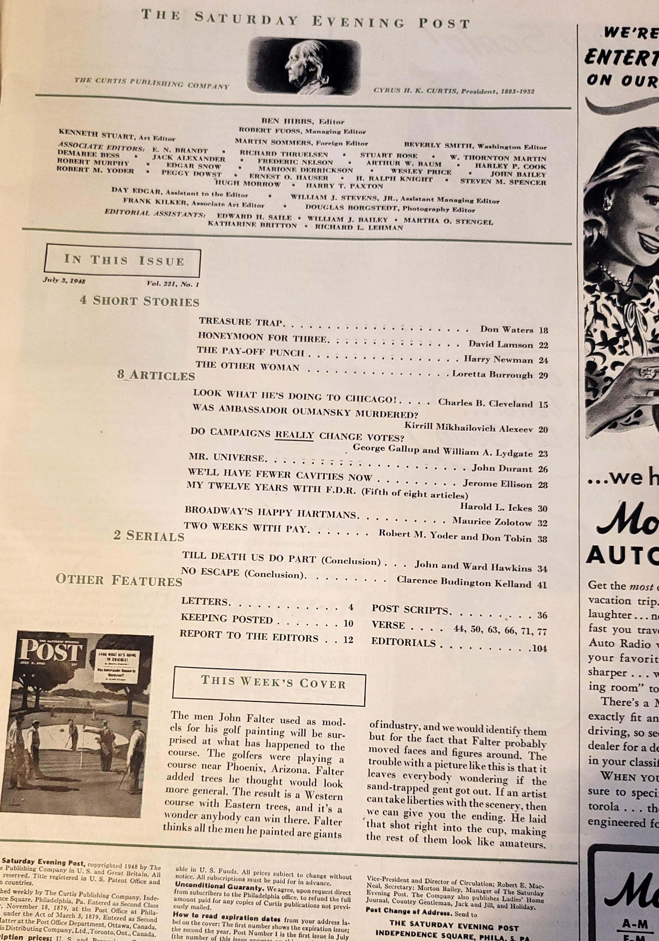 Here is a 1948 Saturday Evening Post and in great vintage condition. The cover is referring to the New Mayor of Chicago, Martin Kennelly. He was a democrat with a non partisan image and well loved in Chicago. The magazine is 13.75 x 11". It is full of fiction, short stories, articles and of course cool vintage ads.