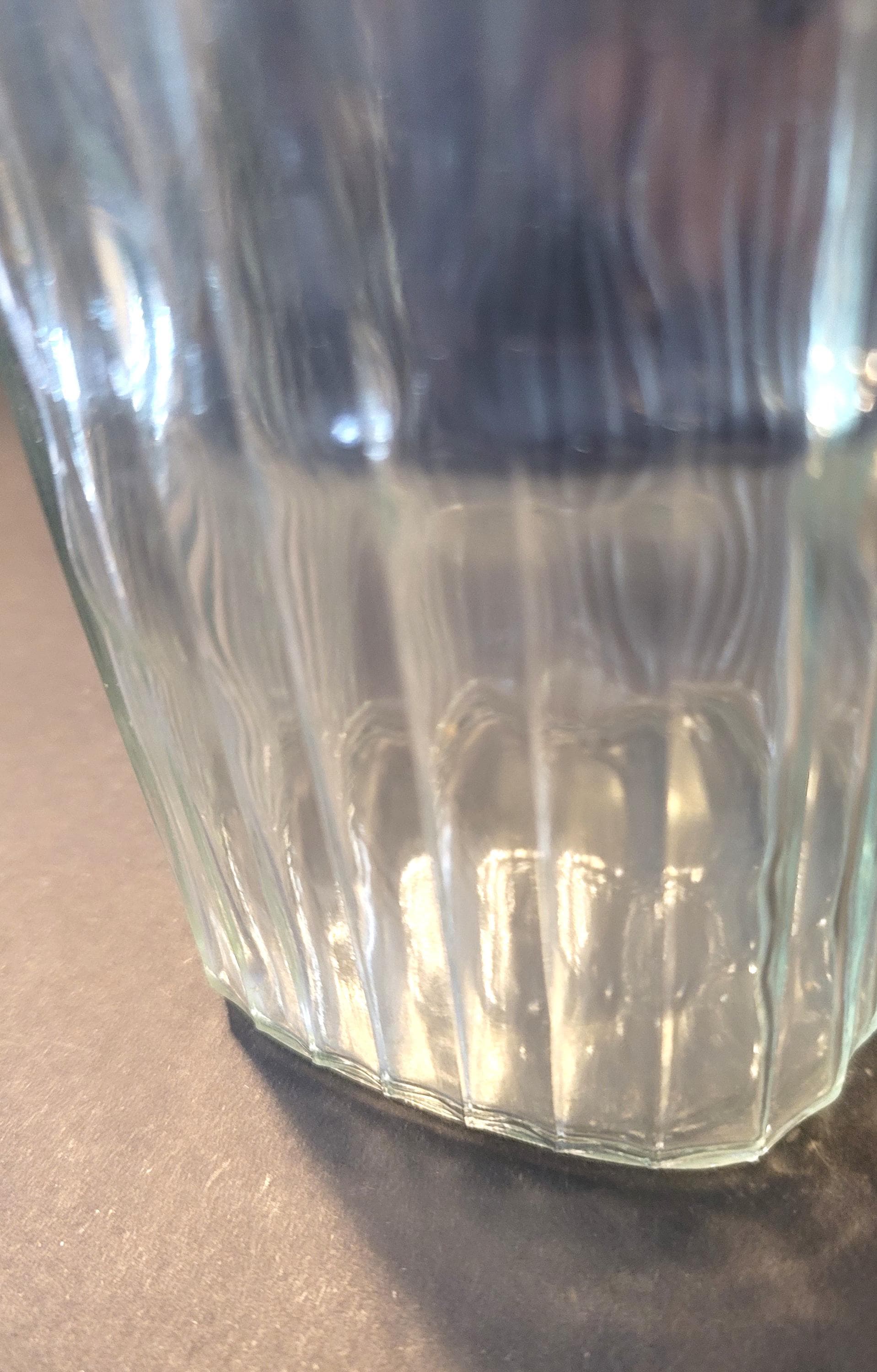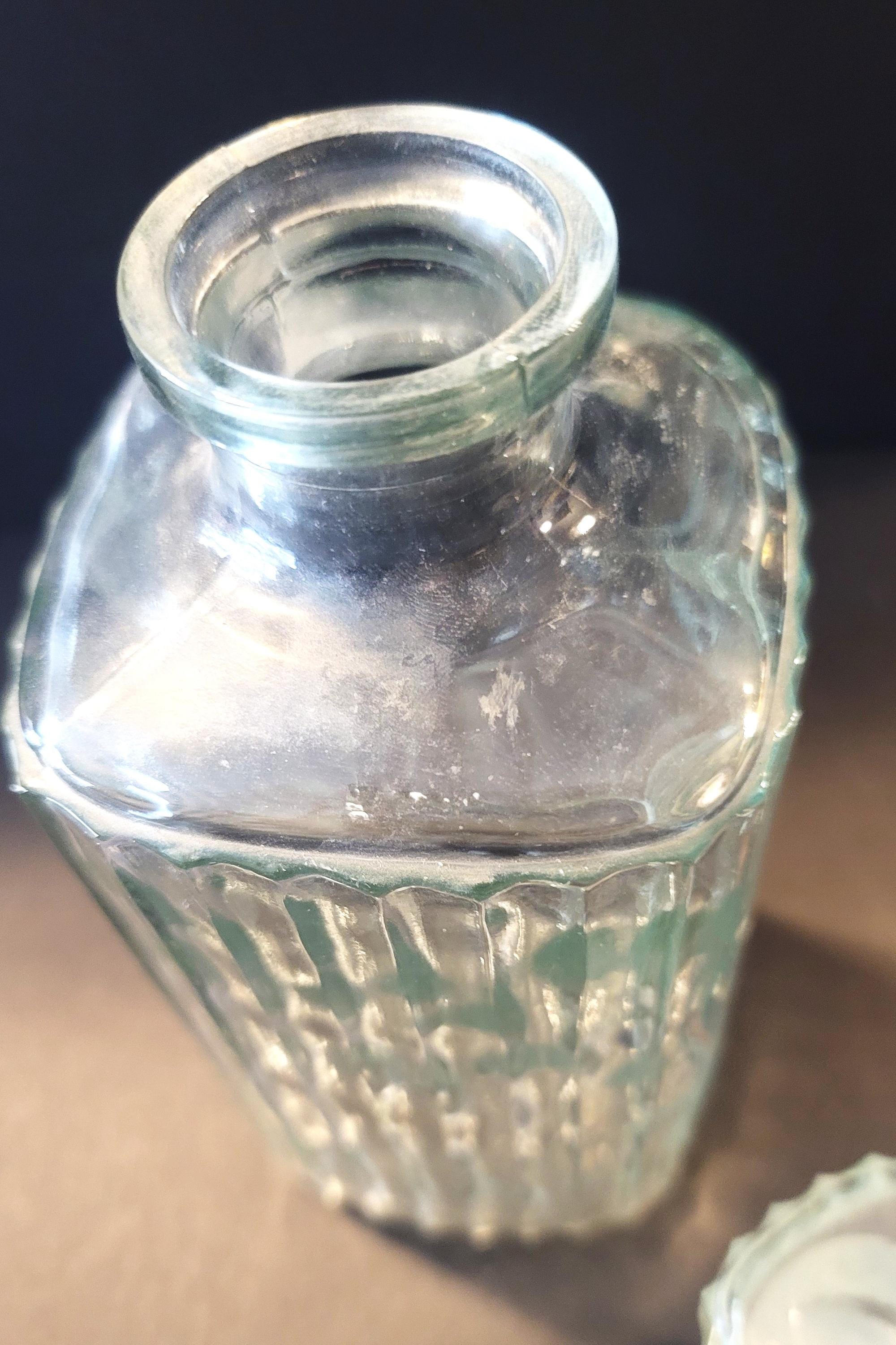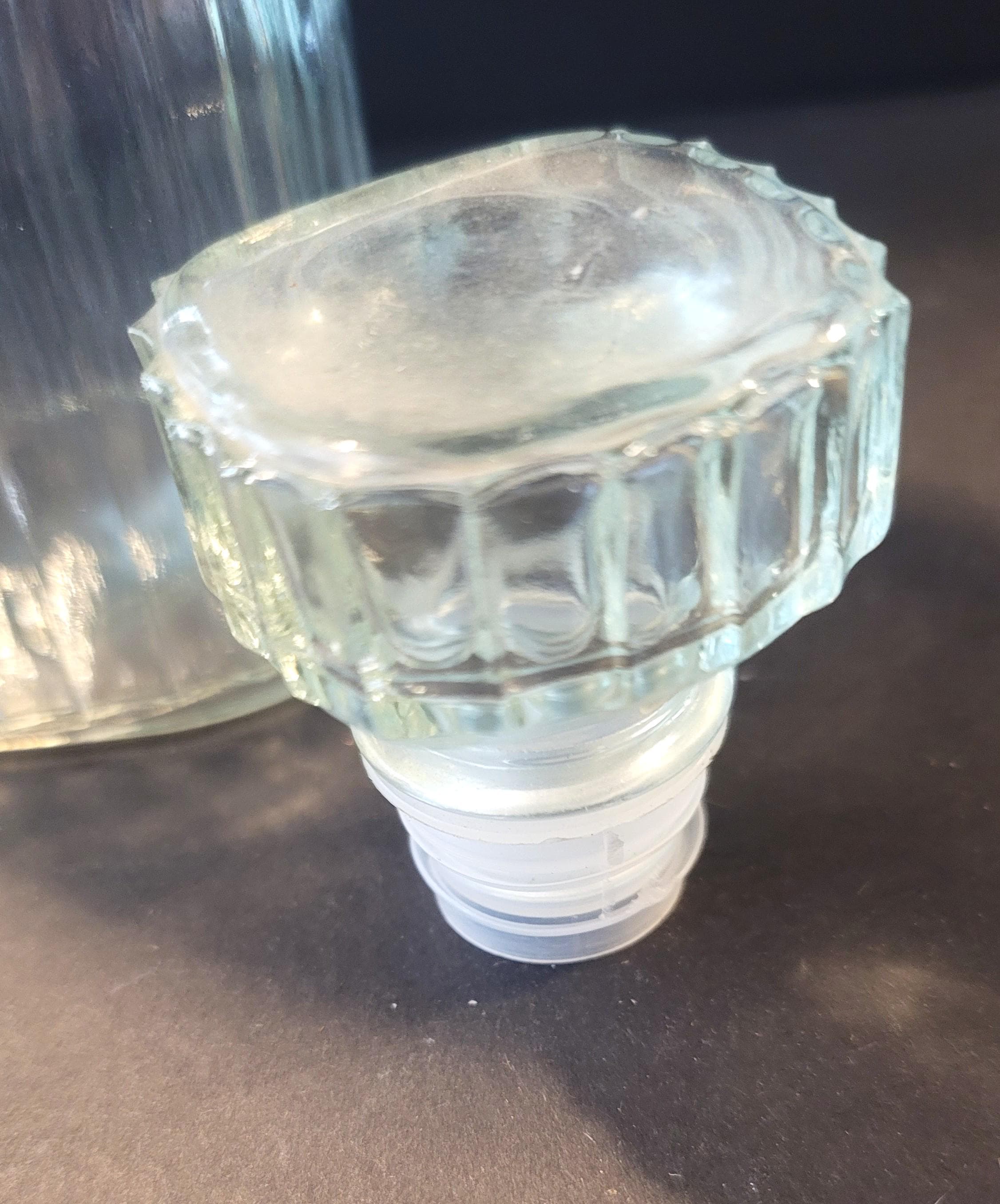 Love this ribbed decanter. It is handblown, you can tell by the horizontal lines in it and bubbles in the glass. It is heavy and unmarked by the maker. The bottle without the stopper is 8" tall and the base measures at 3.5" square. The stopper is 2 5/8" tall. Mid century.