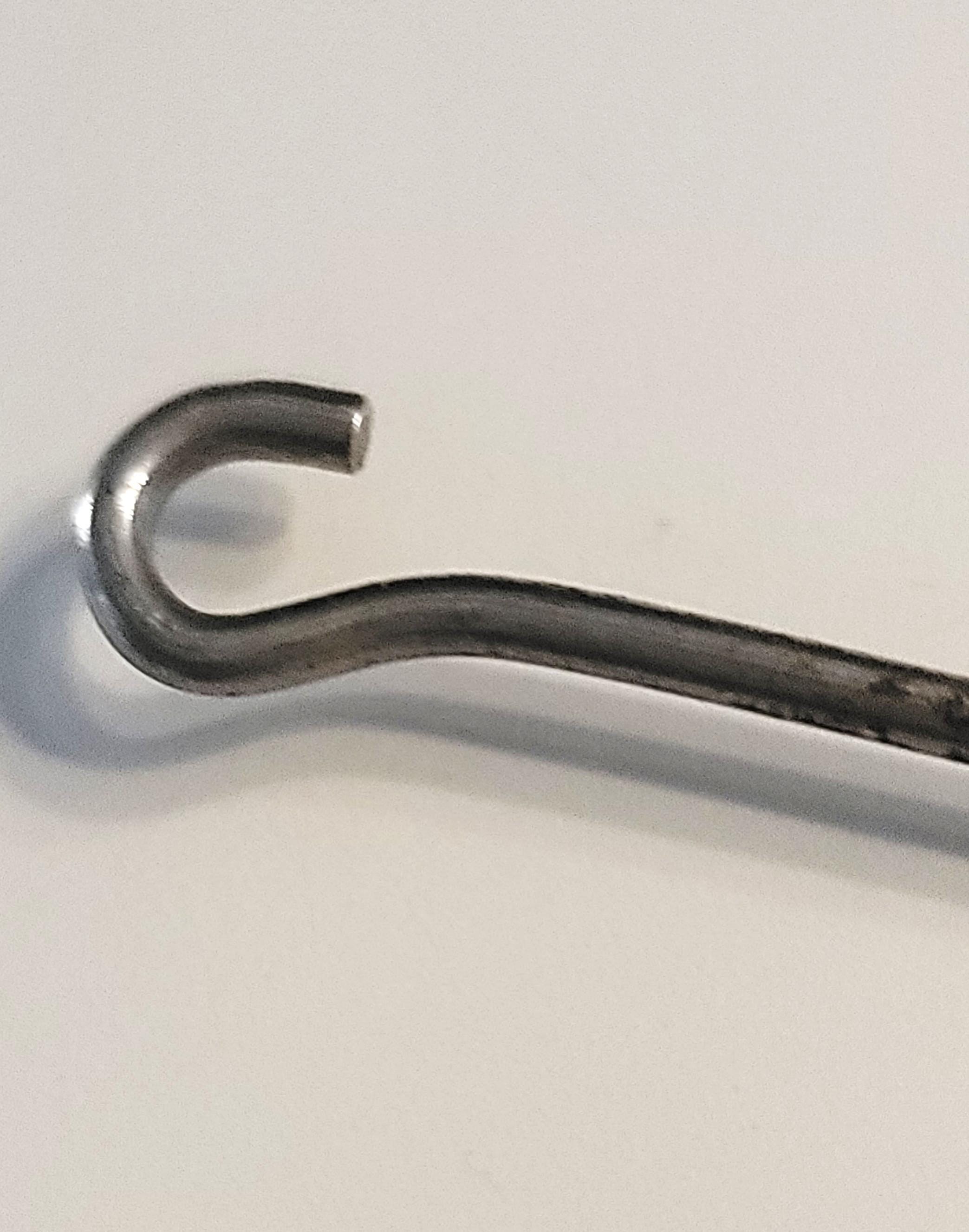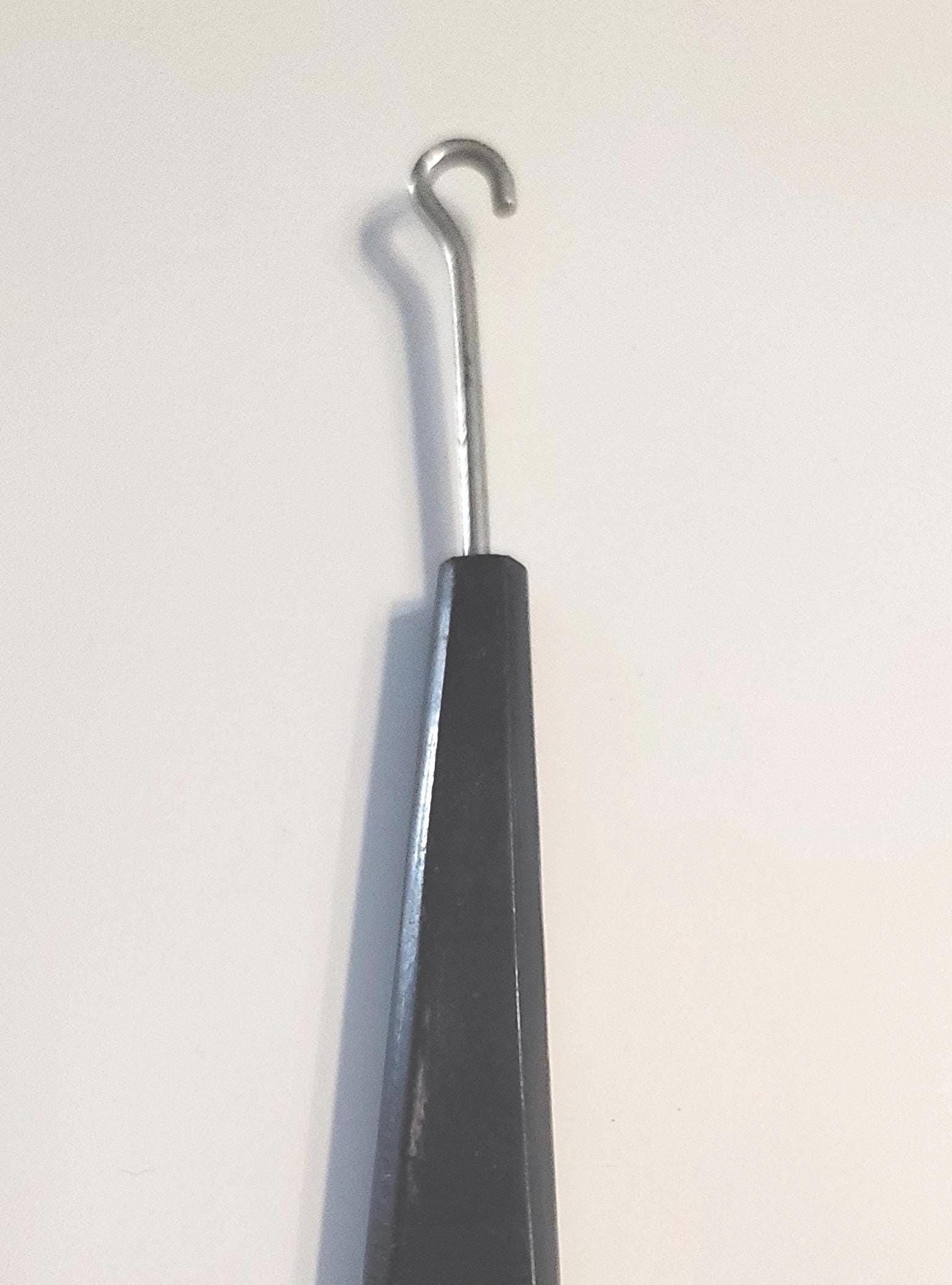 This is an early, cheap version of a Victorian shoe buttoner. It has no rust, has a black handle that isn't Bakelite but a similar plastic. Very hard. It is 4.25" long in total, the handle 2 5/8" and the hook, 1 5/8". Sorry about the thumbnail, Etsy's thumbnail editor doesn't seem to be working.