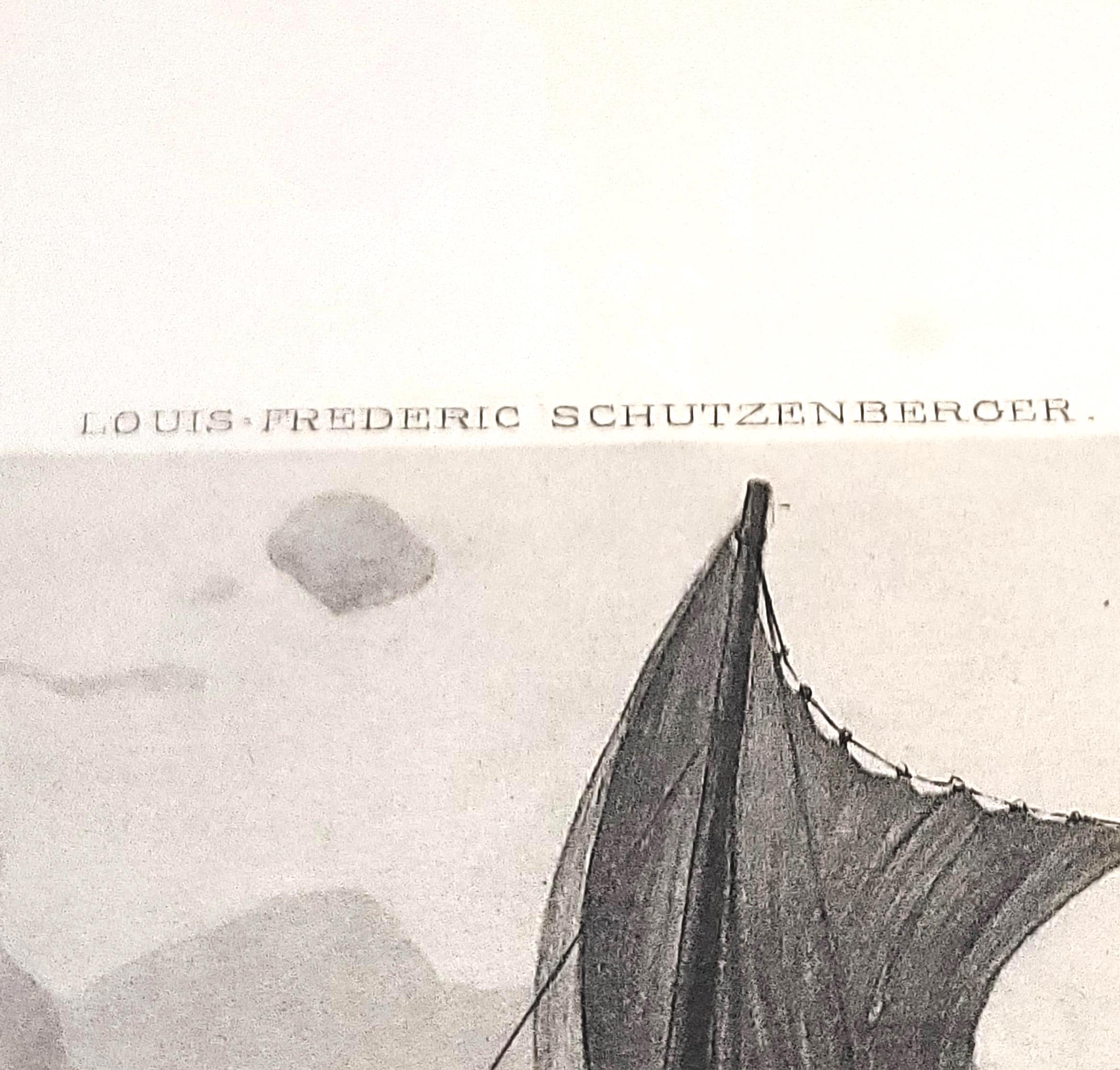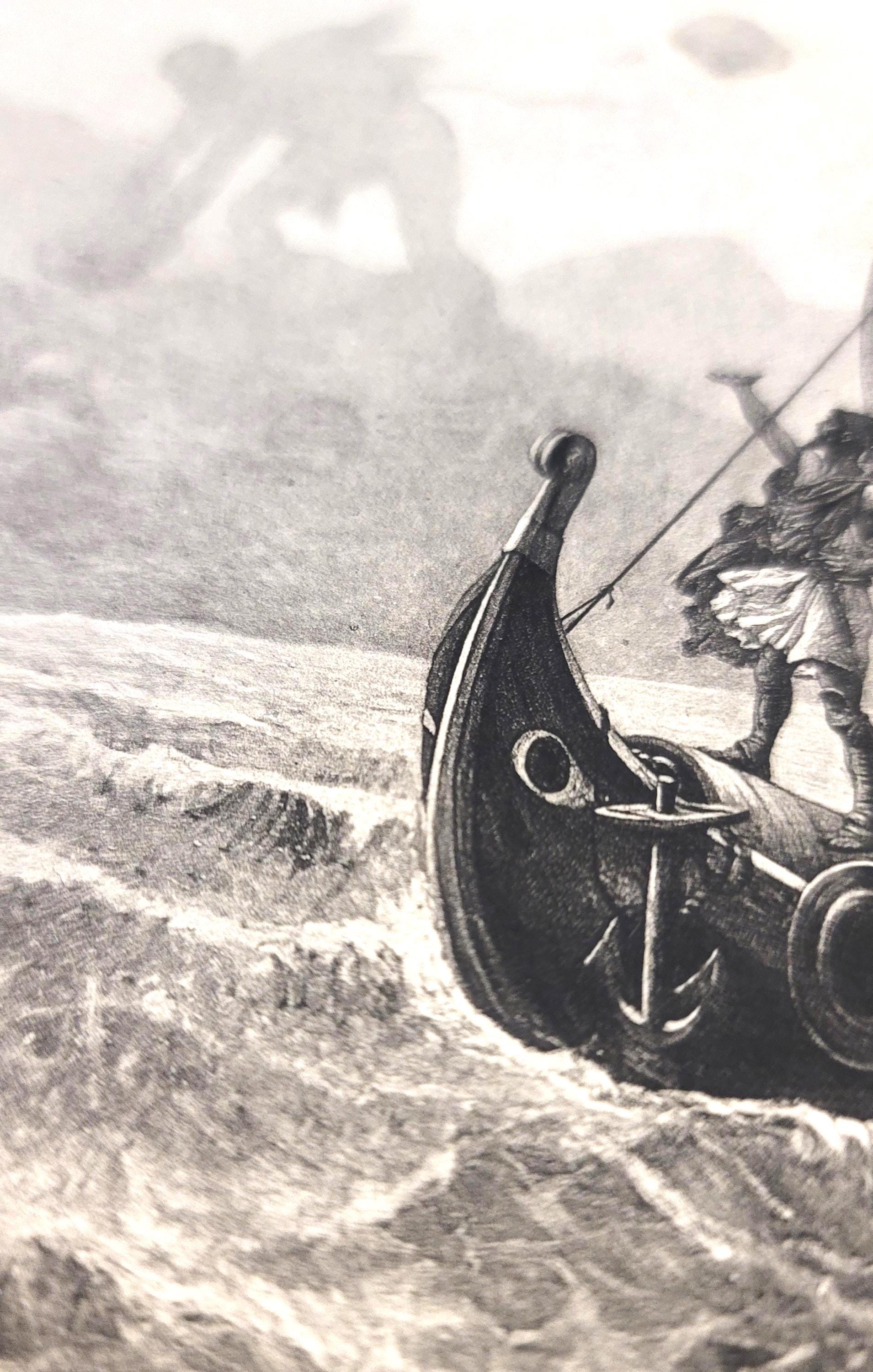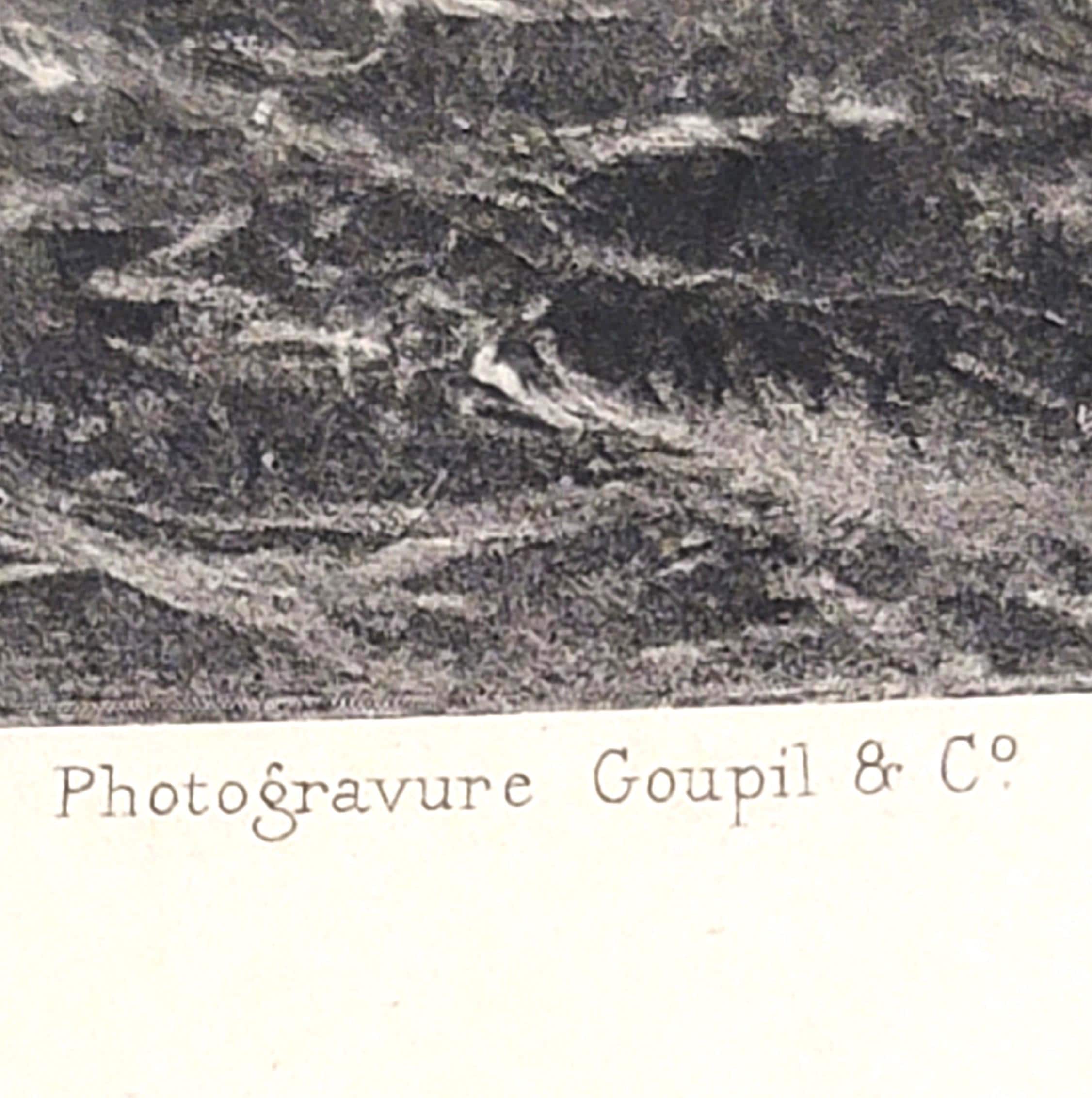 This is a photogravure print from the original by Louis Frederic Schutzenberger in 1894. It features the huge Cyclops in the foggy shore throwing boulders at Ulysee's boat. It is a page from an 1890s historical collection book Like "Great Men and Famous Women".The pages is 11.5 x 9" and the edges are slightly worn with one side having holes where the binding was and one side have a small torn edge. The inside picture is 7 5/8 x 4 3/4".. Would be really great matted and framed.