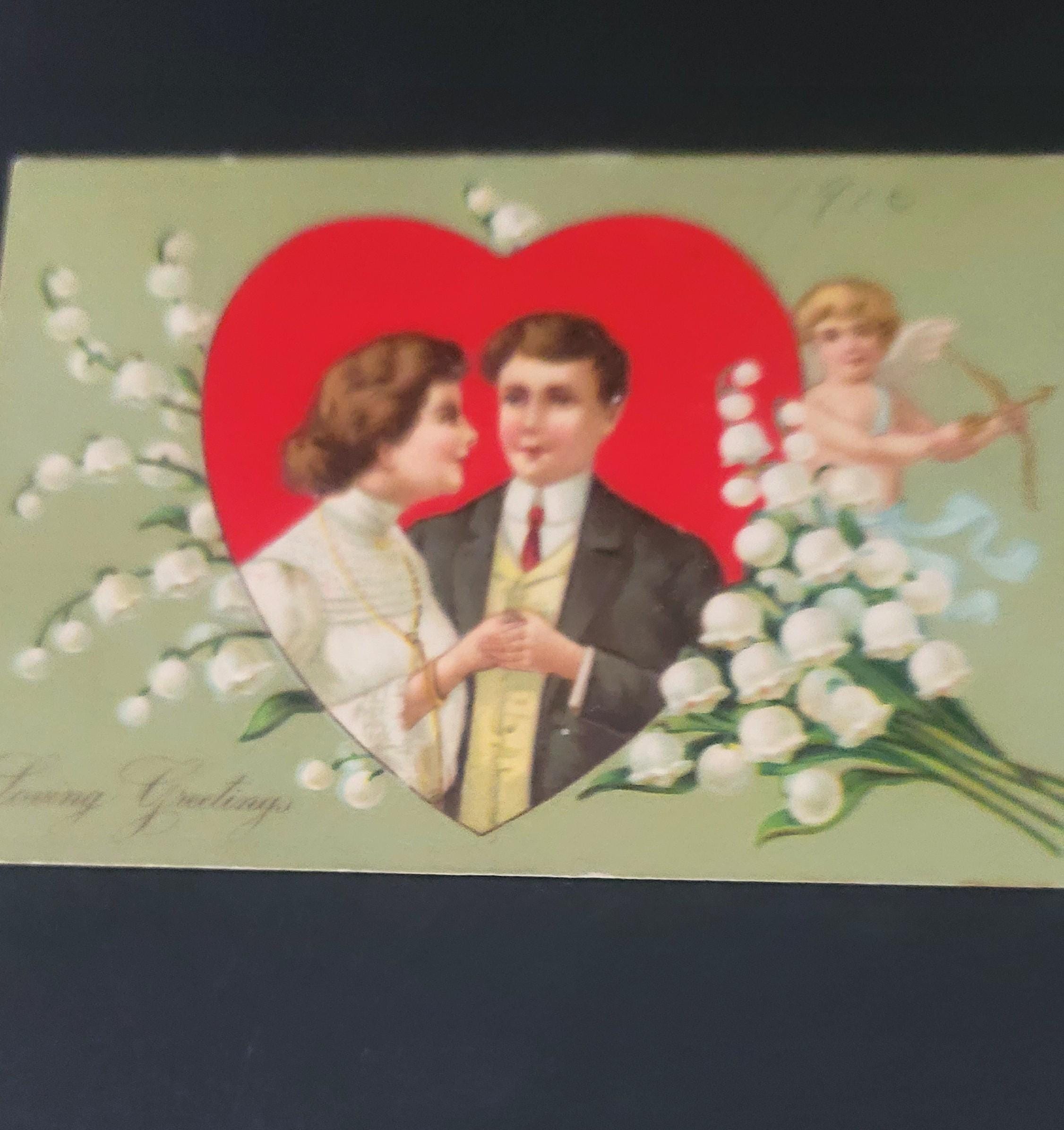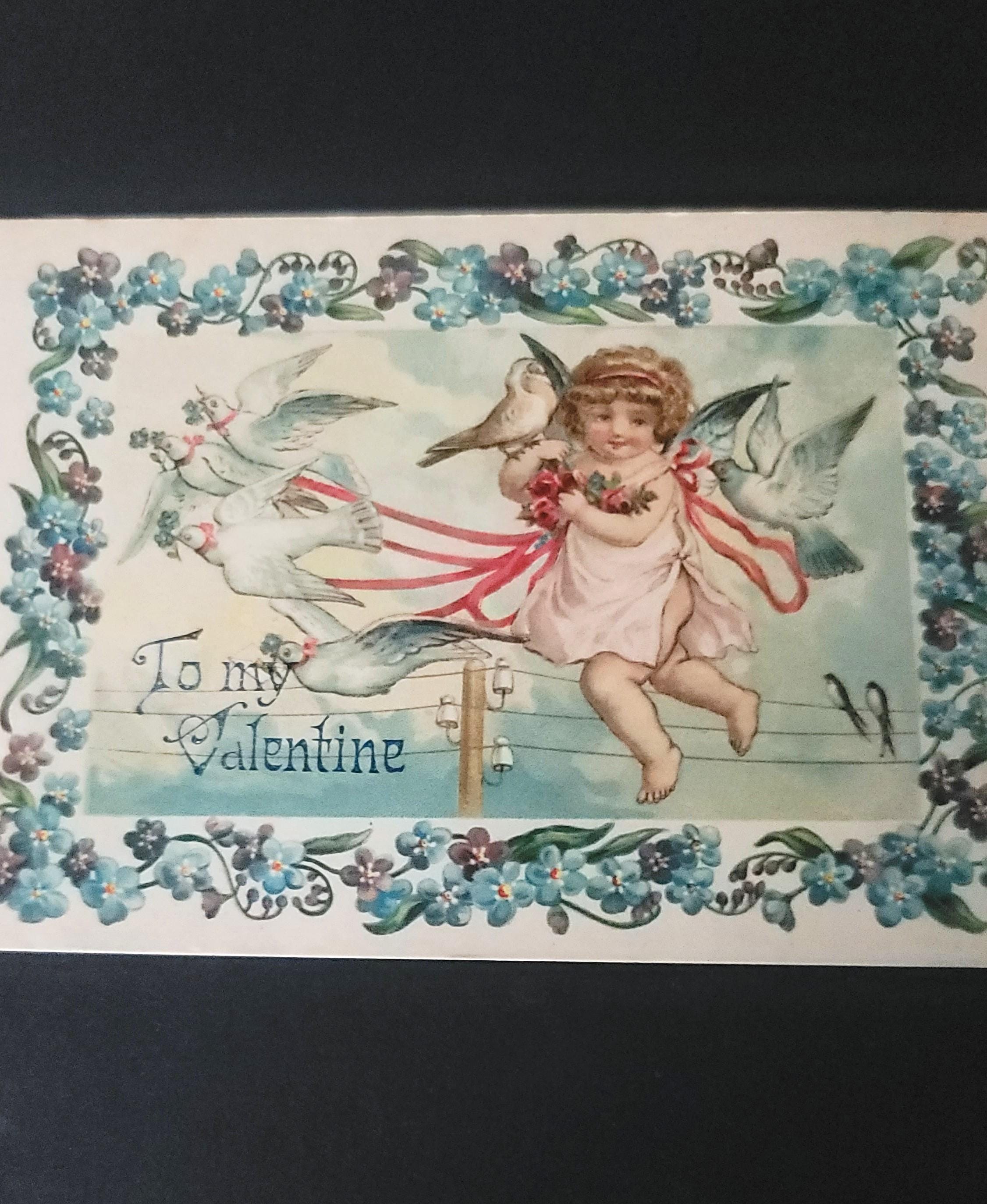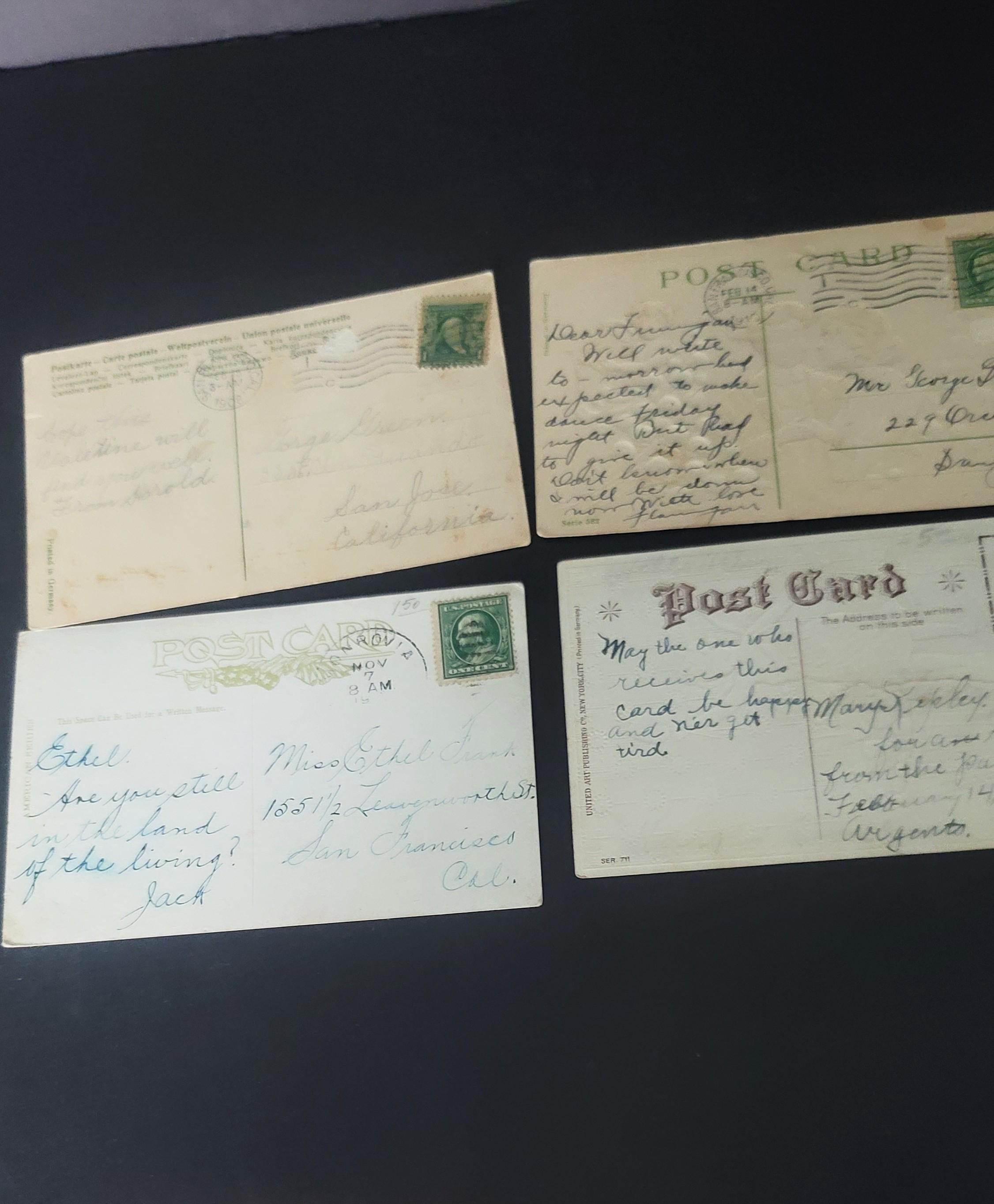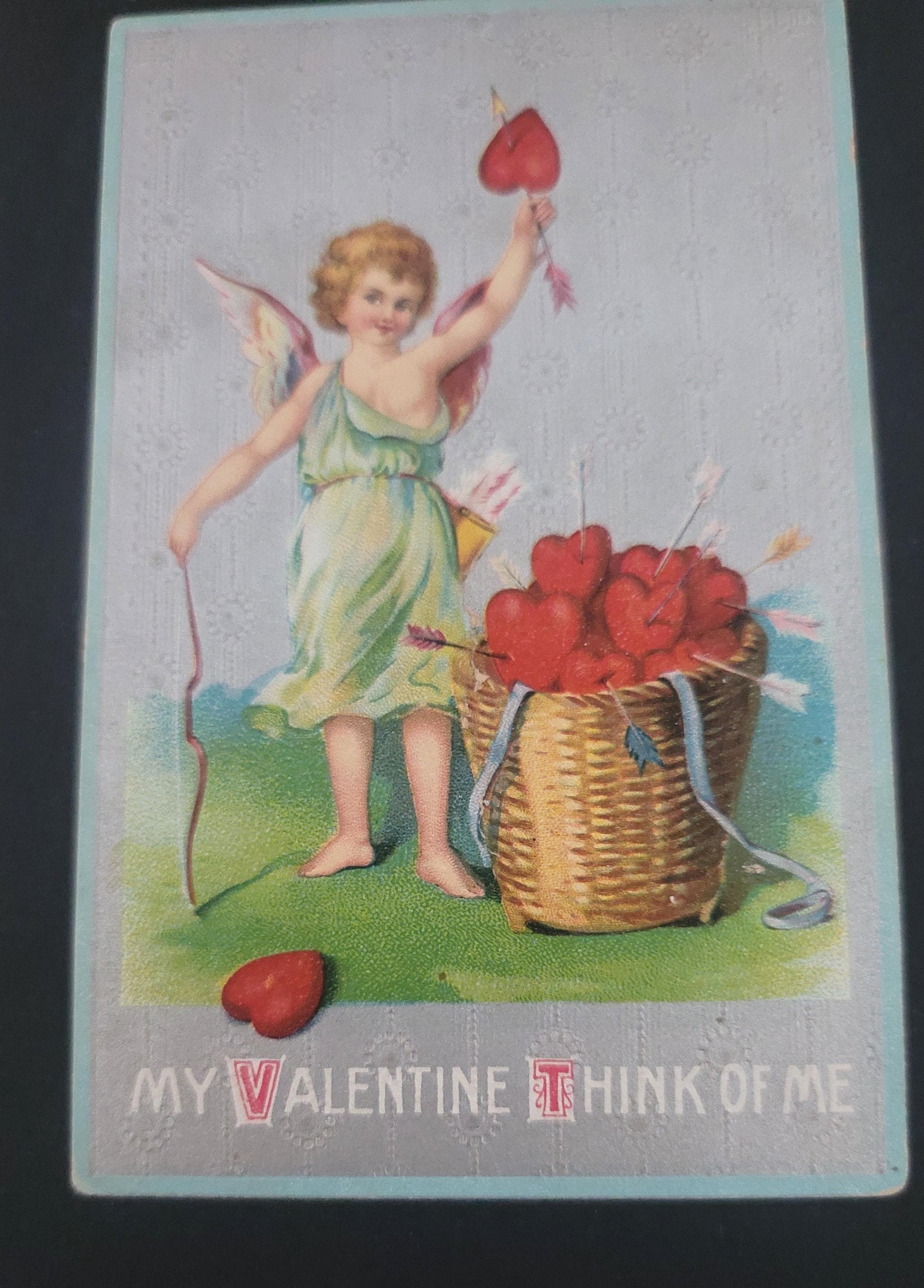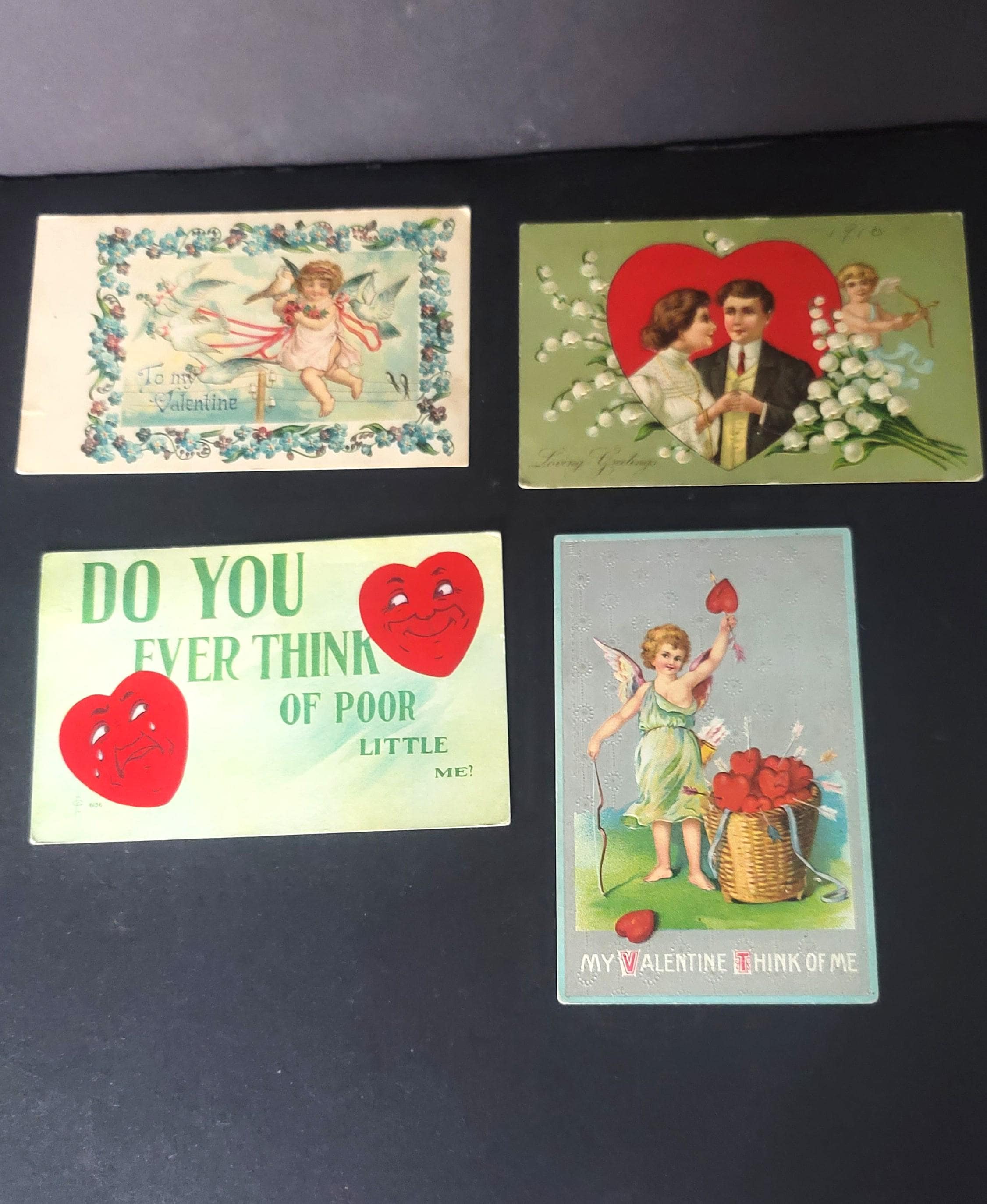 Here are 4 lovely Valentines, the oldest is the blue cherub one at 1908, the newest is the cherub with the basket of hearts at 1914. these have all been used with some sweet notes on the backside. All are approx 5.5 x 3.5". They are in very good used vintage condition.