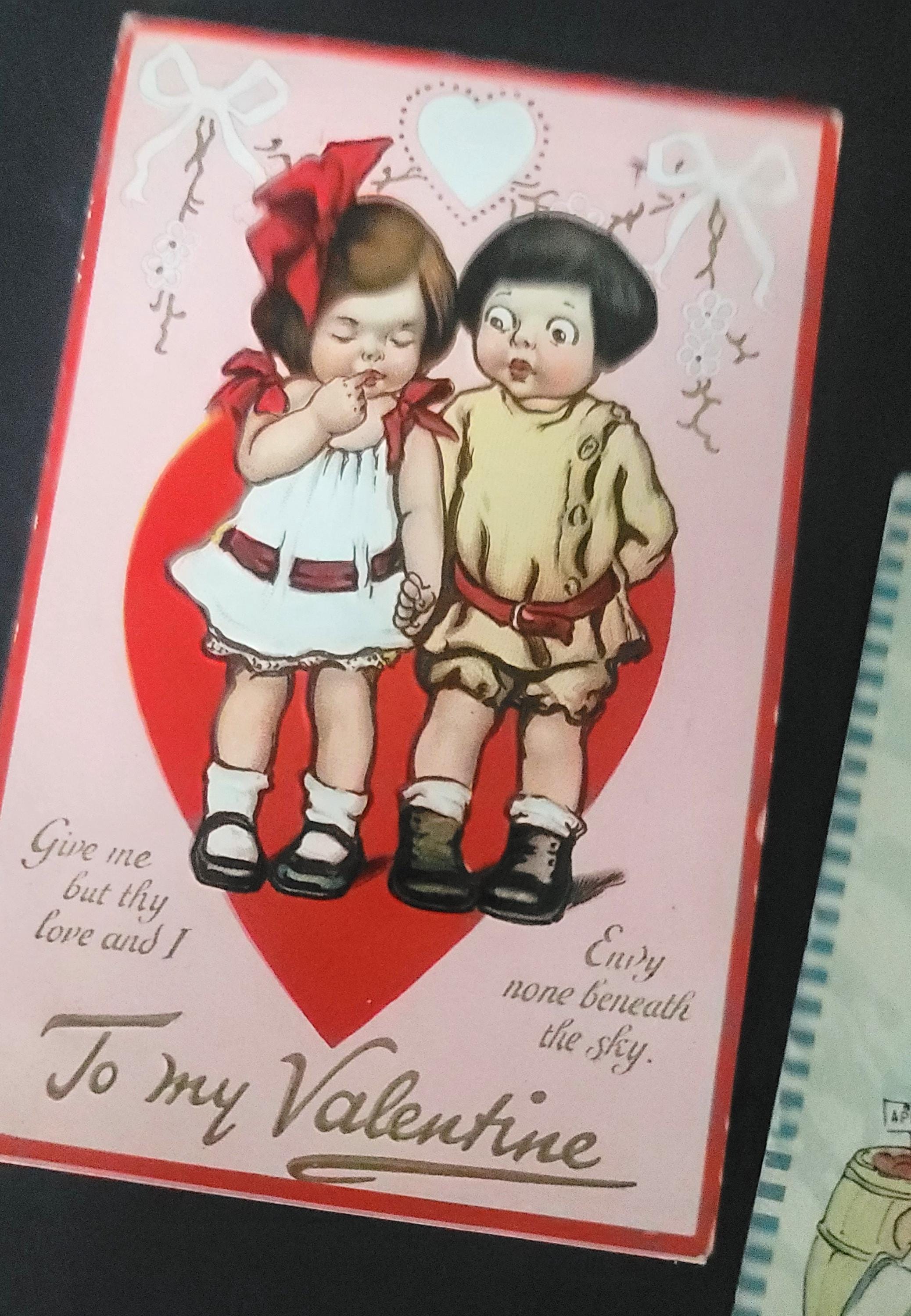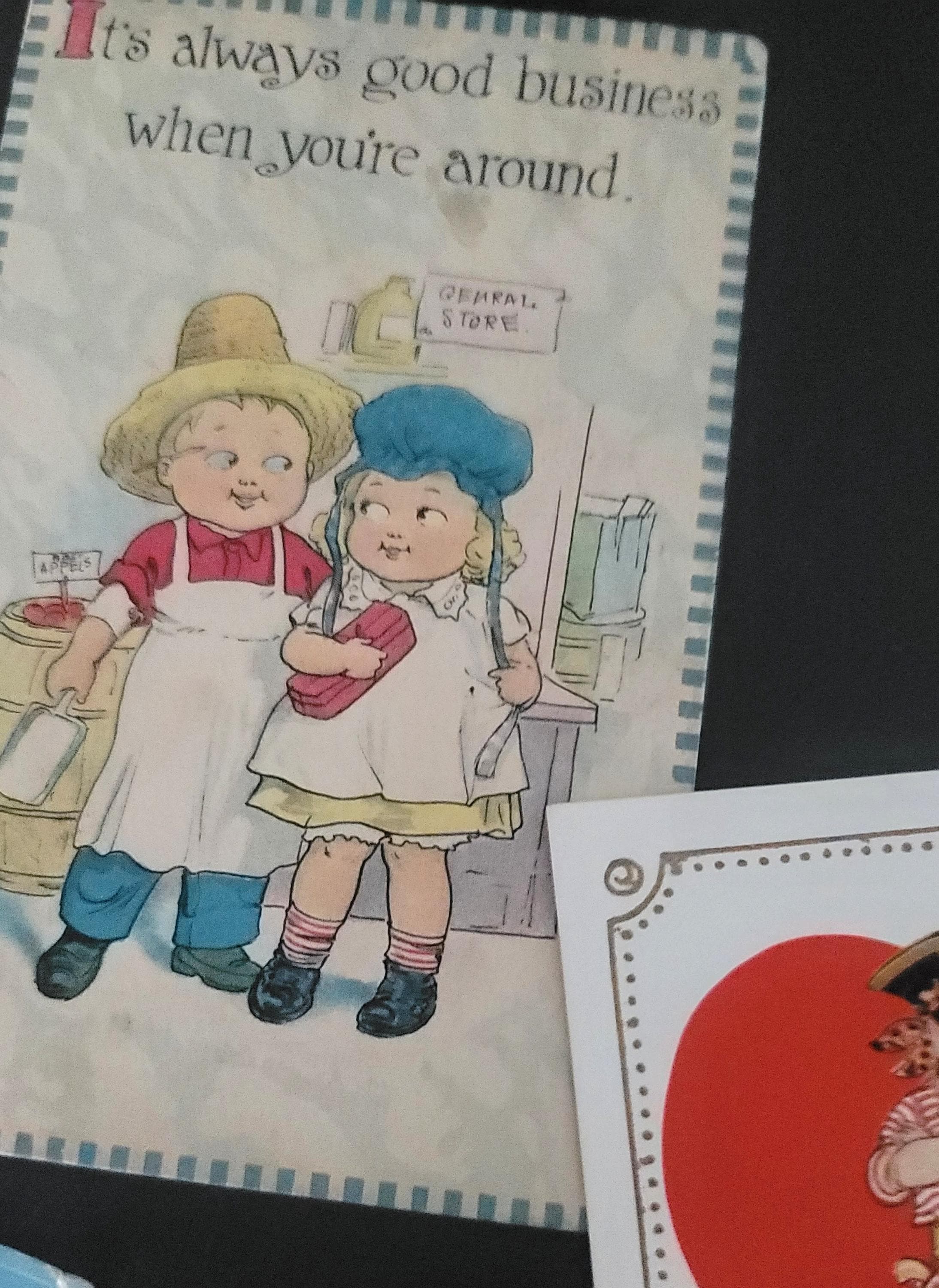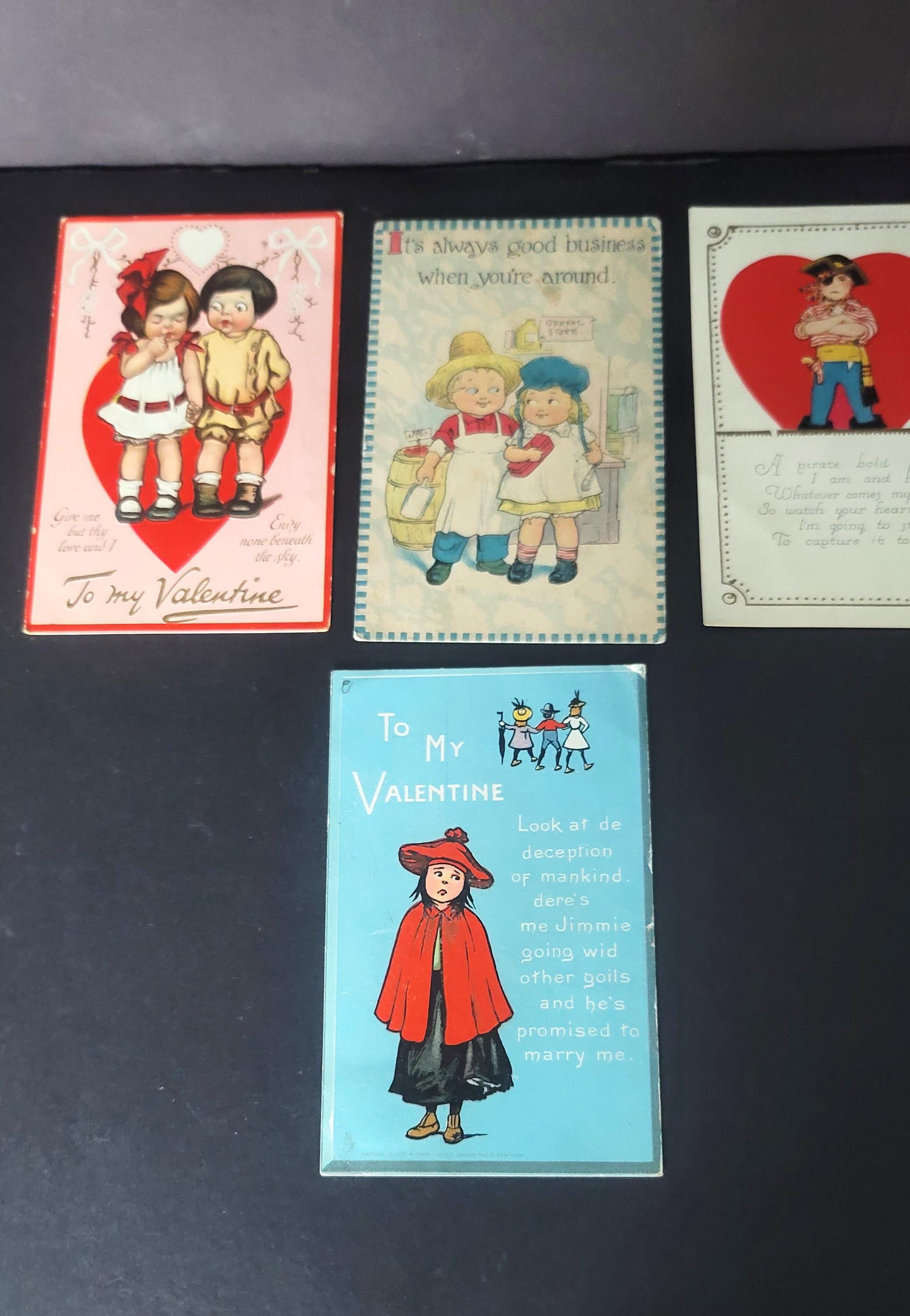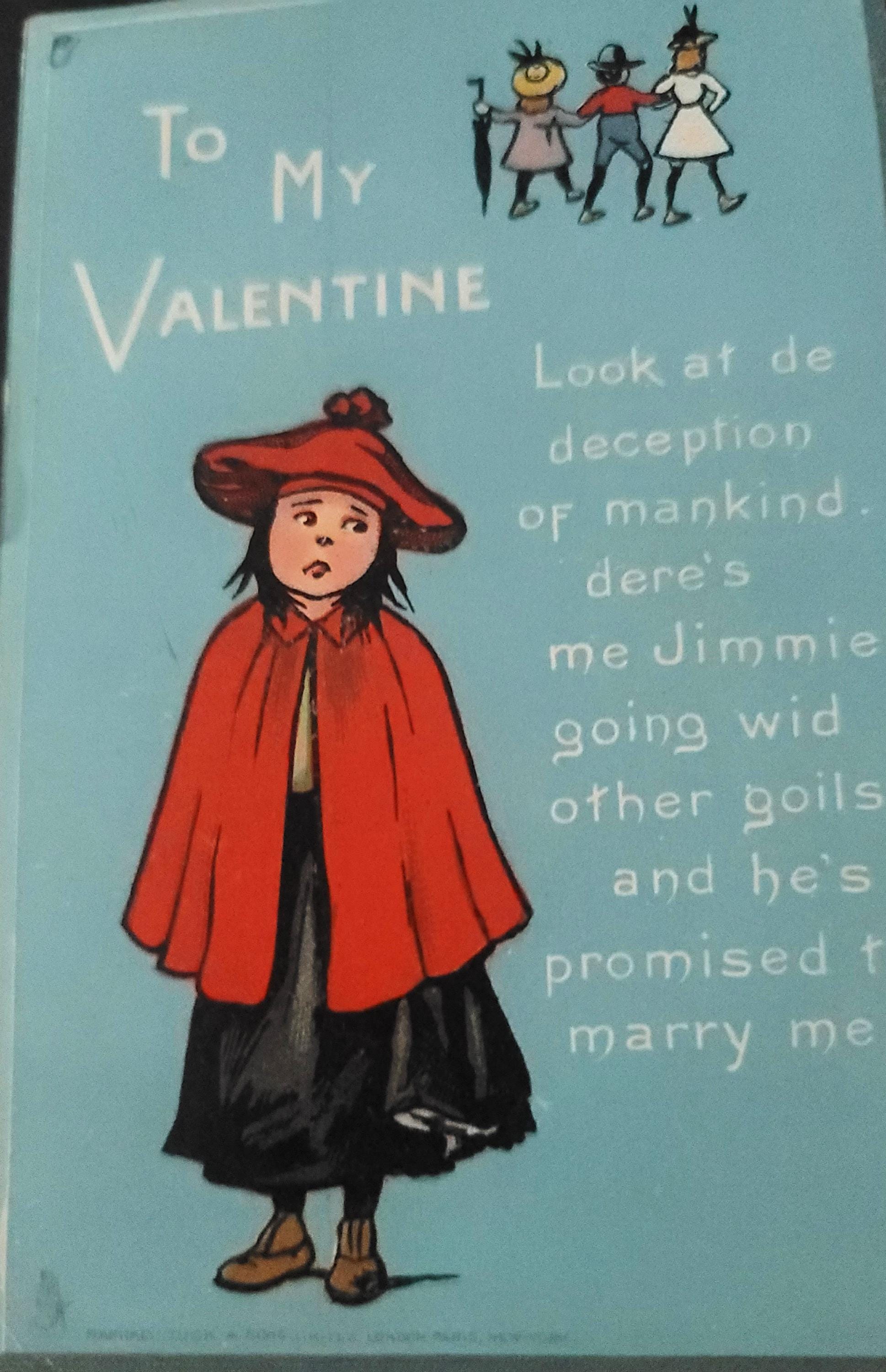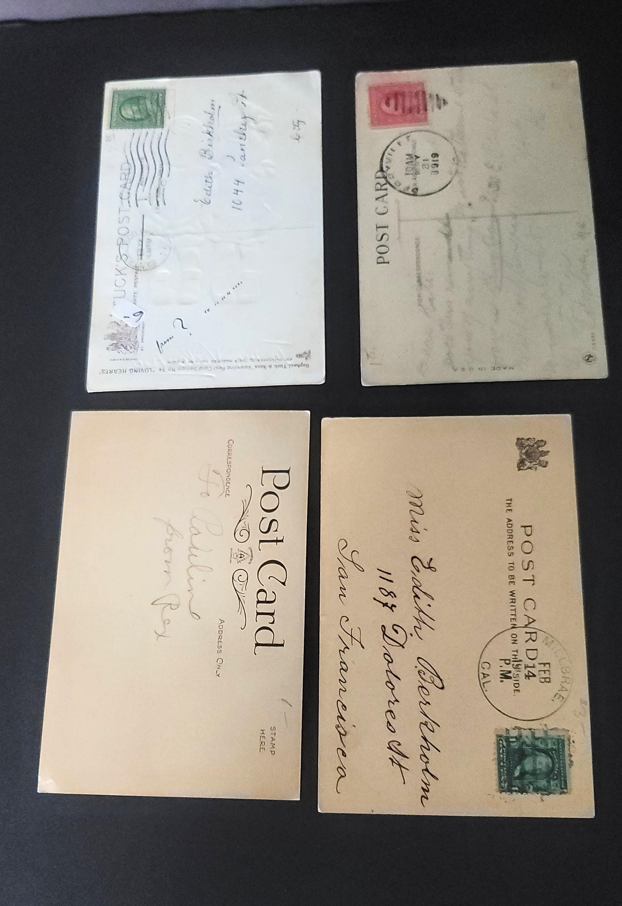 Here are 4 lovely postcards- only 2 have legible postmarks, one is 1910 and the other 1919. They are all approximately 5.5 x 3.5 and all have been used. The one with the red jacket and beret is interesting- it says- "Look at de deception of mankind. dere's me Jimmie going wid other goils and he's promised to marry me." poor thing.