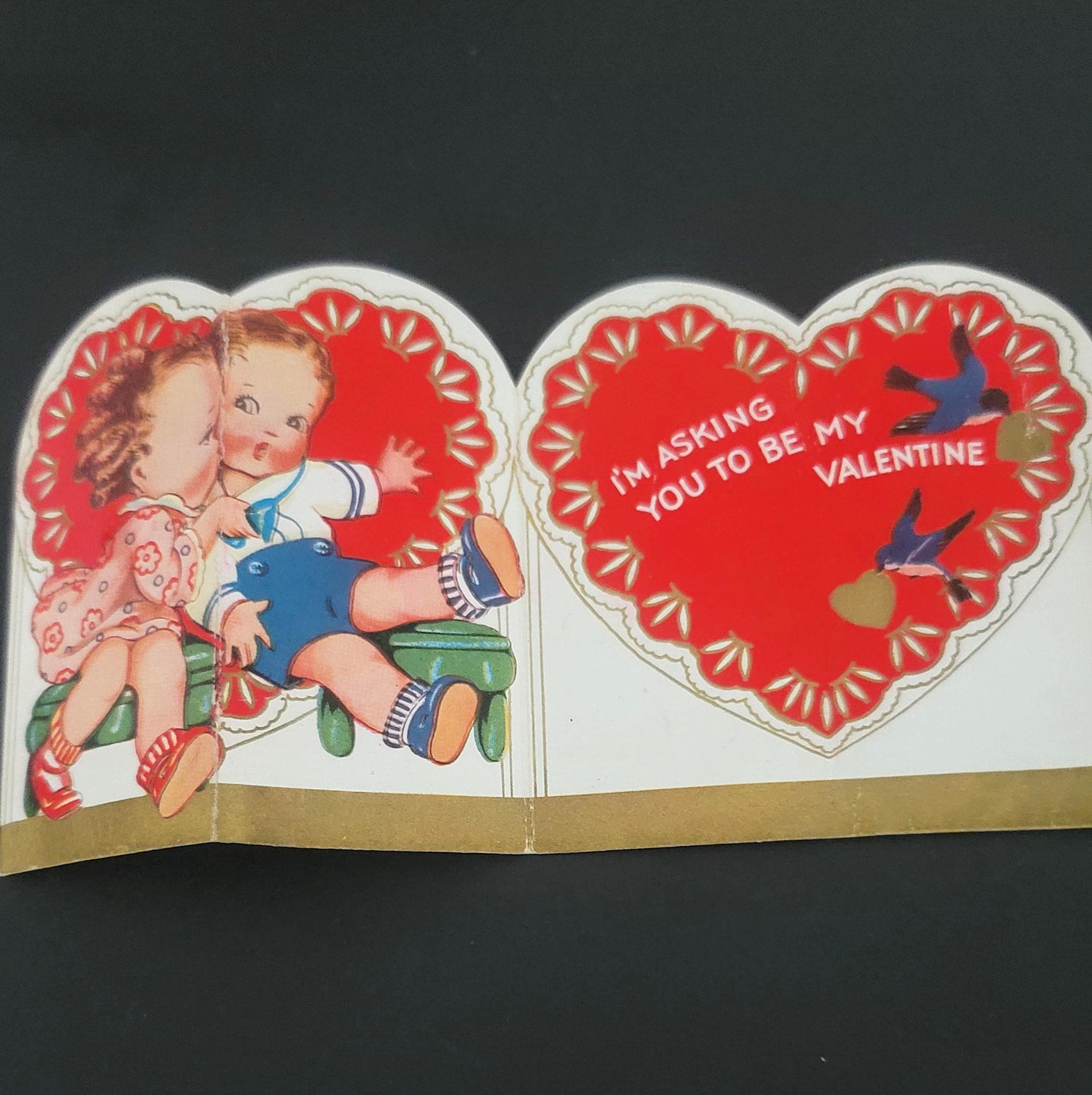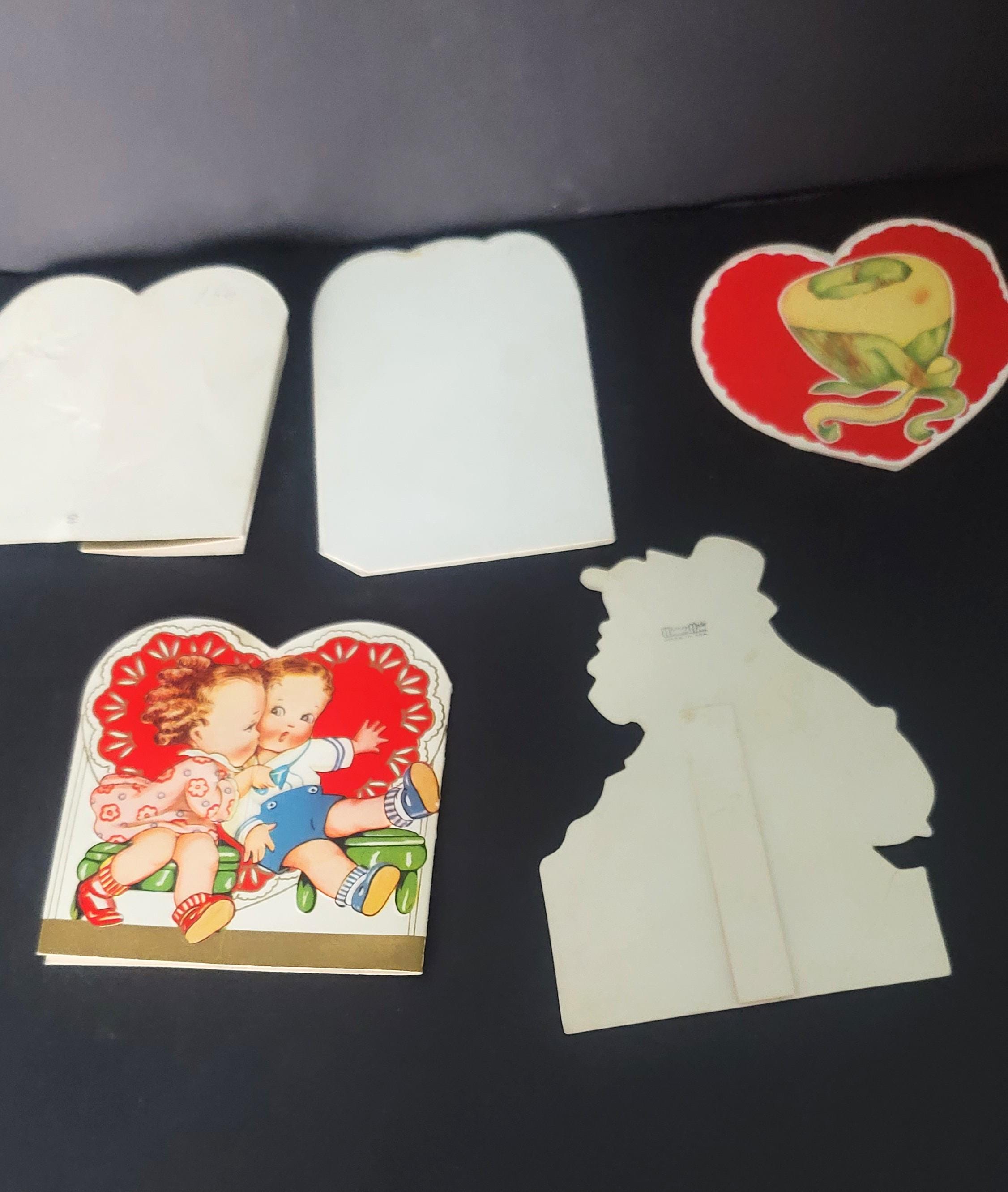 Here is a set of 5 from around the 30s in very good condition and 4 are unused. One has the name Norma written in pencil inside so it's like new. Thay are 3.75" square, give or take. I am not measuring each one of my 80+ valentines but will give you a close number. The skating couple has a stand in back to allow it to stand on a table top.