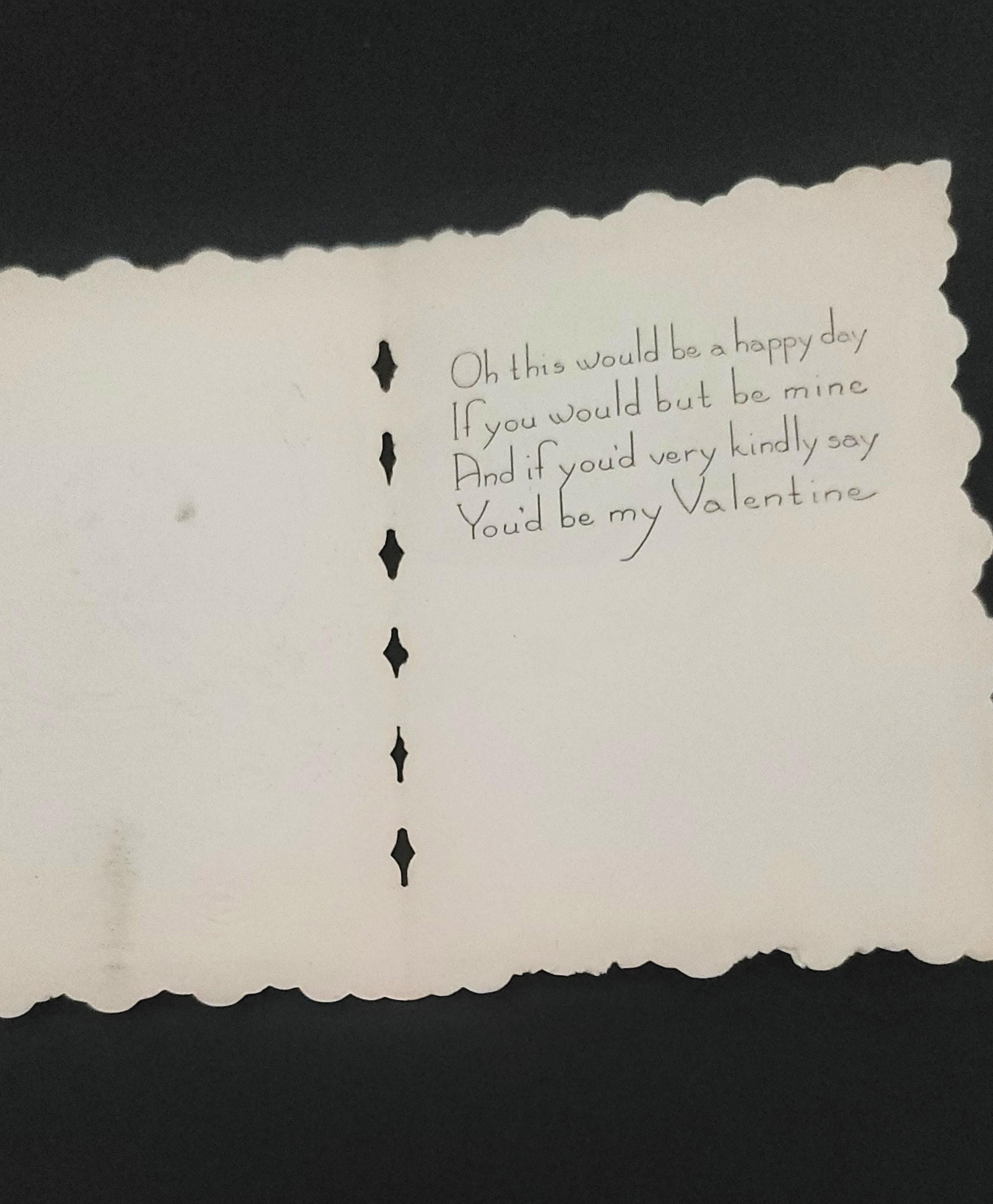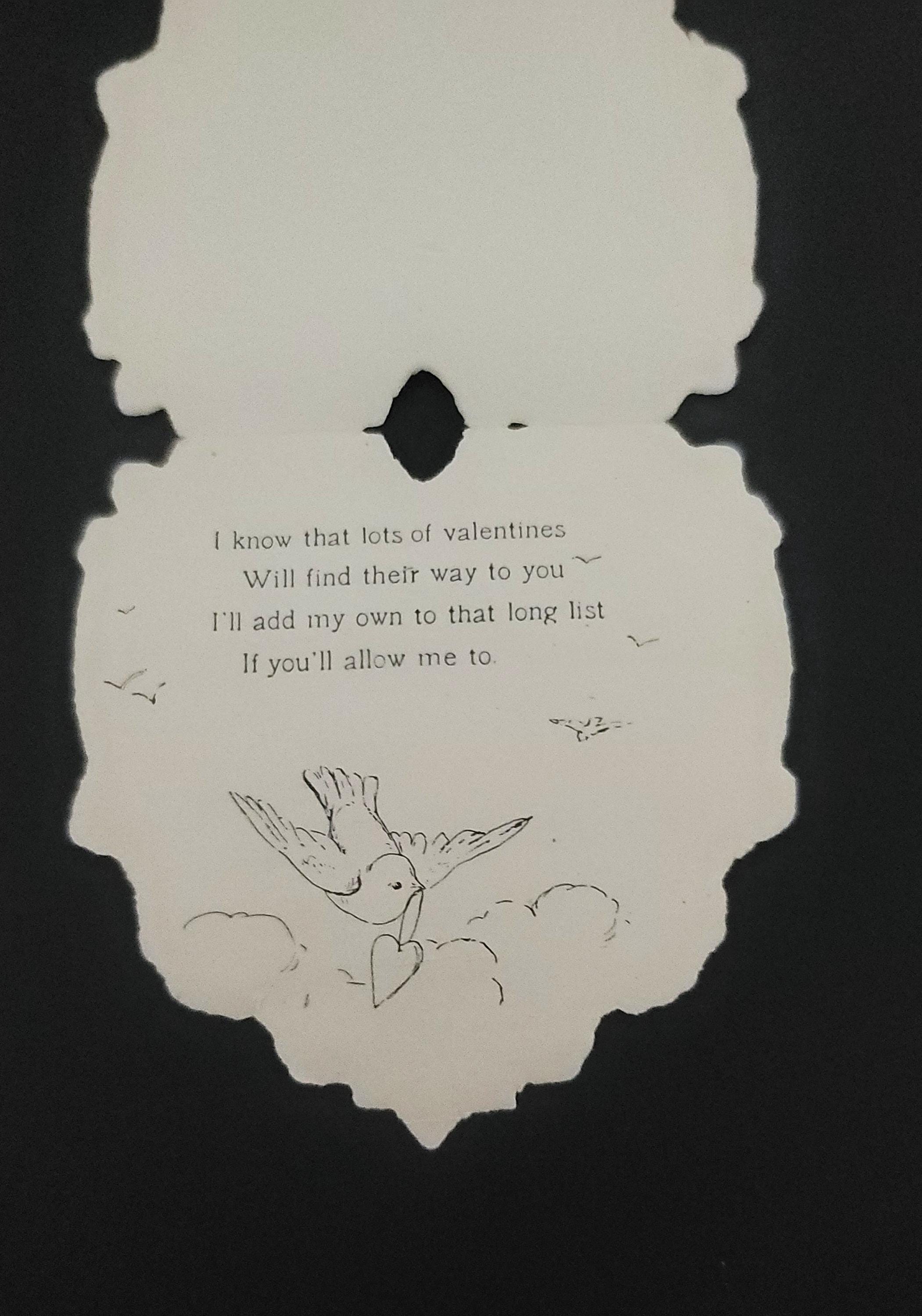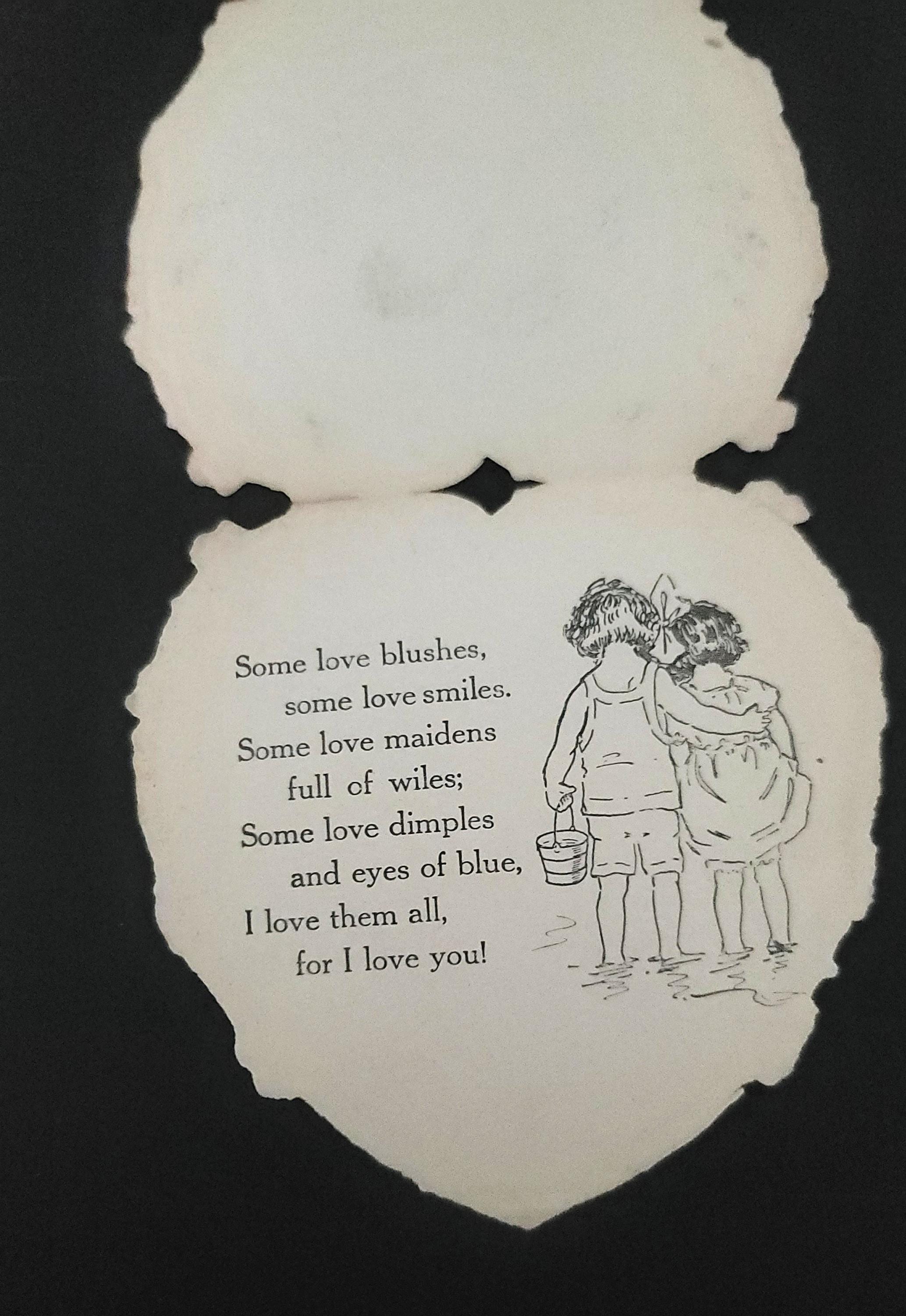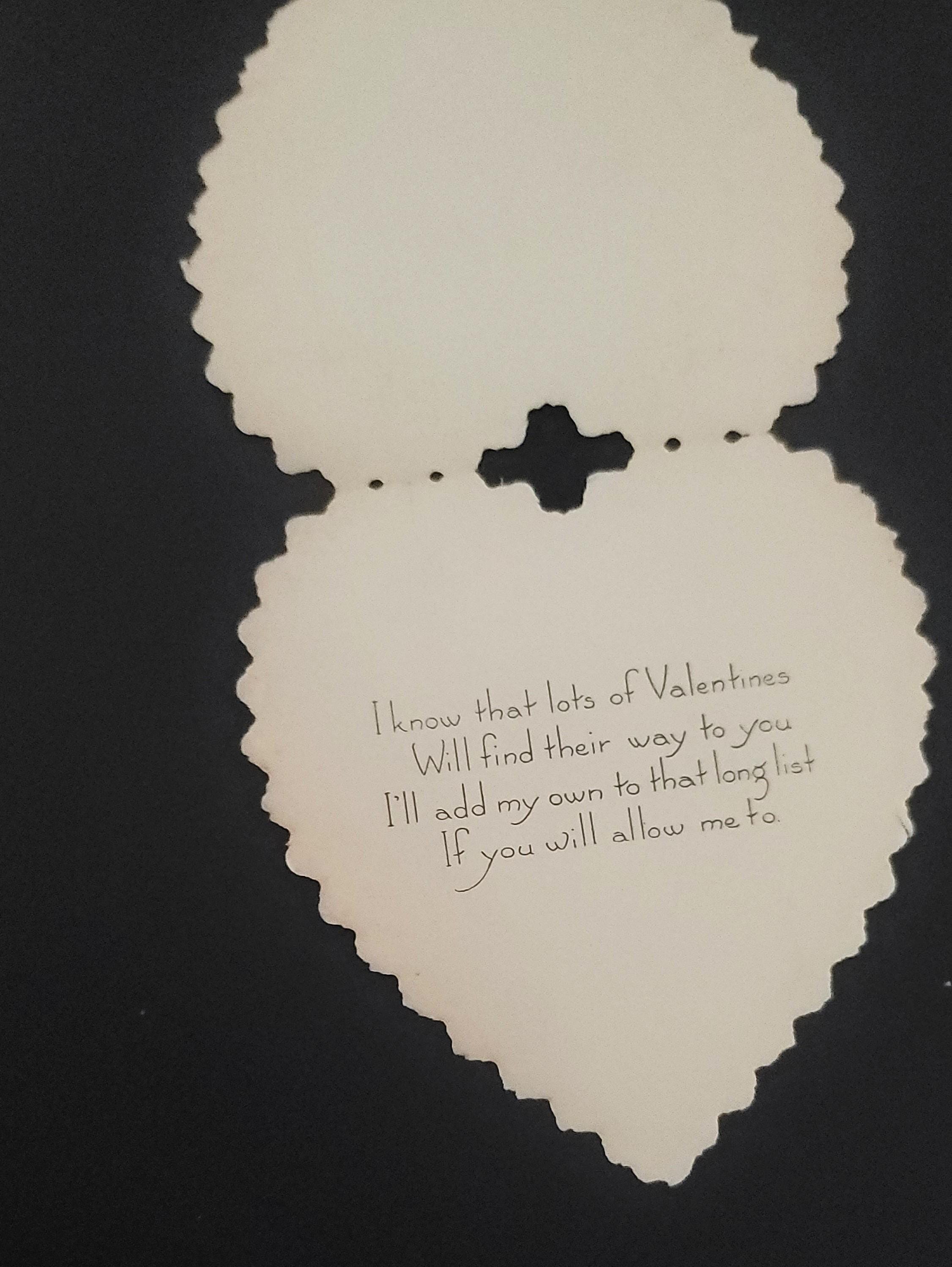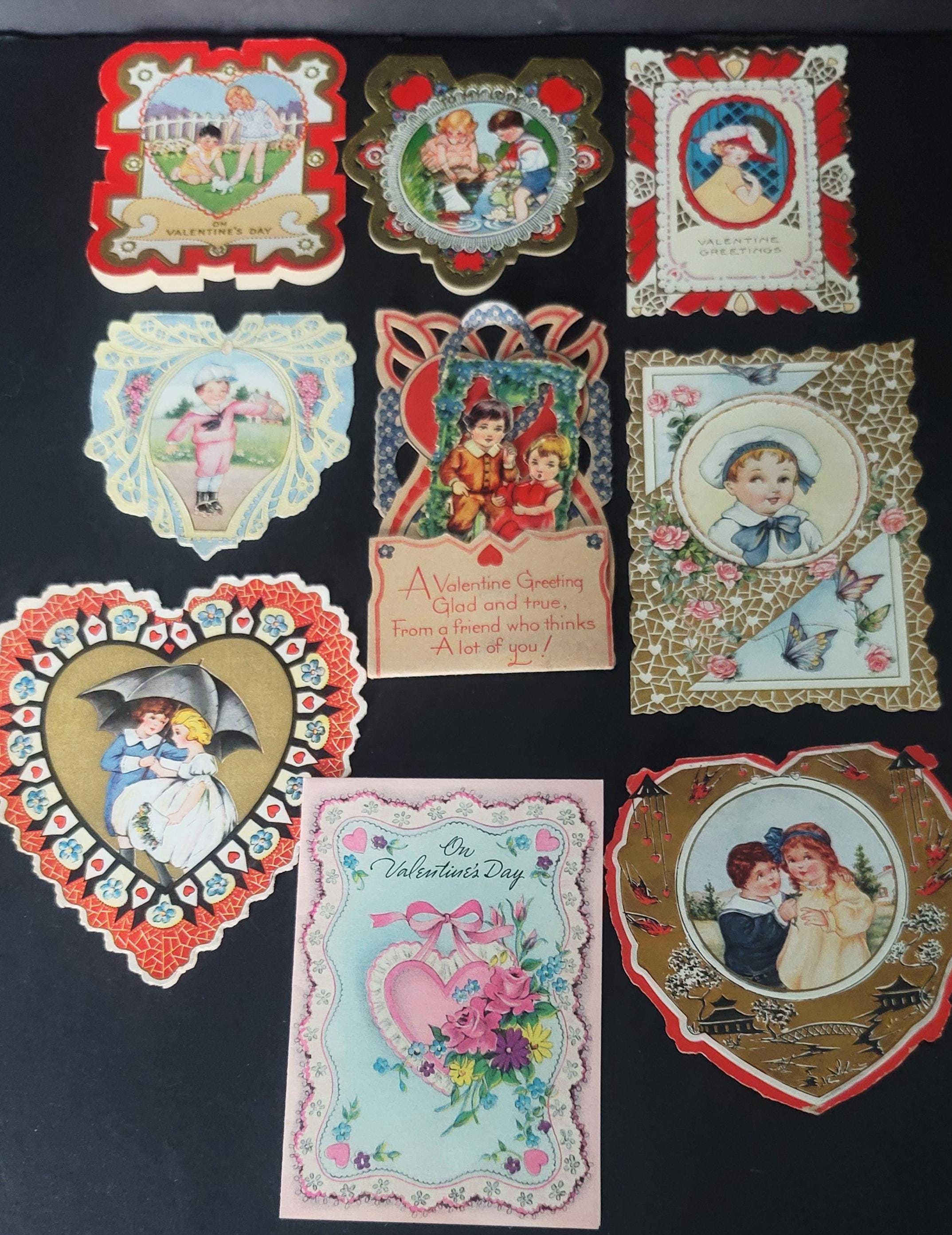 Here is a beautiful set of Valentines from the 1920s or earlier that all open. Four of them have been used (signed). They are in remarkable condition. Some have such sweet little sayings such as "Ive lost my heart around somewhere. Just give me yours and we'll call it square." The largest one is 4.5 x 4.5".