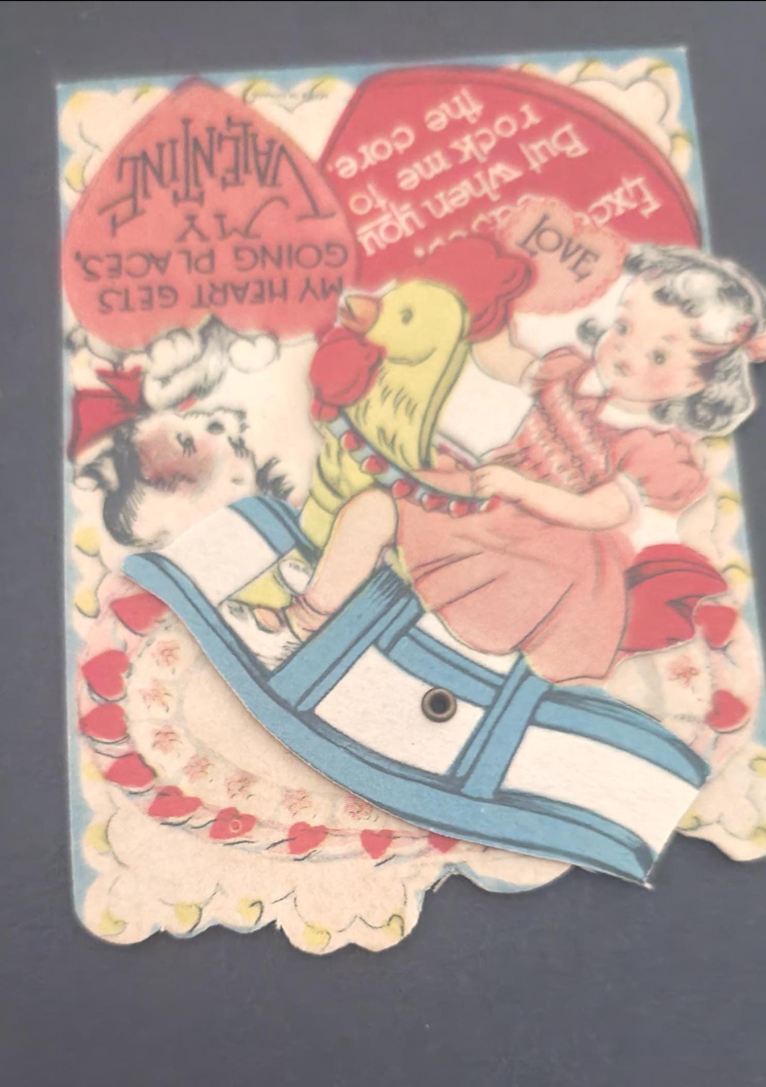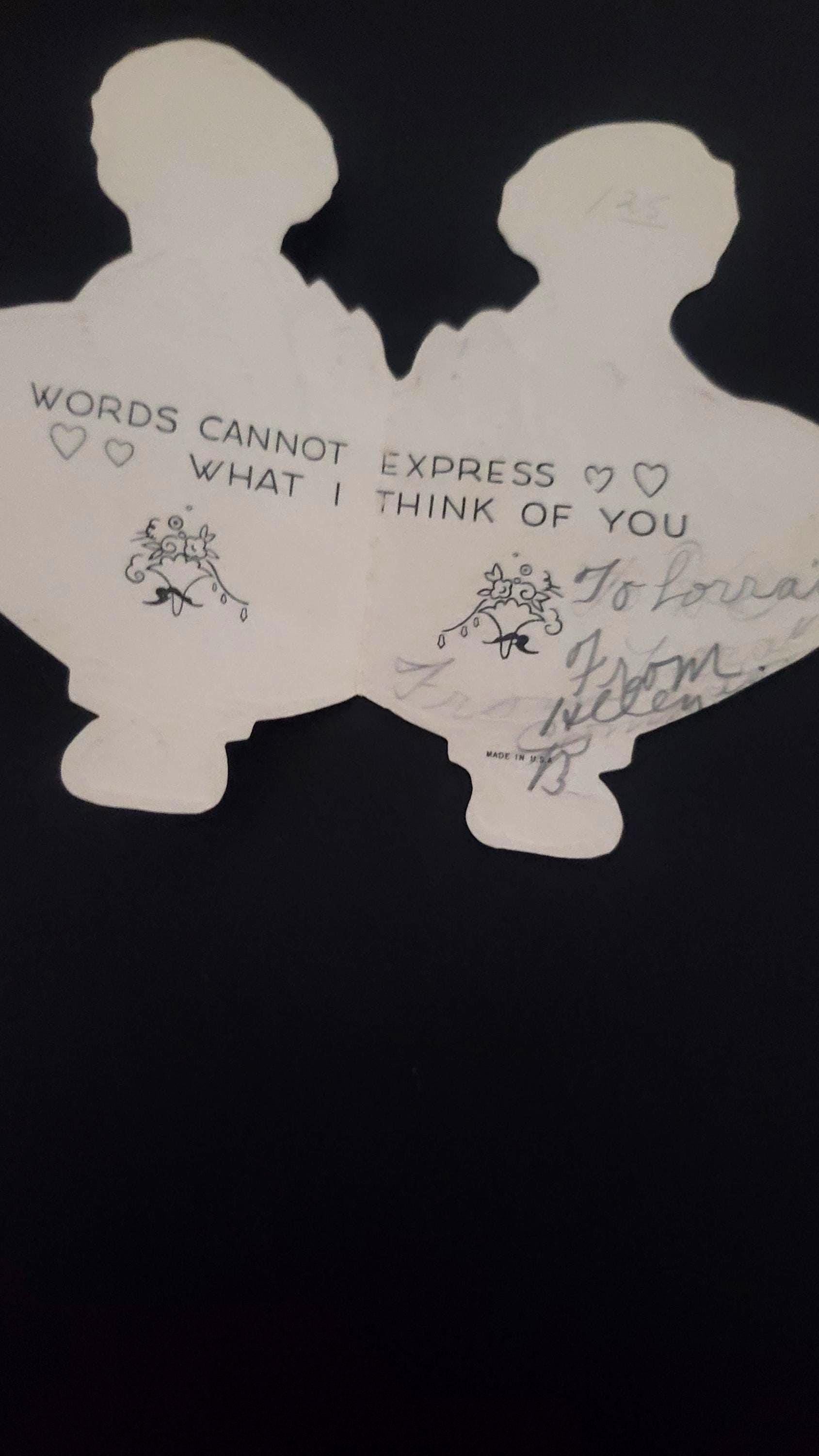 Set of nine including 1 that has a moving piece, 2 that open to an inside and 2 that are made to stand up. All are used but written in in pencil, one in pen. One appears to have been in a scrapbook. In good condition.