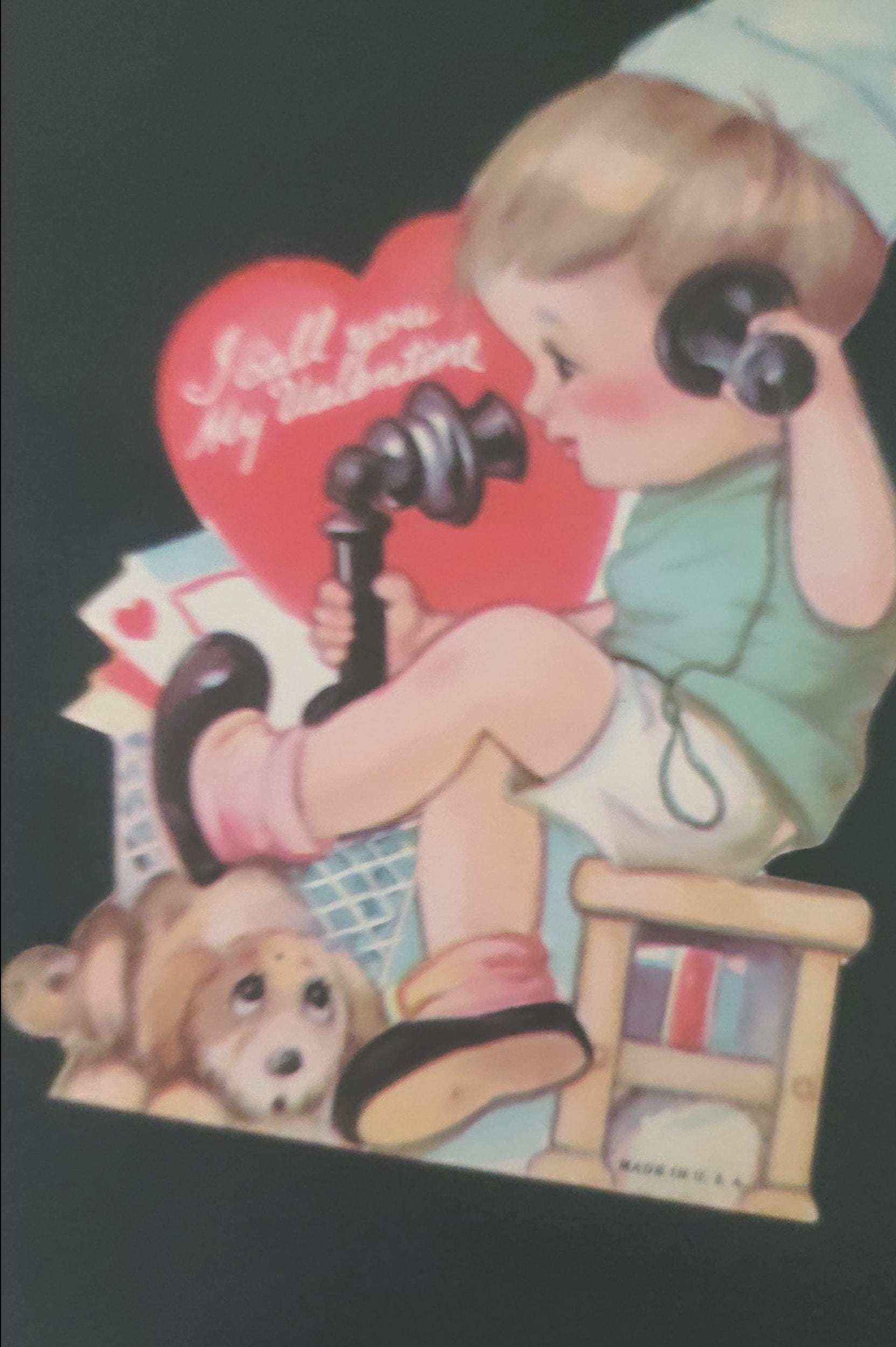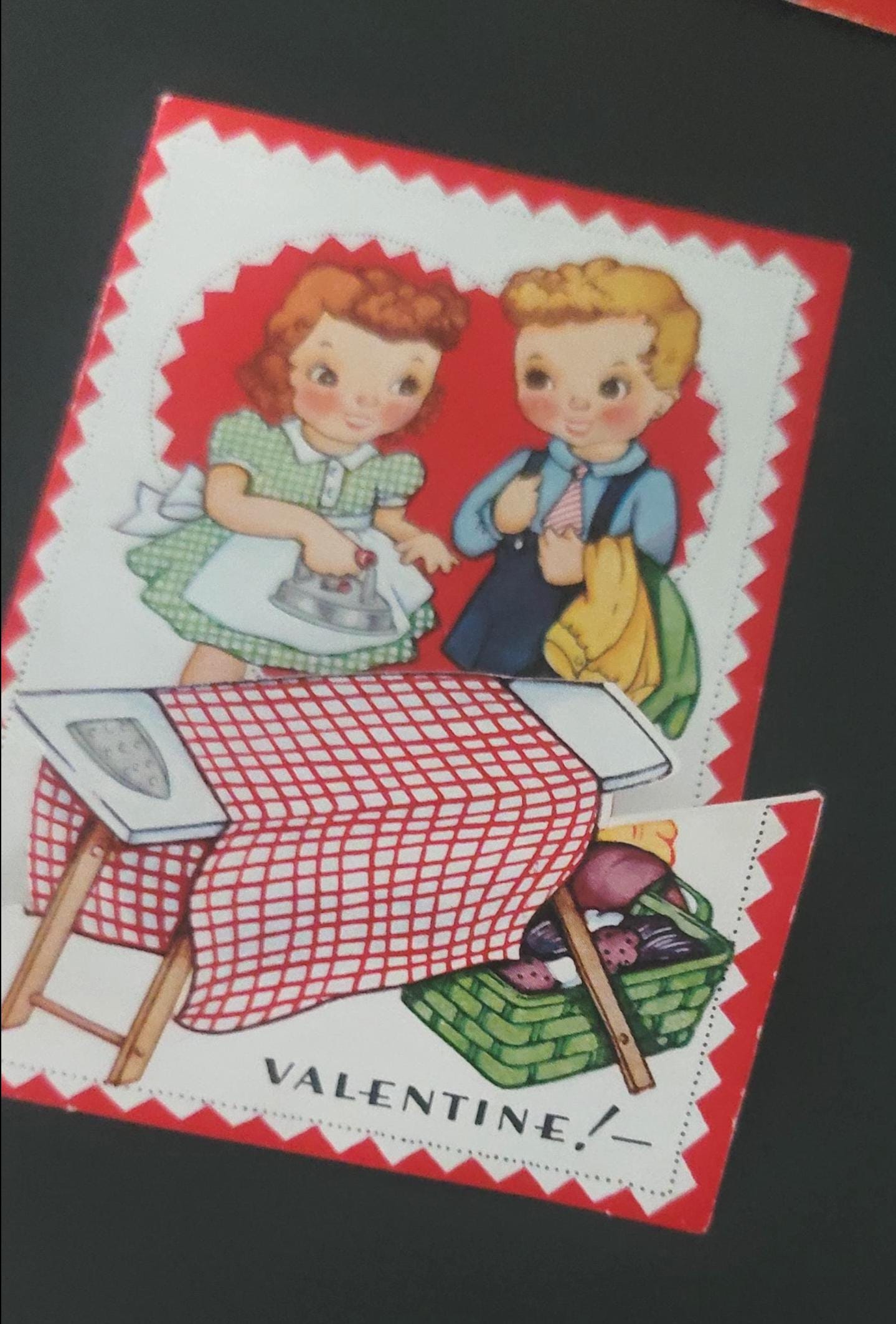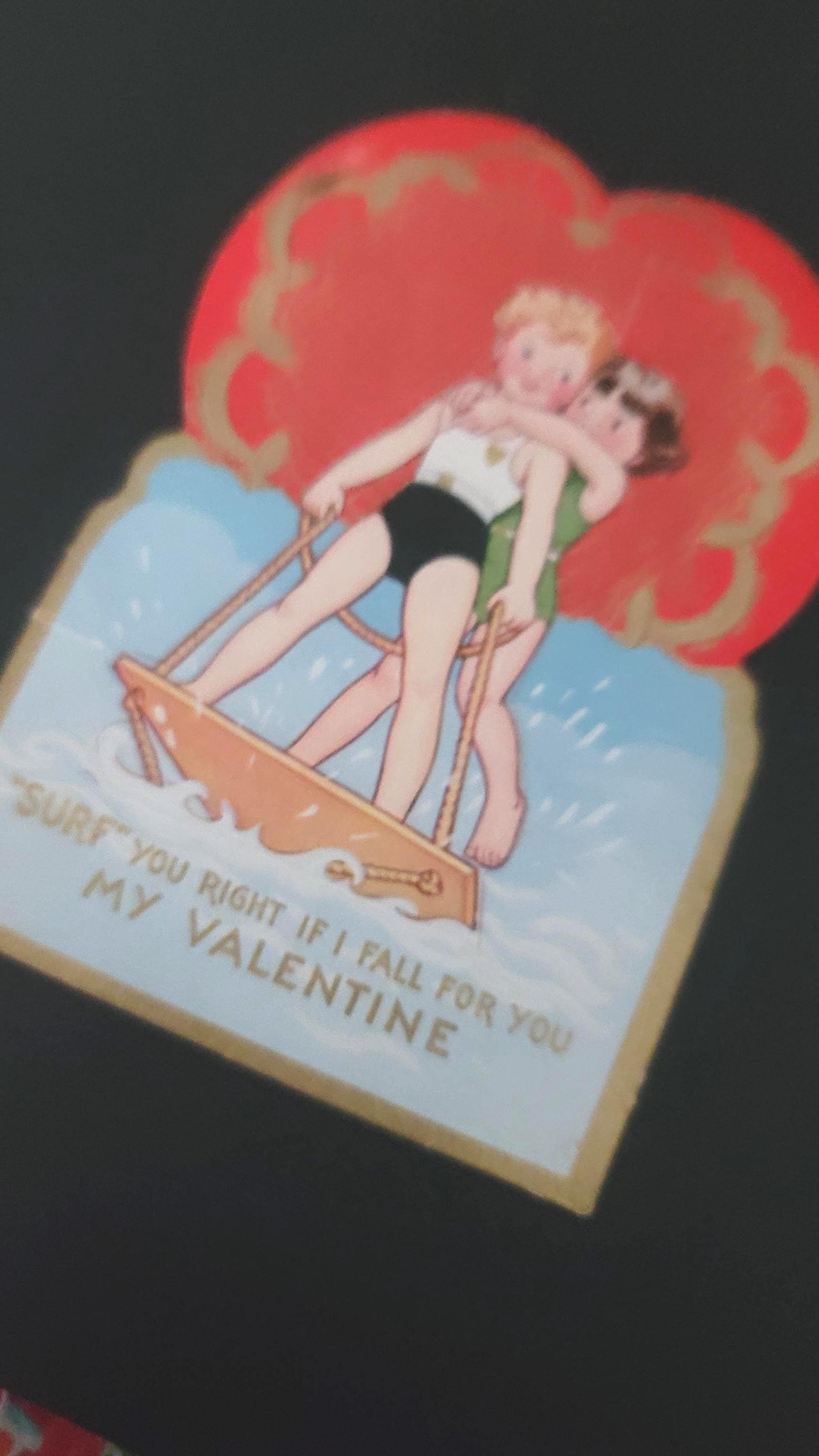 Here is a really cute set of 8. One is a tennis player, a postal puppy, a folding one with an ironing board, one with a moving trombone, a toddler on a telephone, a pair surfing on a piece of wood, a stand up artist and easel, and a girl on a hobby horse. All written on except one, all in pencil except 2.